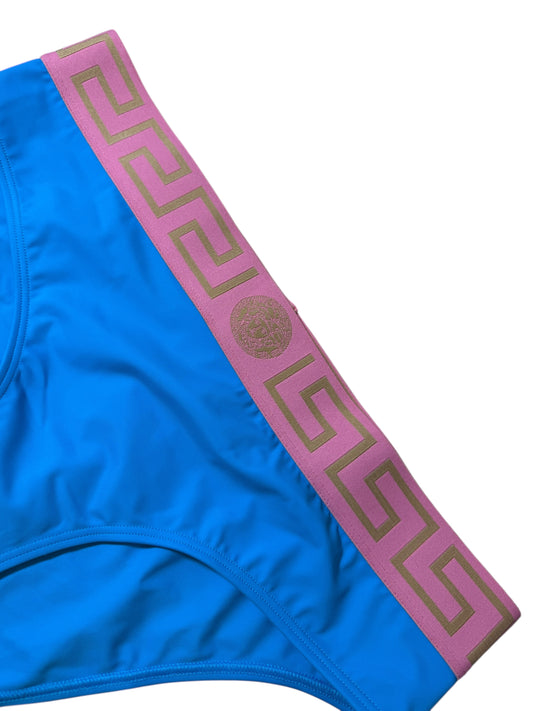 Slip bikini donna Versace blu con fascia Greca rosa e oro - Taglia 5 (XL) - Made in Italy