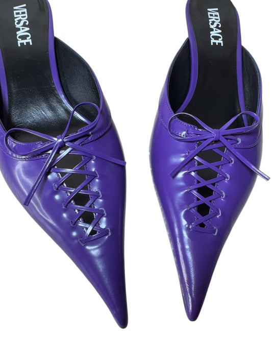 Versace Mules in Vernice Viola con Lacci e Tacco in Metallo – Taglia 40