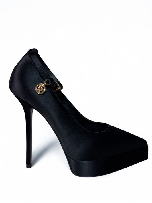 Versace Décolleté in Raso Nero con Plateau e Tacco a Spillo – Medusa Charm
