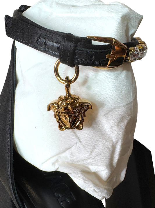 Versace Décolleté in Raso Nero con Plateau, Tacco Largo e Cinturino Gioiello – Taglia 40