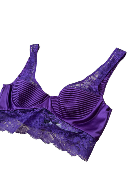 Reggiseno Versace viola in raso e pizzo Made in Italy con etichette