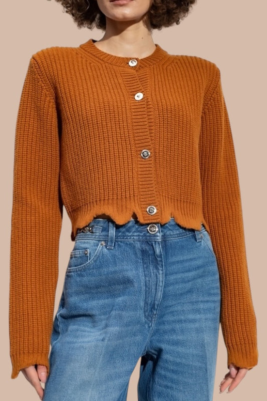 Cardigan Versace donna in lana 100% color cammello, bottoni Medusa, Made in Italy