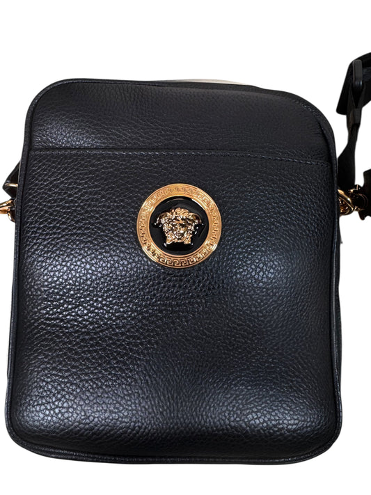 Borsa a tracolla Versace in pelle nera con Medusa dorata