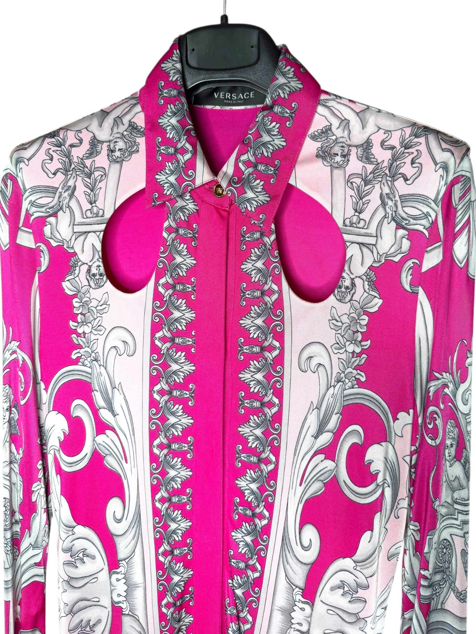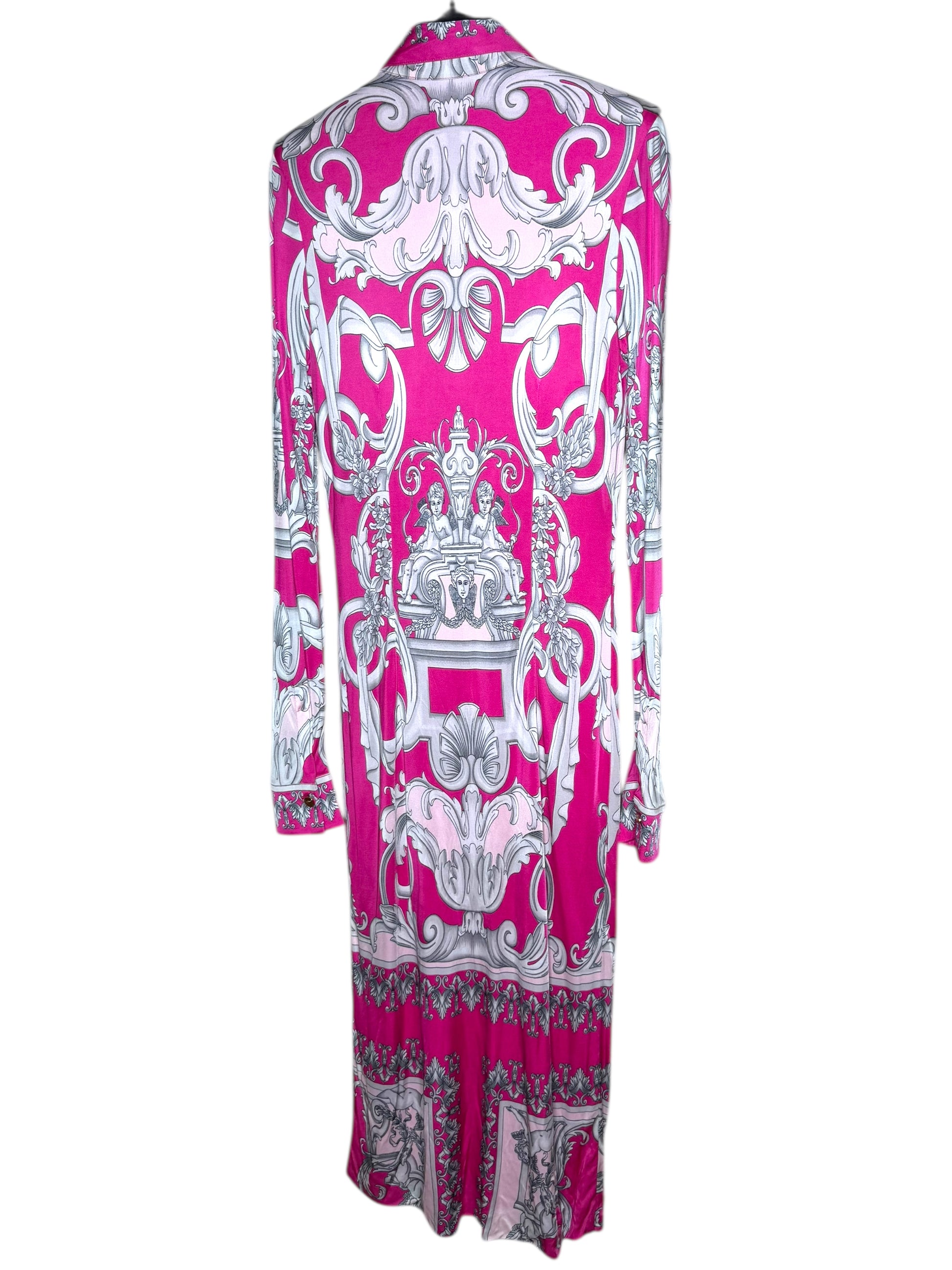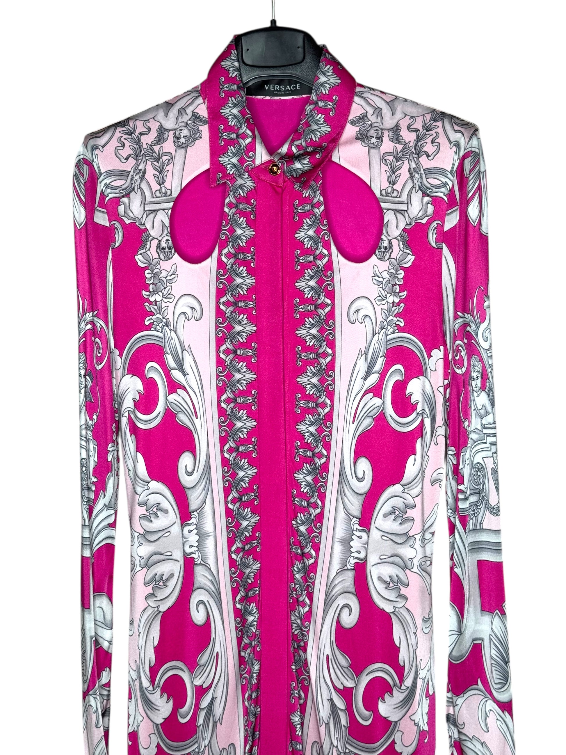 Abito chemisier firmato Versace, realizzato in viscosa con stampa barocca nei toni del fucsia, rosa e grigio, con motivi a cherubini e decori classici. Colletto a punta con bottone Medusa dorato, chiusura frontale coperta, polsini con doppi bottoni logati. Linea dritta, lunghezza al polpaccio.