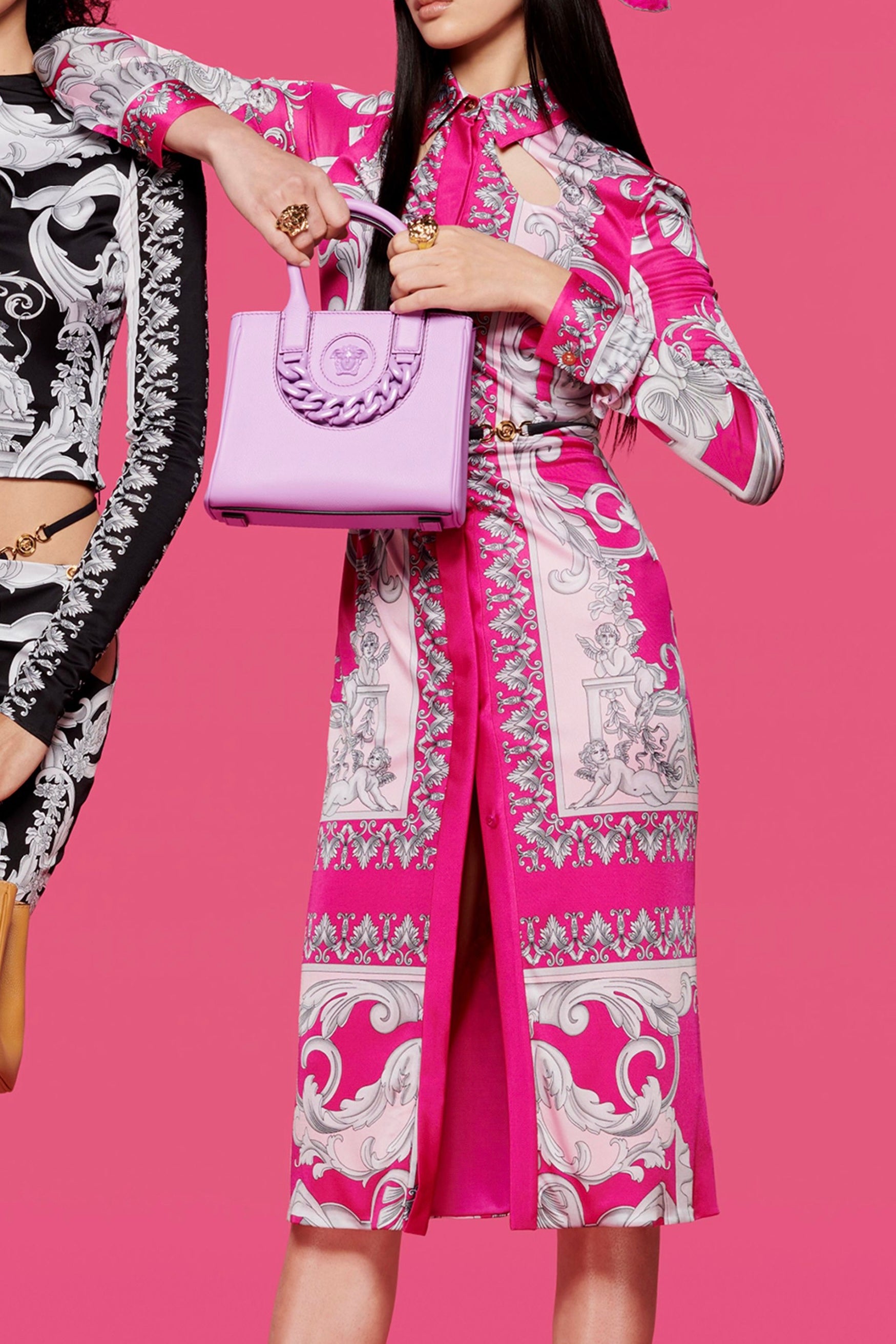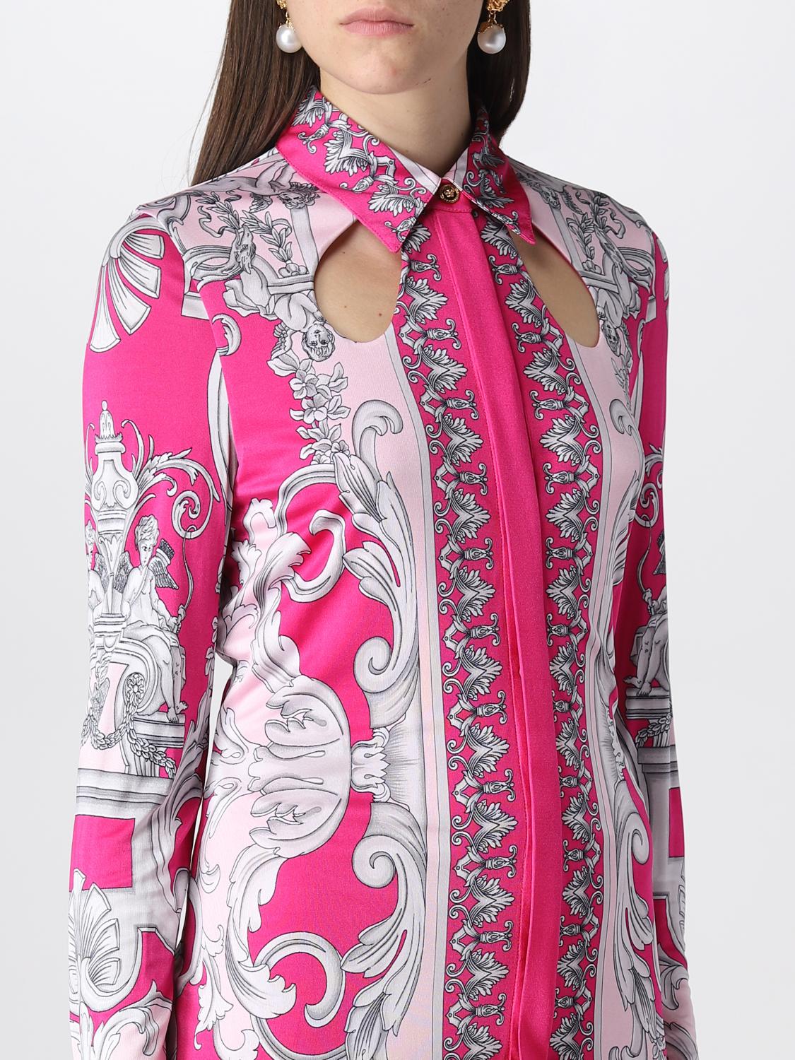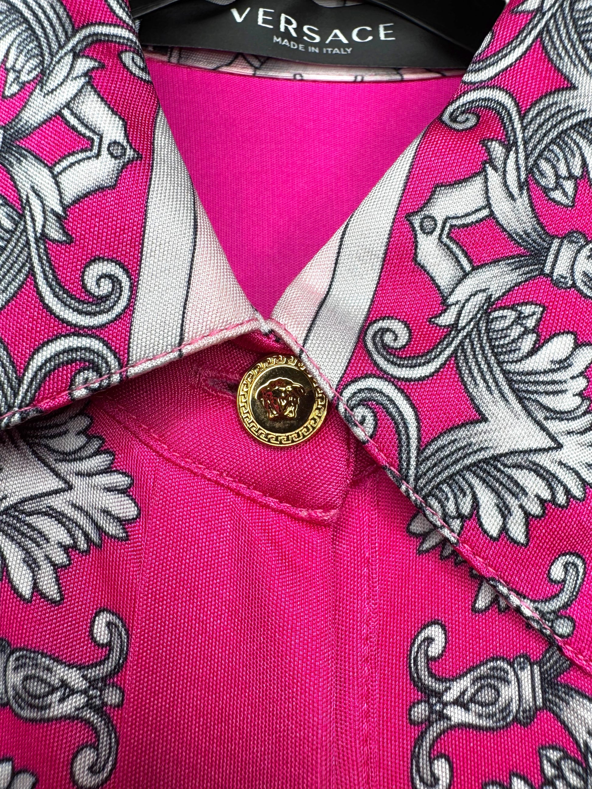 Abito chemisier firmato Versace, realizzato in viscosa con stampa barocca nei toni del fucsia, rosa e grigio, con motivi a cherubini e decori classici. Colletto a punta con bottone Medusa dorato, chiusura frontale coperta, polsini con doppi bottoni logati. Linea dritta, lunghezza al polpaccio.
