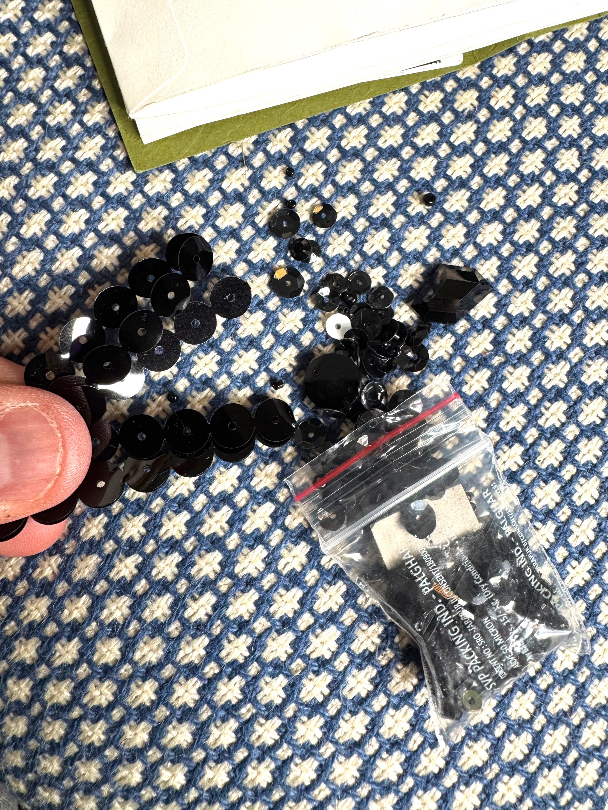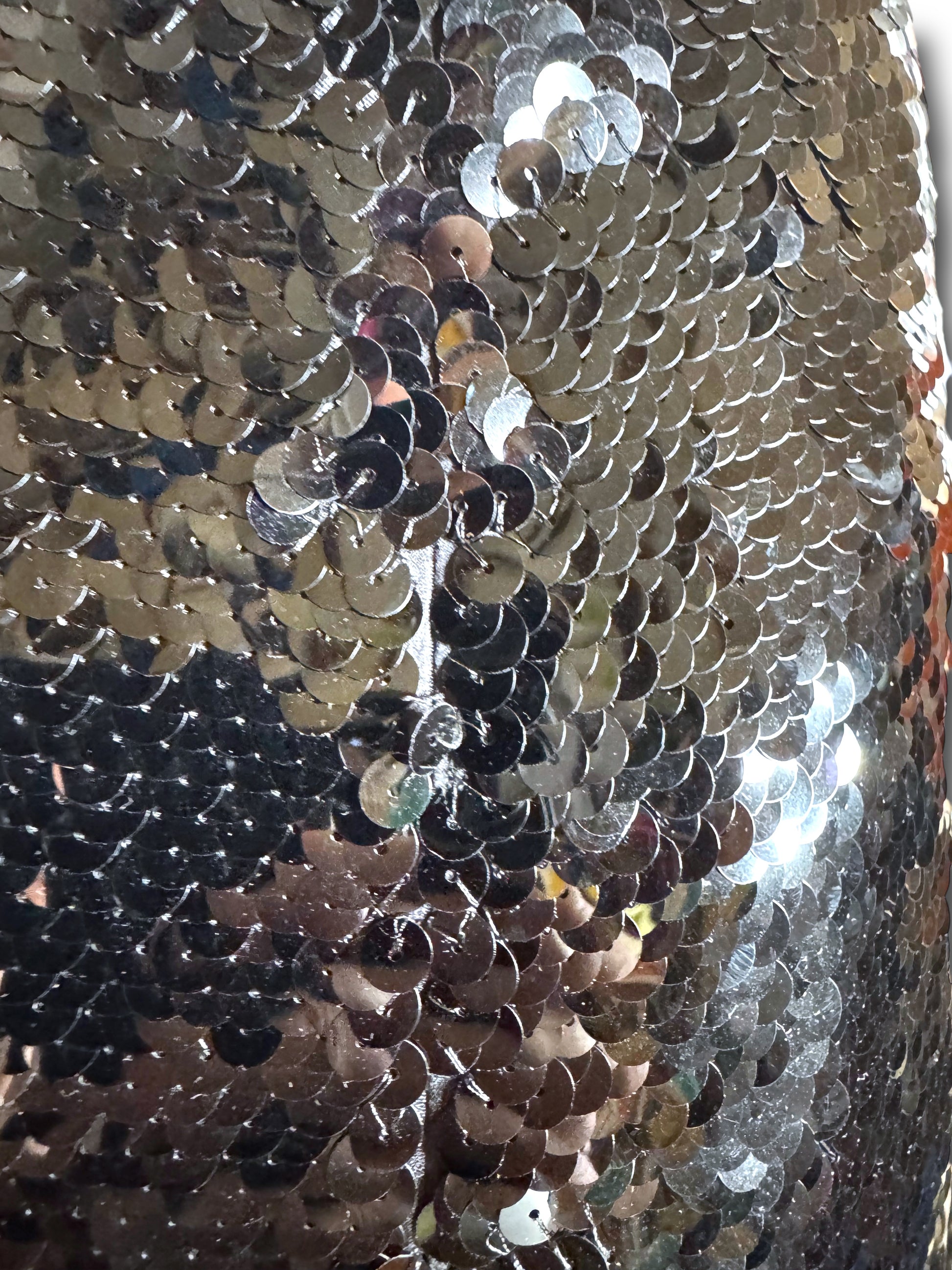 Come mostrato in foto, sul retro vicino alla zip mancano alcune paillettes, ma non rappresentano un problema in quanto vengono fornite paillettes e perline di ricambio.