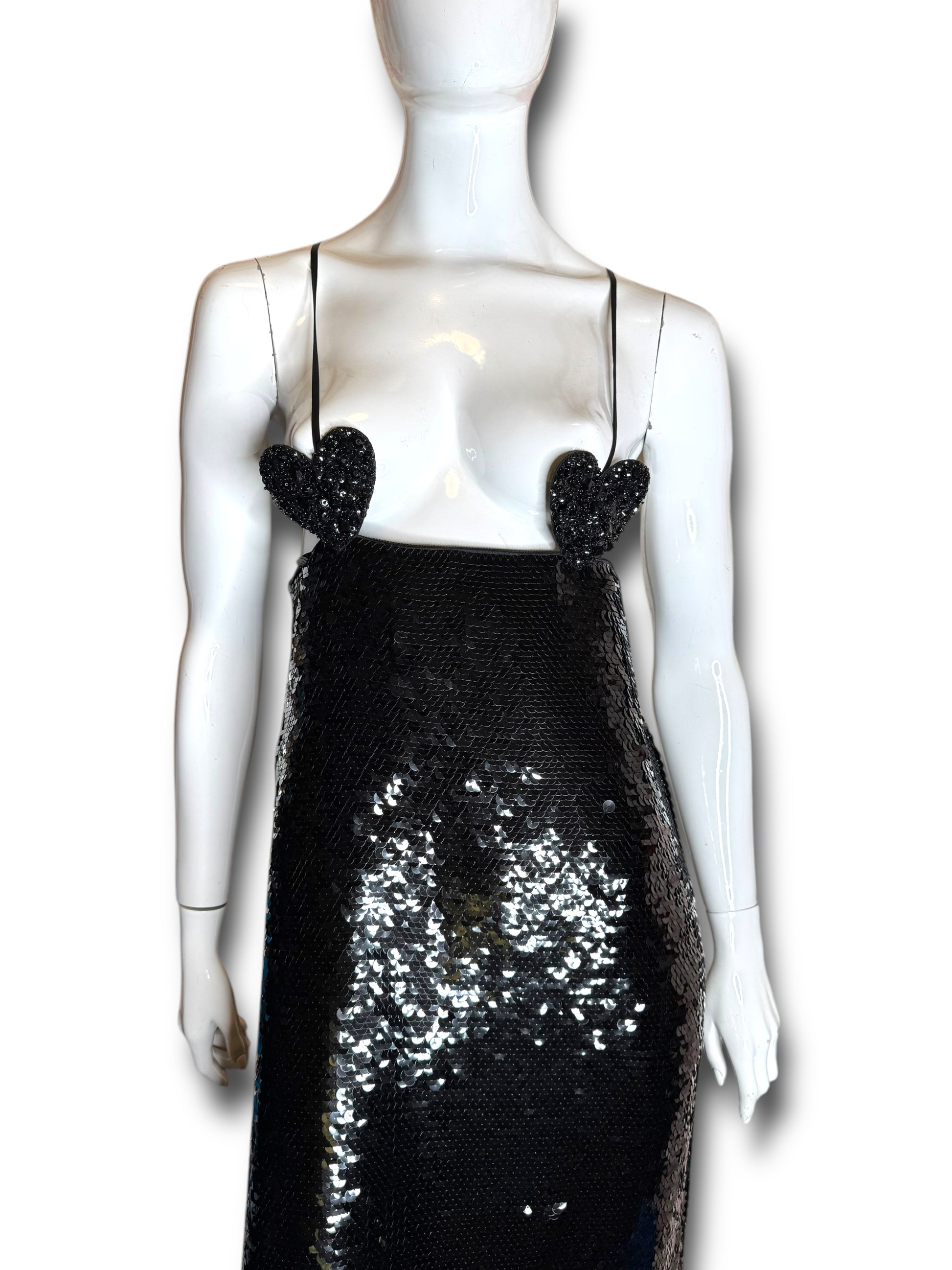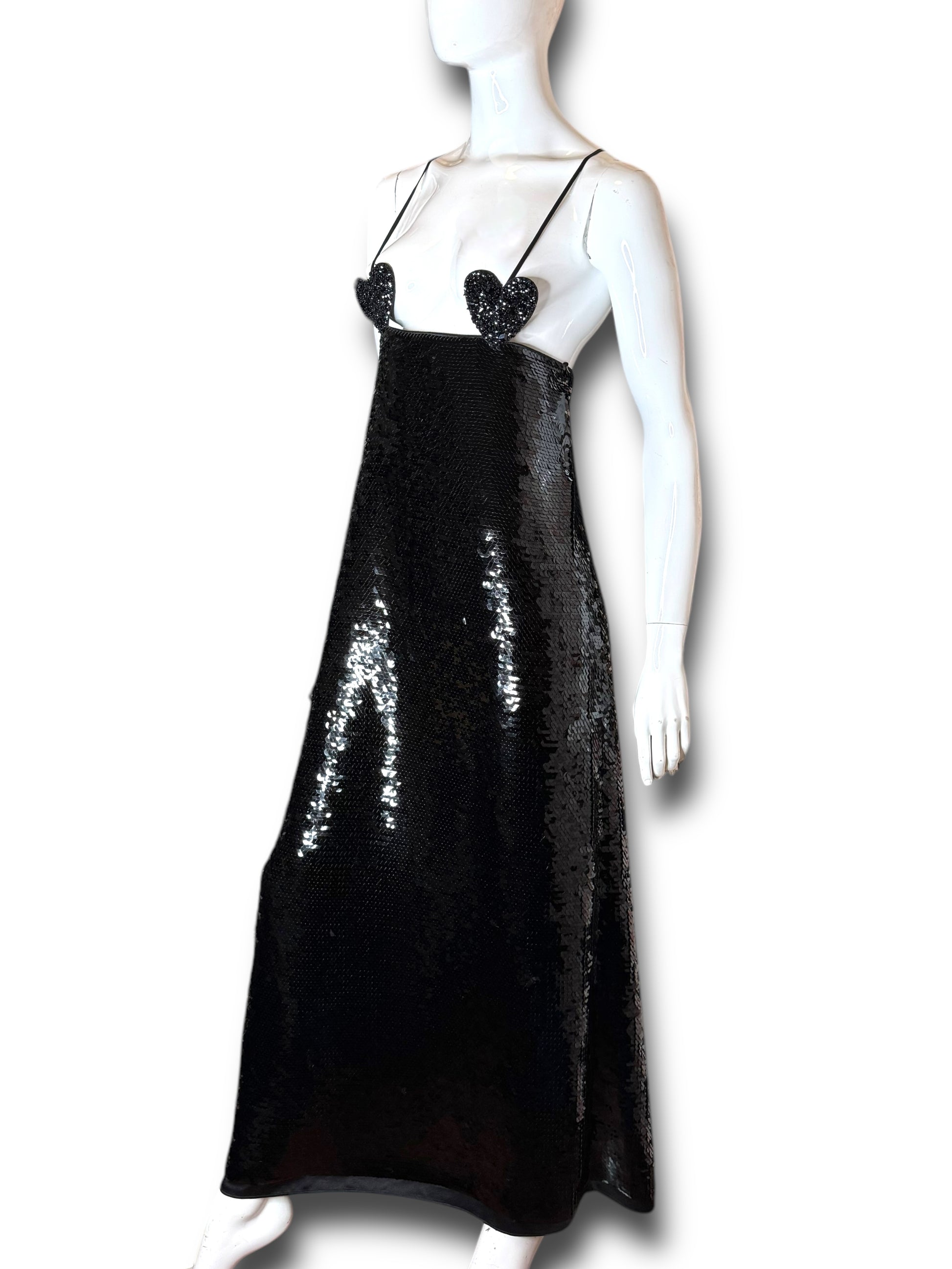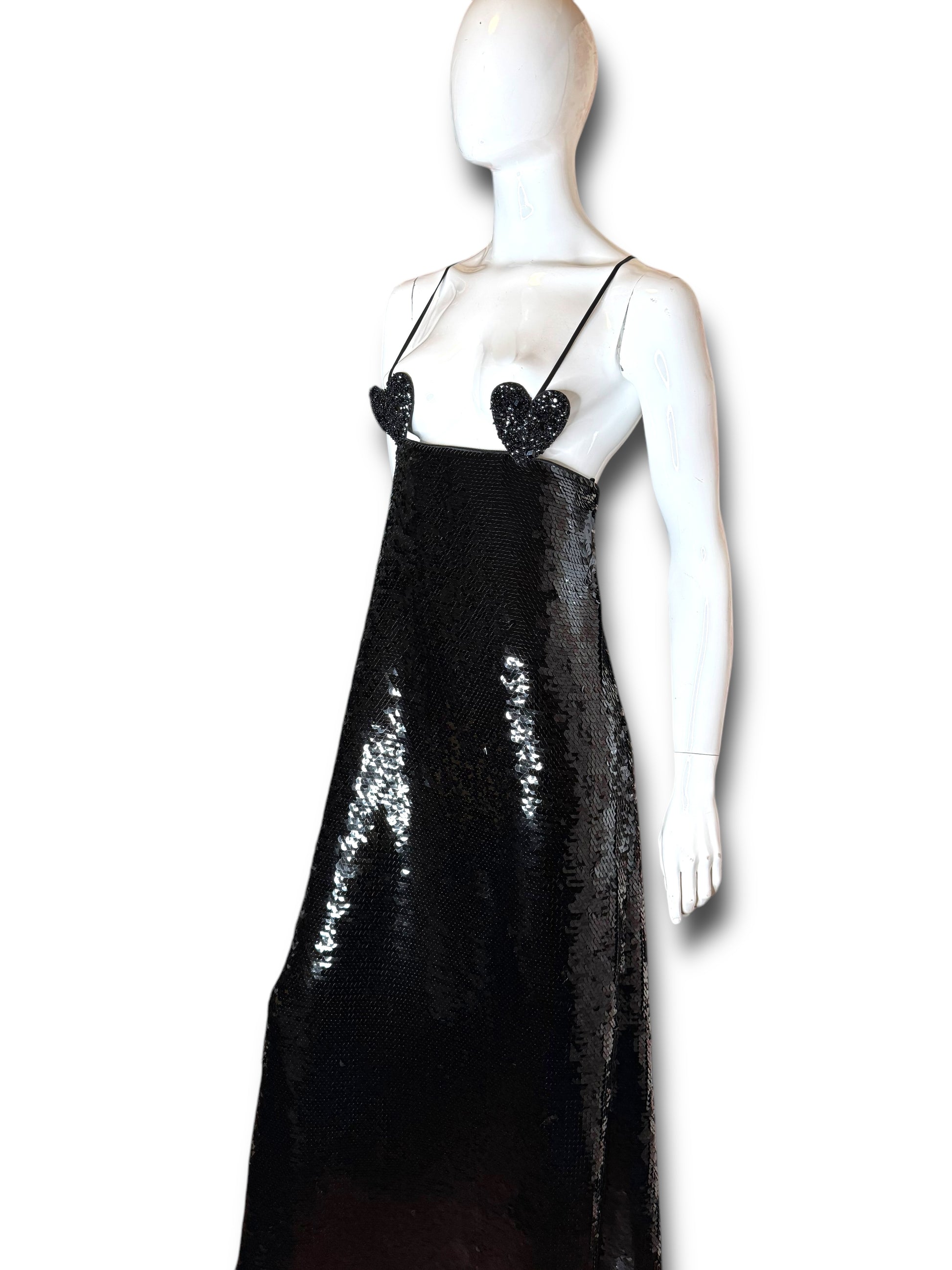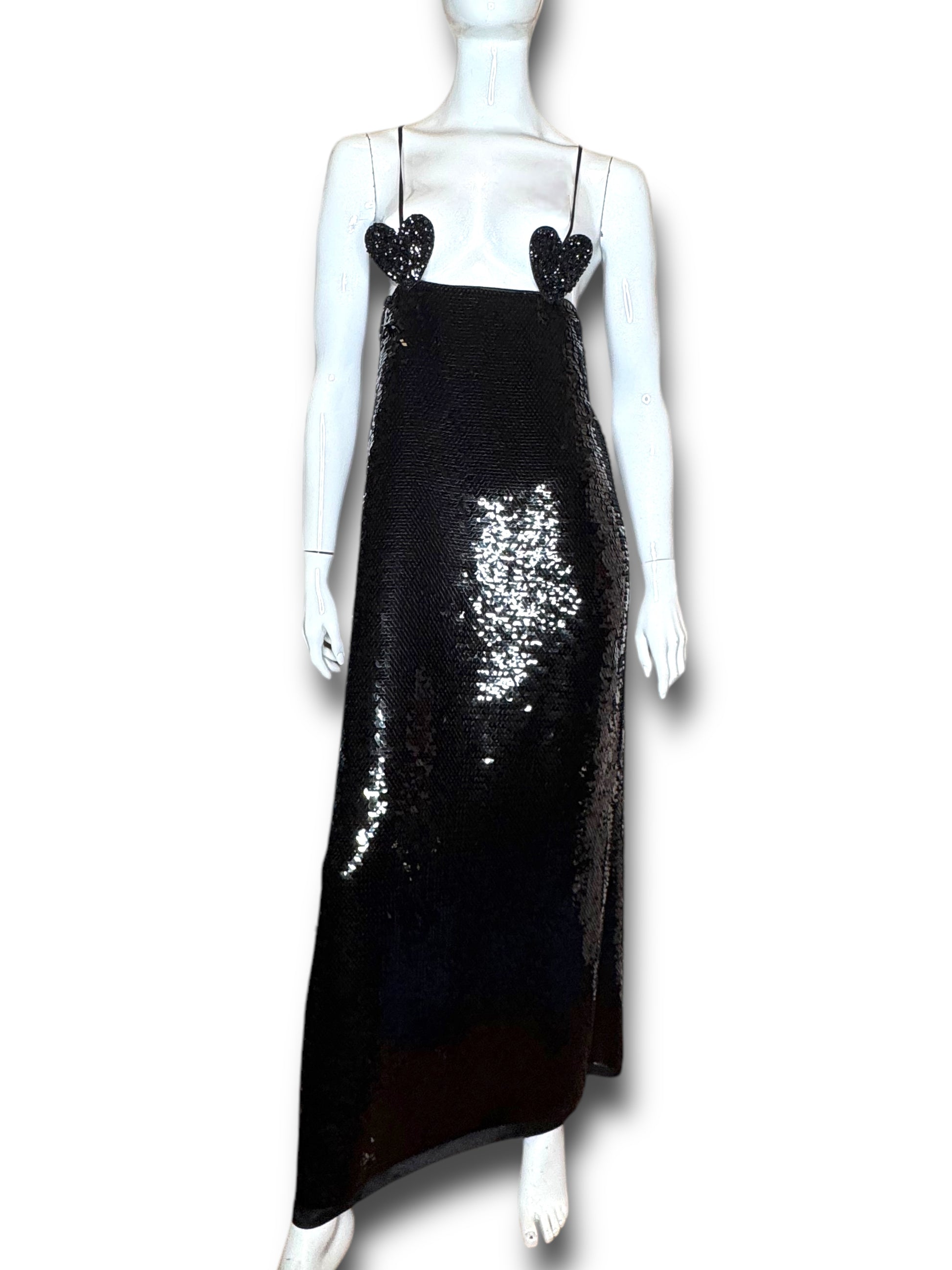 Elegante abito lungo Gucci da sera, realizzato in Italia in pura seta (100%) con fodera interna in acetato e seta. Il capo è completamente ricoperto da paillettes nere e presenta un design d’impatto con due cuori ricamati in perline e paillettes tridimensionali all’altezza del seno. Spalline sottili incrociate sulla schiena e chiusura posteriore con zip a scomparsa.