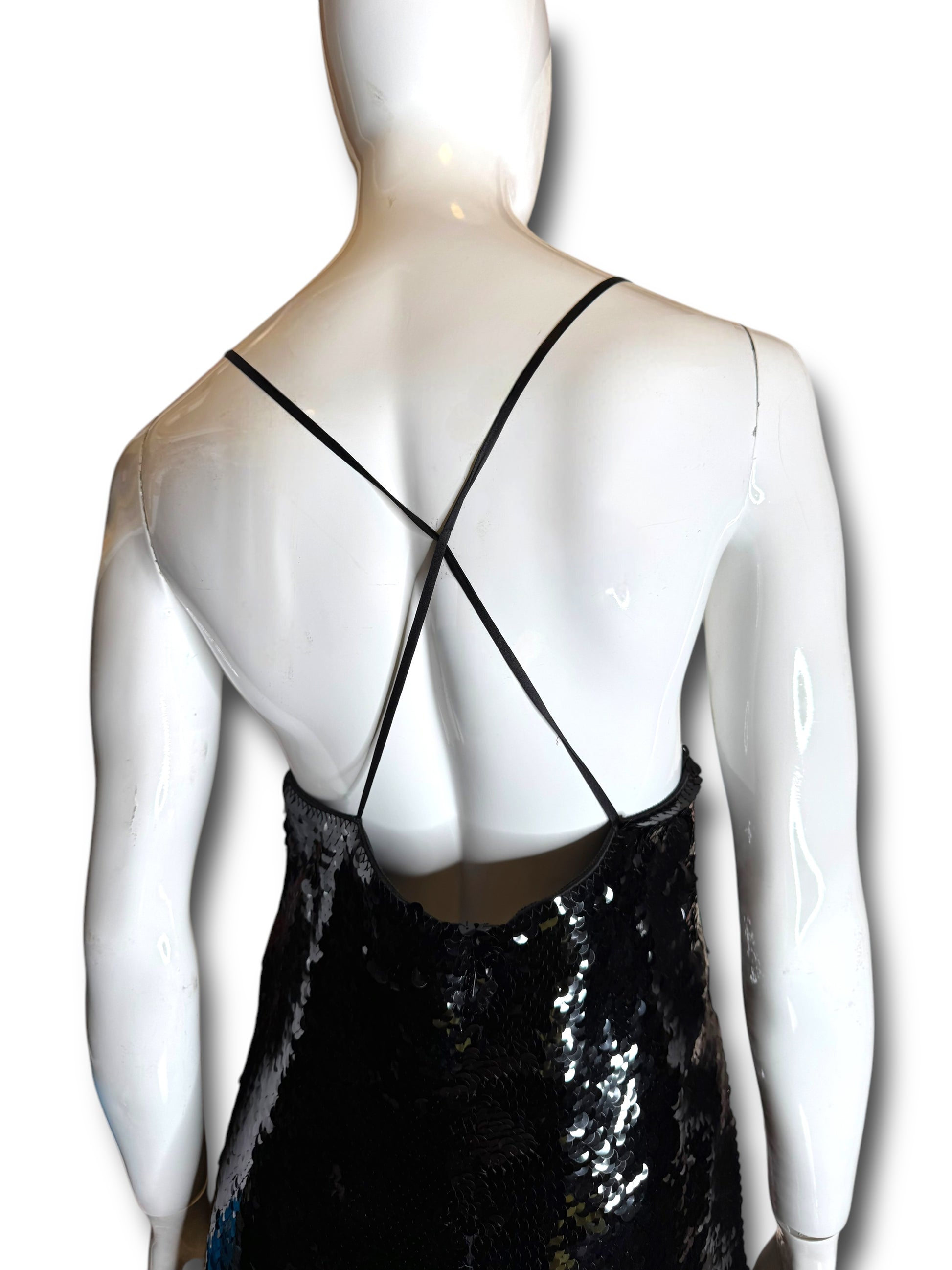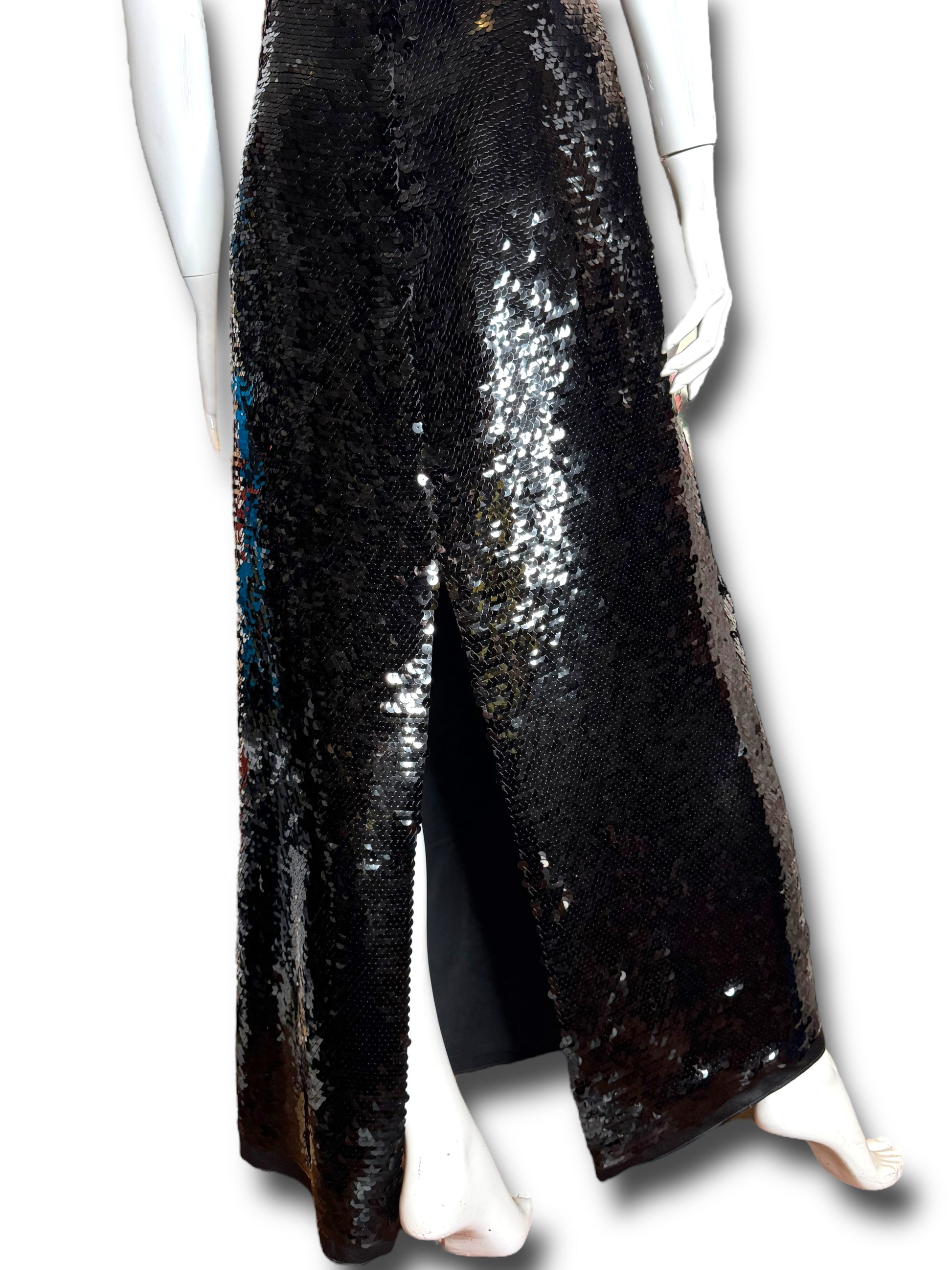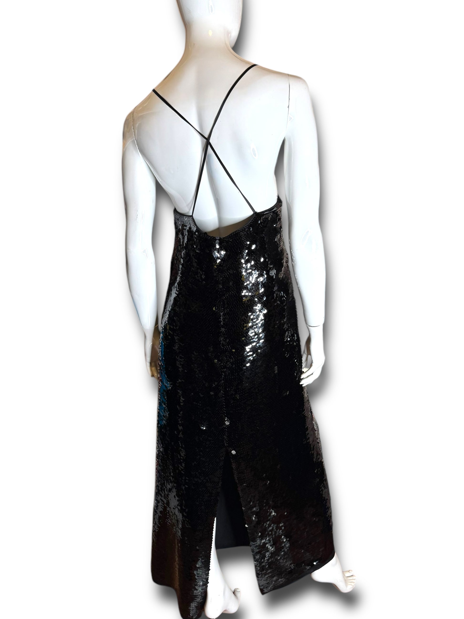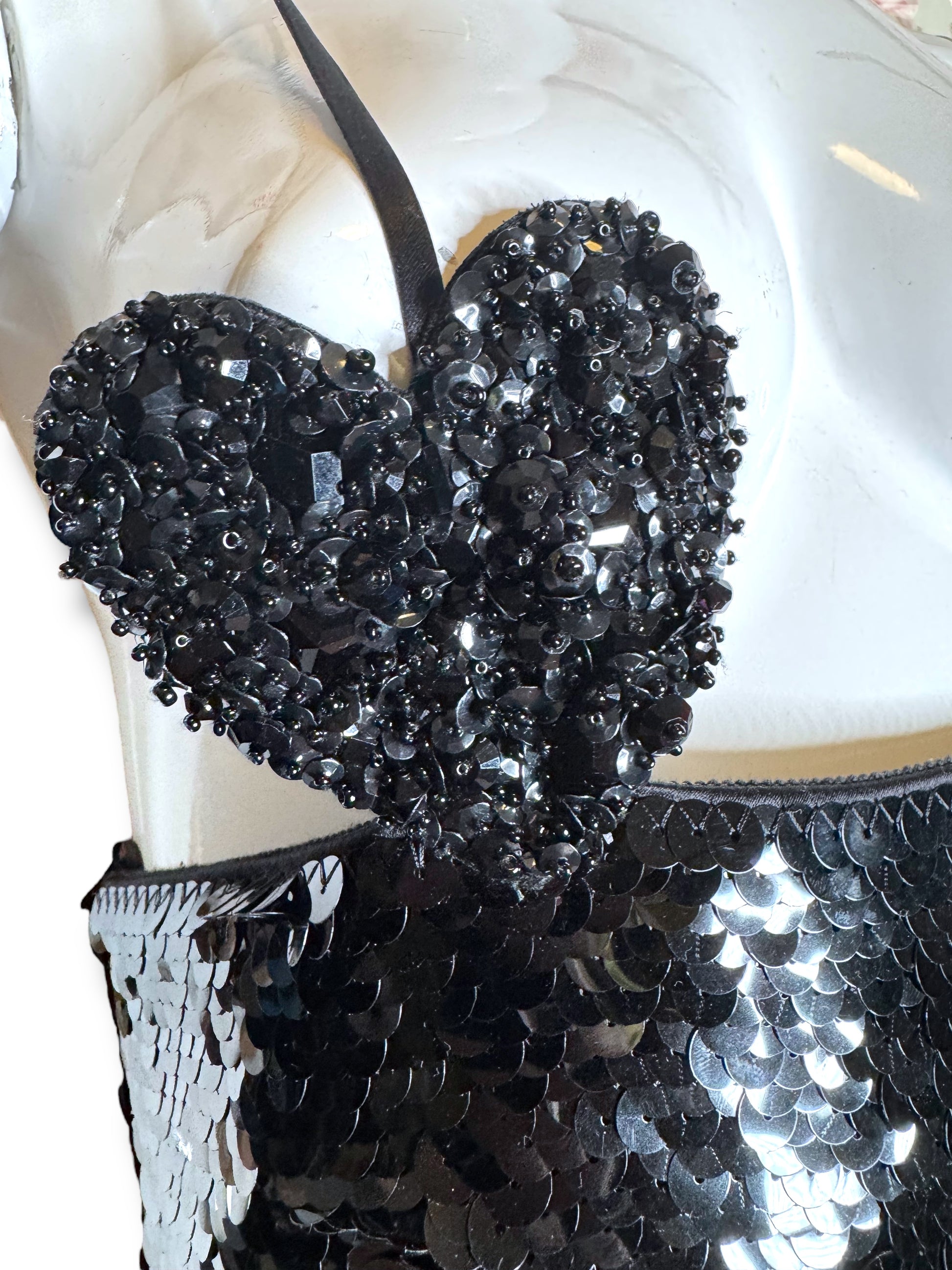 Elegante abito lungo Gucci da sera, realizzato in Italia in pura seta (100%) con fodera interna in acetato e seta. Il capo è completamente ricoperto da paillettes nere e presenta un design d’impatto con due cuori ricamati in perline e paillettes tridimensionali all’altezza del seno. Spalline sottili incrociate sulla schiena e chiusura posteriore con zip a scomparsa.