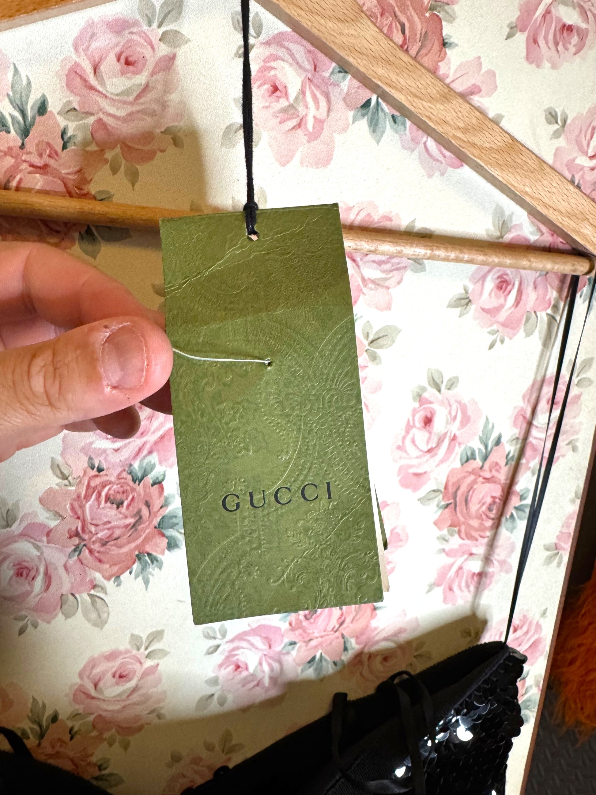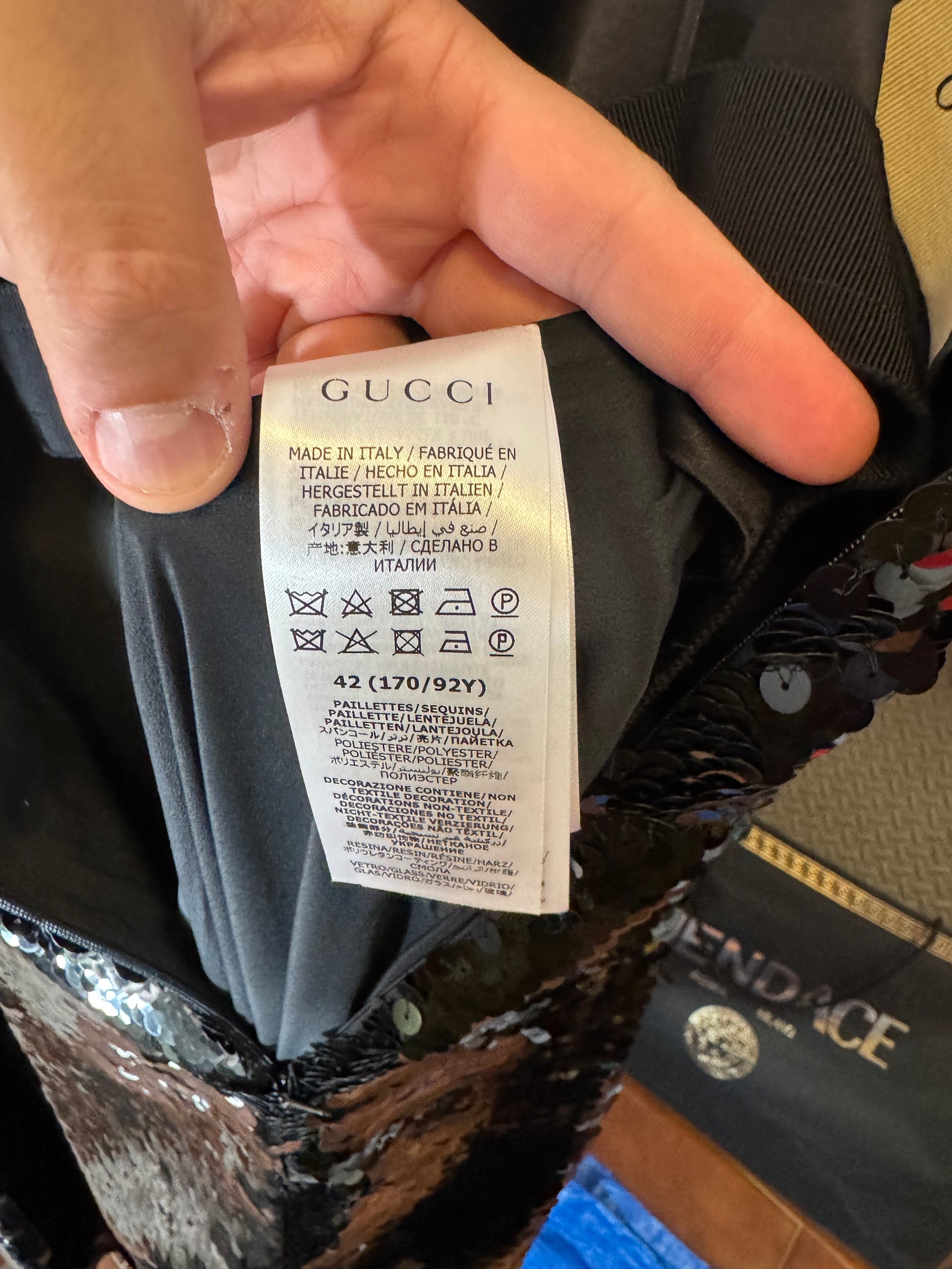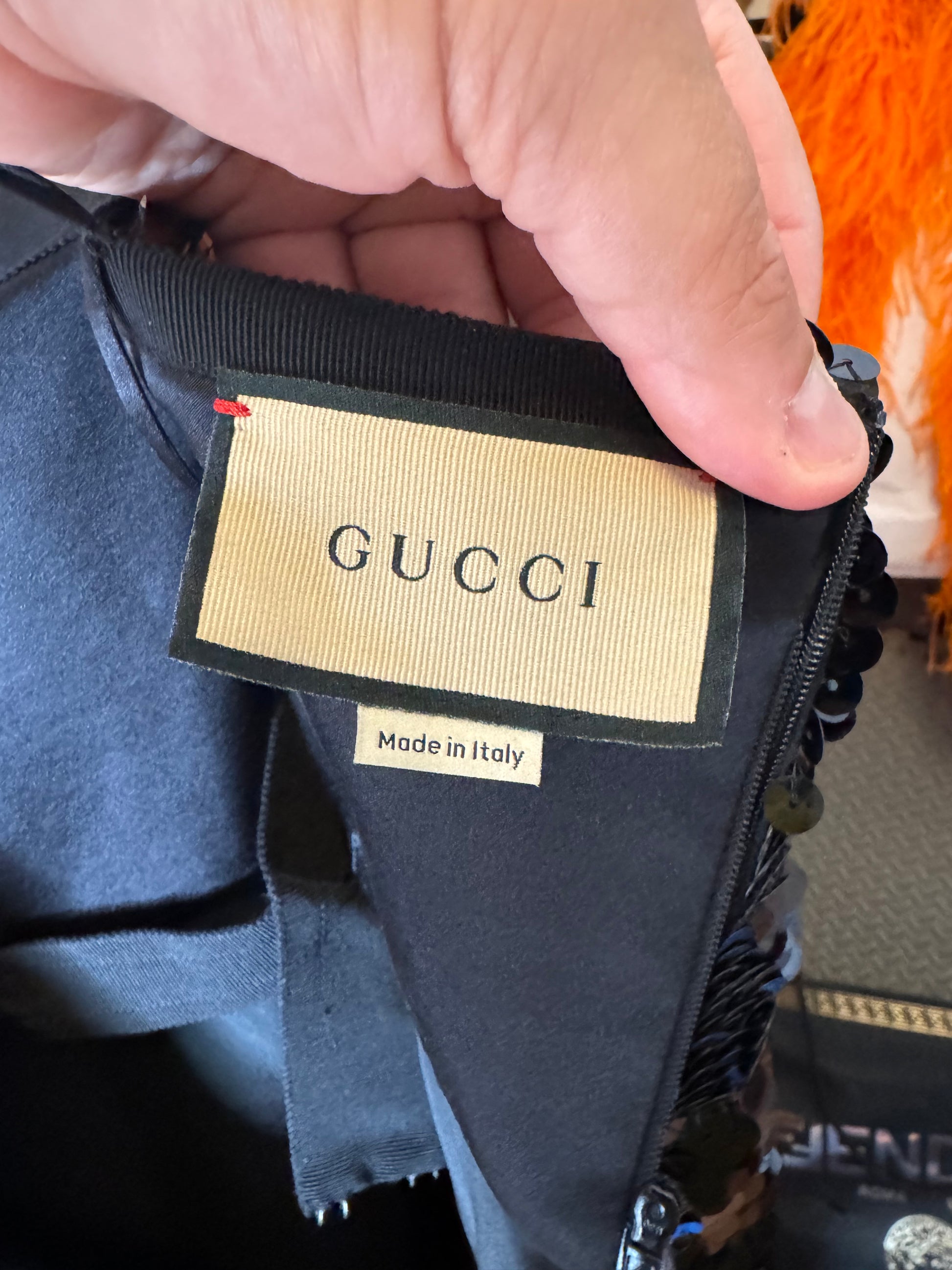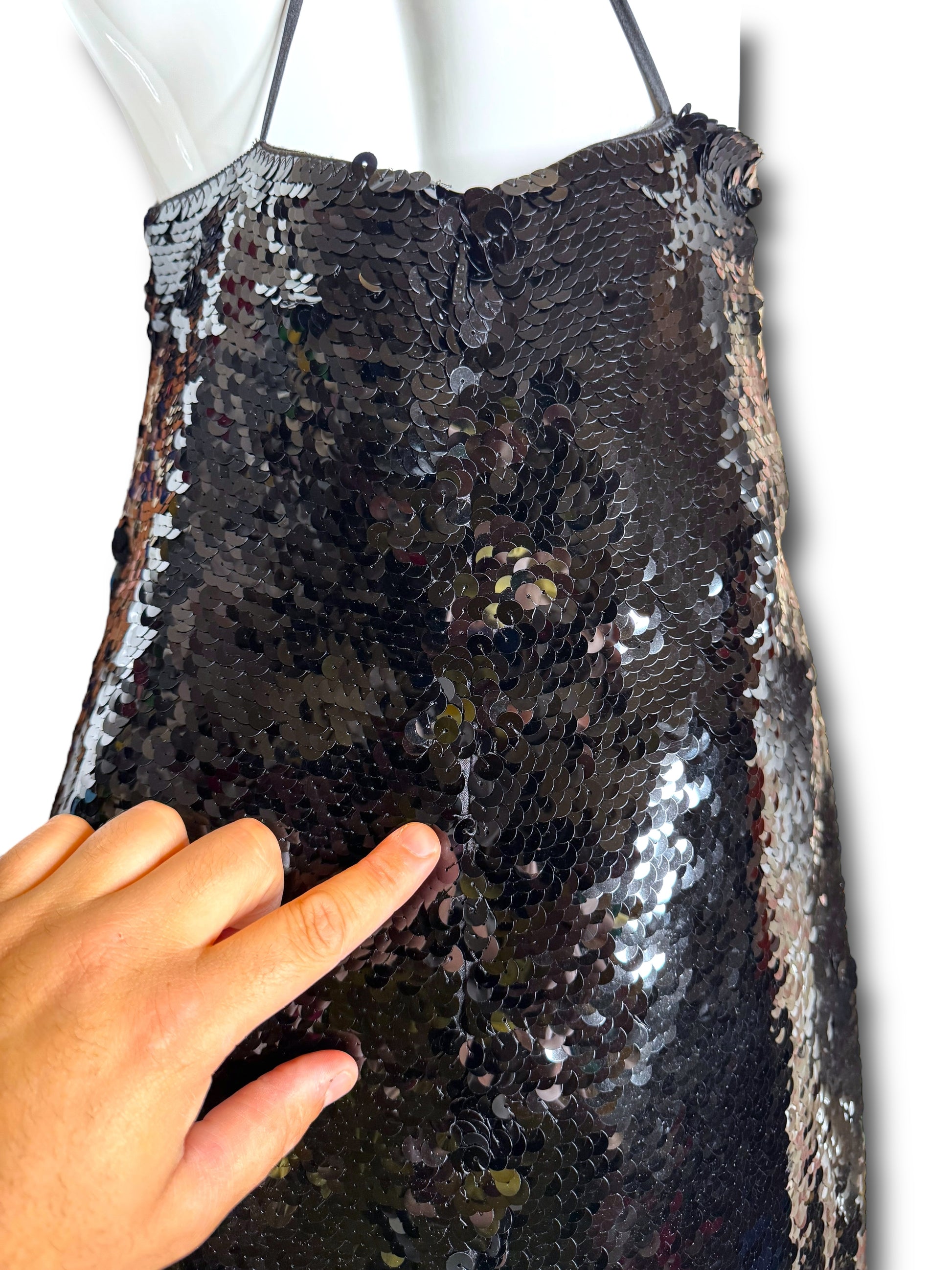 Elegante abito lungo Gucci da sera, realizzato in Italia in pura seta (100%) con fodera interna in acetato e seta. Il capo è completamente ricoperto da paillettes nere e presenta un design d’impatto con due cuori ricamati in perline e paillettes tridimensionali all’altezza del seno. Spalline sottili incrociate sulla schiena e chiusura posteriore con zip a scomparsa.