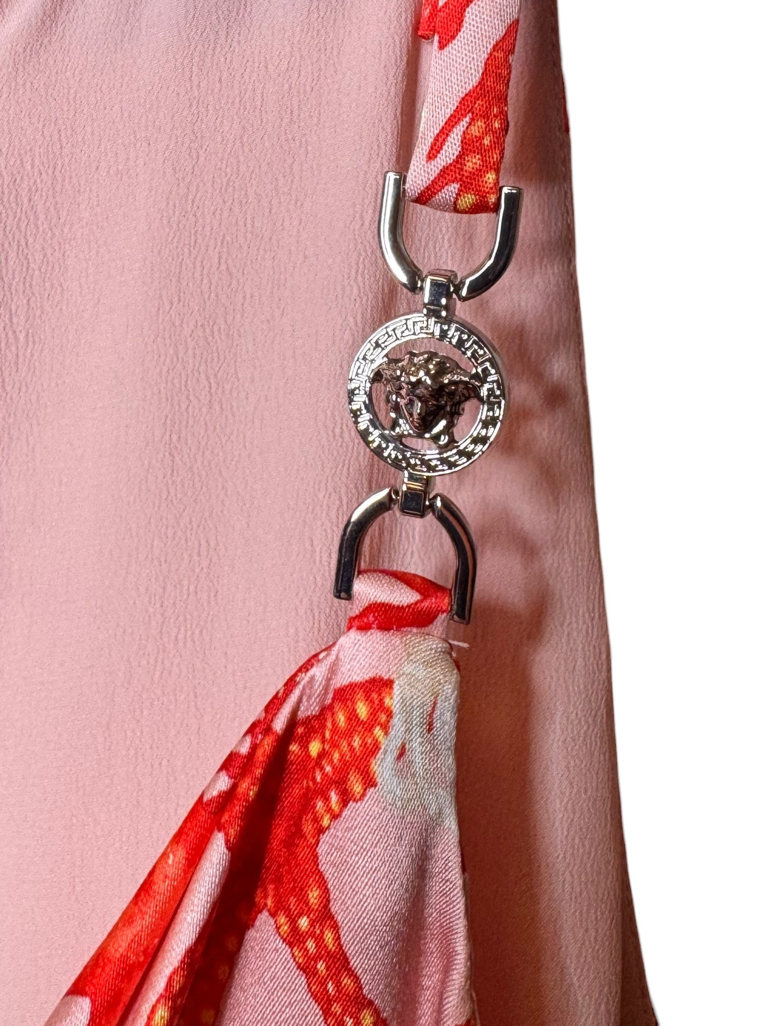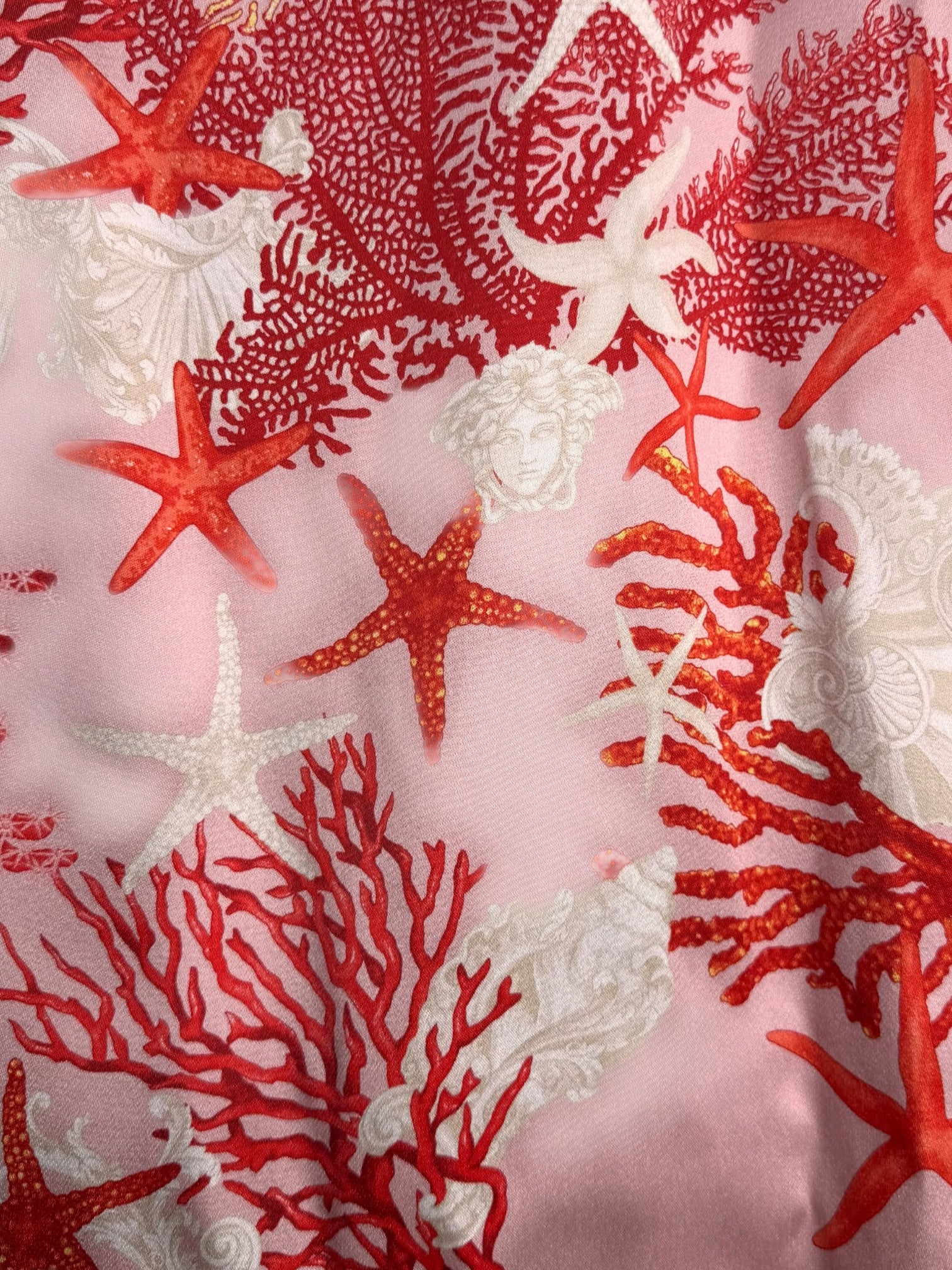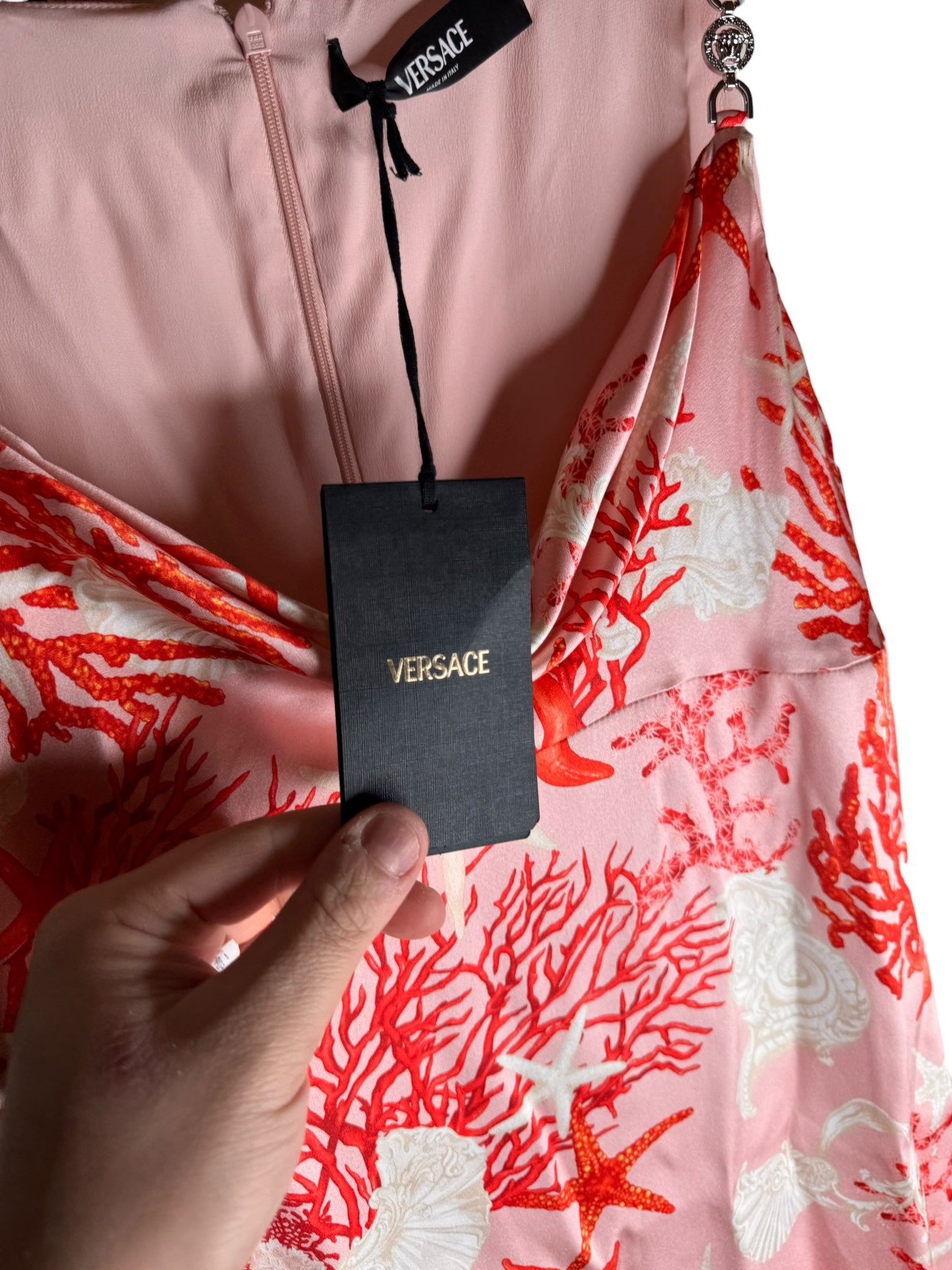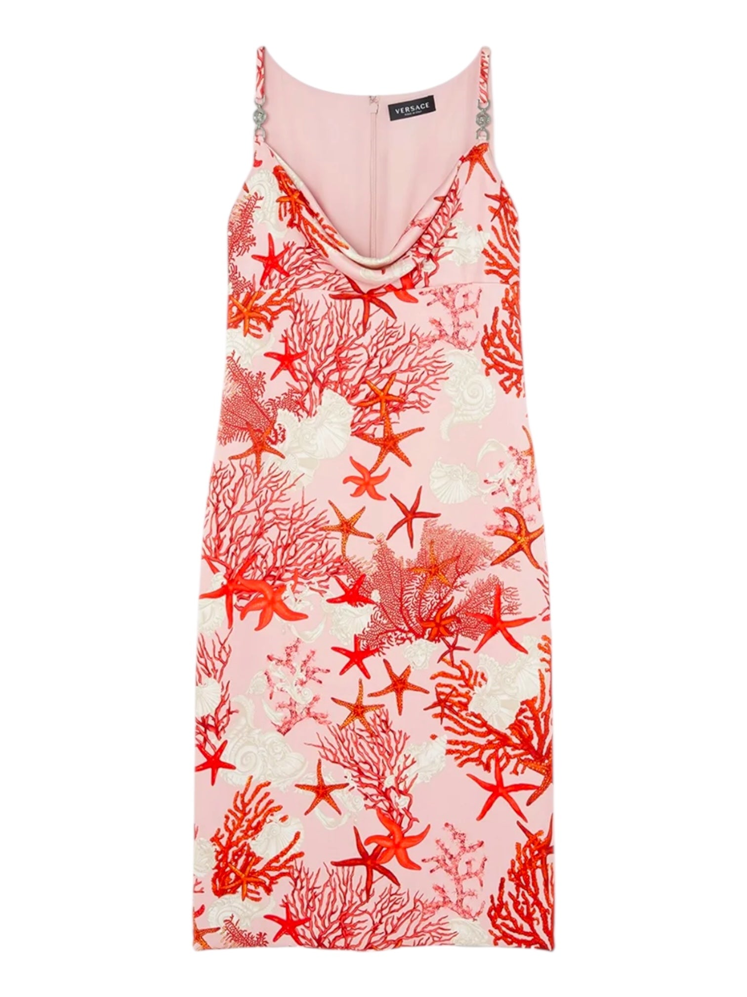 Abito Versace contemporaneo realizzato in 100% seta, caratterizzato da iconica stampa marina con stelle marine, coralli e conchiglie su fondo rosa. Modello midi, linea aderente, con scollo drappeggiato sul davanti e spalline sottili con elementi Medusa in metallo, dettaglio gioiello distintivo della maison.