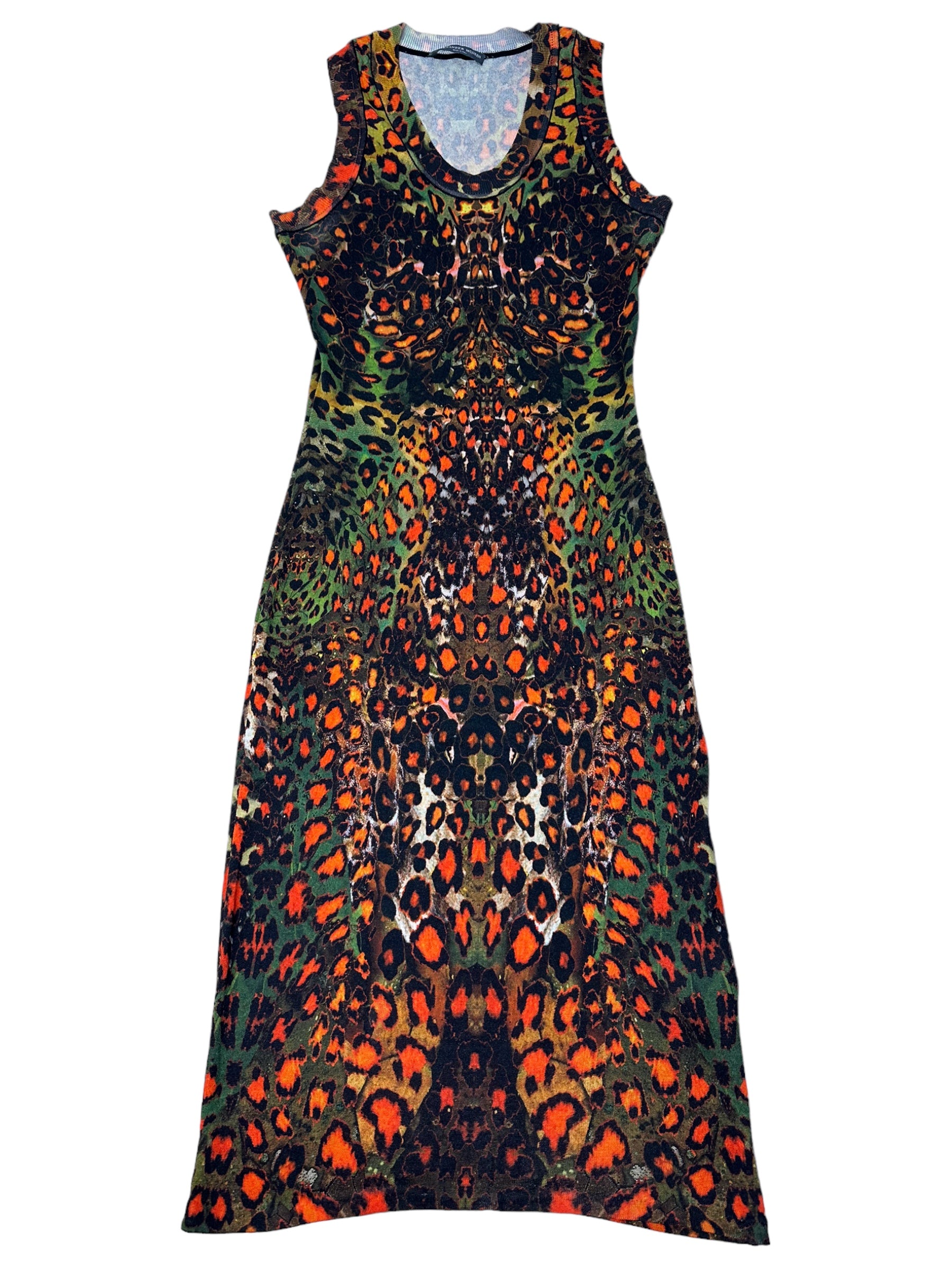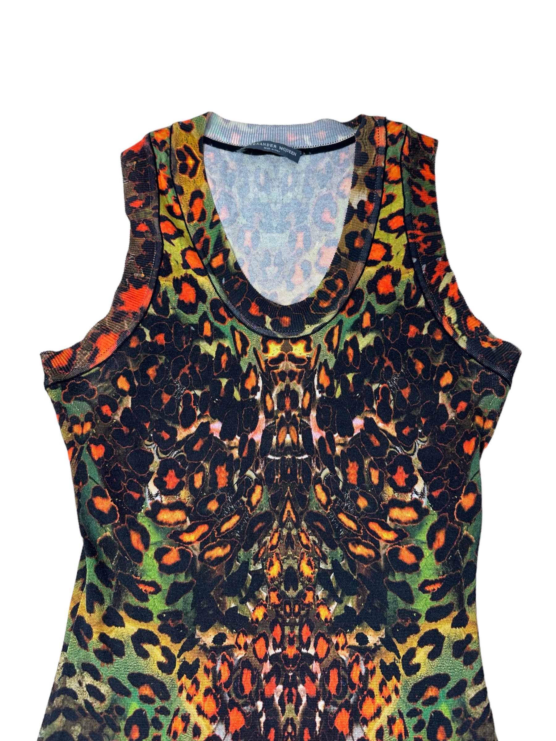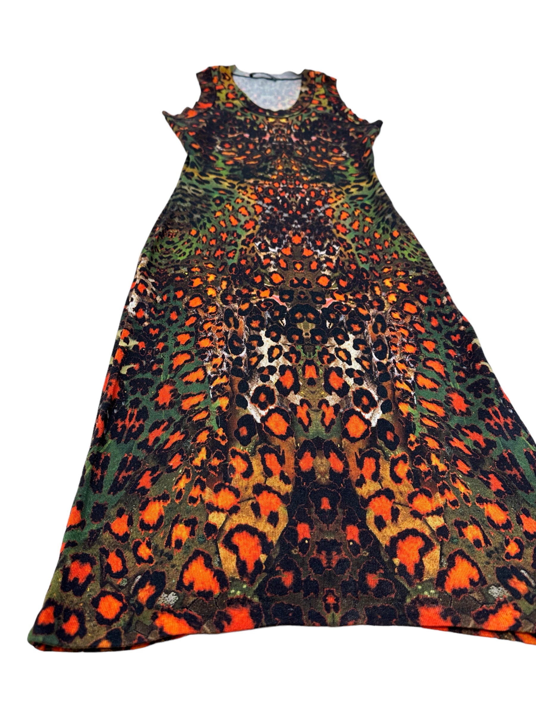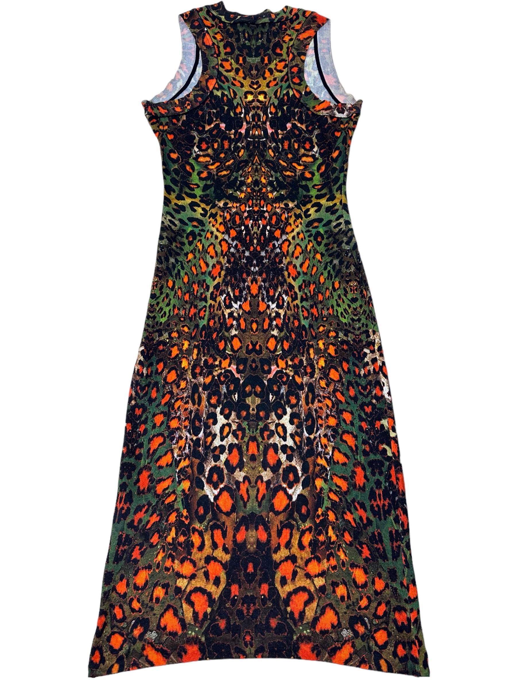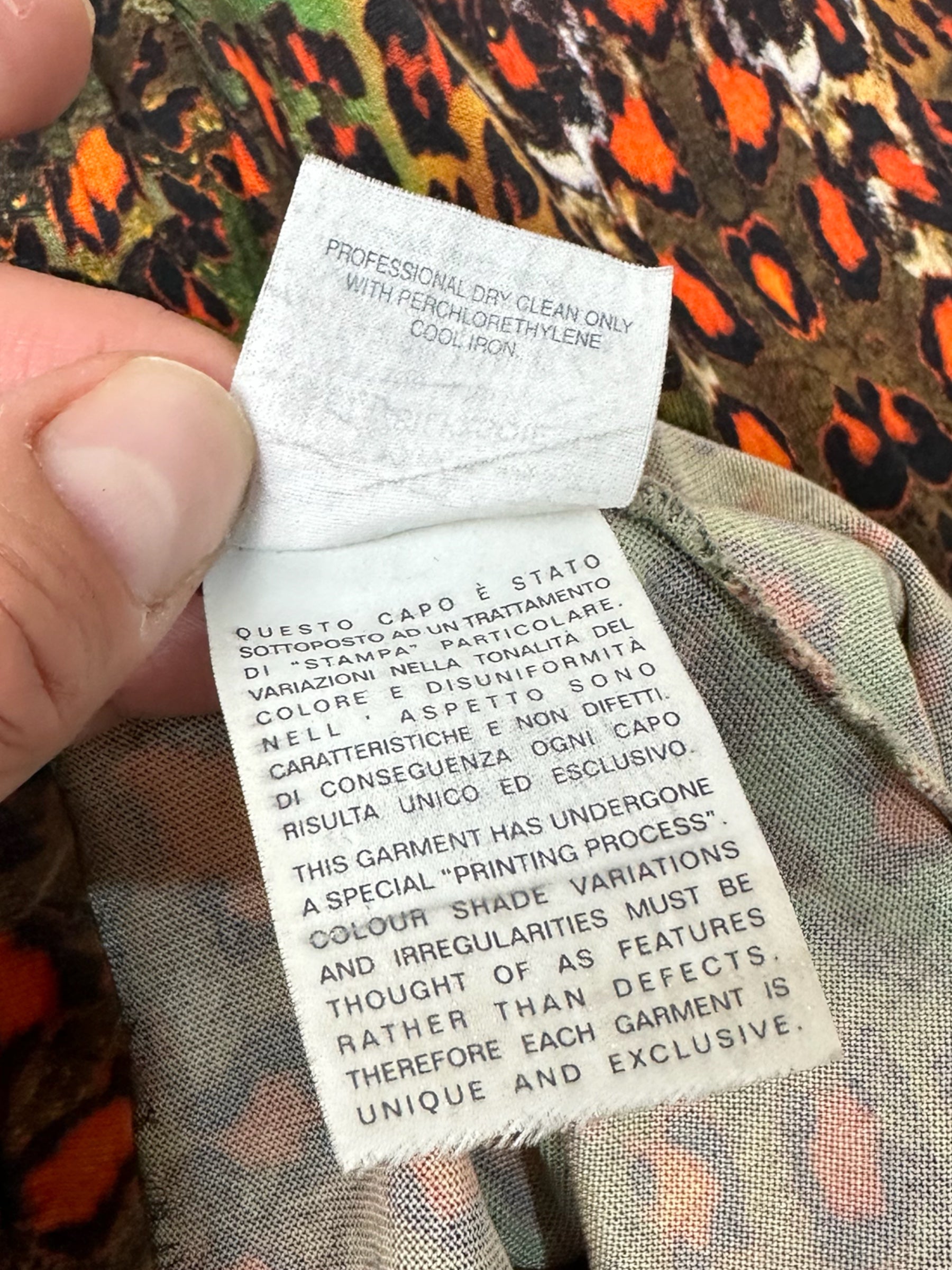 Alexander Mcqueen mini abito a girocollo smanicato in seta stampata simil animalier nei toni dell’’arancione e marrone. Tessuto leggermente stretch. Tg. XS