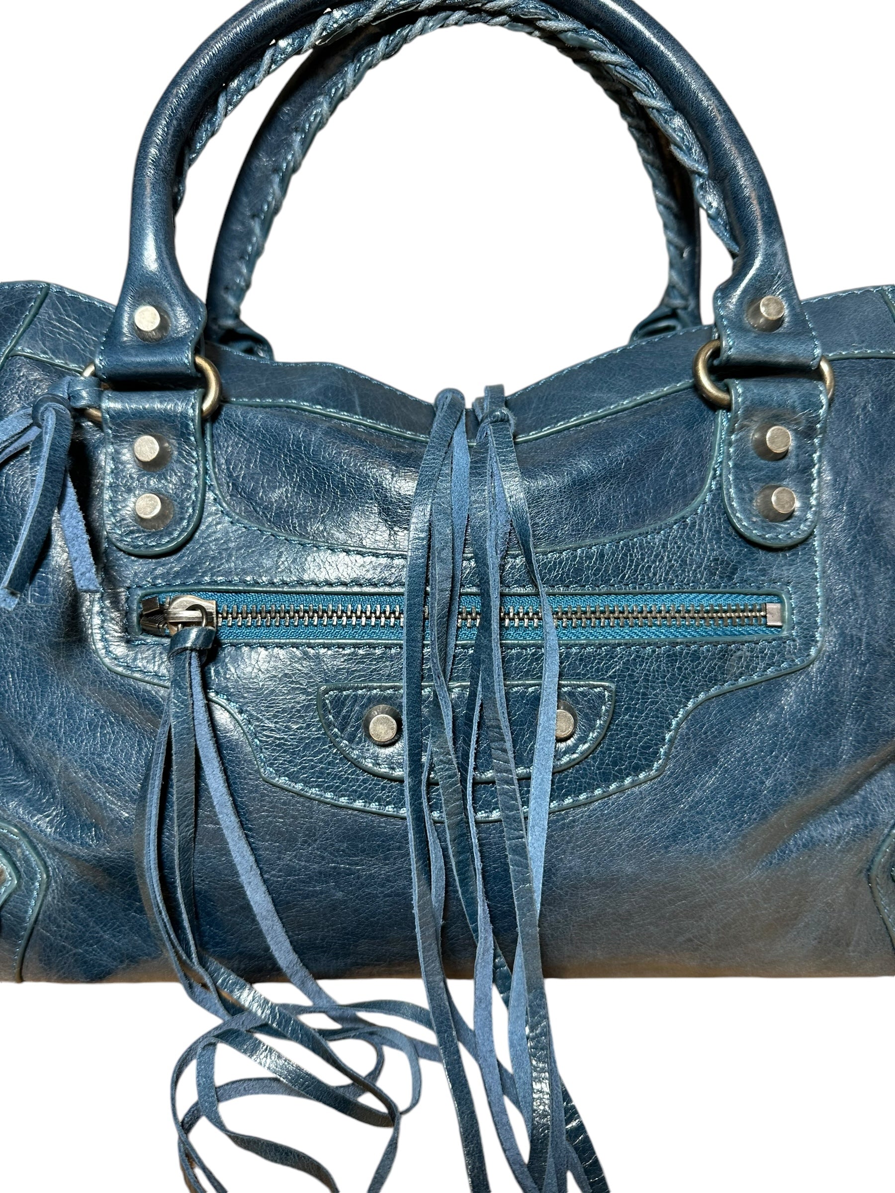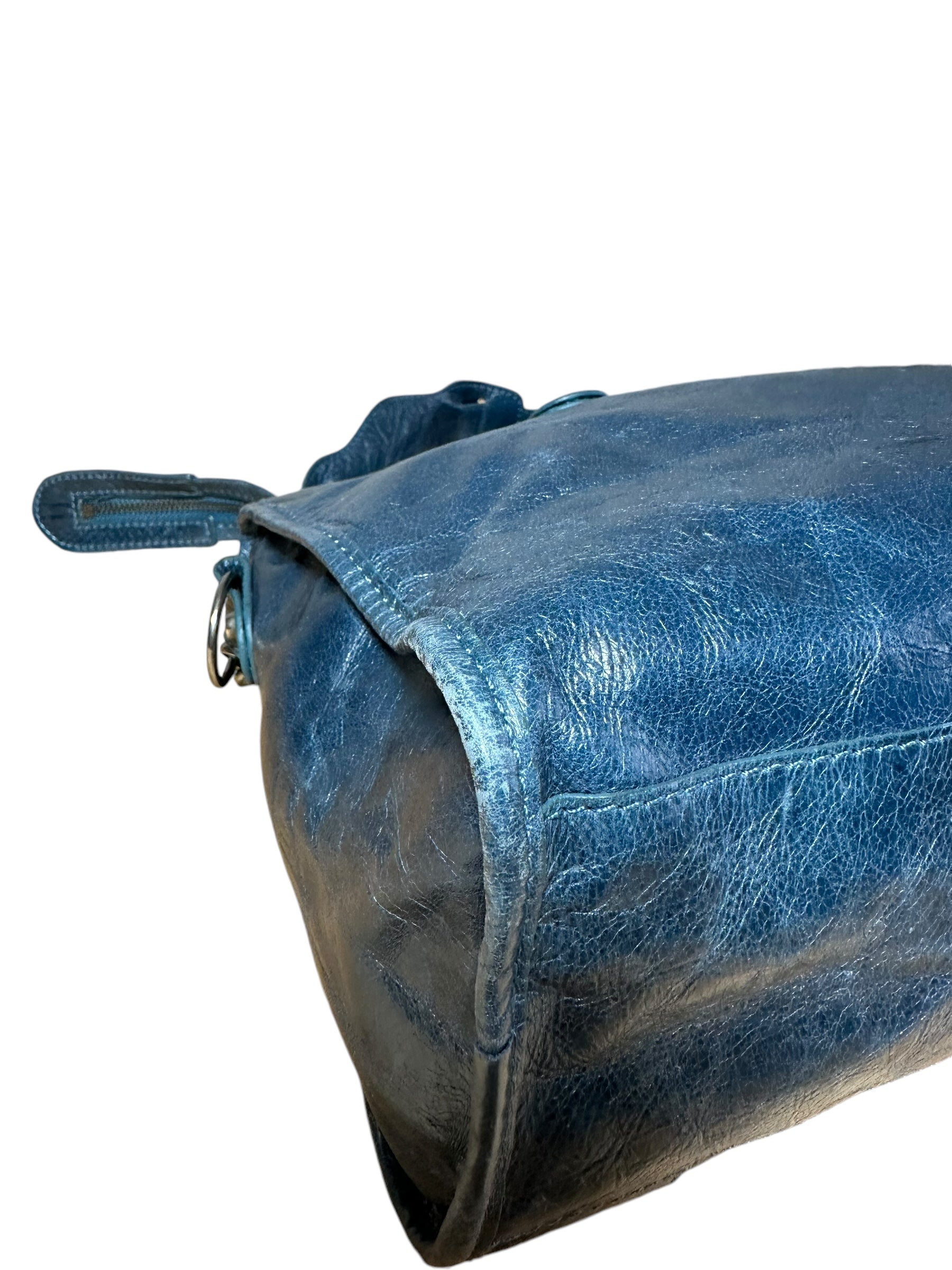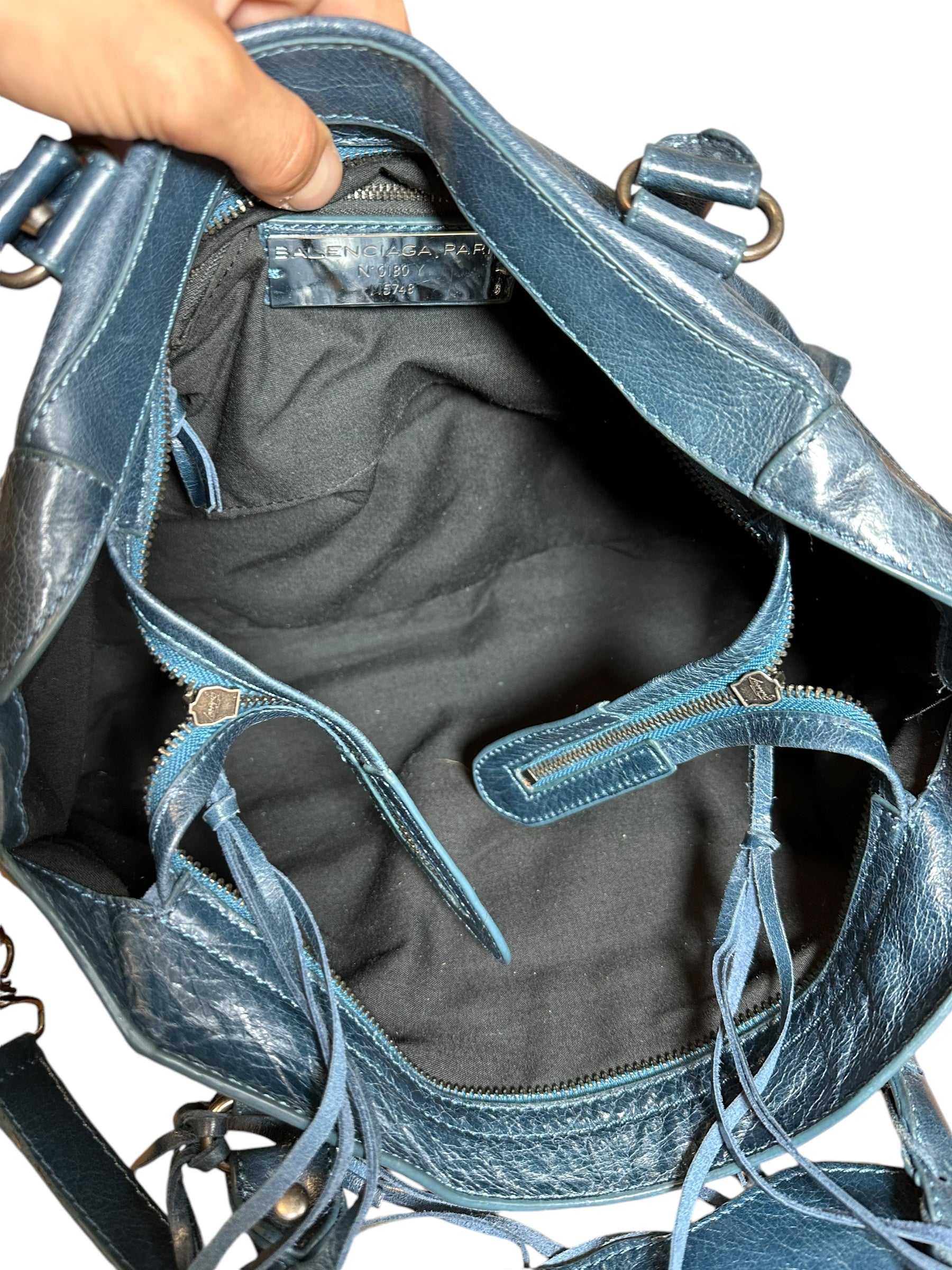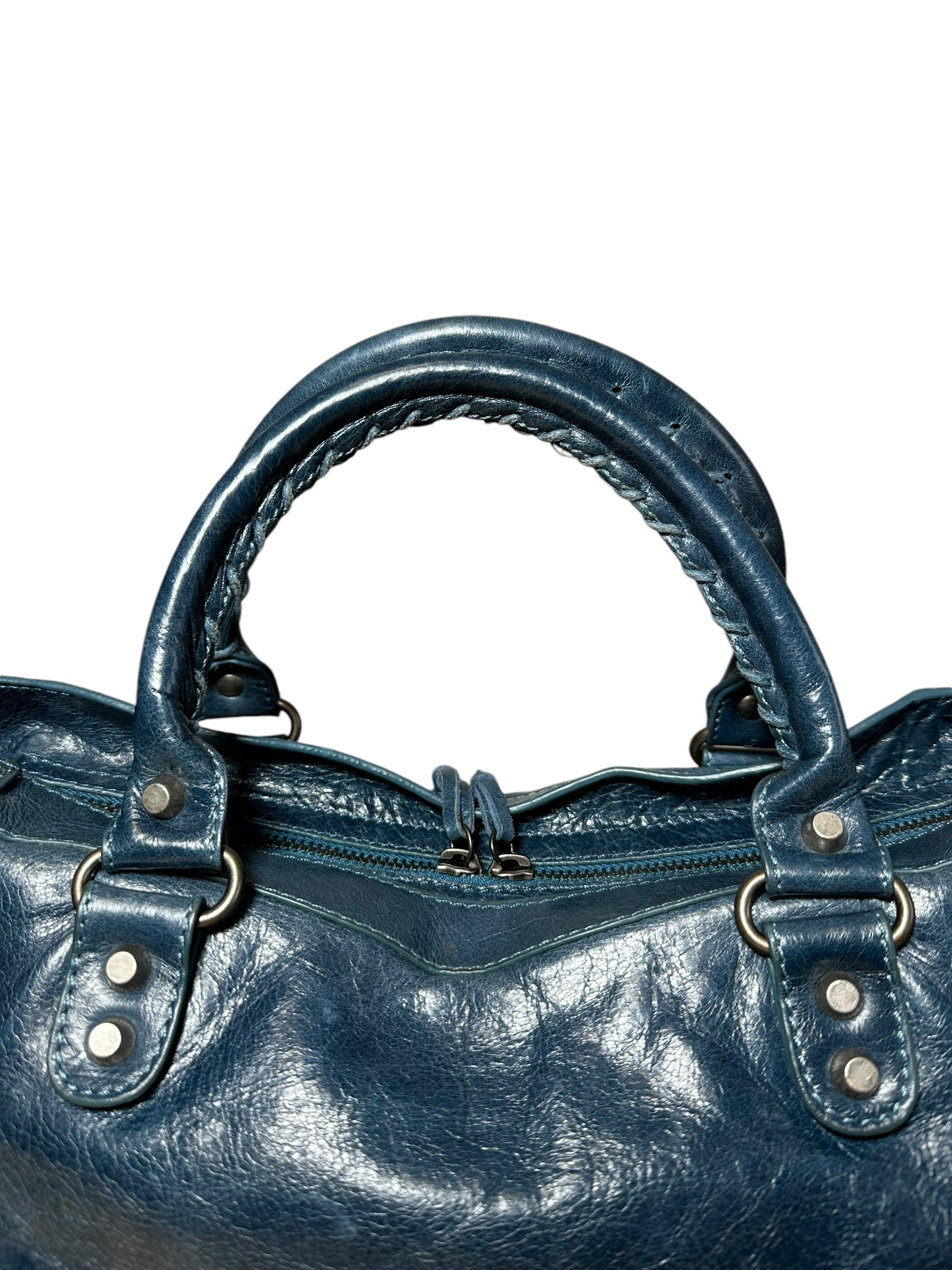 Balenciaga borsa city vintage in pelle blu petrolio con manici rigidi, chiusure a zip a tiranti in fili di pelle. Taschino sul sanati e tracolla rimovibile. Riporta lievi segni di usura sulla base e sugli angoli. Non viene spedita con dust bag logata.