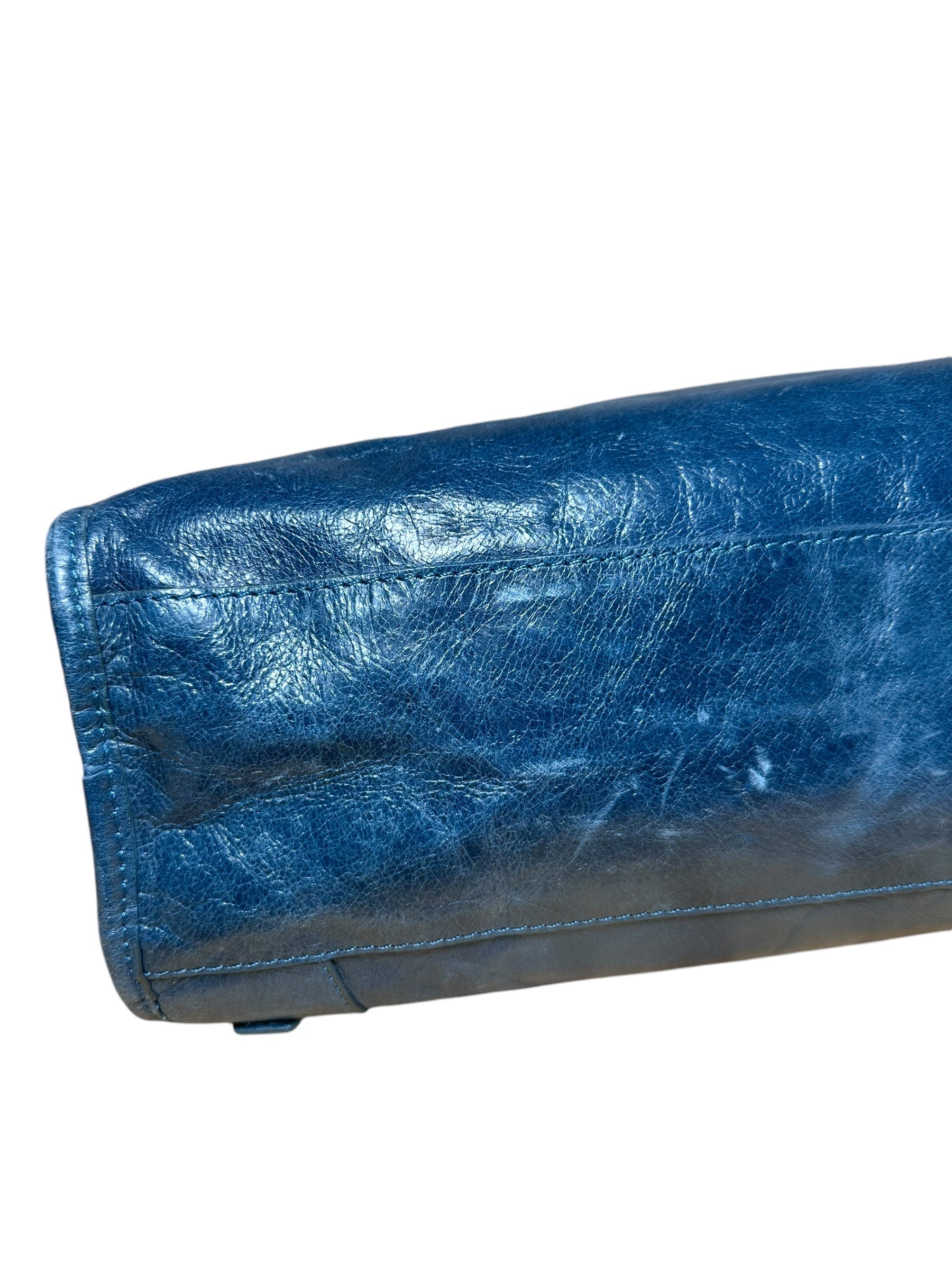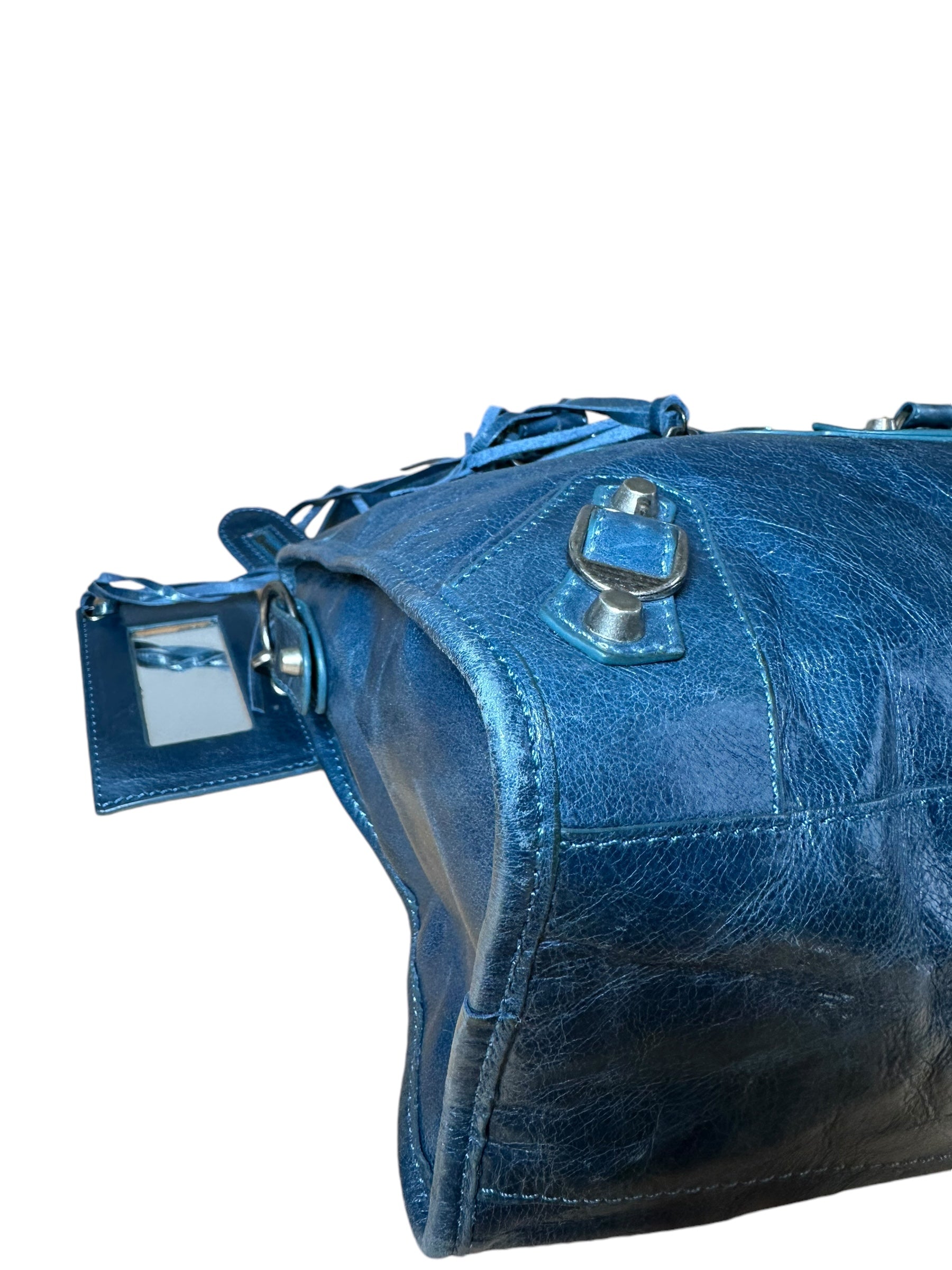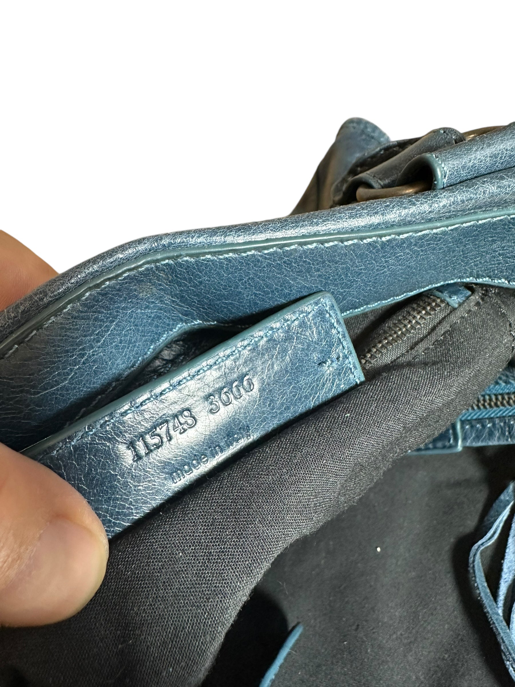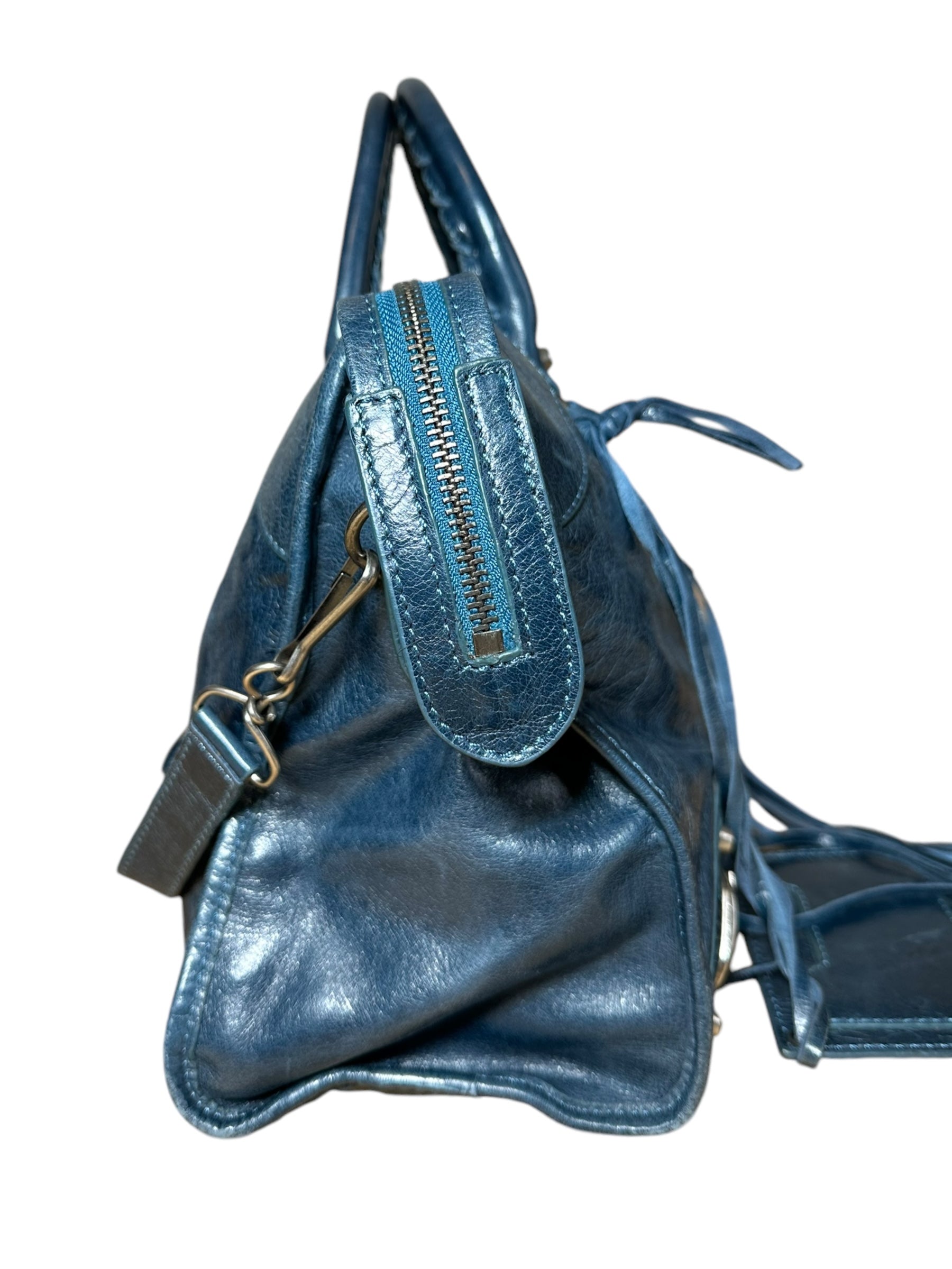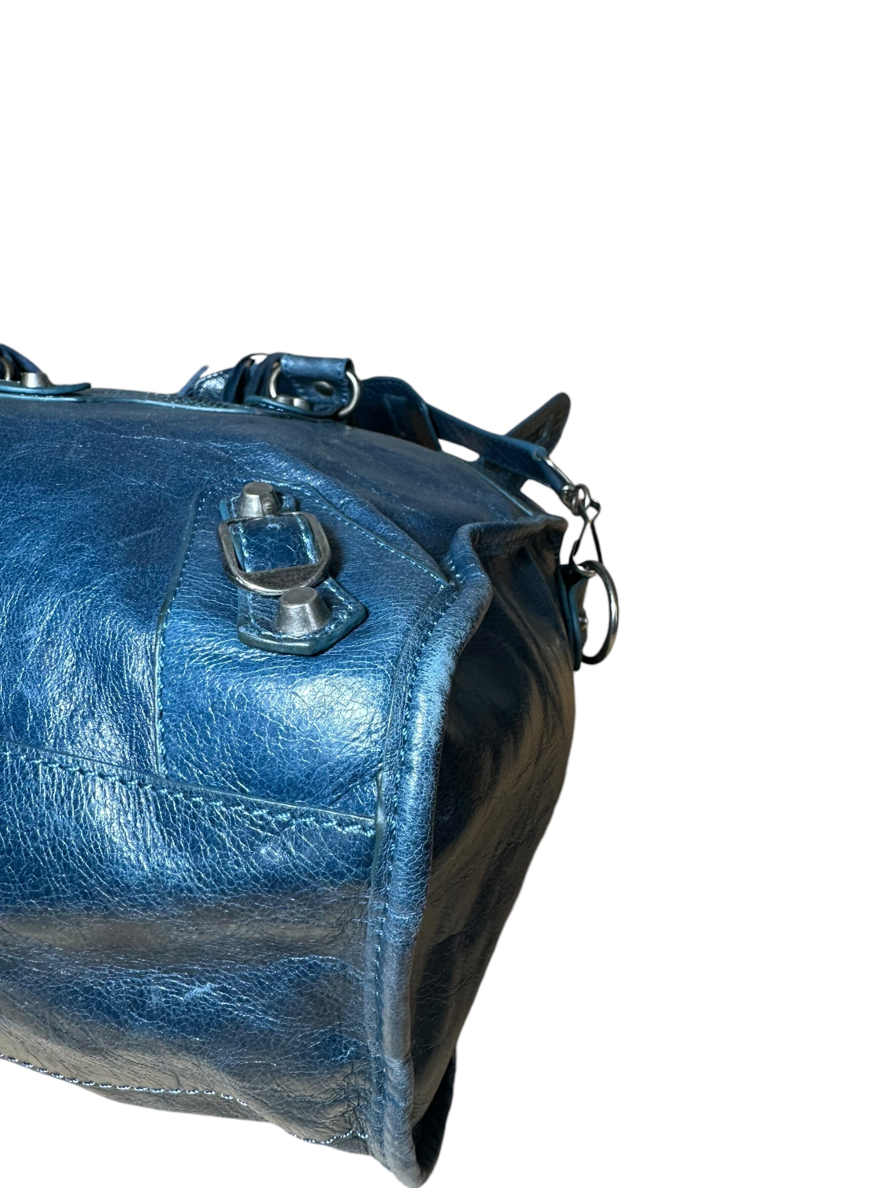 Balenciaga borsa city vintage in pelle blu petrolio con manici rigidi, chiusure a zip a tiranti in fili di pelle. Taschino sul sanati e tracolla rimovibile. Riporta lievi segni di usura sulla base e sugli angoli. Non viene spedita con dust bag logata.