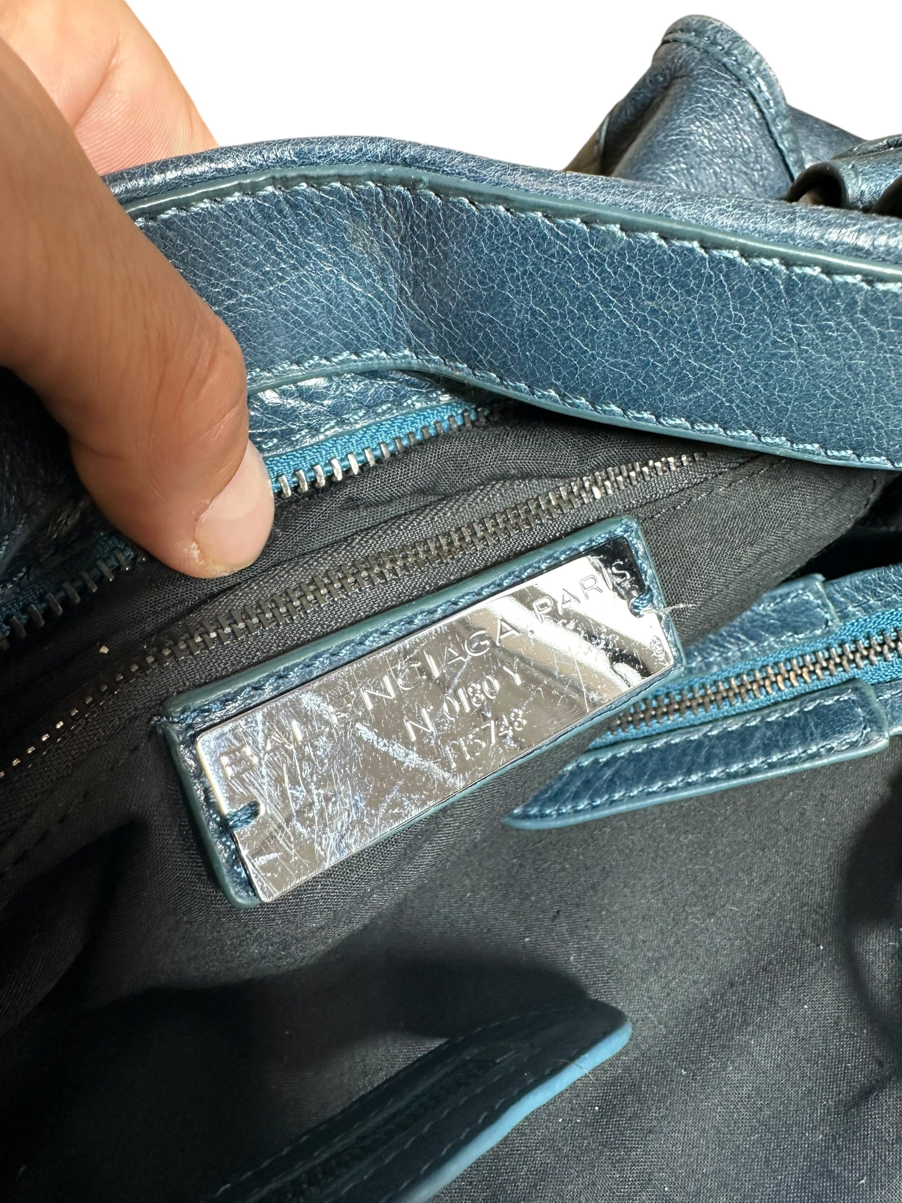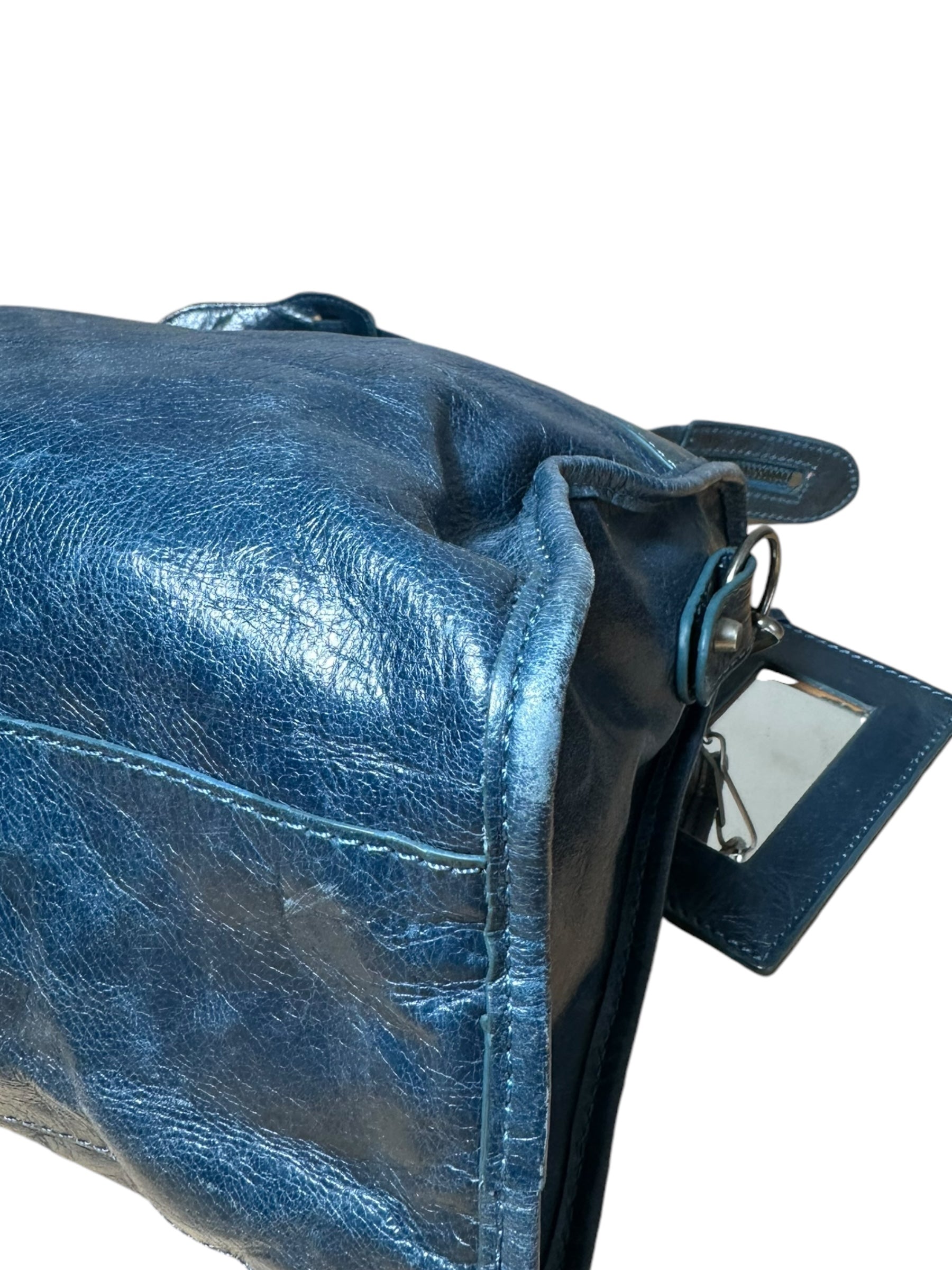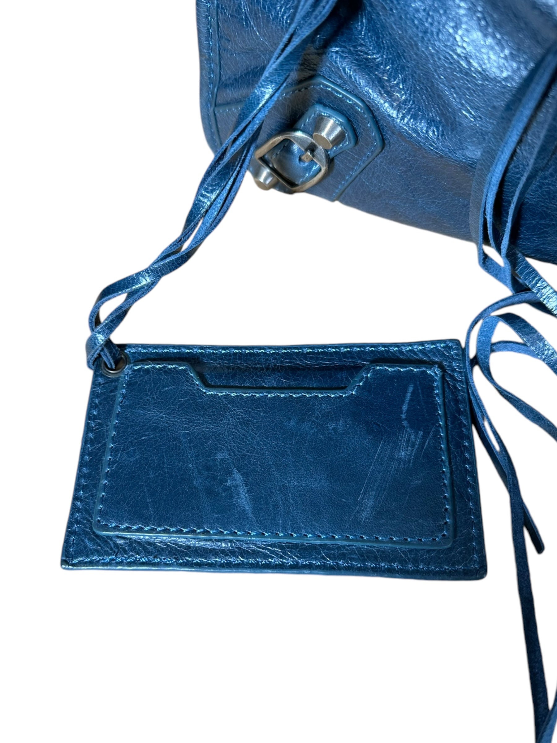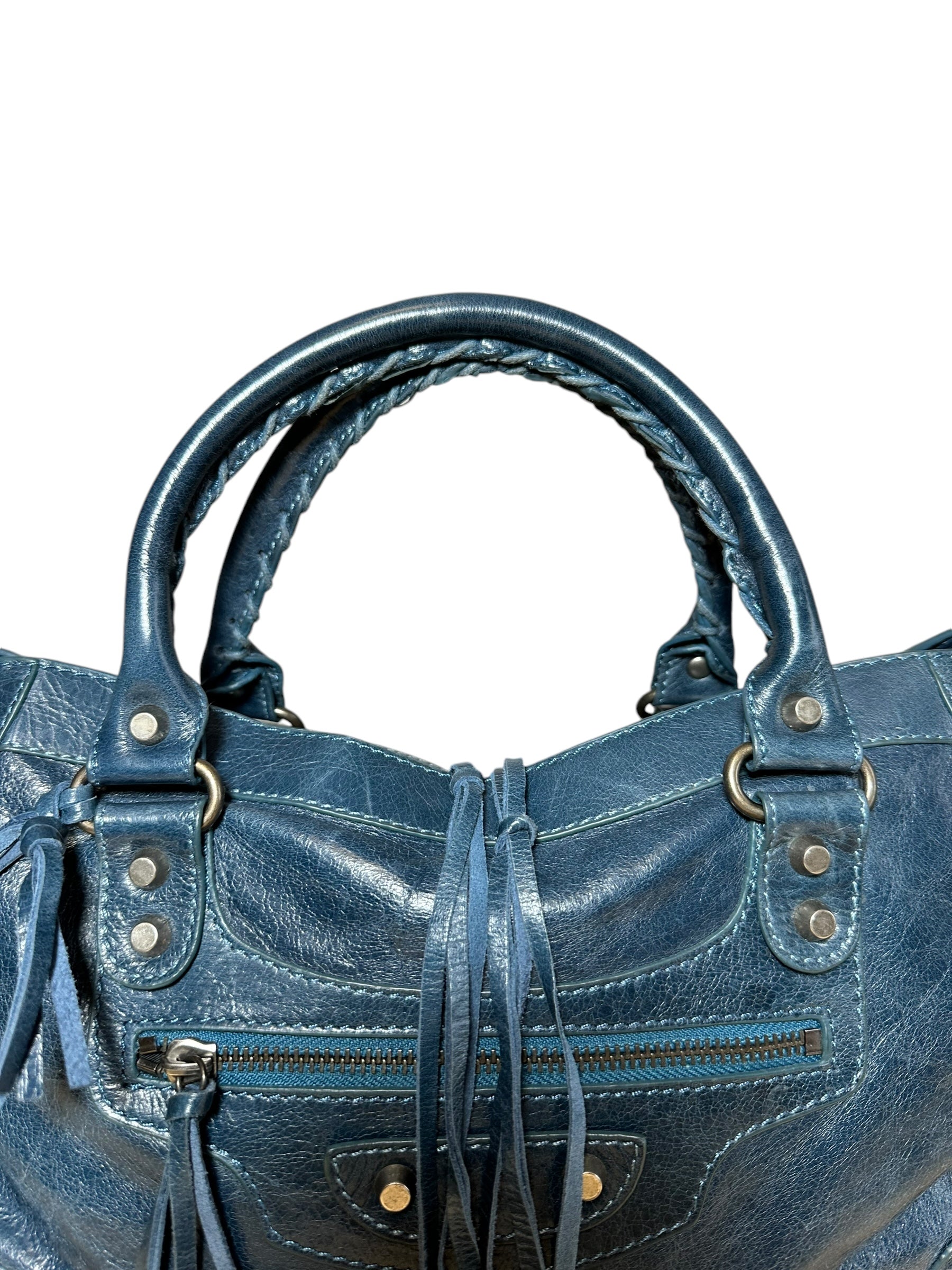 Balenciaga borsa city vintage in pelle blu petrolio con manici rigidi, chiusure a zip a tiranti in fili di pelle. Taschino sul sanati e tracolla rimovibile. Riporta lievi segni di usura sulla base e sugli angoli. Non viene spedita con dust bag logata.