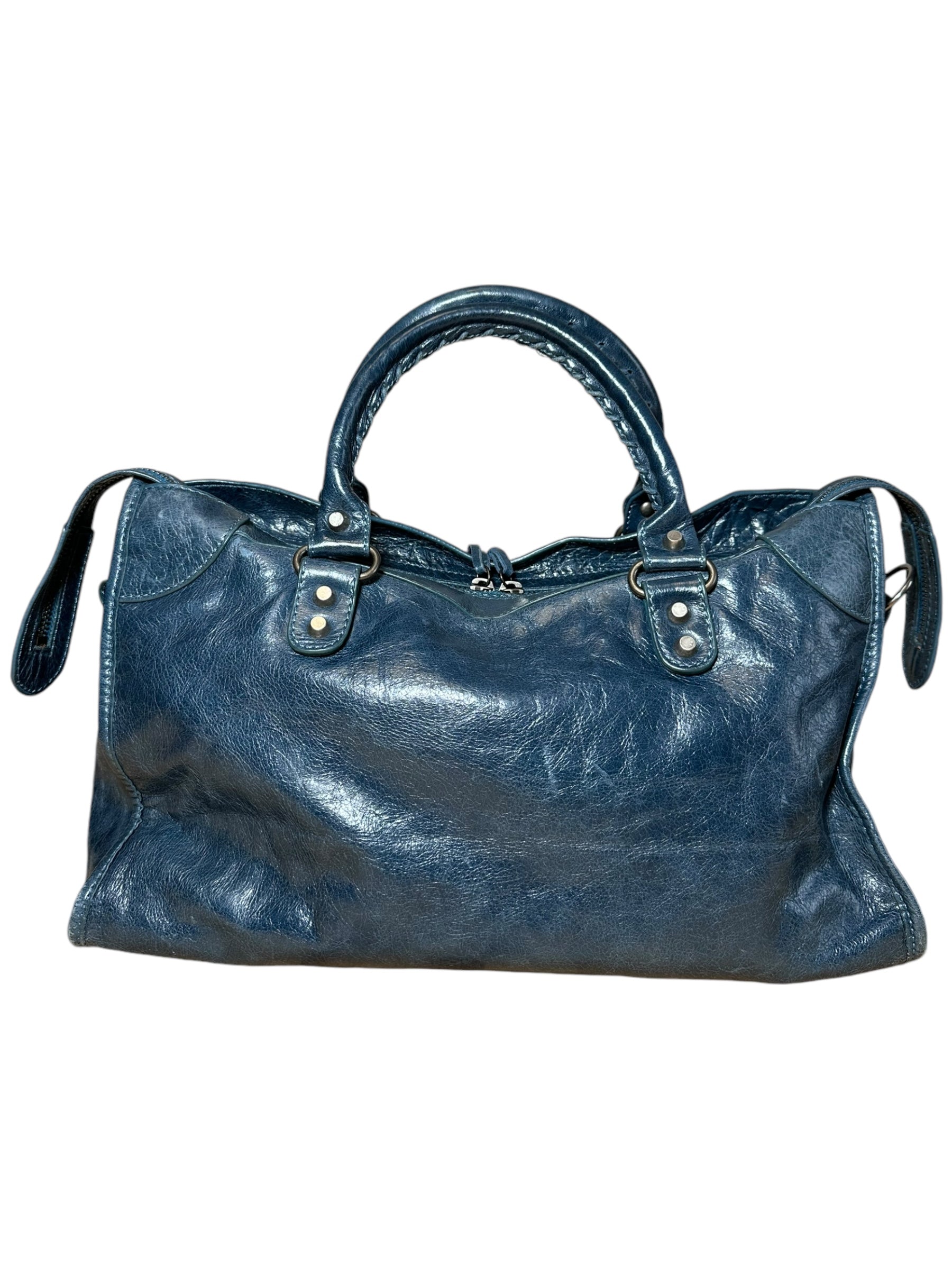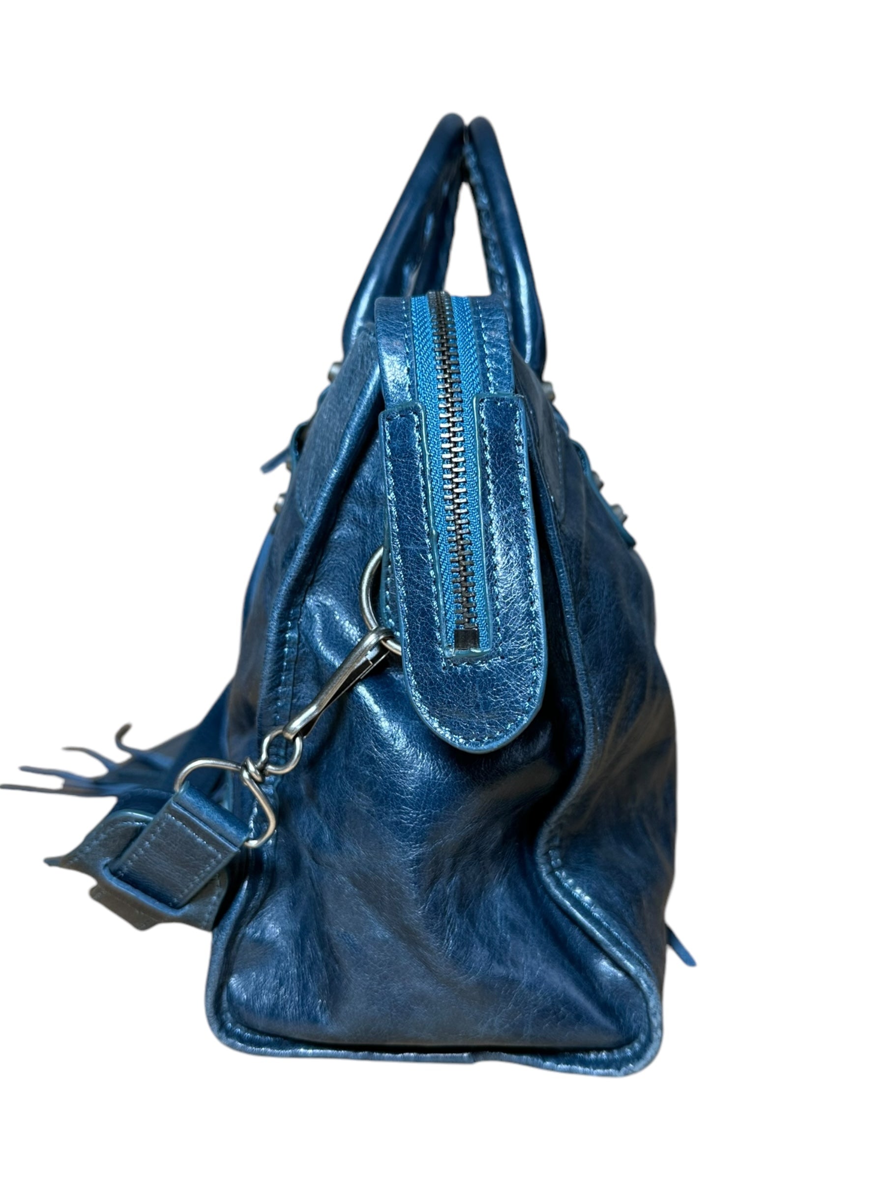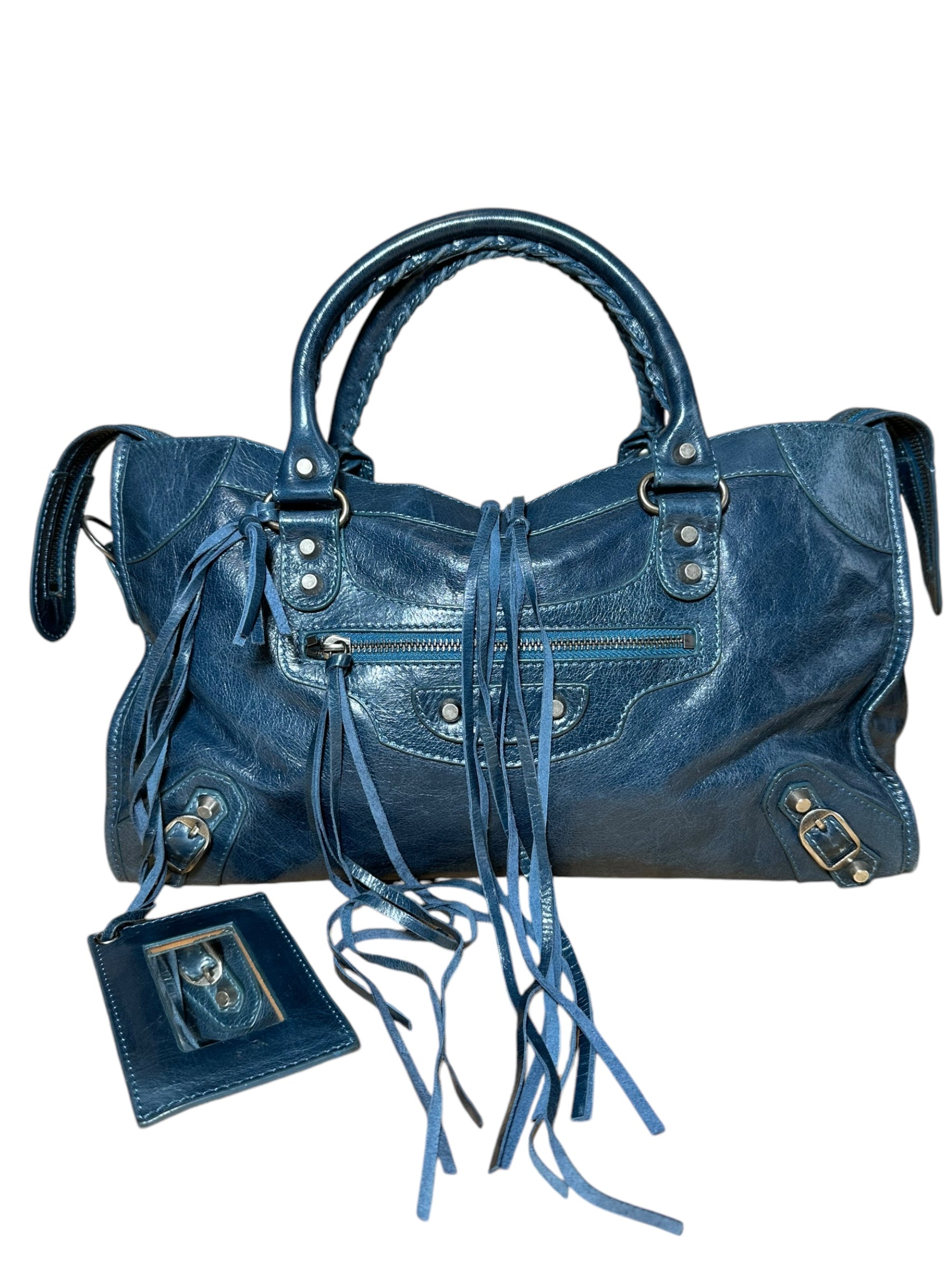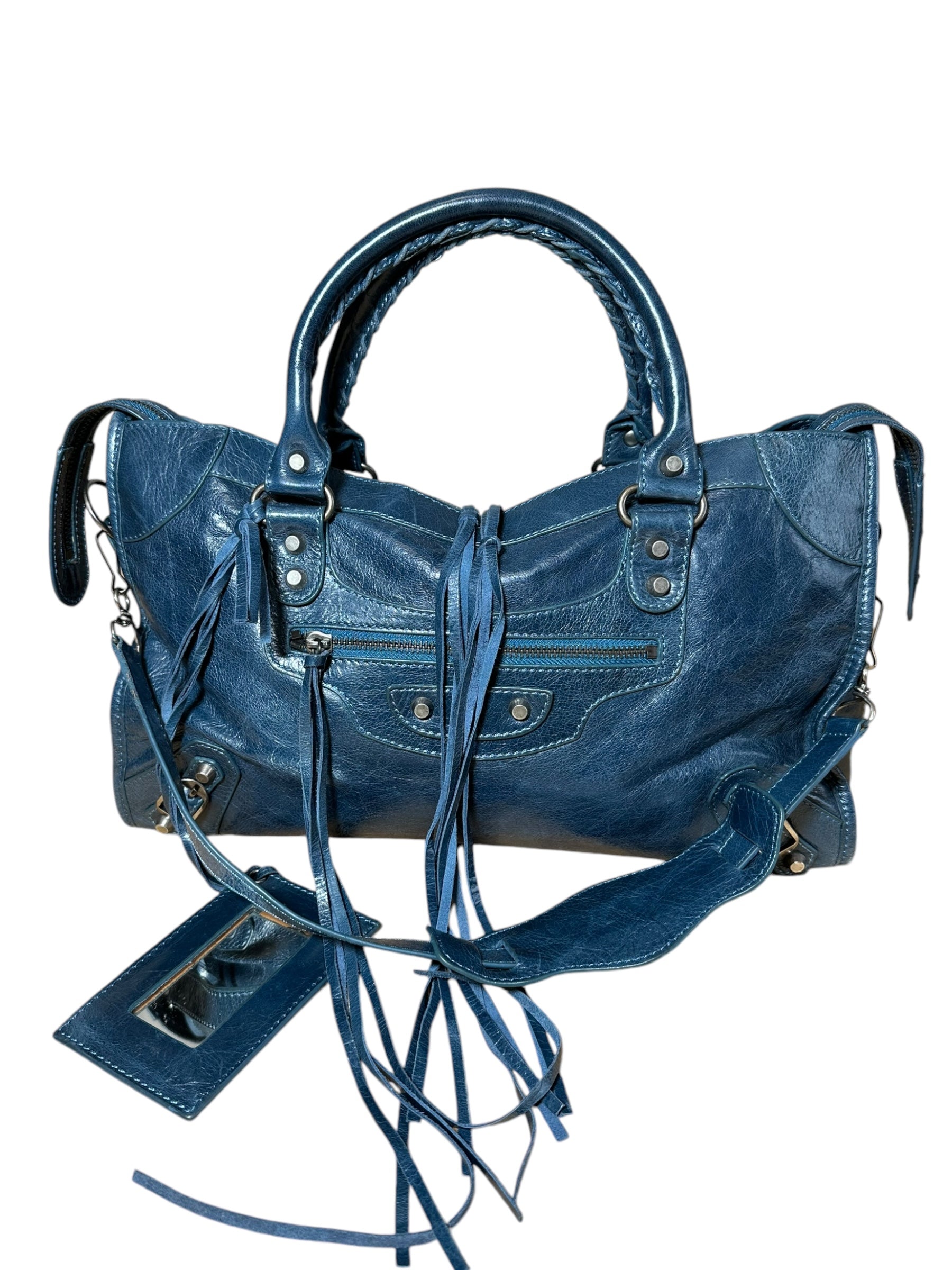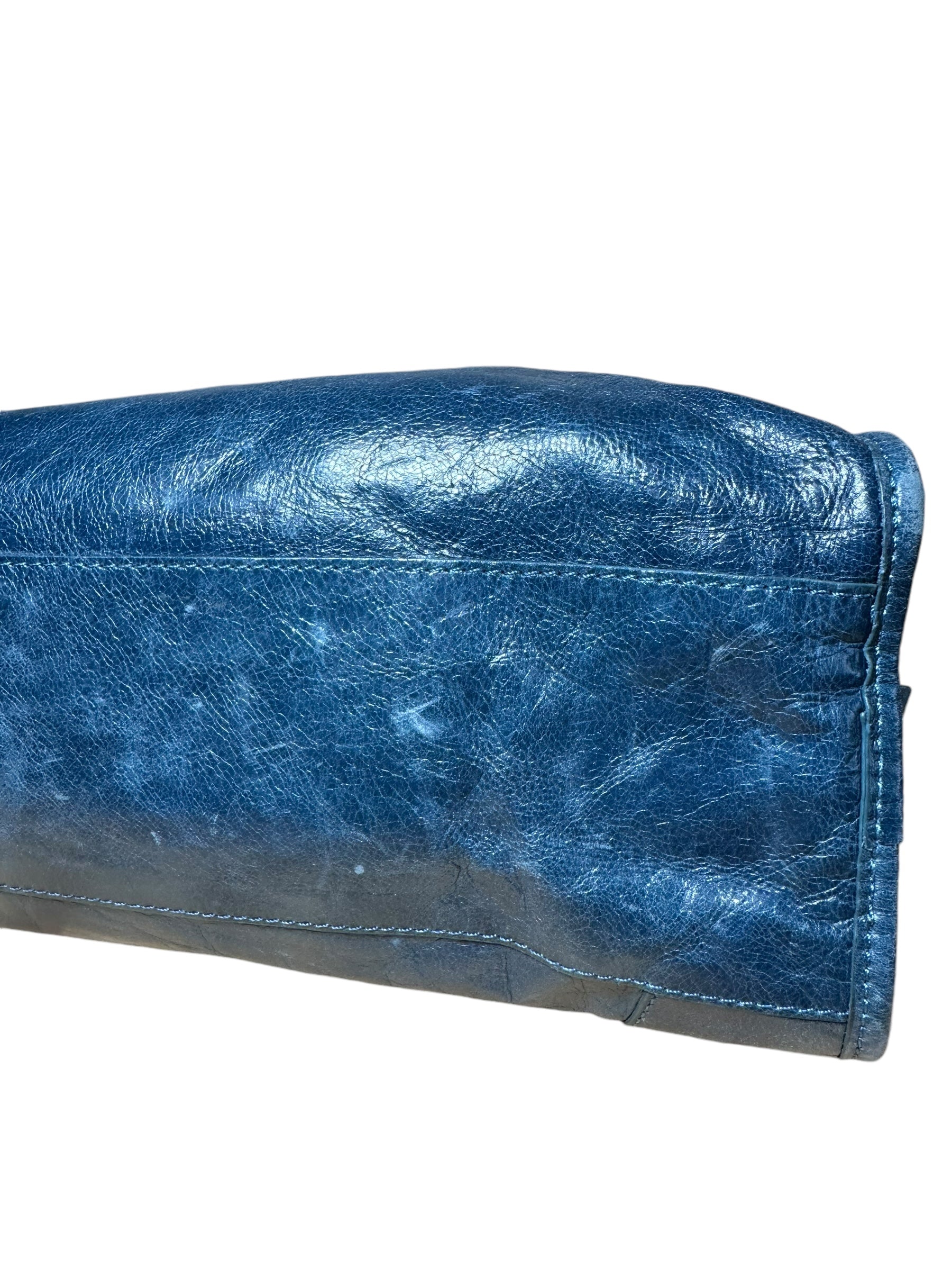 Balenciaga borsa city vintage in pelle blu petrolio con manici rigidi, chiusure a zip a tiranti in fili di pelle. Taschino sul sanati e tracolla rimovibile. Riporta lievi segni di usura sulla base e sugli angoli. Non viene spedita con dust bag logata.