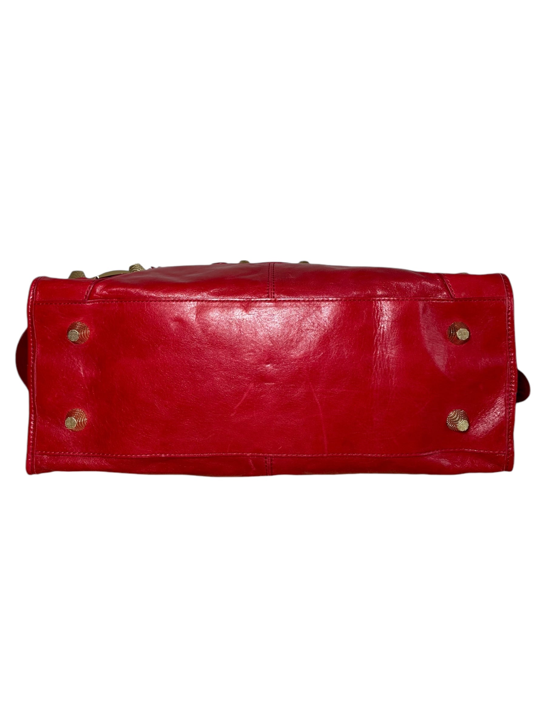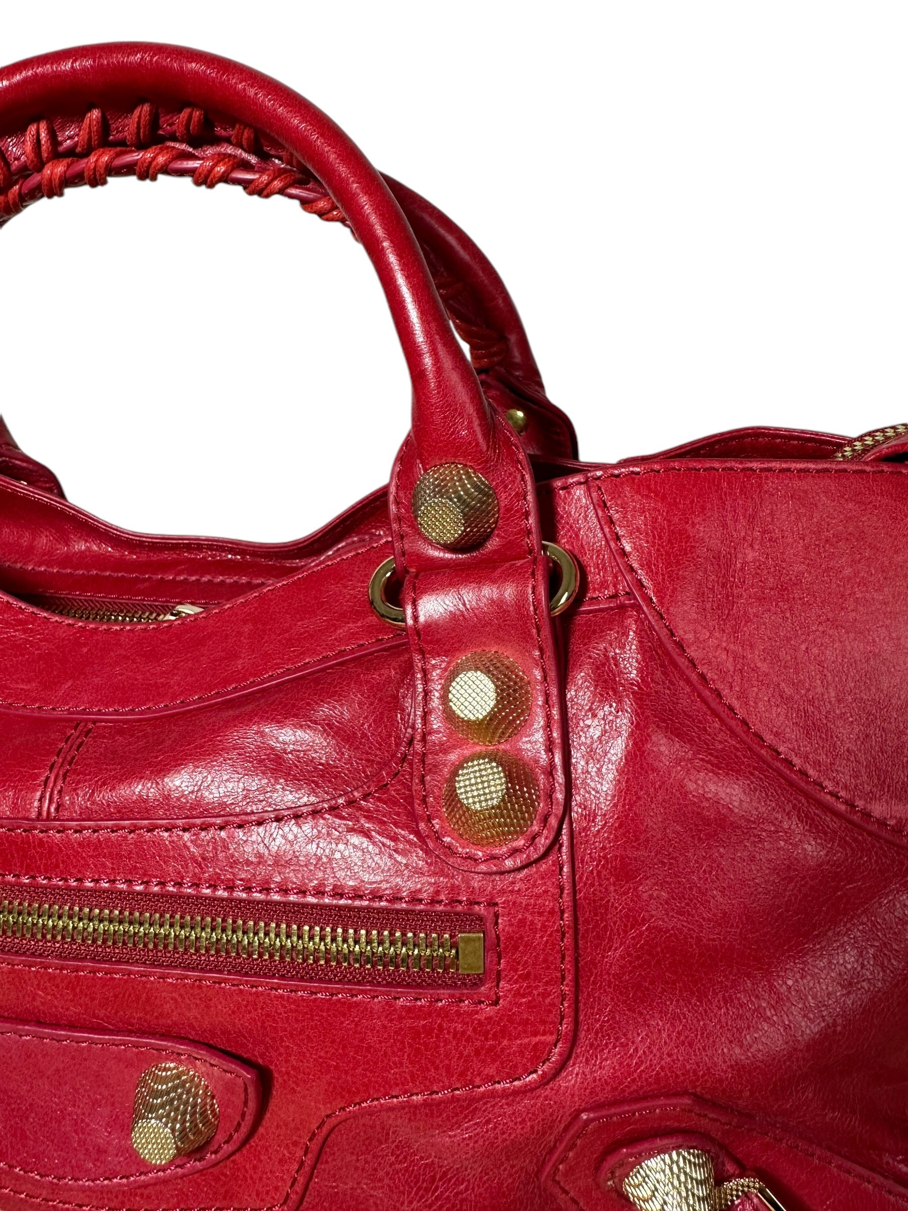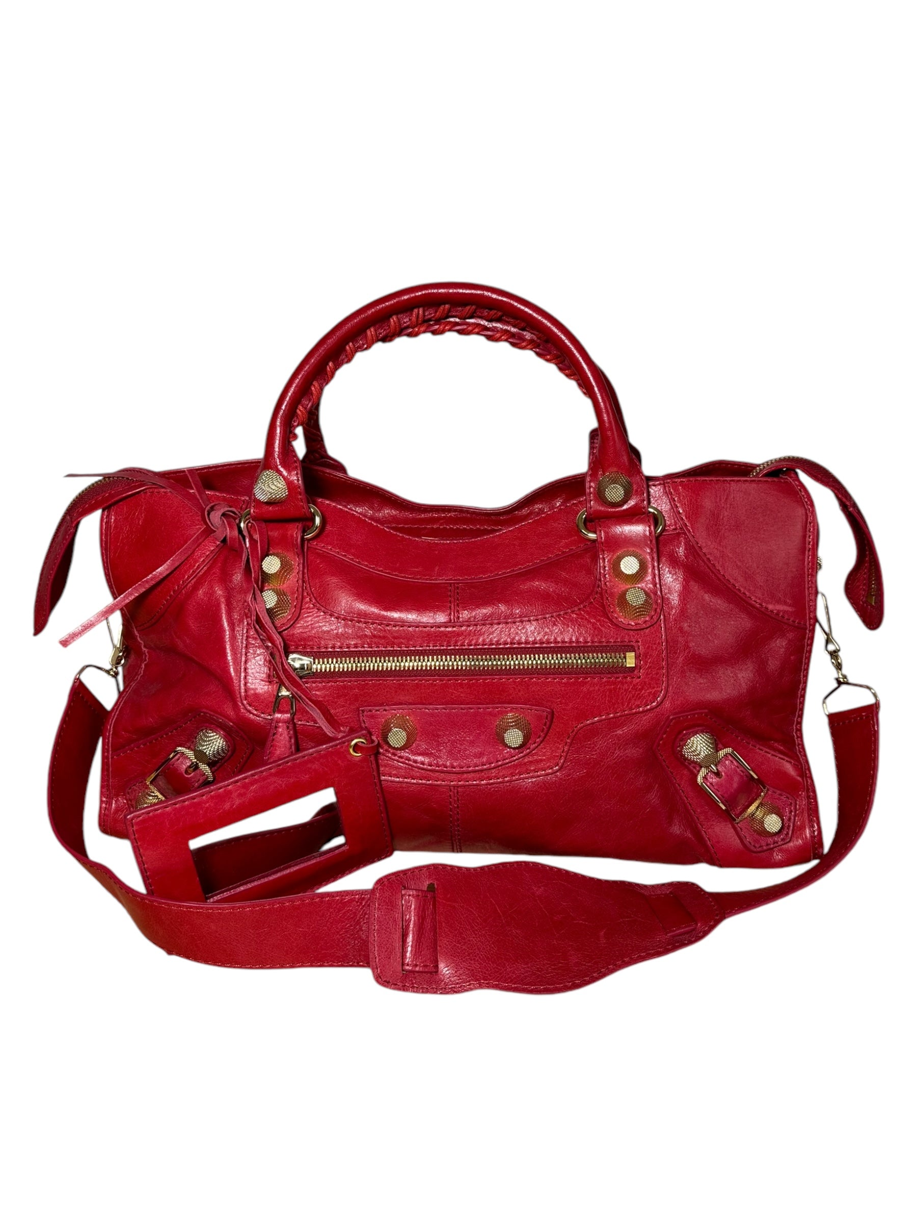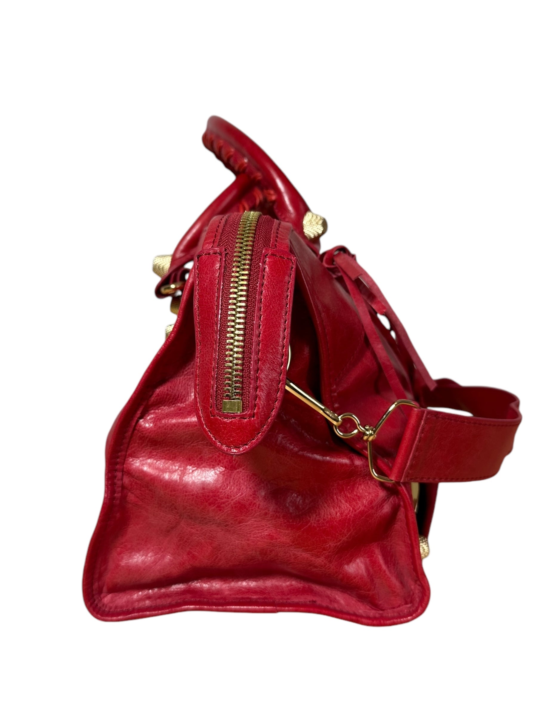 Balenciaga borsa city vintage in pelle rossa con hardware in metallo dorato, tracolla rimovibile e chiusure con zip in metallo. Viene spedita con dust bag. Micro segno su un angolo.