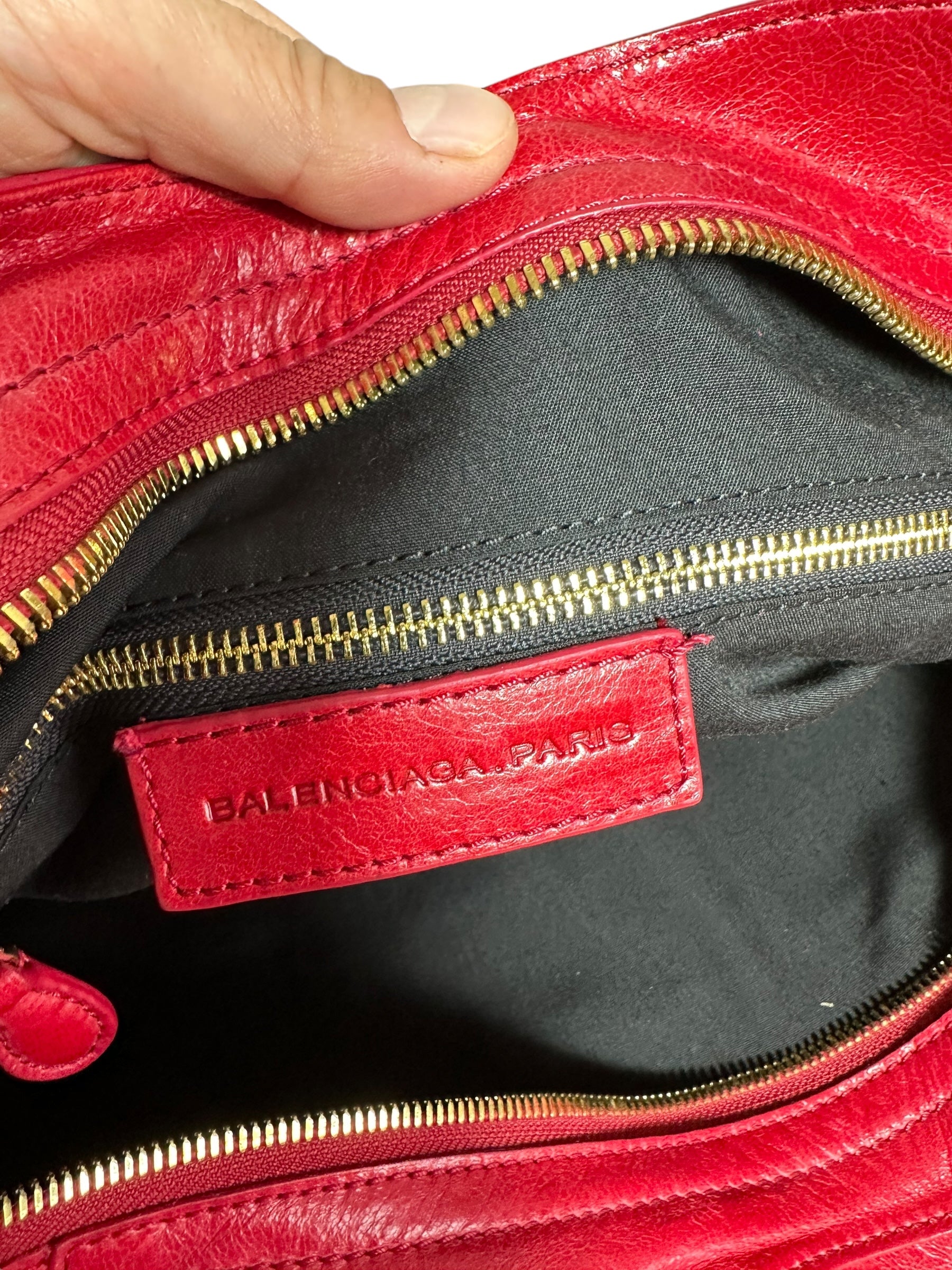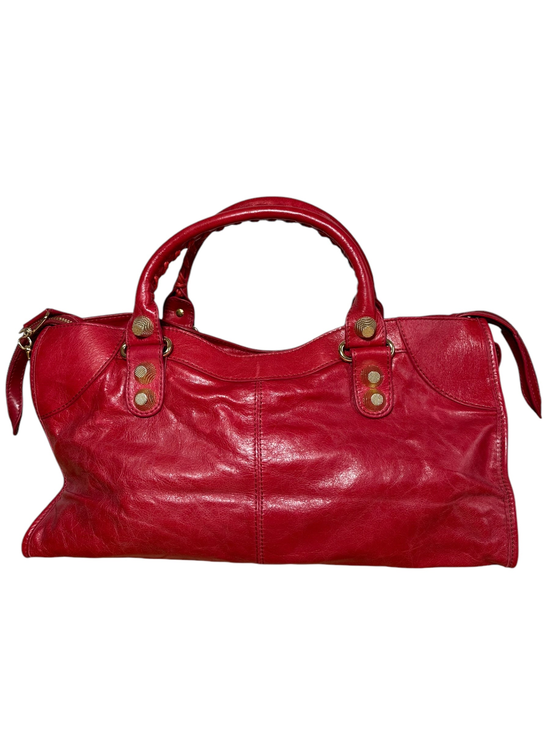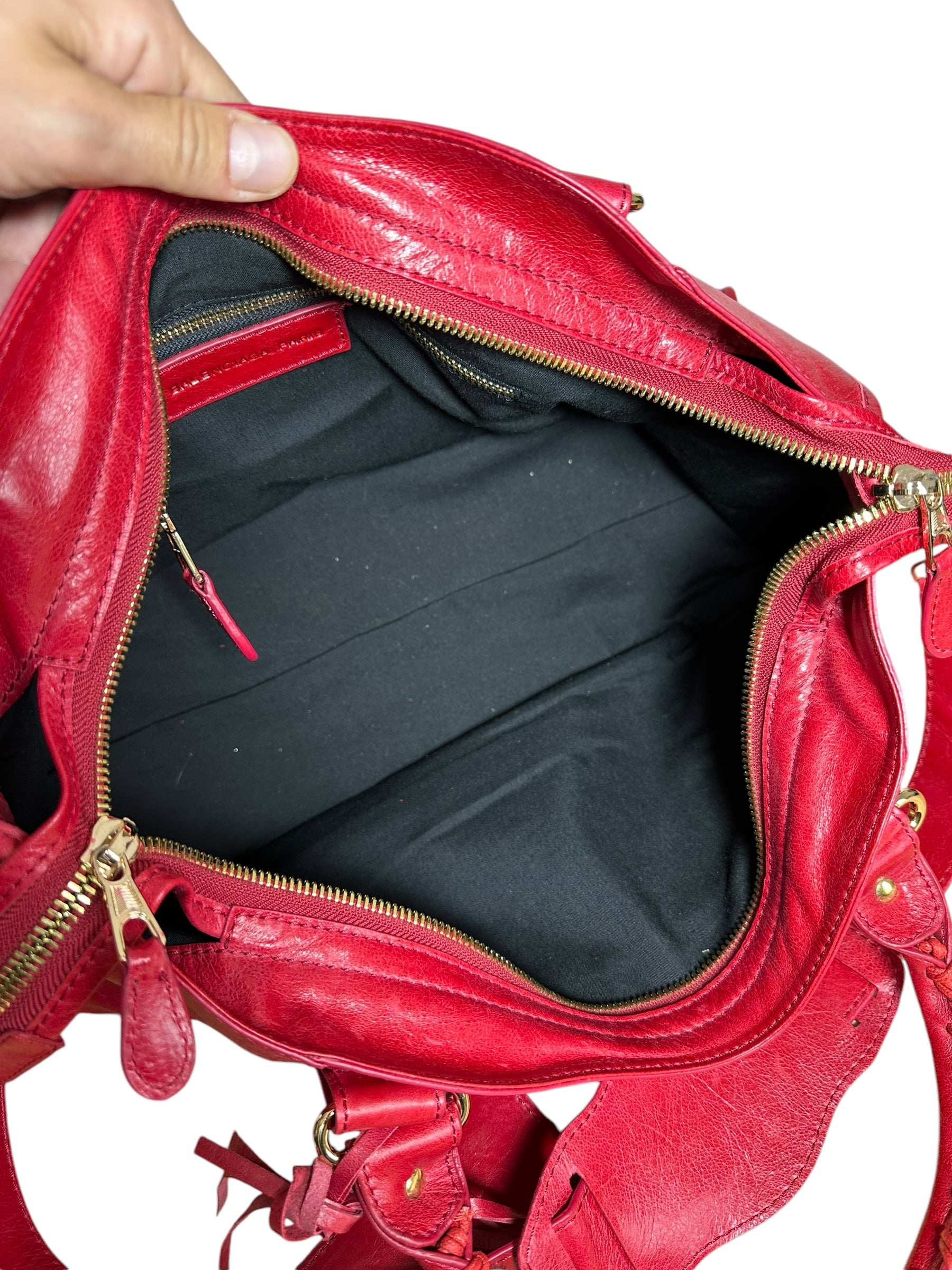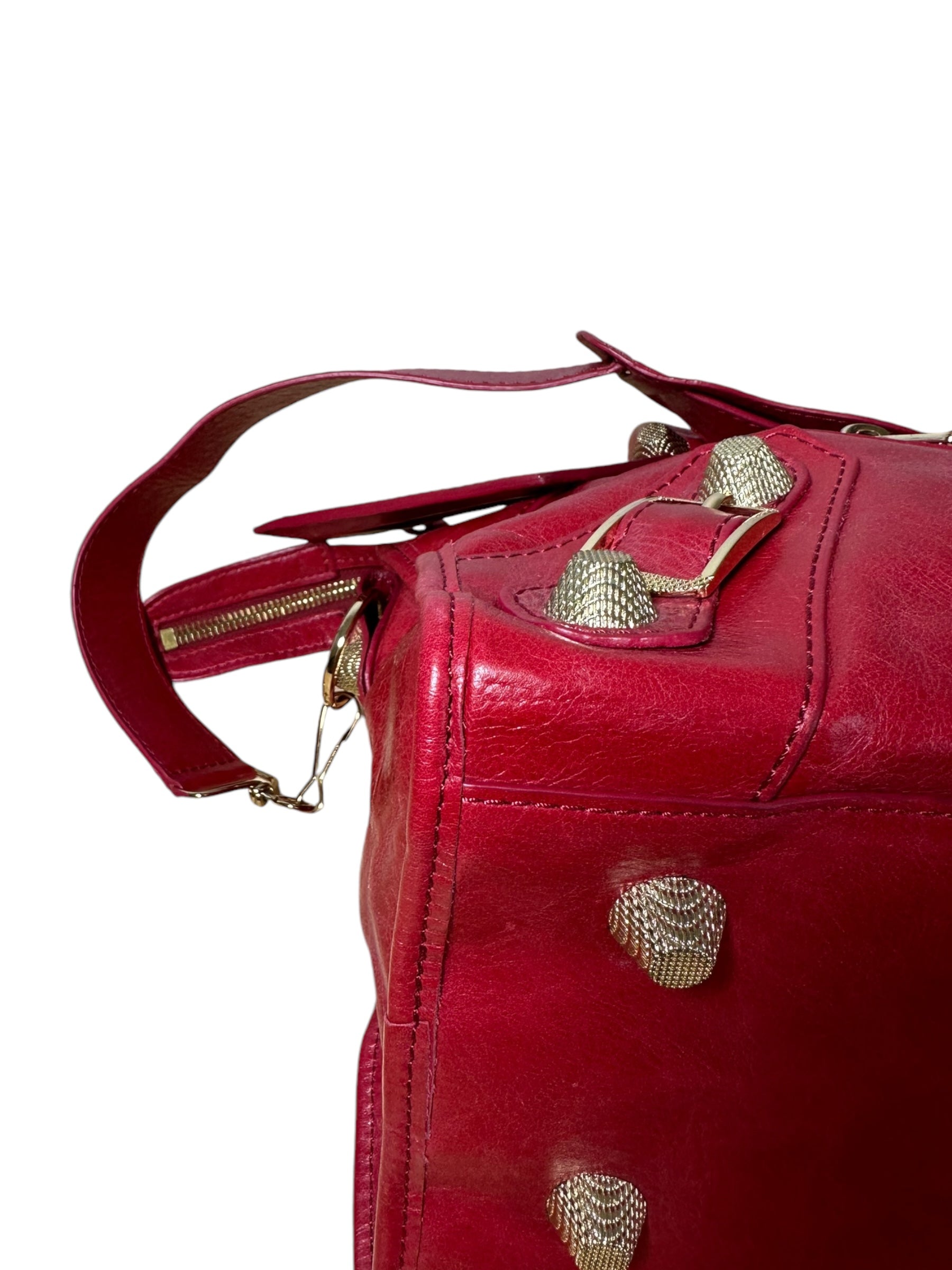 Balenciaga borsa city vintage in pelle rossa con hardware in metallo dorato, tracolla rimovibile e chiusure con zip in metallo. Viene spedita con dust bag. Micro segno su un angolo.