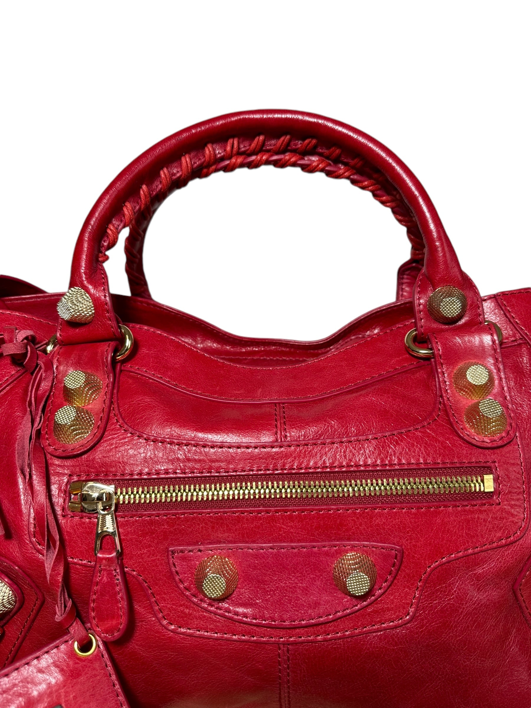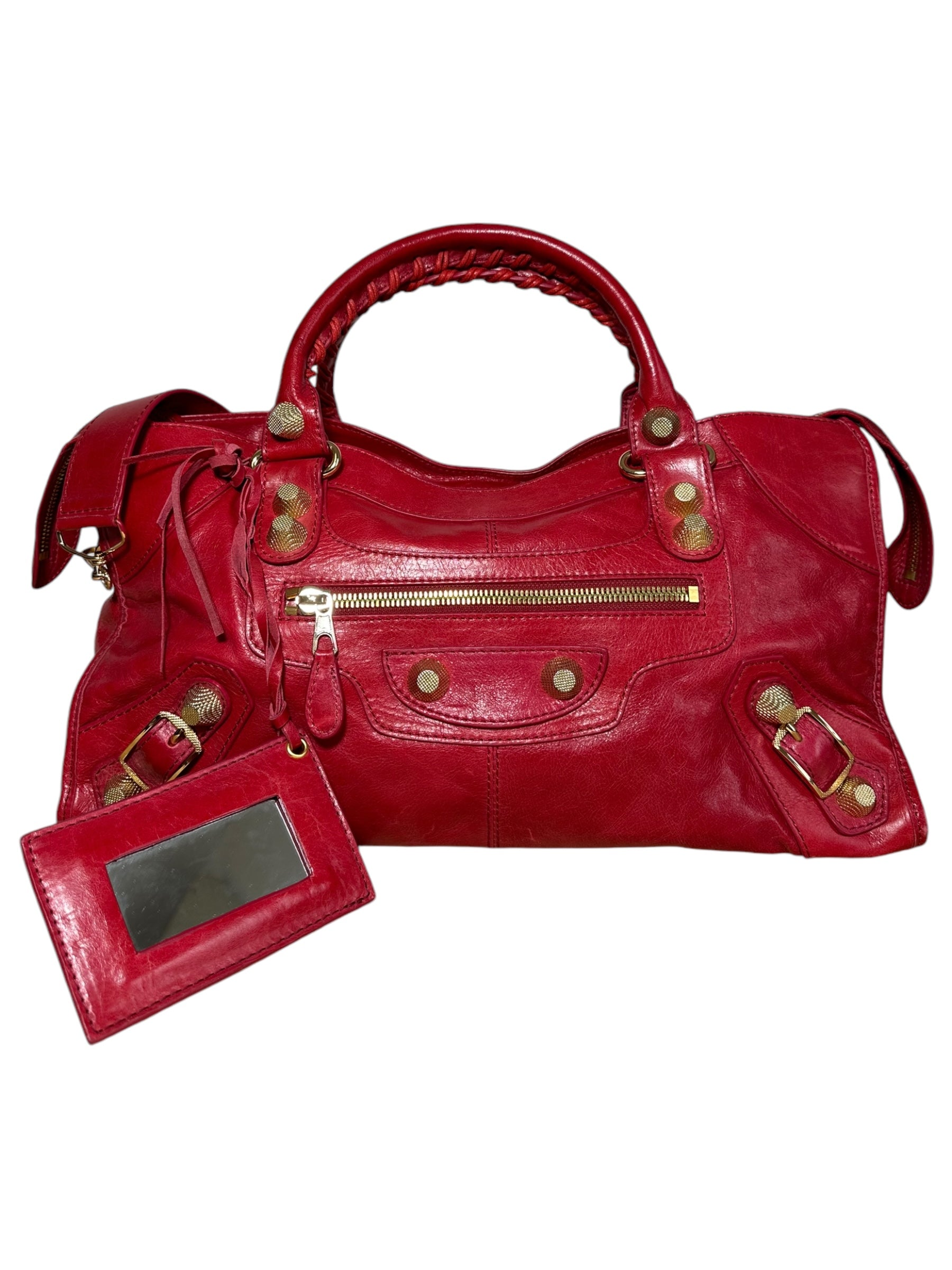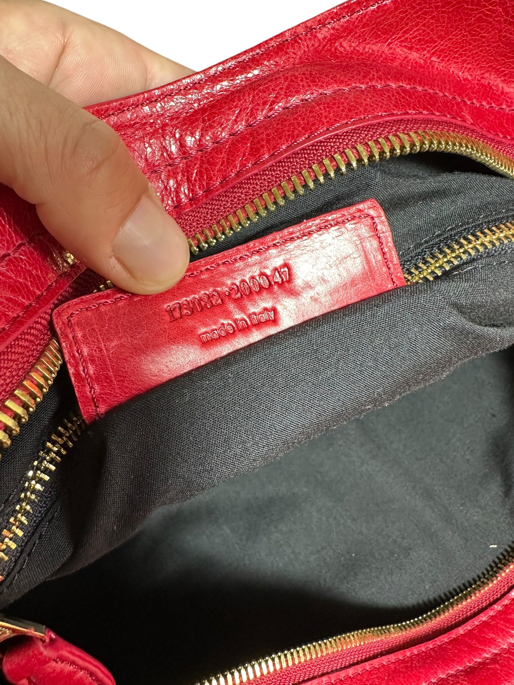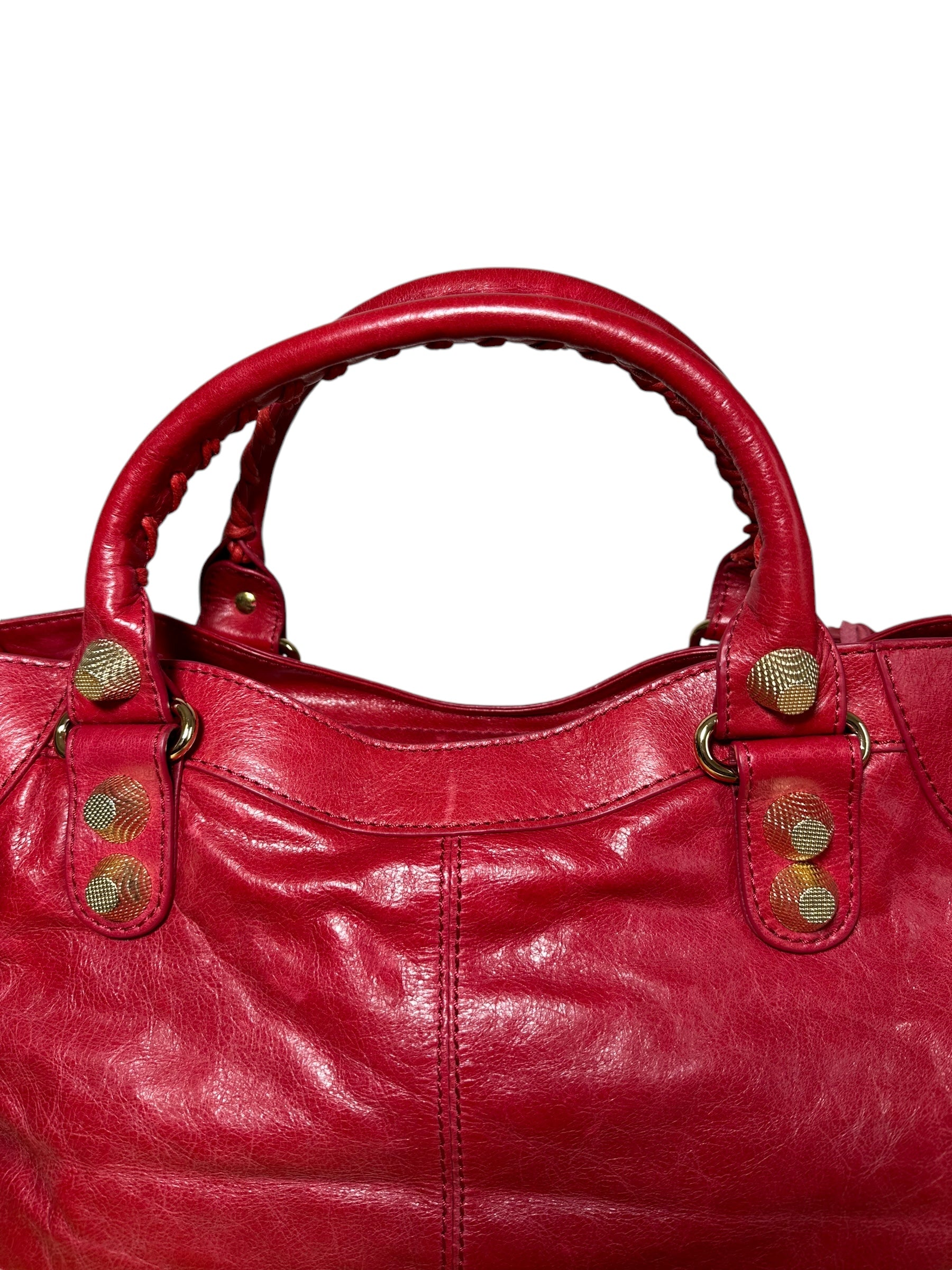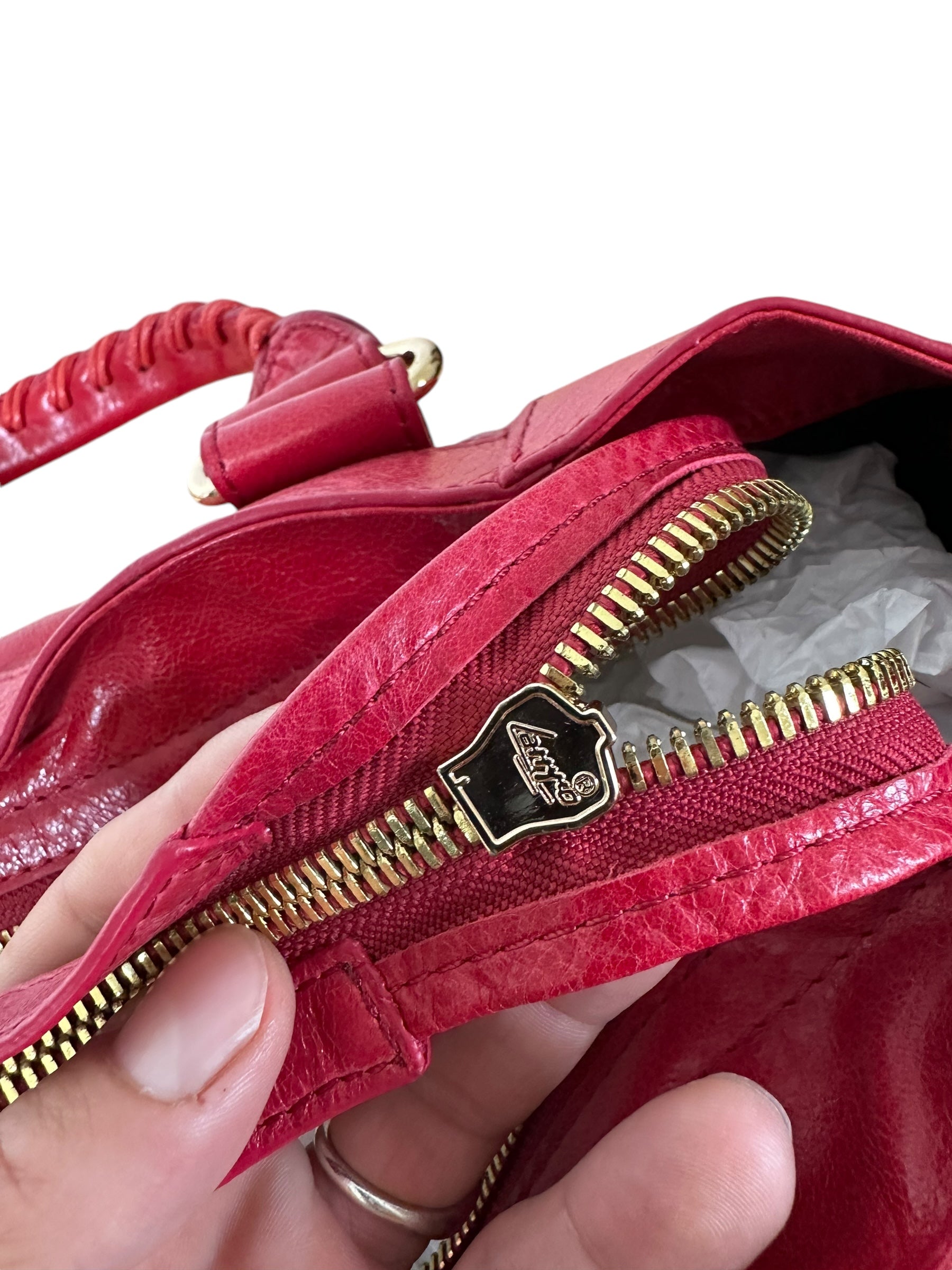 Balenciaga borsa city vintage in pelle rossa con hardware in metallo dorato, tracolla rimovibile e chiusure con zip in metallo. Viene spedita con dust bag. Micro segno su un angolo.