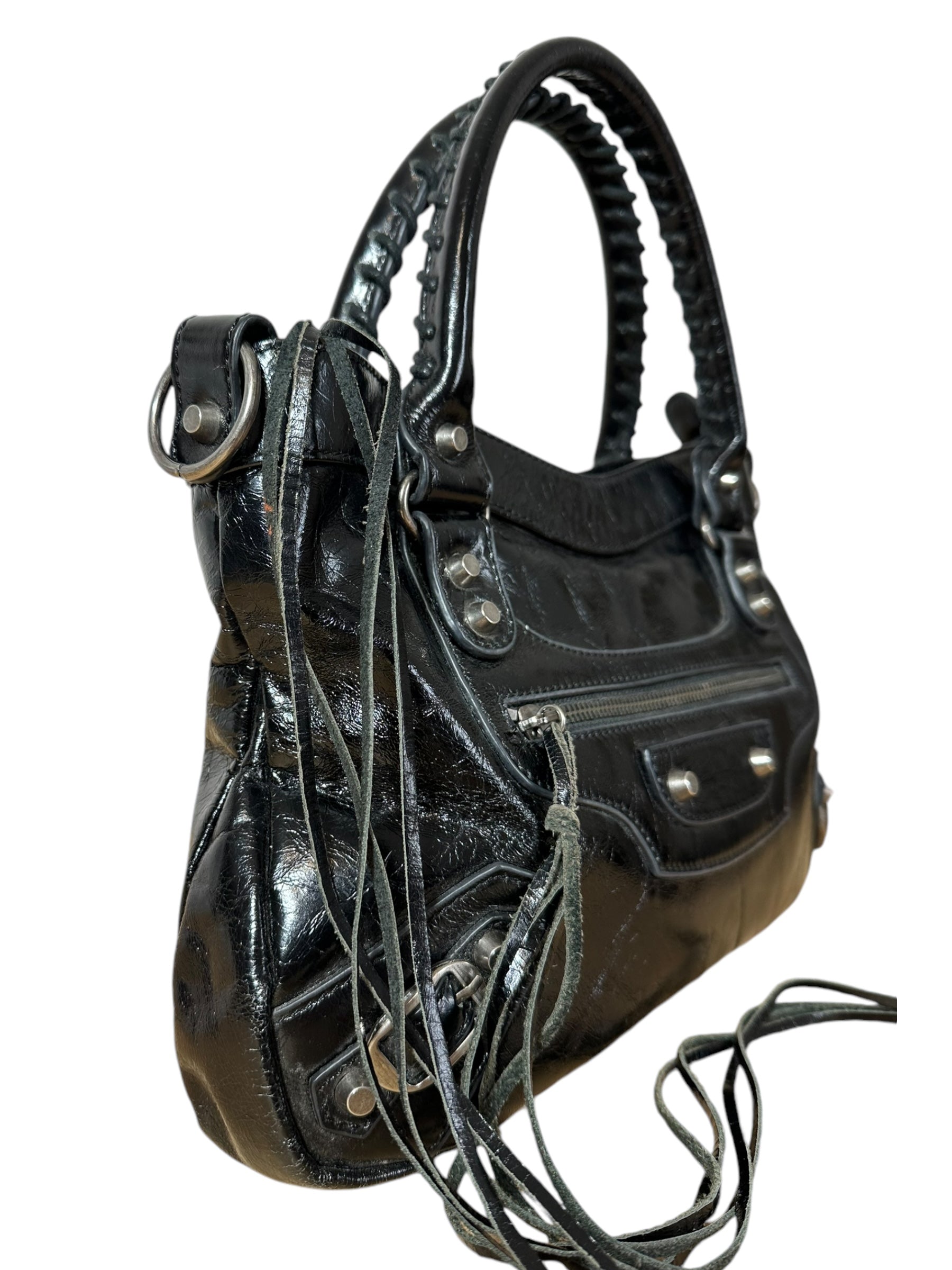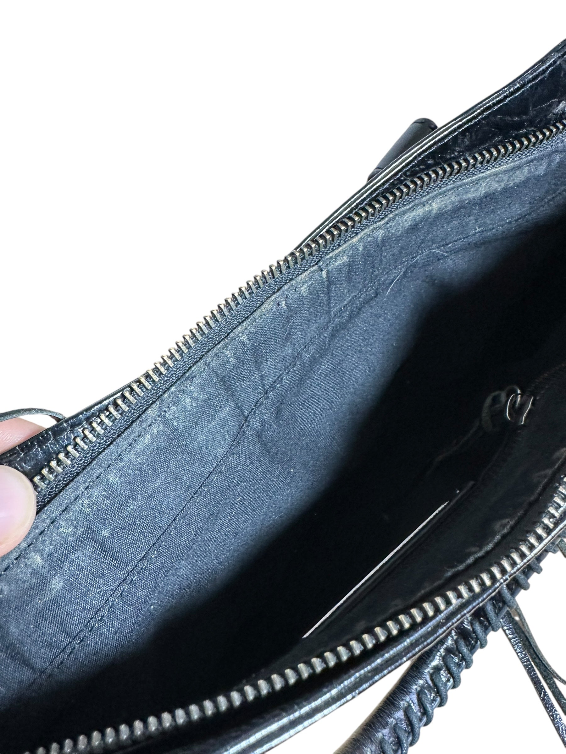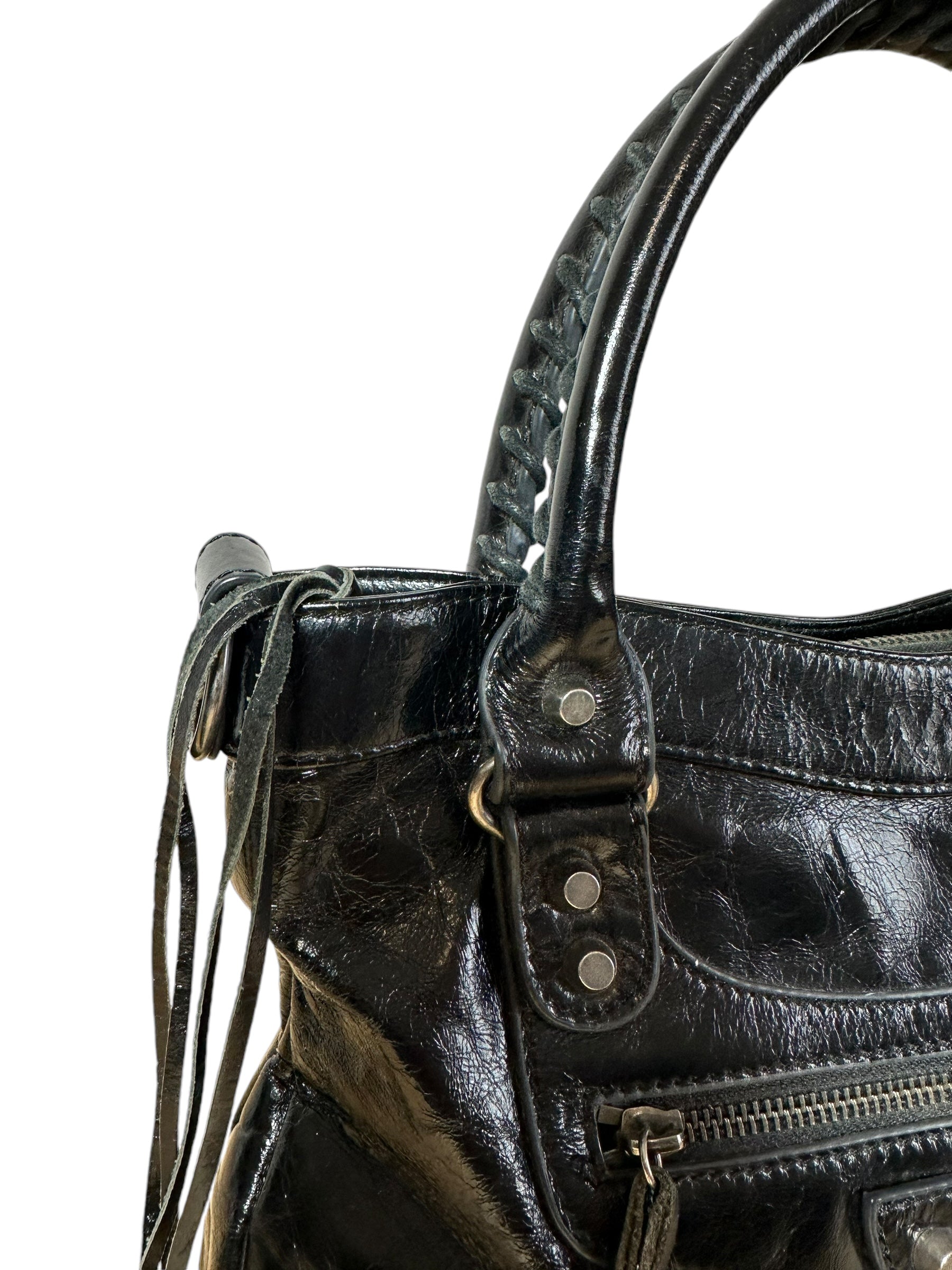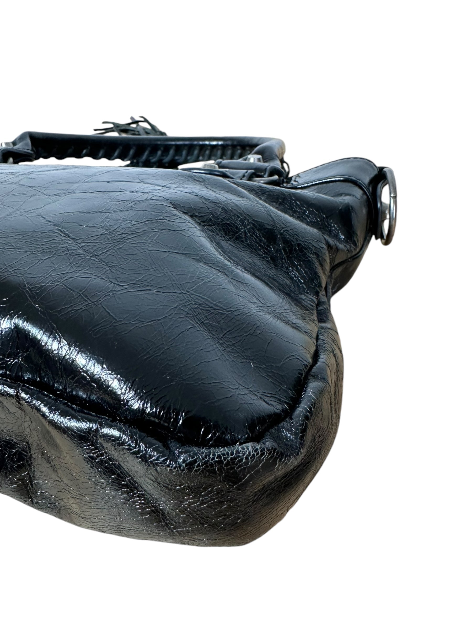 Balenciaga borsa First vintage in pelle nera leggermente lucida, manici rigidi con cuciture a vista e taschino sul davanti. Hardware in metallo argentato e cerviere con tiratori a frange in pelle. Non risponde di tracolla e specchietto, la cerniera di chiusura una volta aperta non arriva all’estremità, lievi segni di usura sul profilo interno.