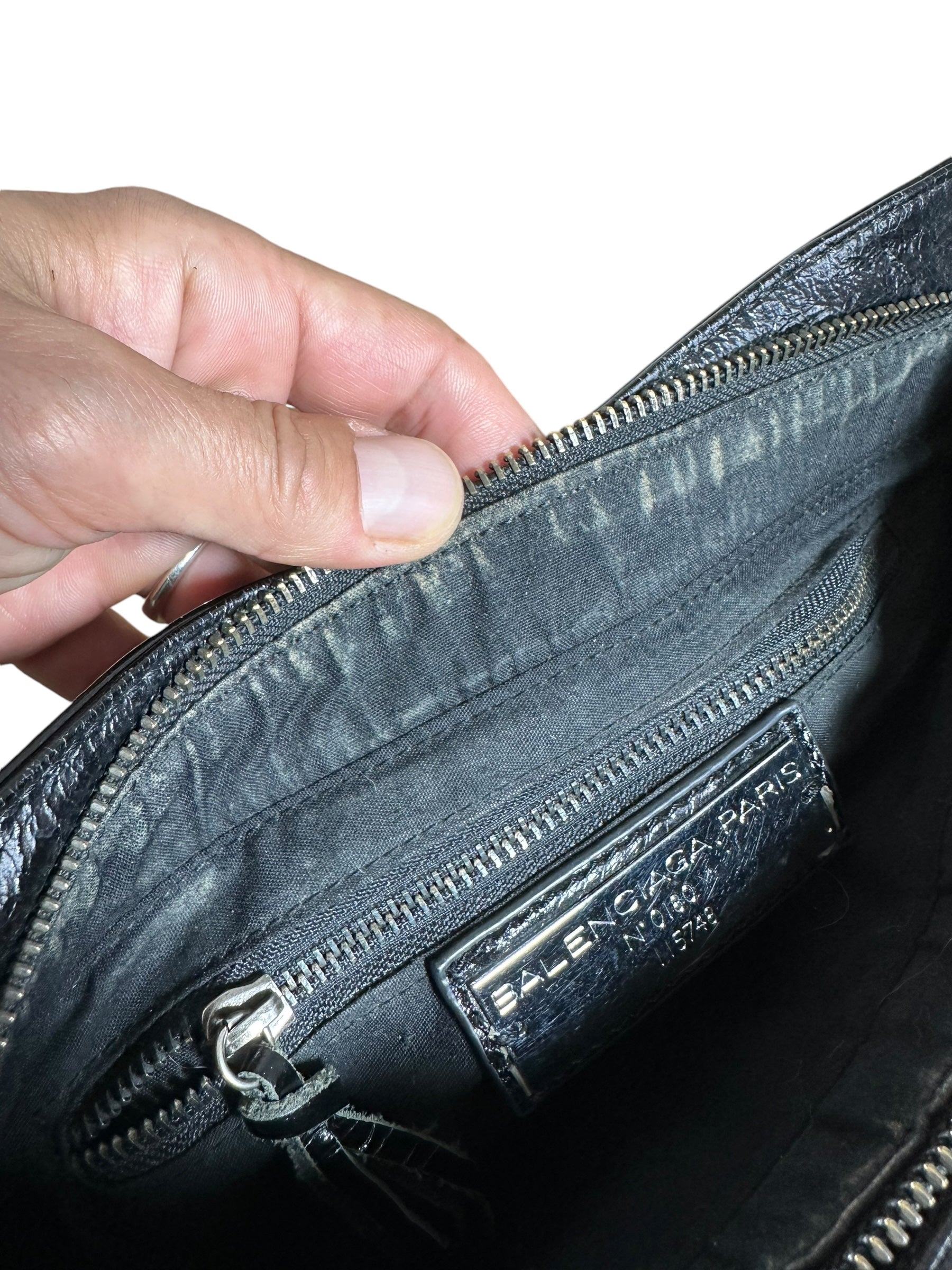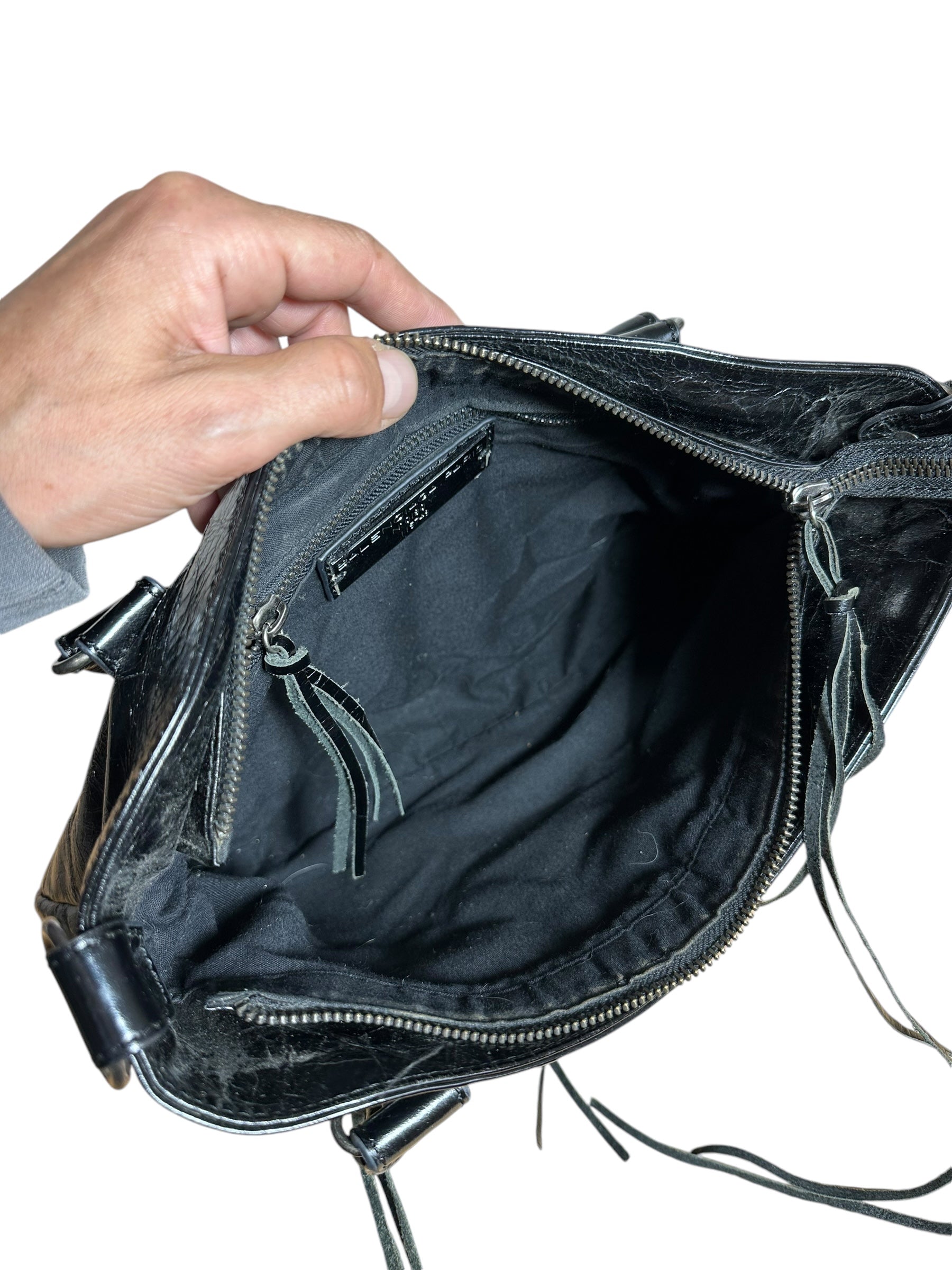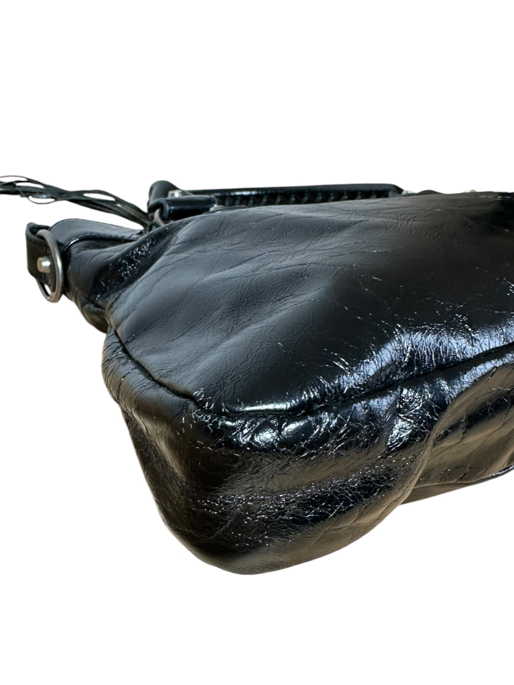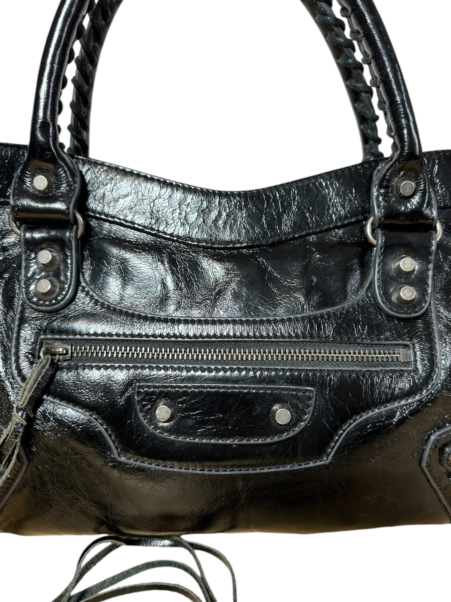 Balenciaga borsa First vintage in pelle nera leggermente lucida, manici rigidi con cuciture a vista e taschino sul davanti. Hardware in metallo argentato e cerviere con tiratori a frange in pelle. Non risponde di tracolla e specchietto, la cerniera di chiusura una volta aperta non arriva all’estremità, lievi segni di usura sul profilo interno.