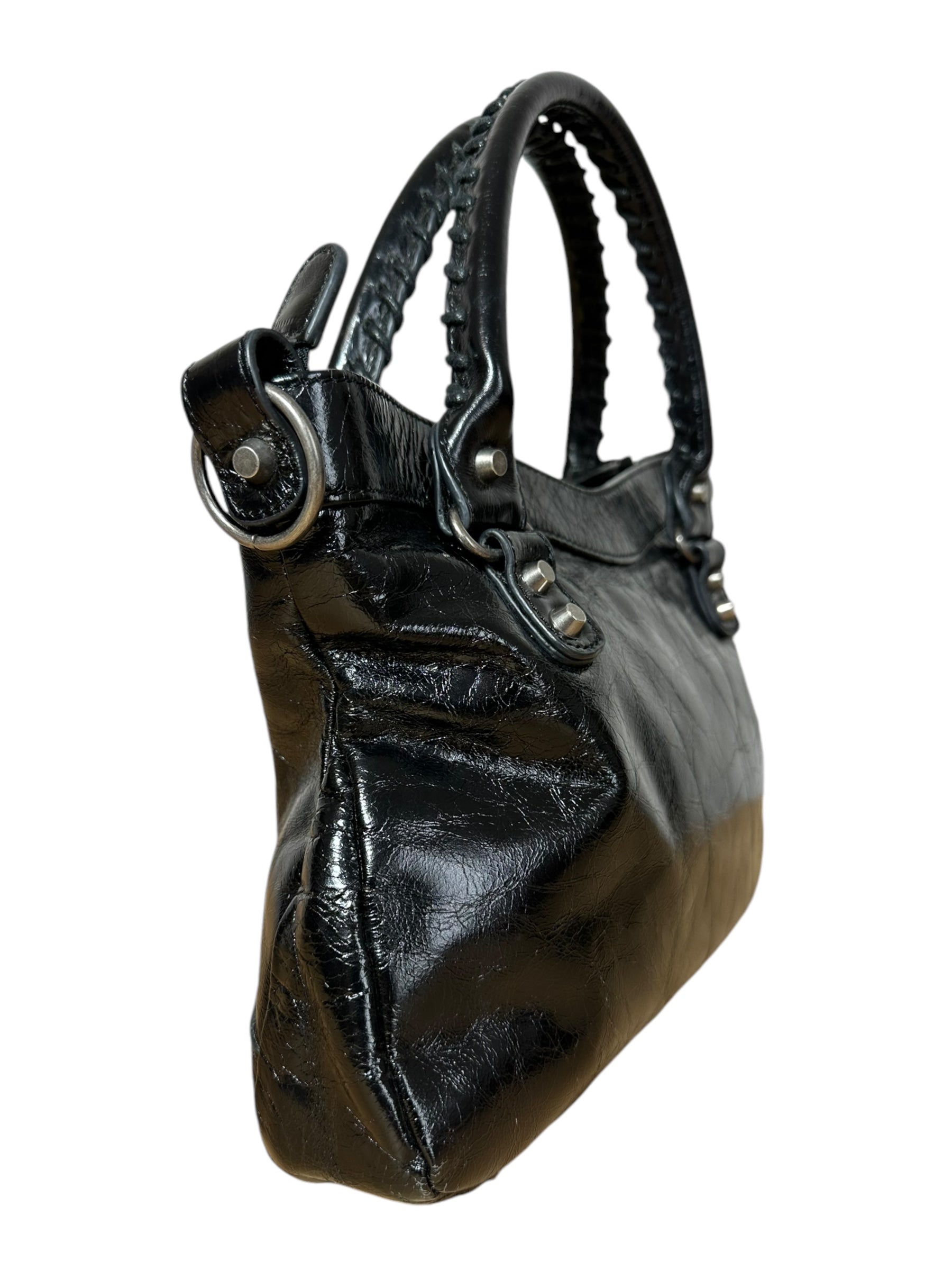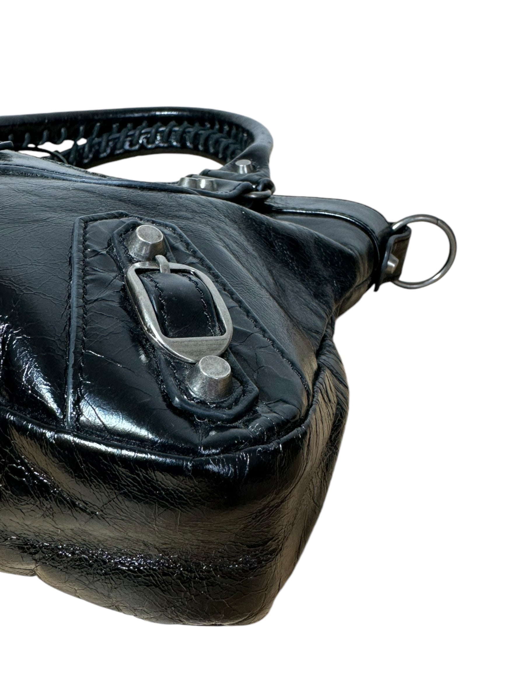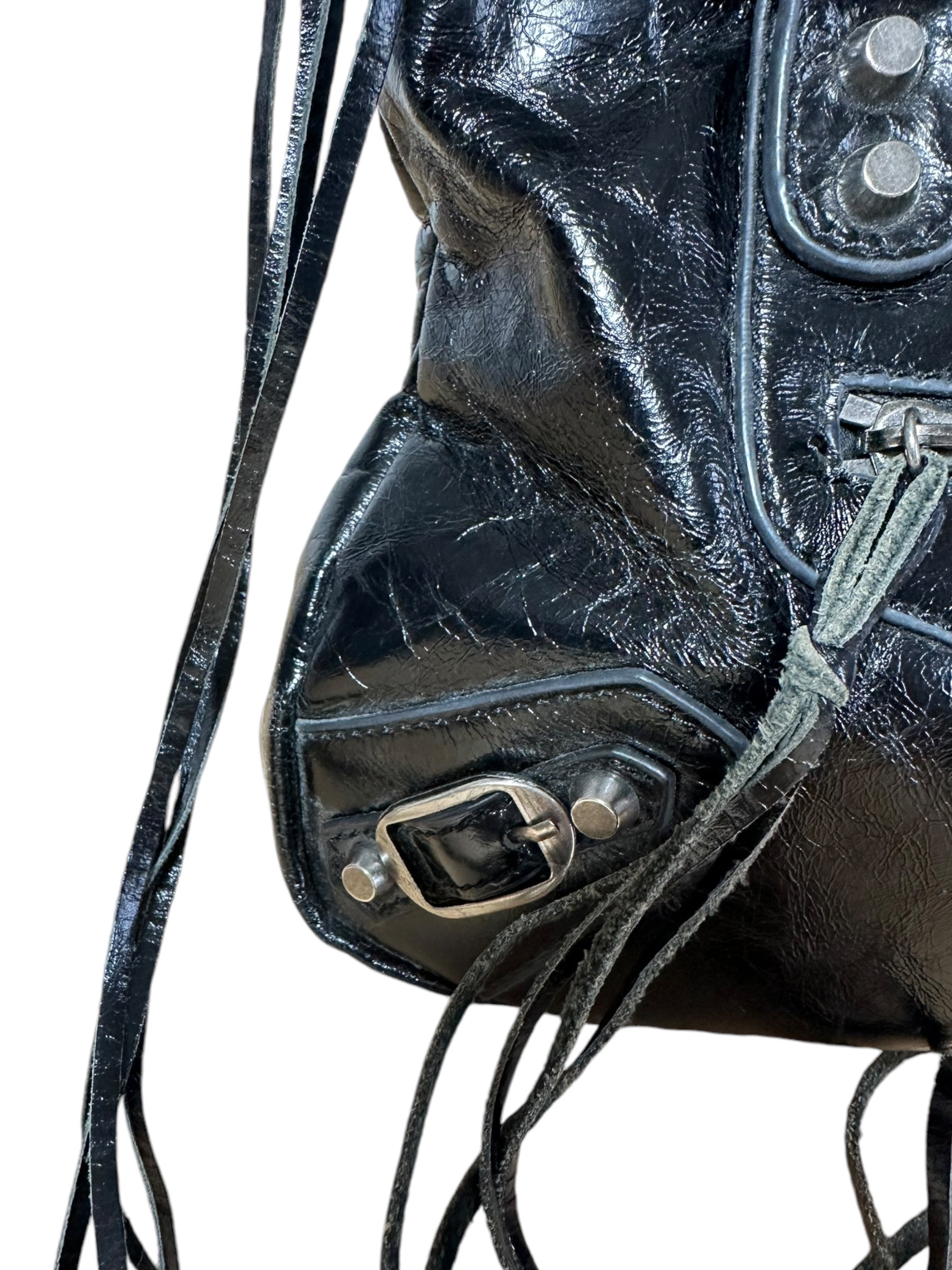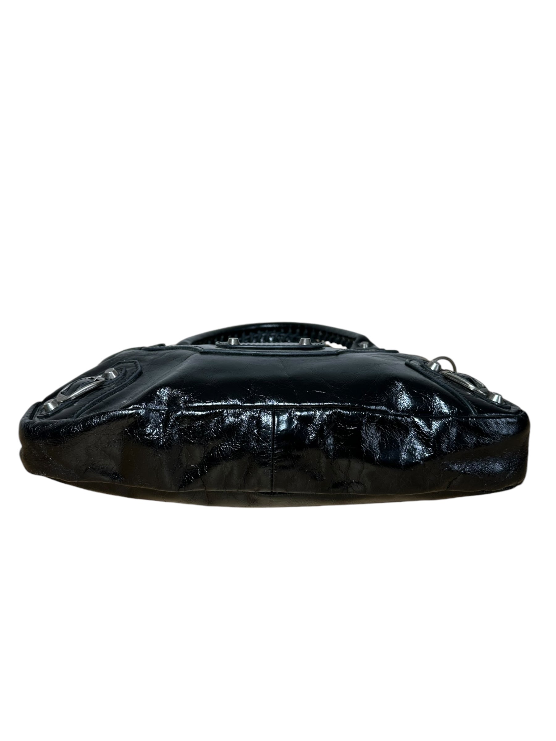 Balenciaga borsa First vintage in pelle nera leggermente lucida, manici rigidi con cuciture a vista e taschino sul davanti. Hardware in metallo argentato e cerviere con tiratori a frange in pelle. Non risponde di tracolla e specchietto, la cerniera di chiusura una volta aperta non arriva all’estremità, lievi segni di usura sul profilo interno.