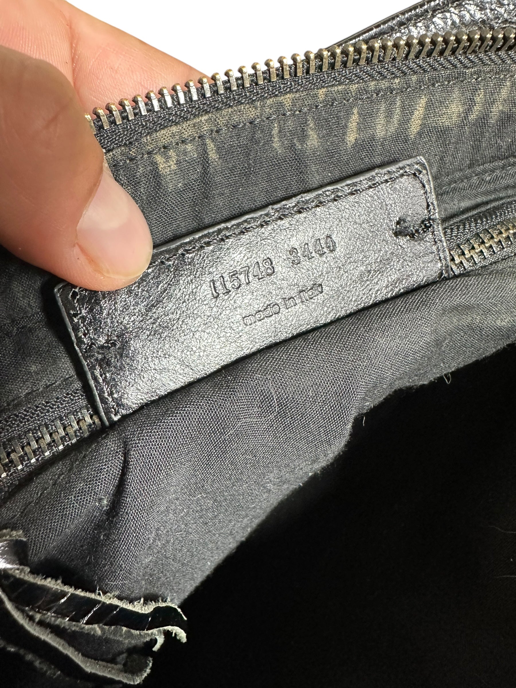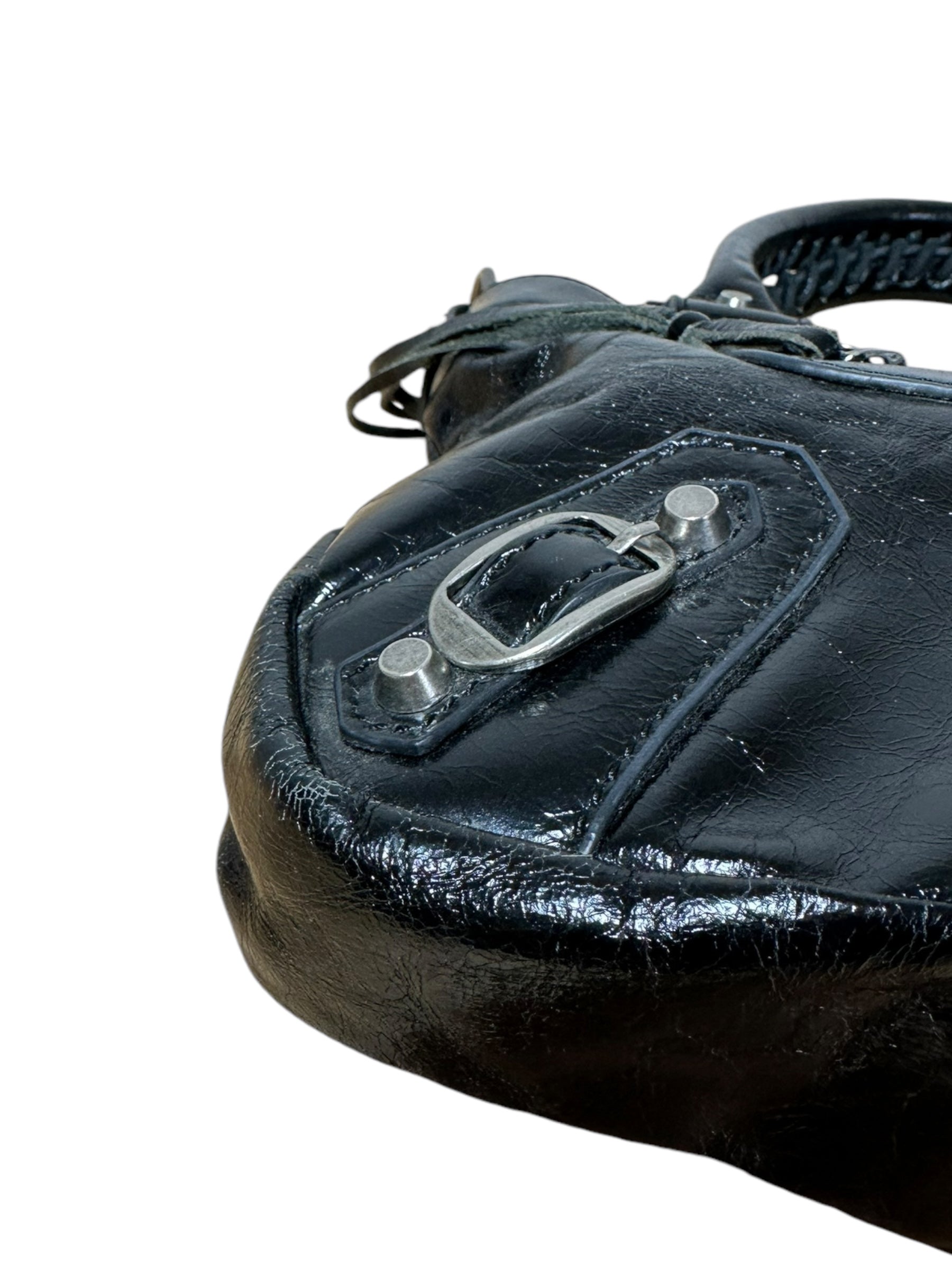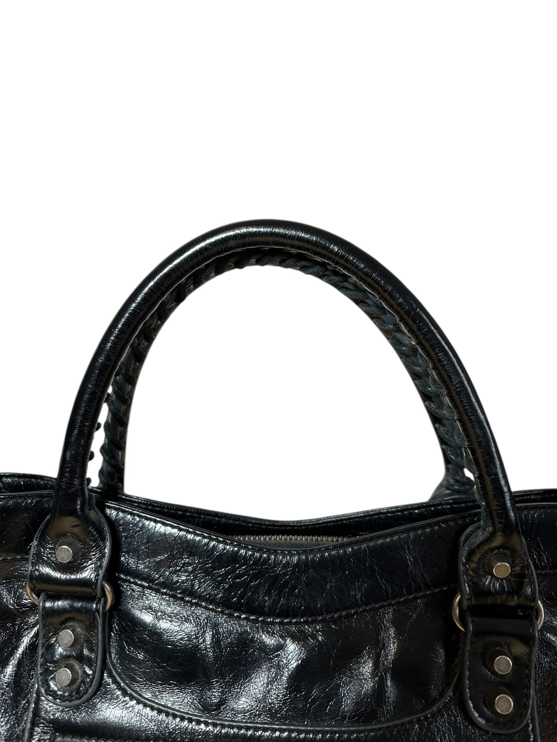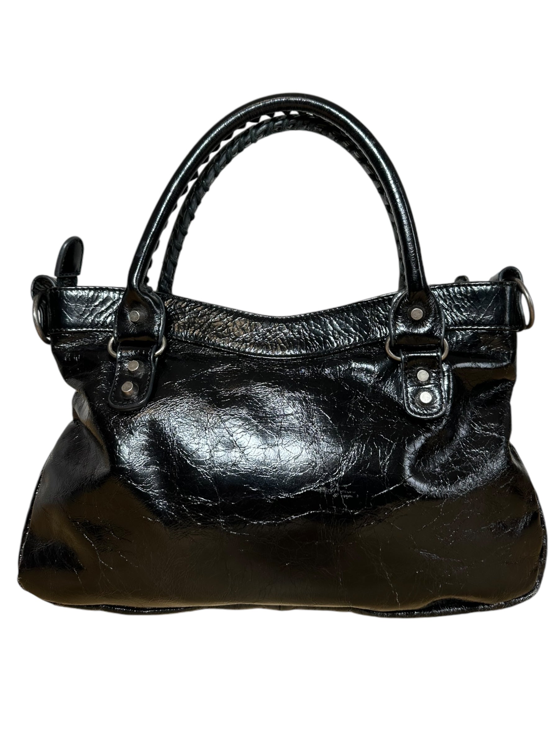 Balenciaga borsa First vintage in pelle nera leggermente lucida, manici rigidi con cuciture a vista e taschino sul davanti. Hardware in metallo argentato e cerviere con tiratori a frange in pelle. Non risponde di tracolla e specchietto, la cerniera di chiusura una volta aperta non arriva all’estremità, lievi segni di usura sul profilo interno.