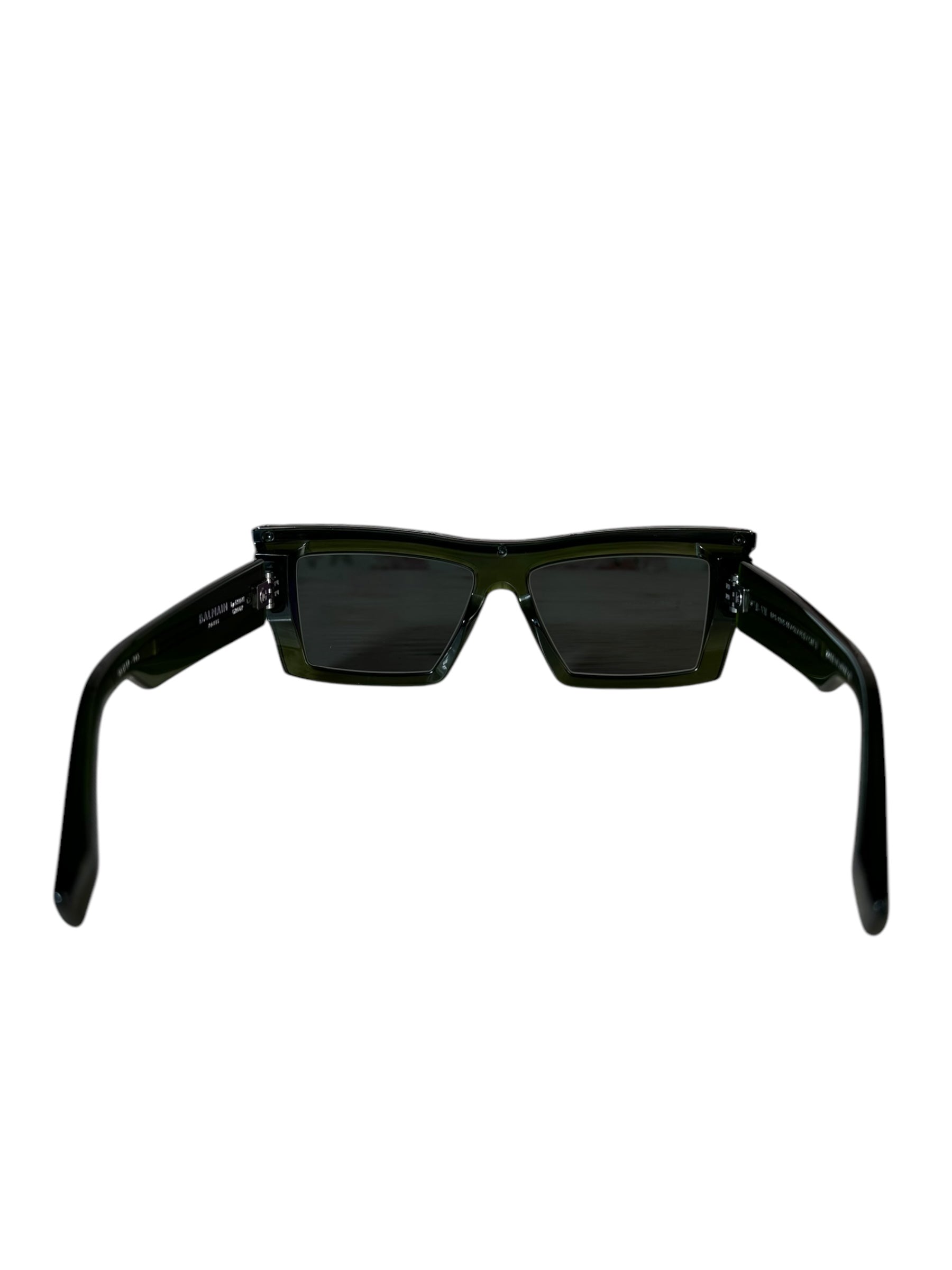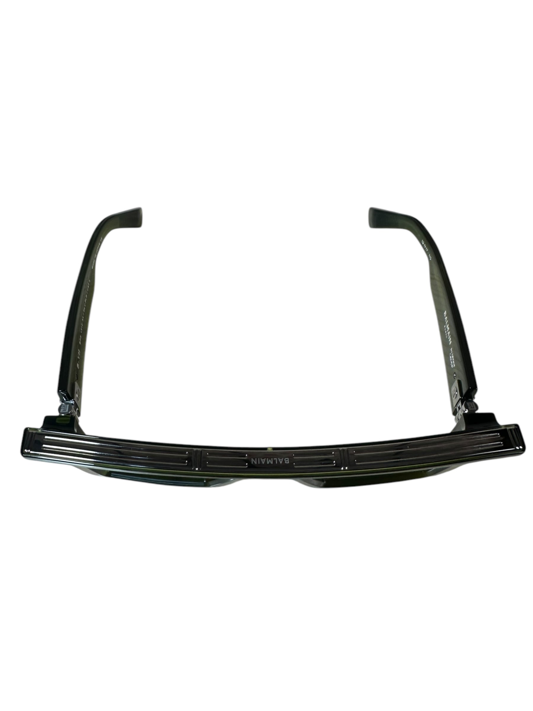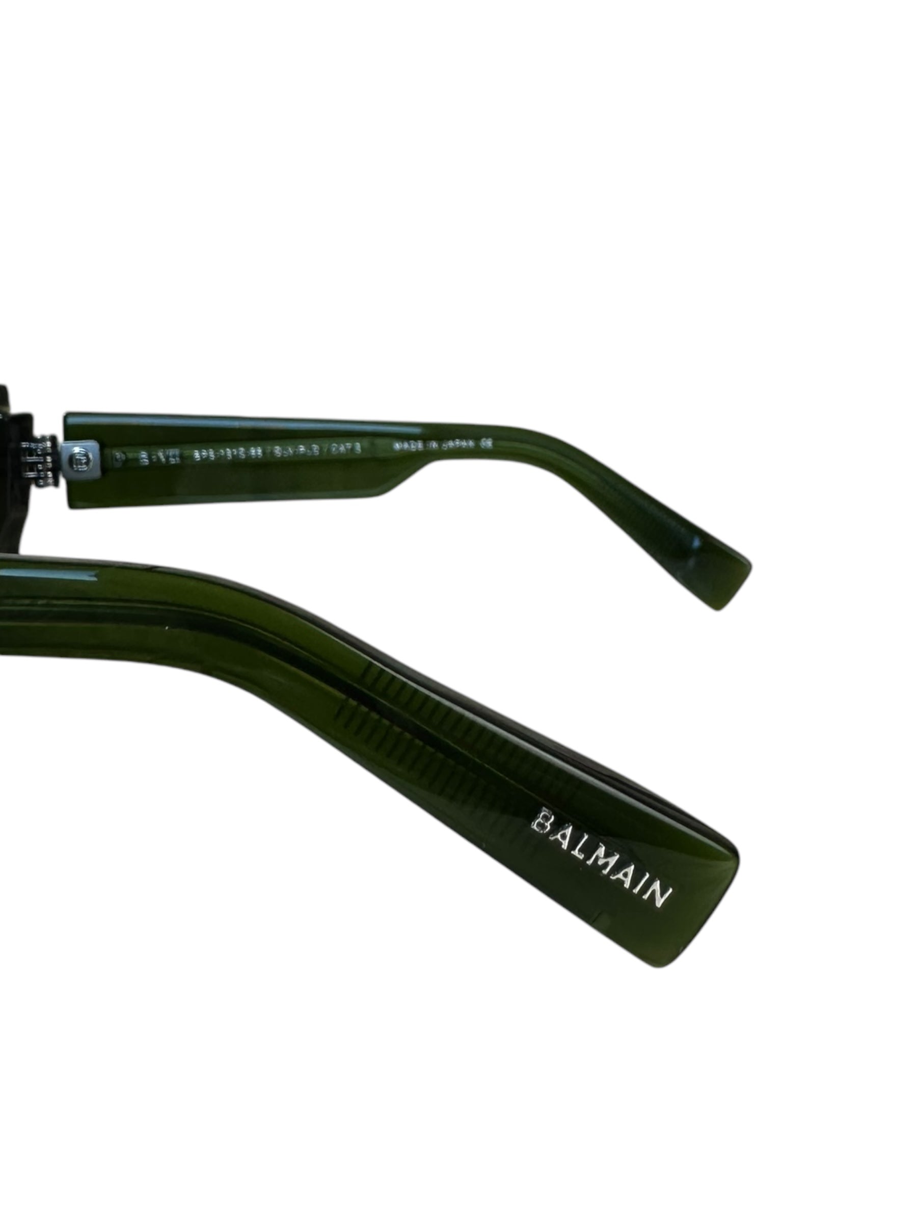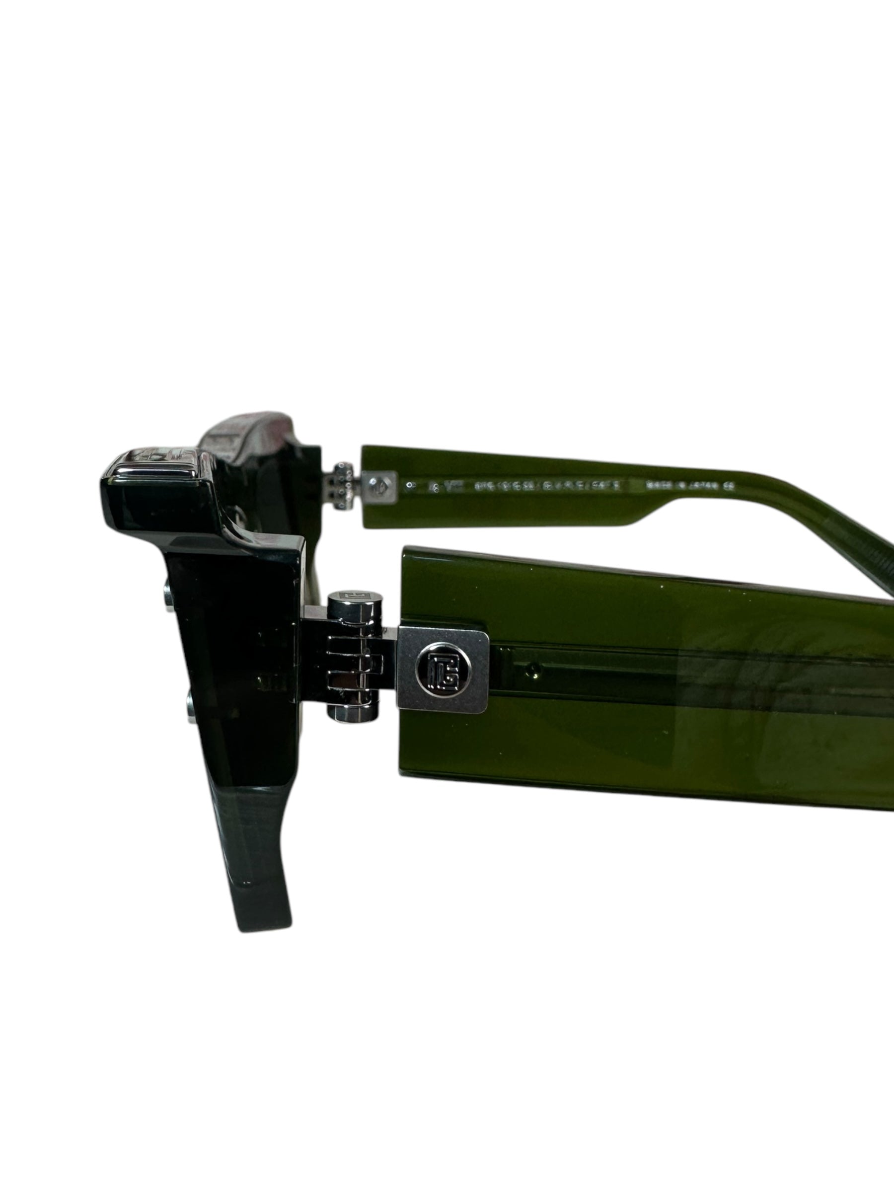 Balmain occhiali da sole unisex titanio e acetato verde bottiglia con lente nera leggermente sfumata, inserto con logo marchiato nella parte superiore. Vengono spediti con scatola. Non presentano segni di usura.