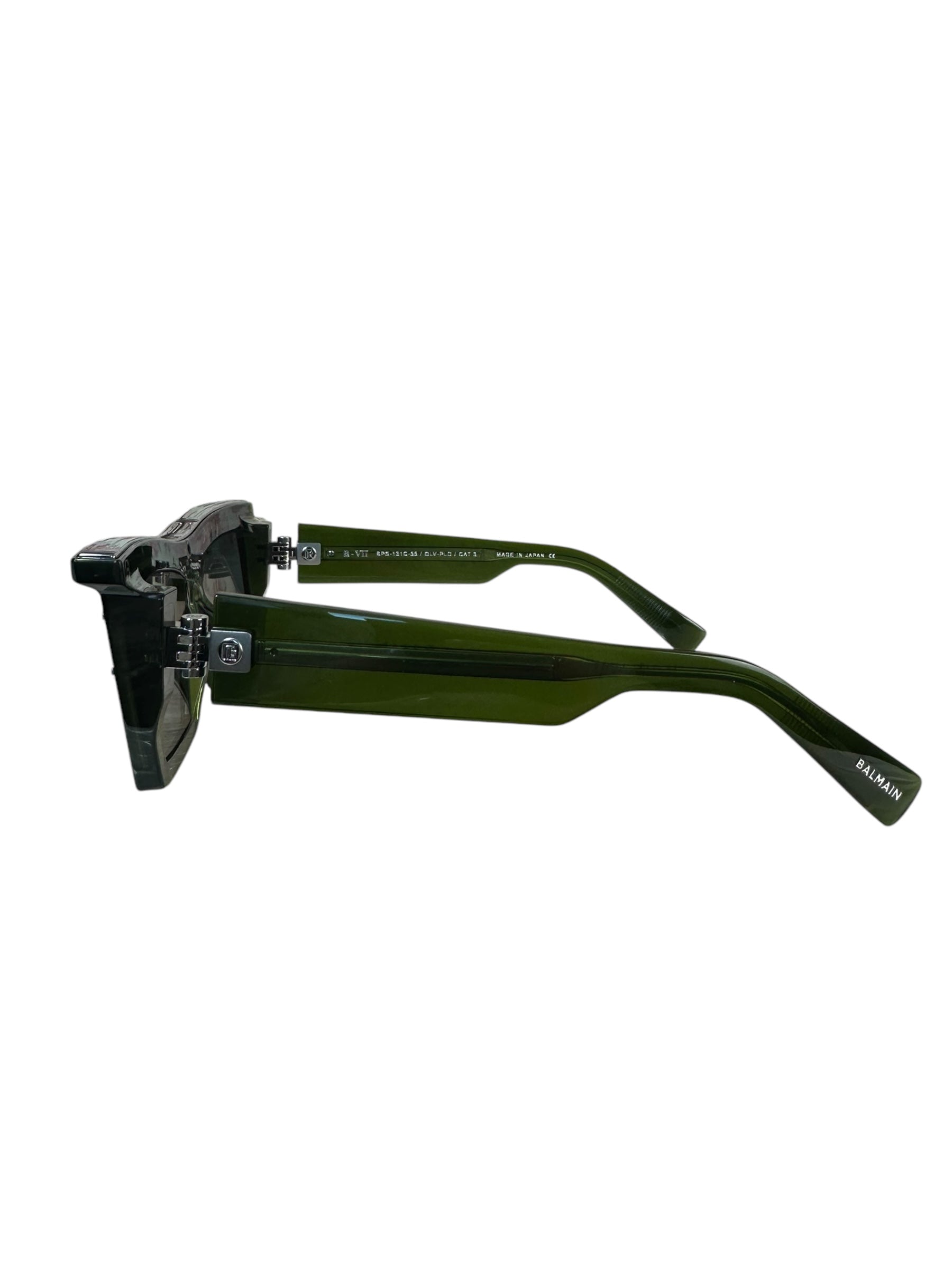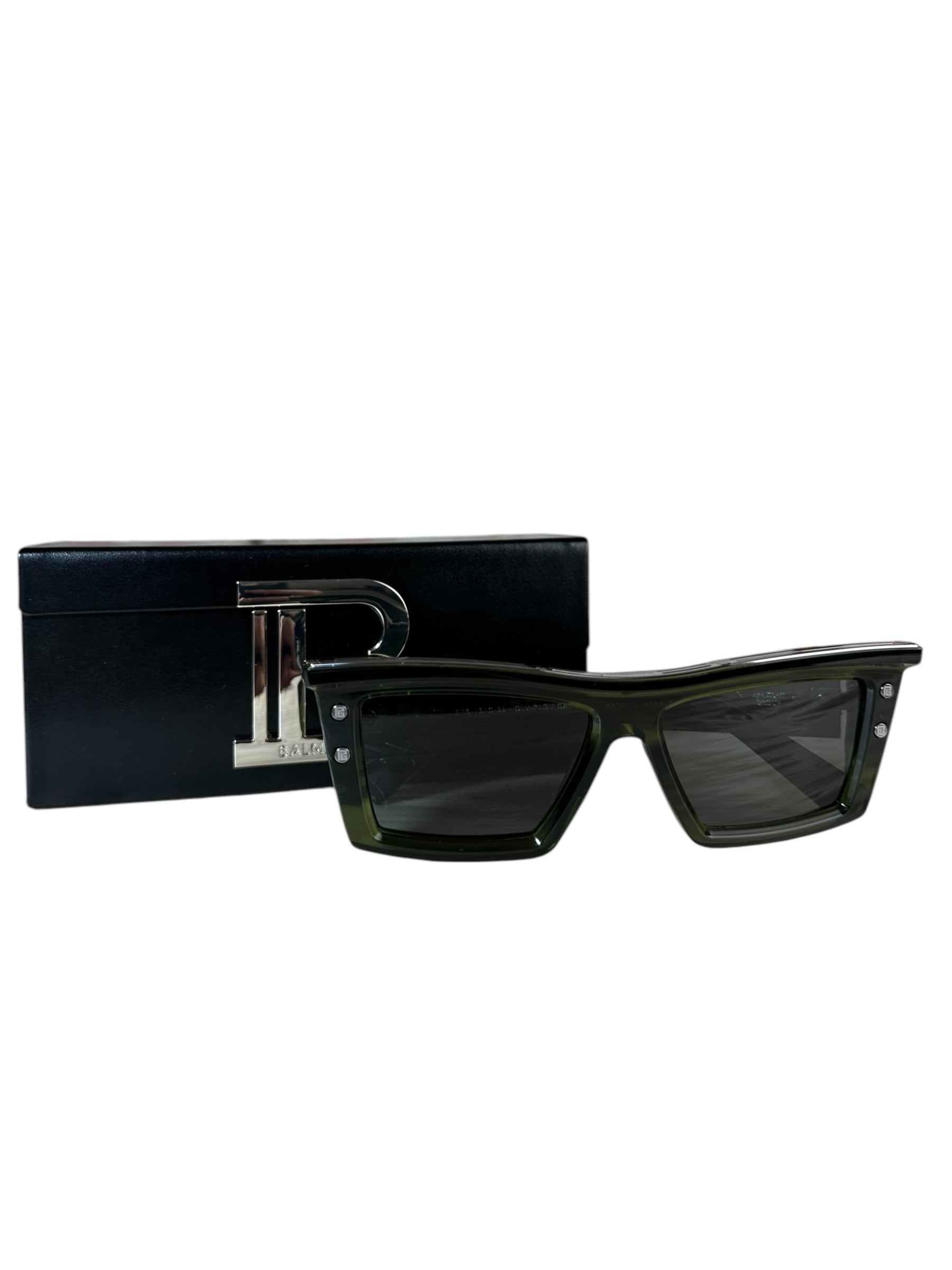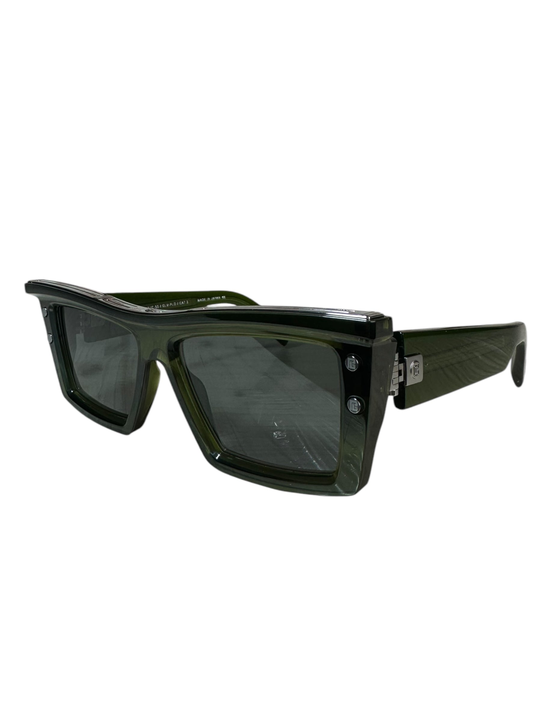 Balmain occhiali da sole unisex titanio e acetato verde bottiglia con lente nera leggermente sfumata, inserto con logo marchiato nella parte superiore. Vengono spediti con scatola. Non presentano segni di usura.
