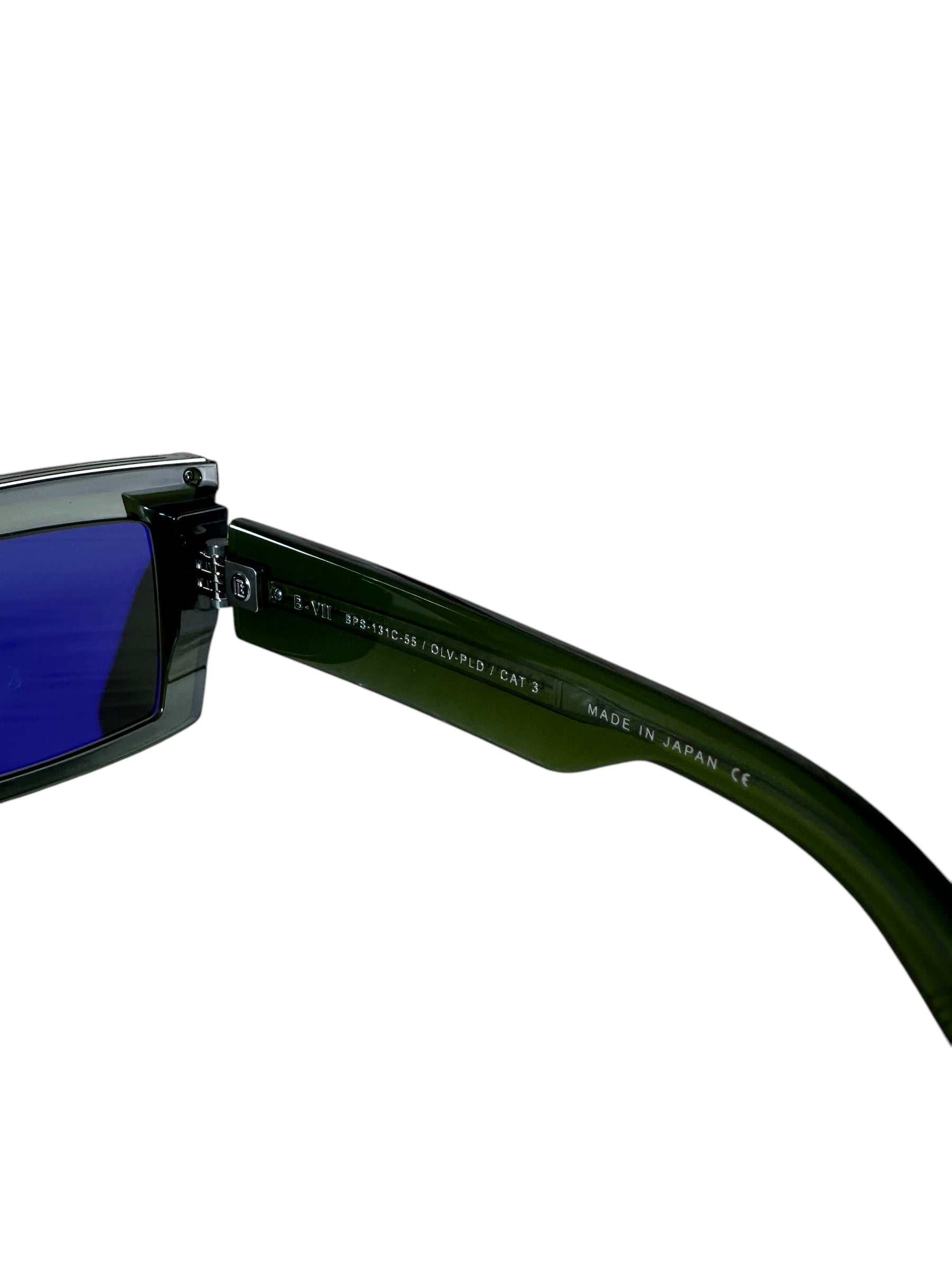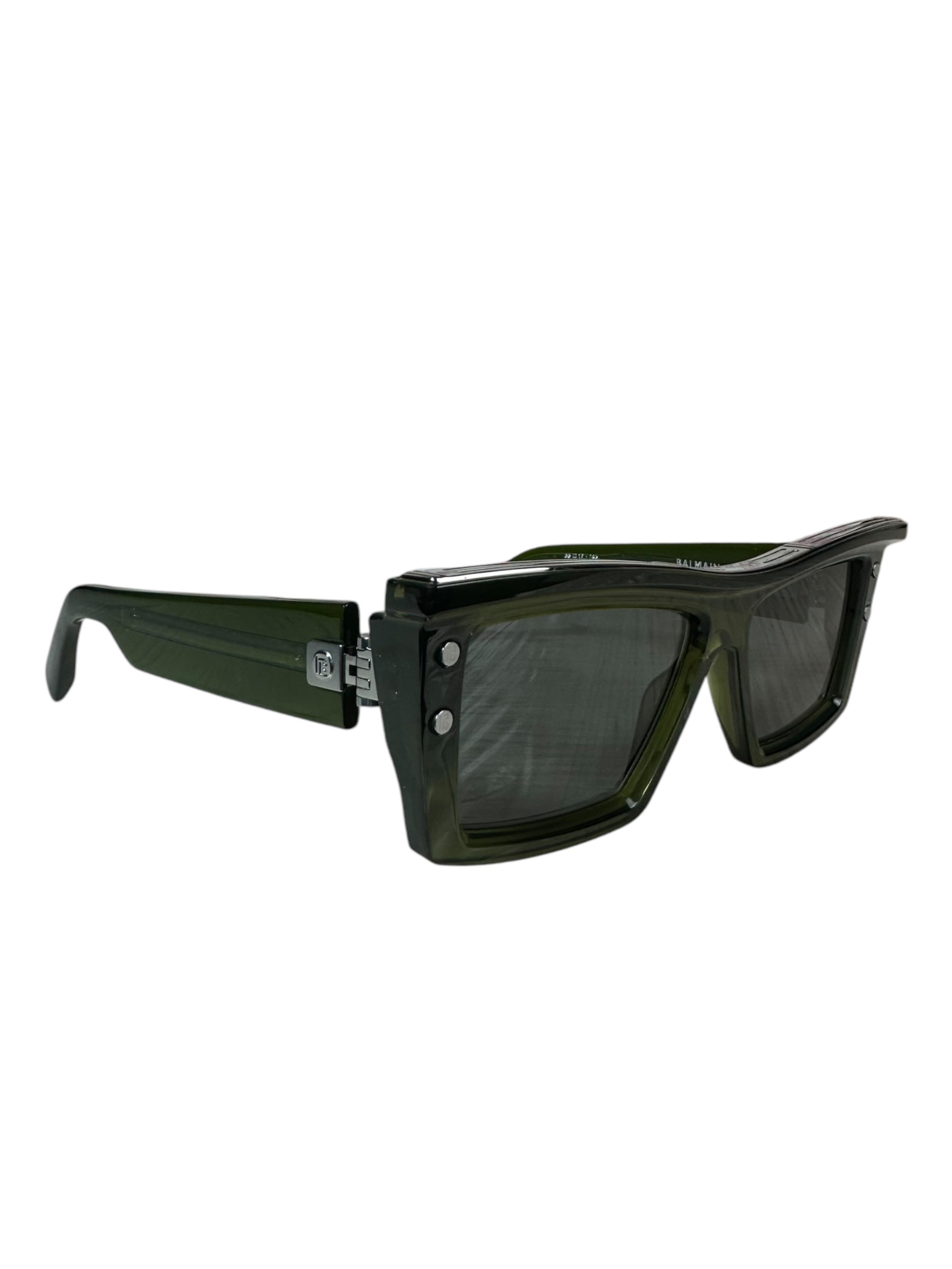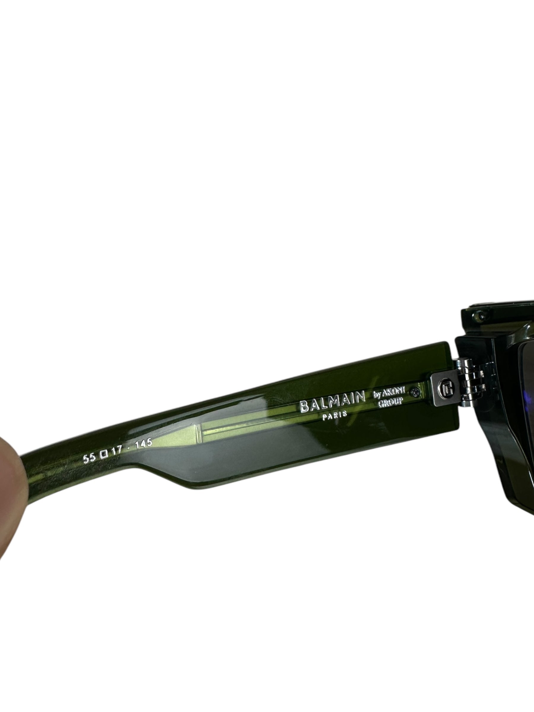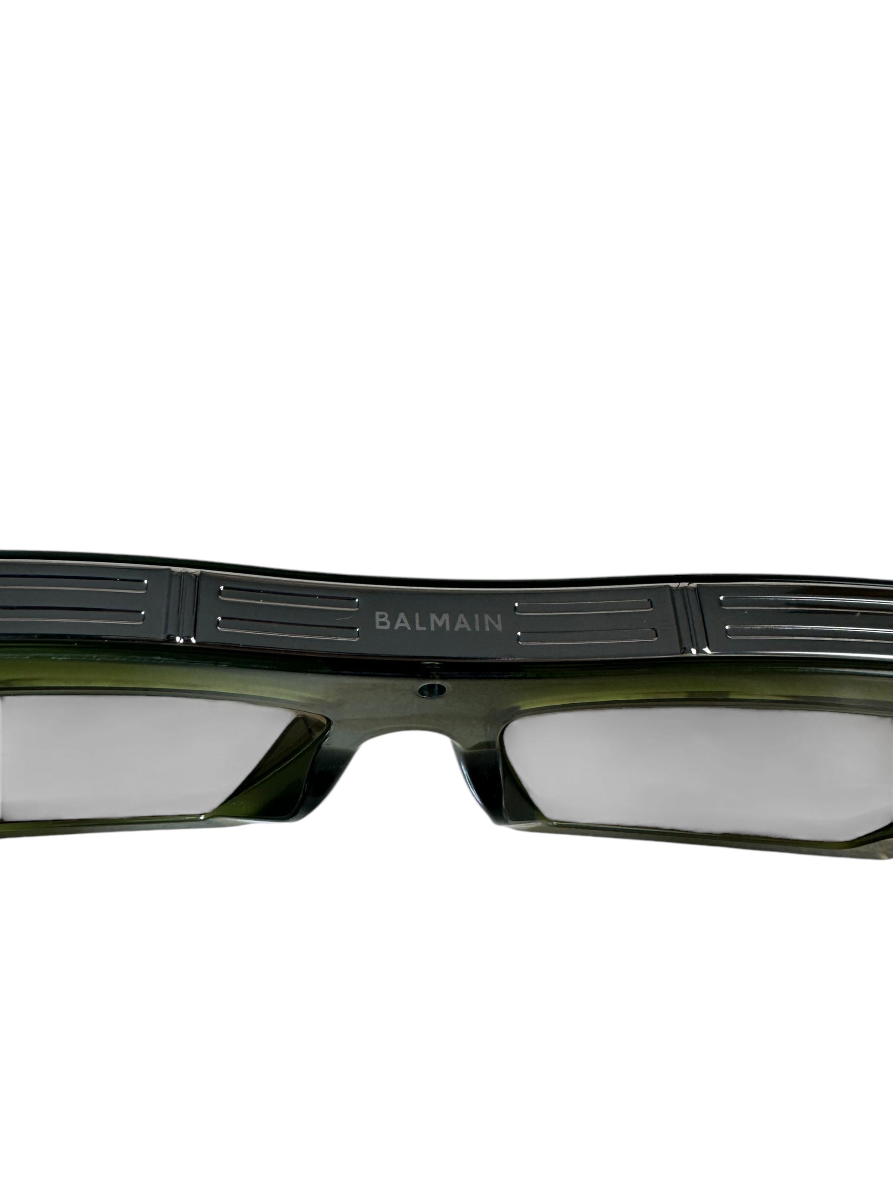 Balmain occhiali da sole unisex titanio e acetato verde bottiglia con lente nera leggermente sfumata, inserto con logo marchiato nella parte superiore. Vengono spediti con scatola. Non presentano segni di usura.