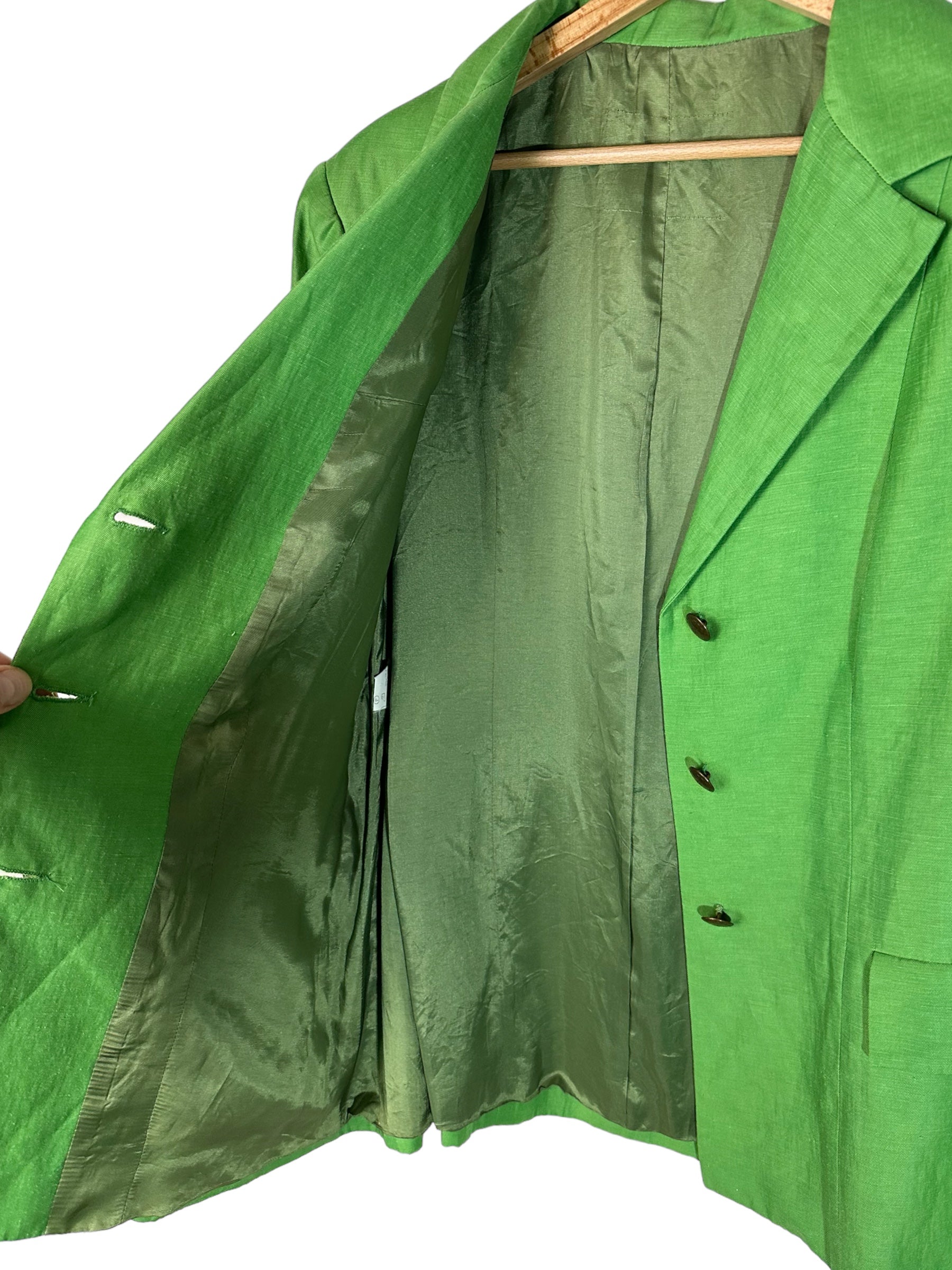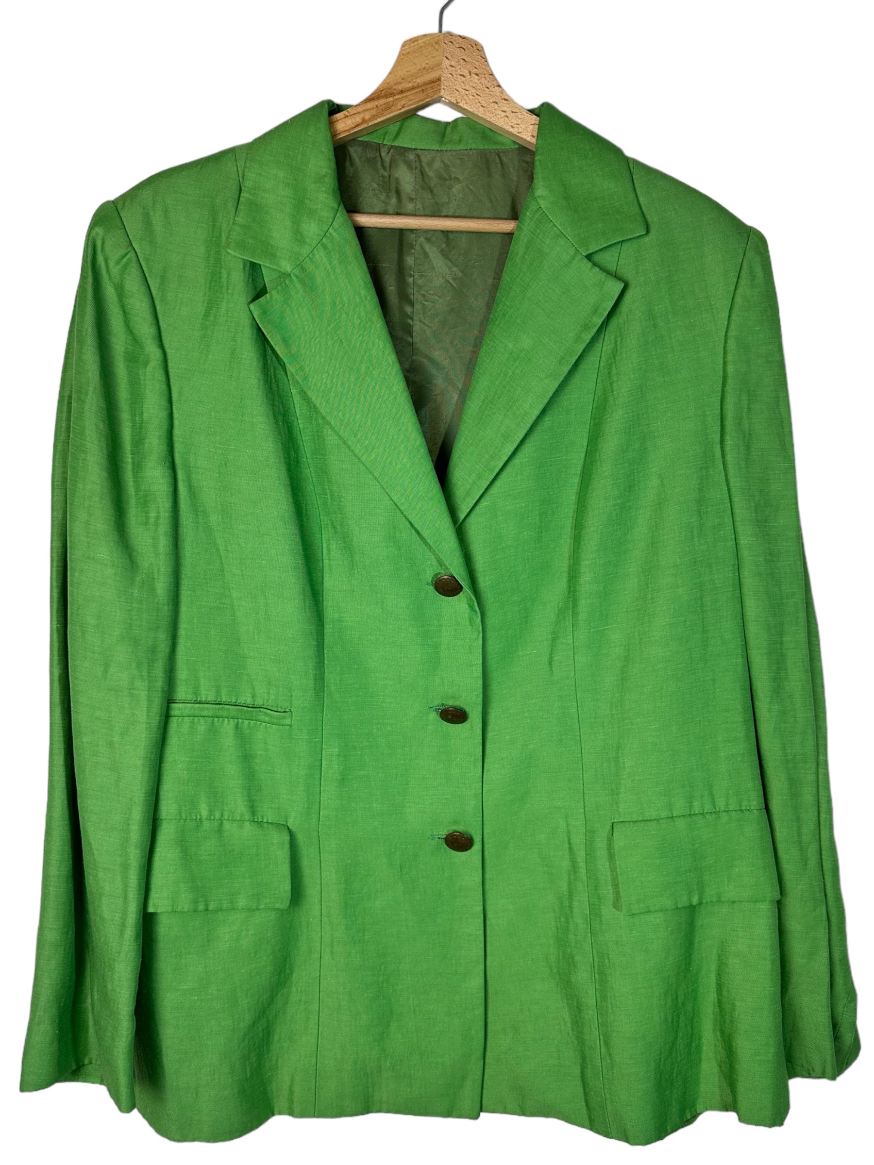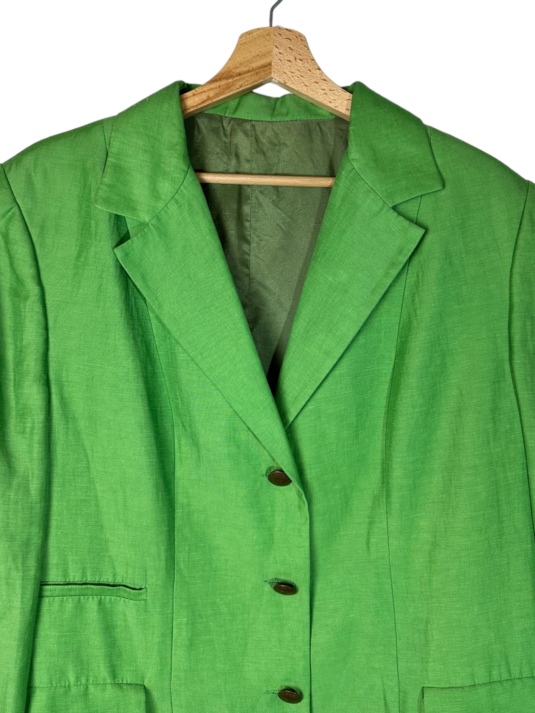 Blazer vintage in lino e poliammide verde a maniche lunghe con tasche laterali e interno foderato. Chiusura con bottoni in metallo lavorato. Vestibilità oversize. Non riporta etichetta con taglia ma veste una taglia M.