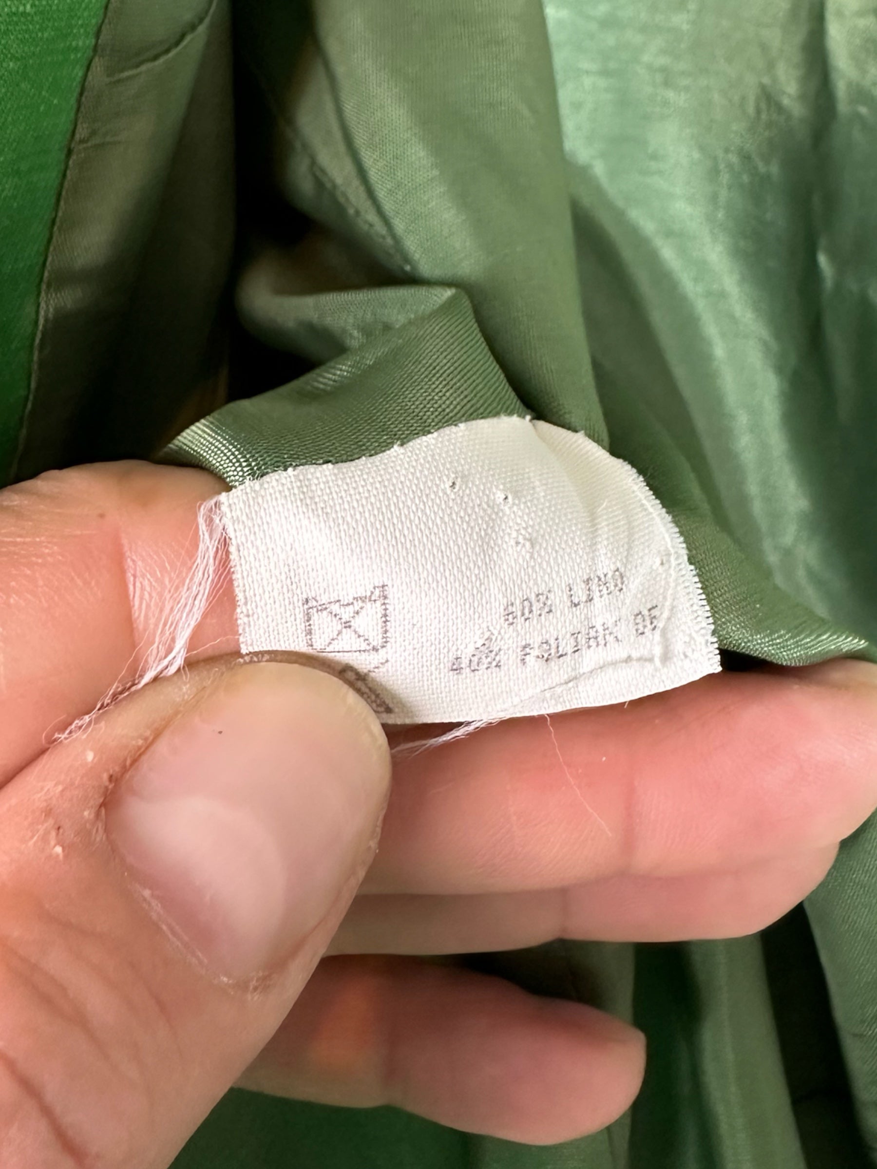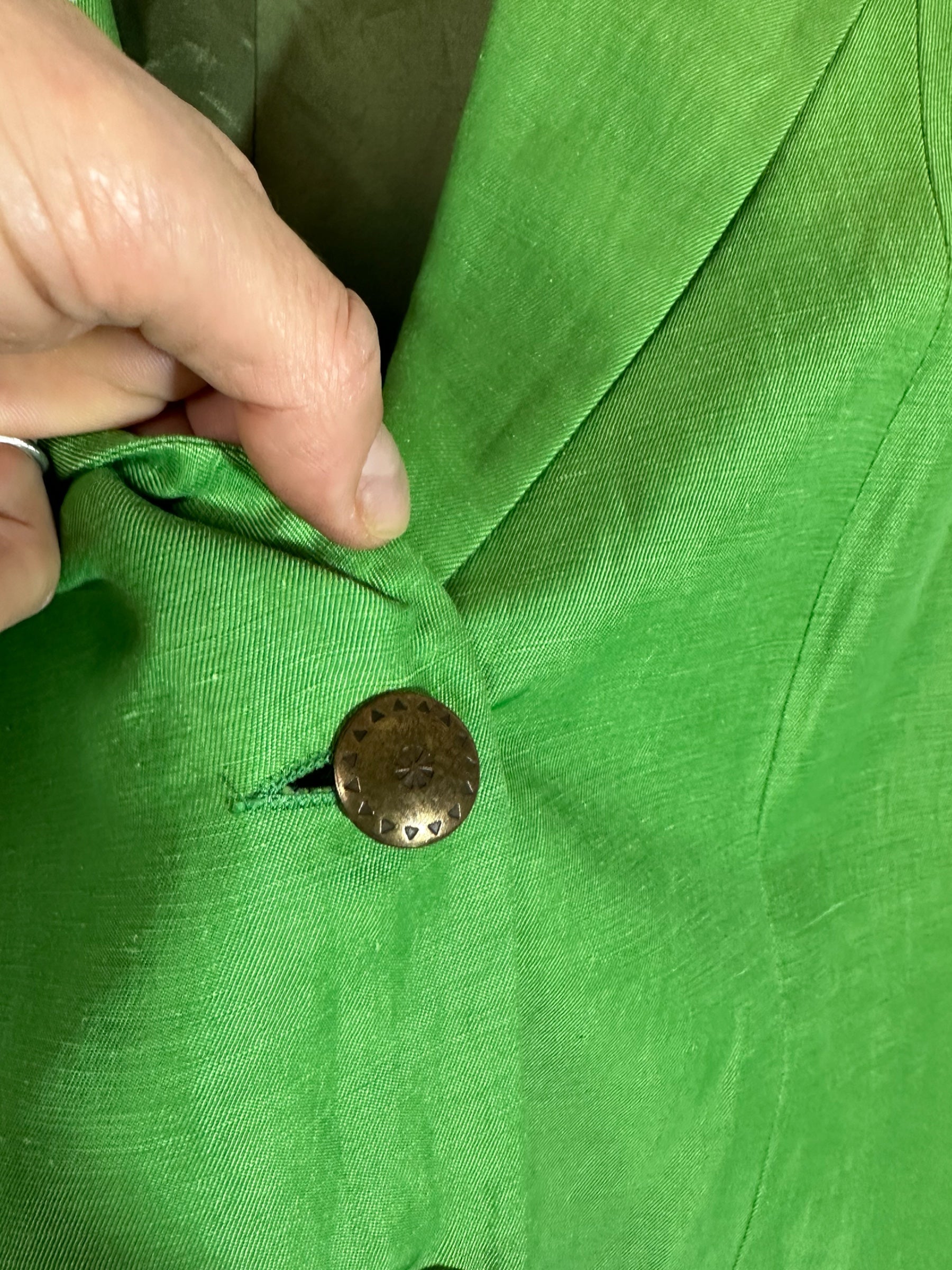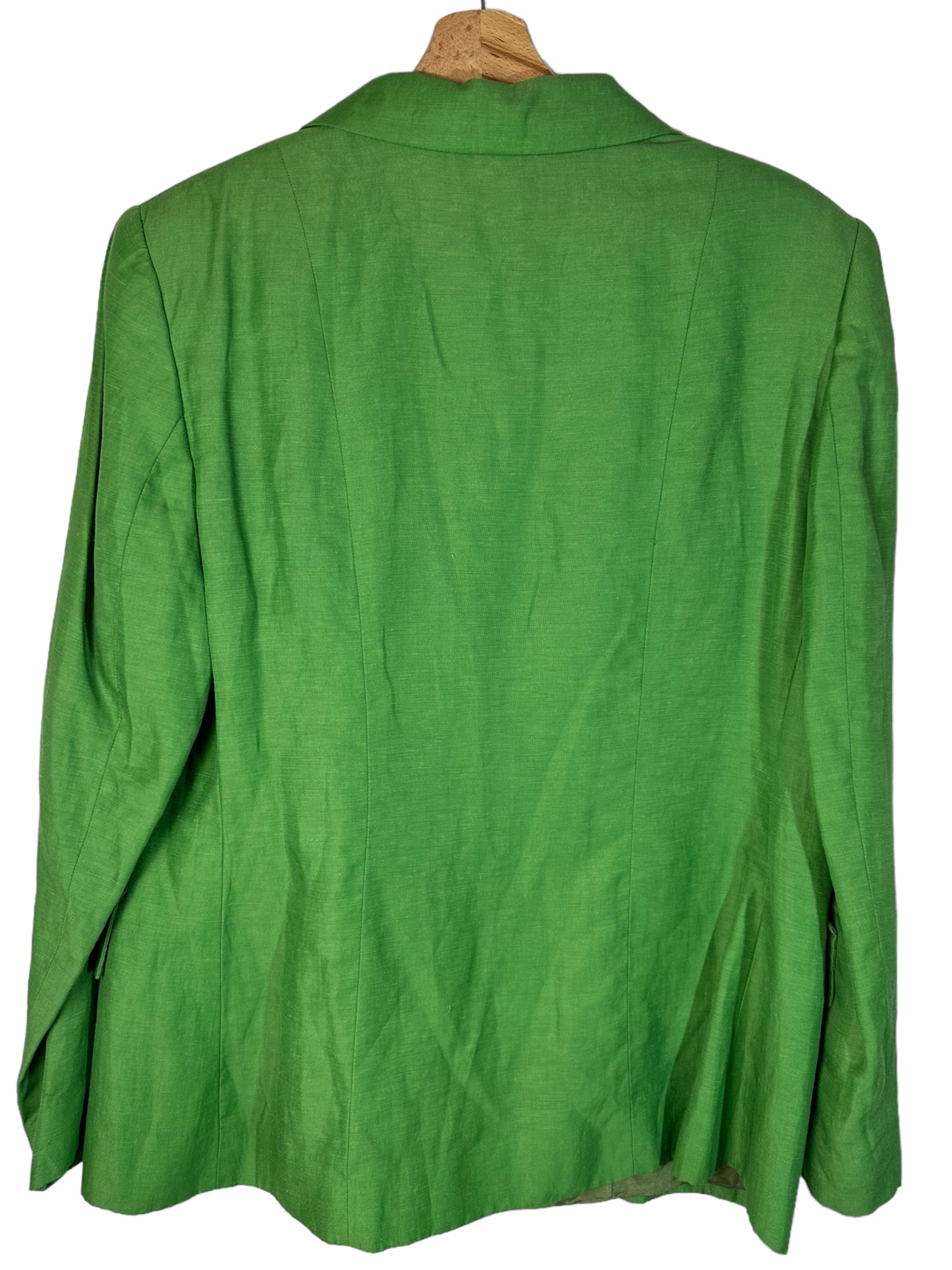 Blazer vintage in lino e poliammide verde a maniche lunghe con tasche laterali e interno foderato. Chiusura con bottoni in metallo lavorato. Vestibilità oversize. Non riporta etichetta con taglia ma veste una taglia M.