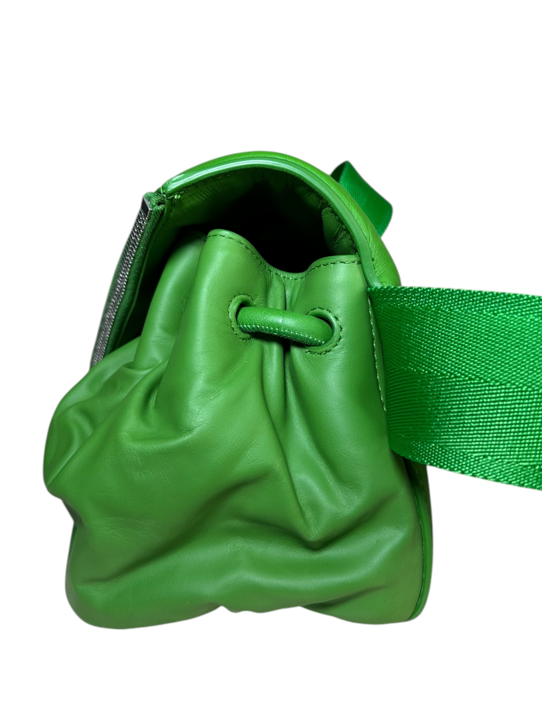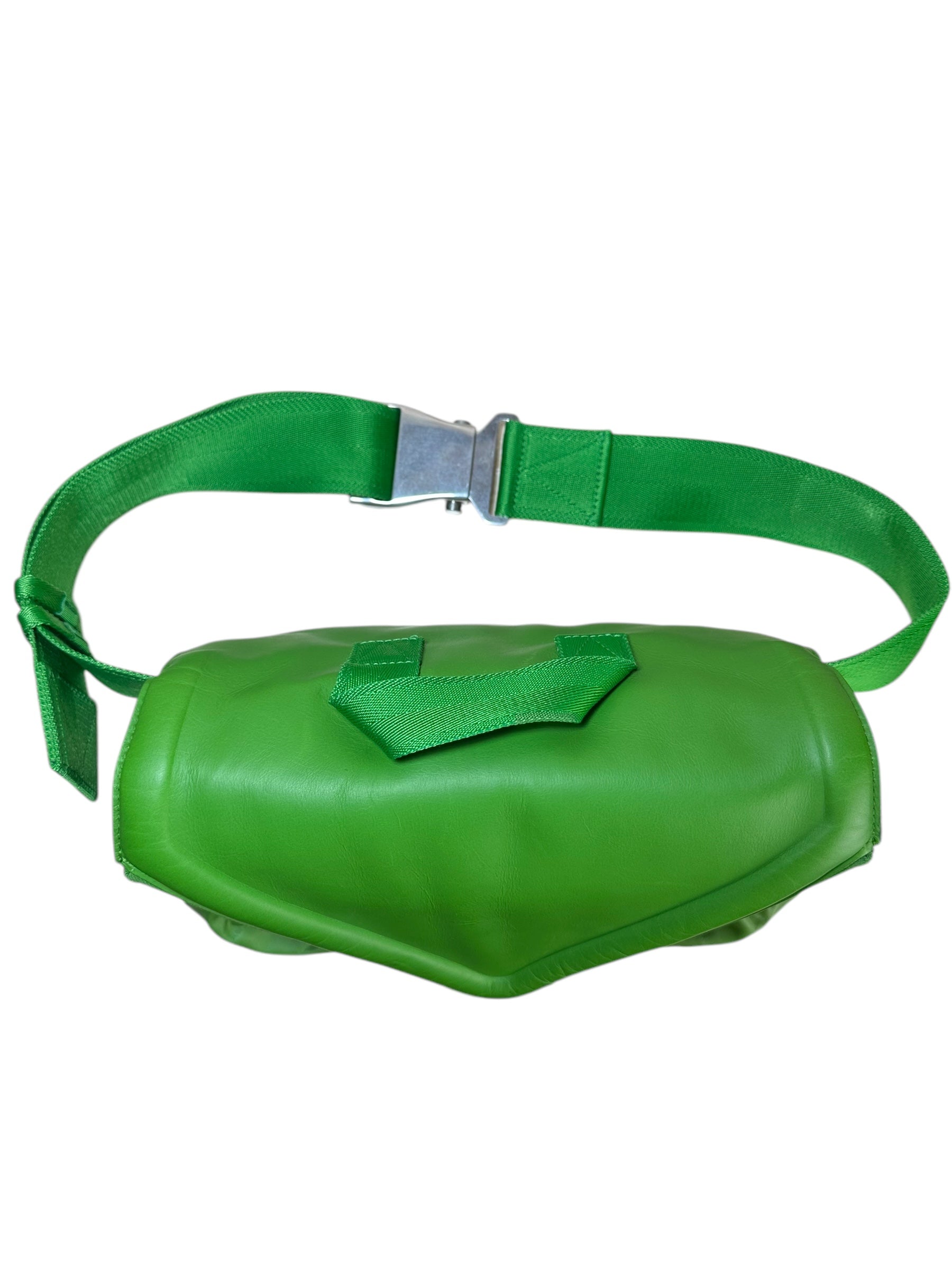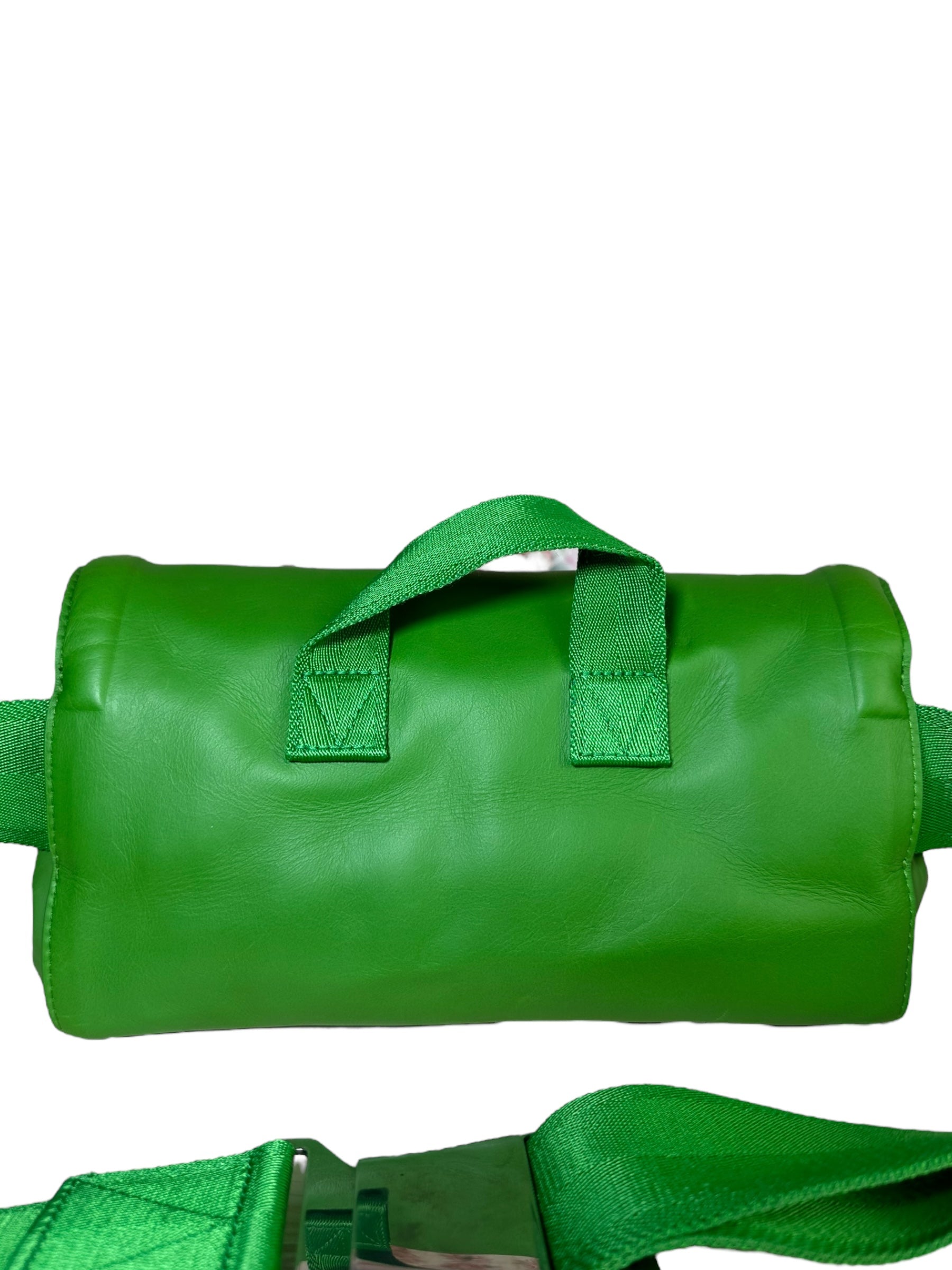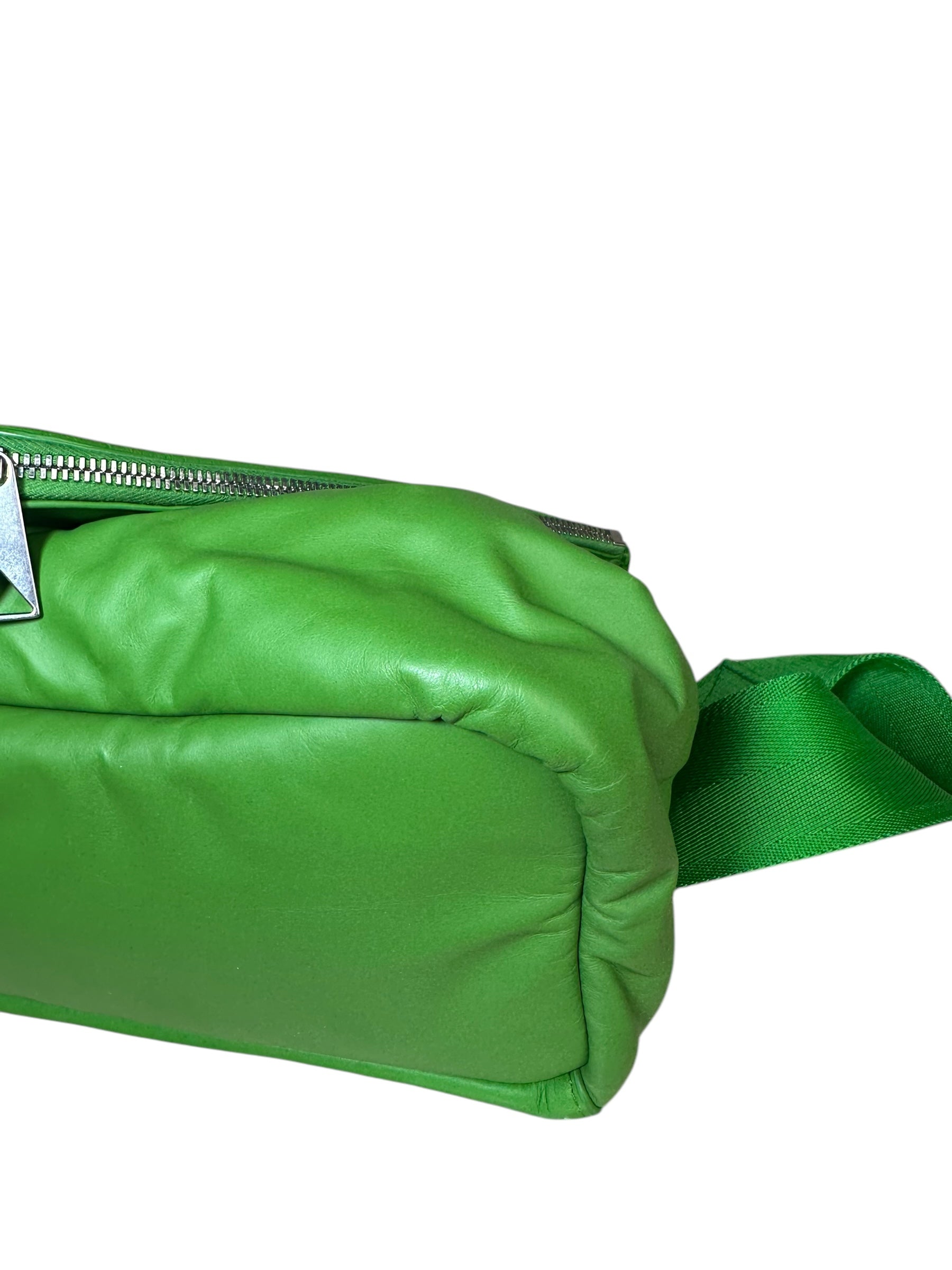 Bottega Veneta marsupio unisex in pelle verde con cinghie in nylon, fibbia in metallo argentato. Patta con doppia zip e chiusura con bottone magnetico. Lieve segno di usura poco visibile su un angolo. Viene spedita con dust bag.