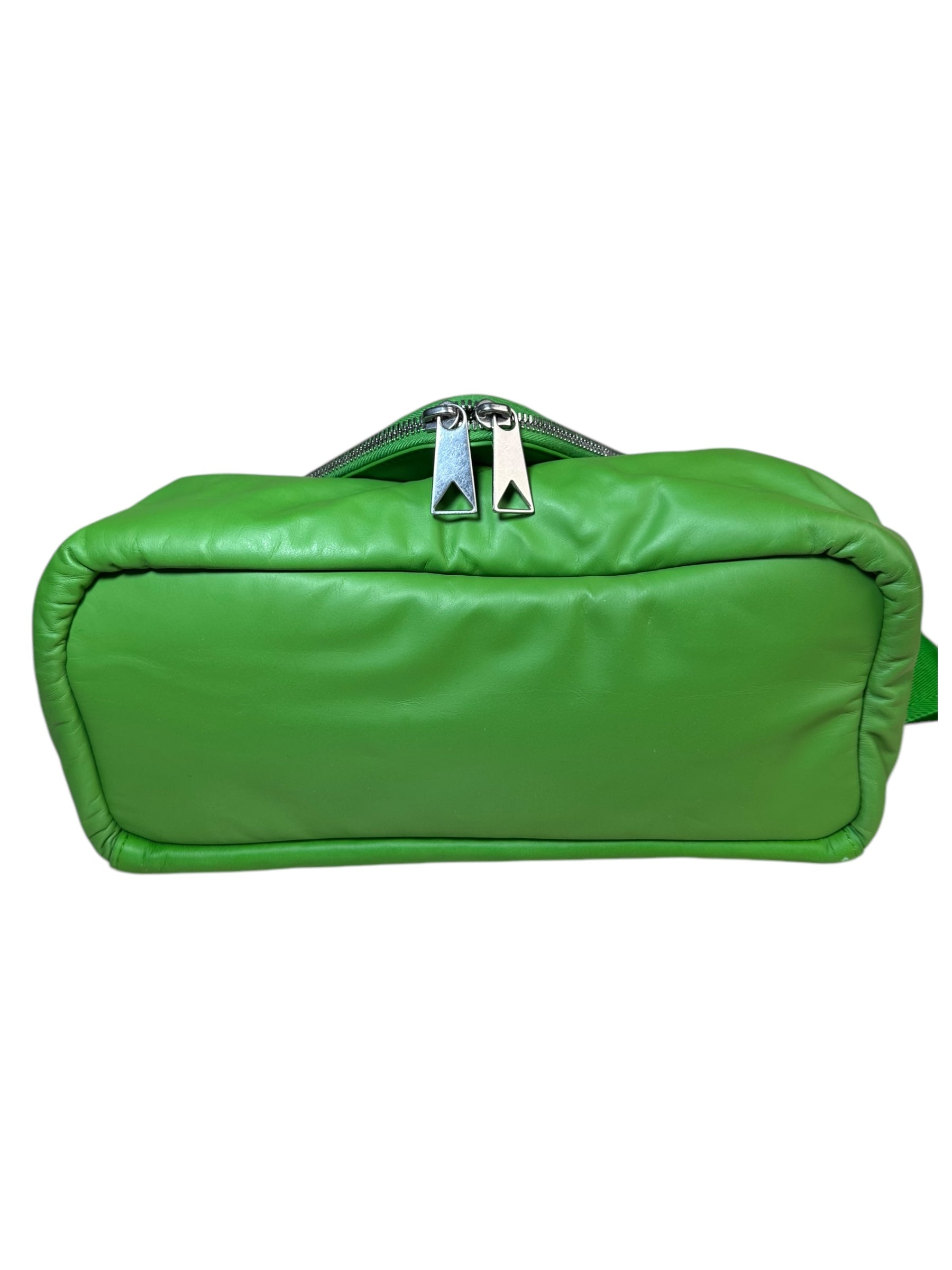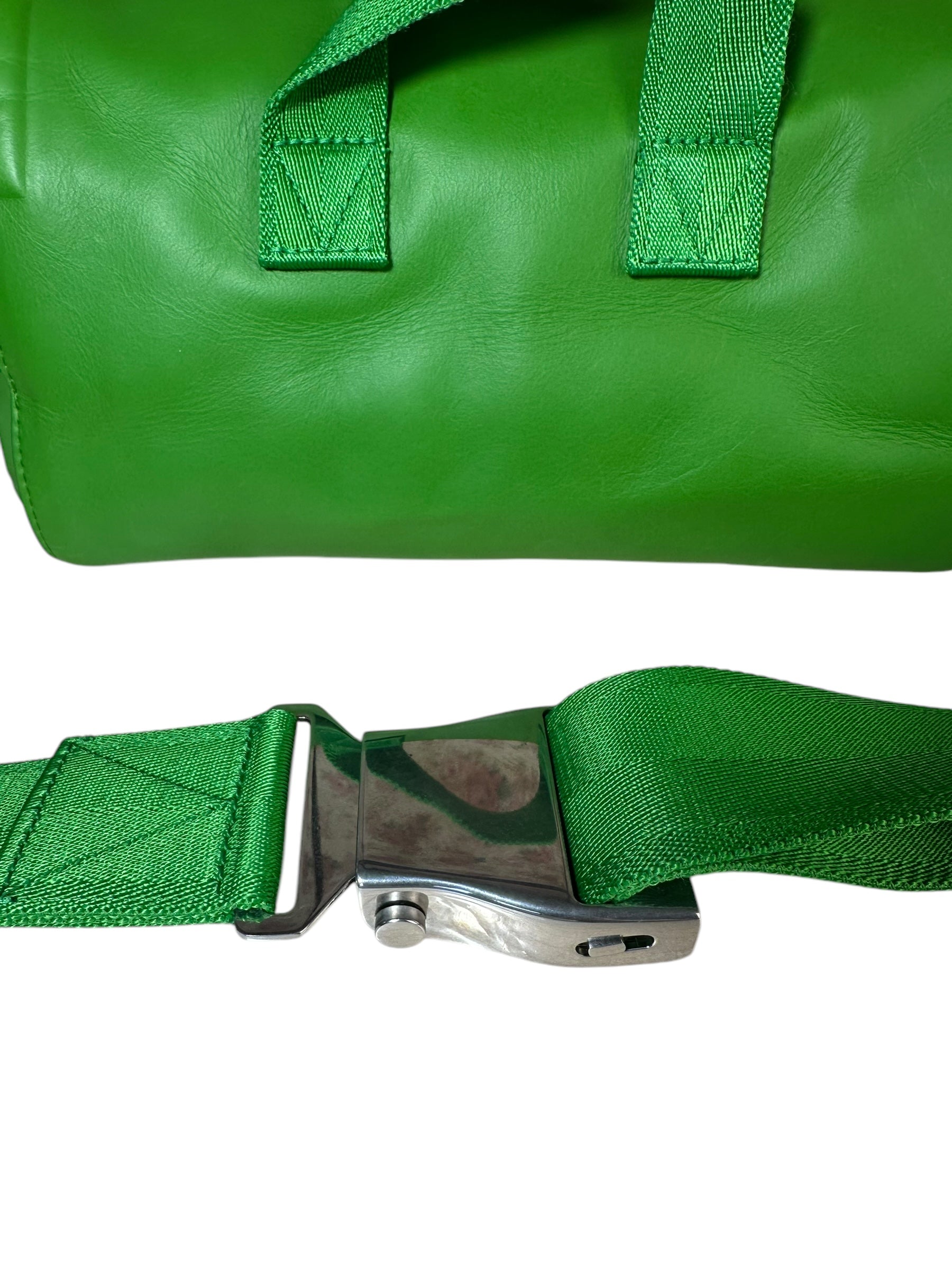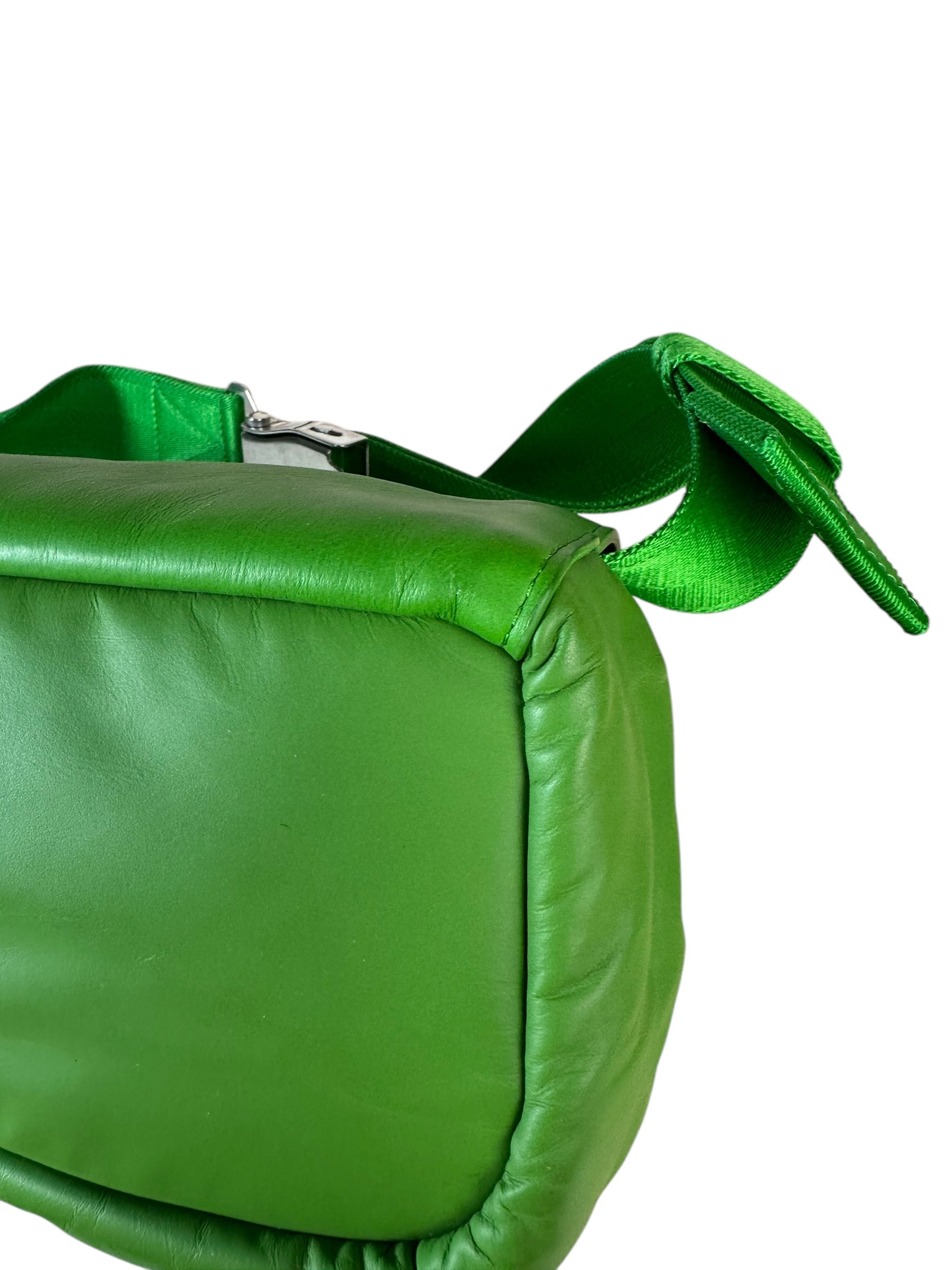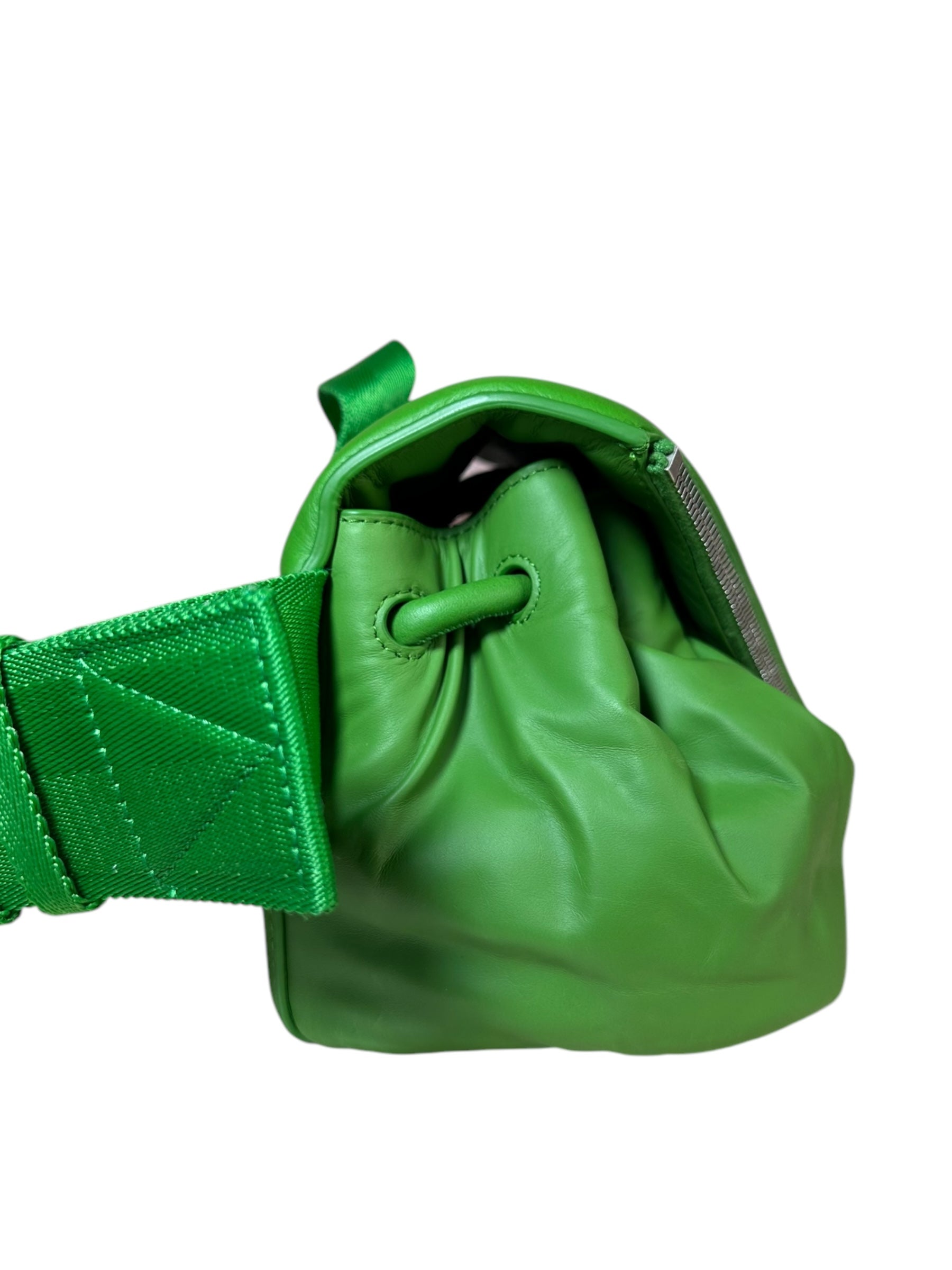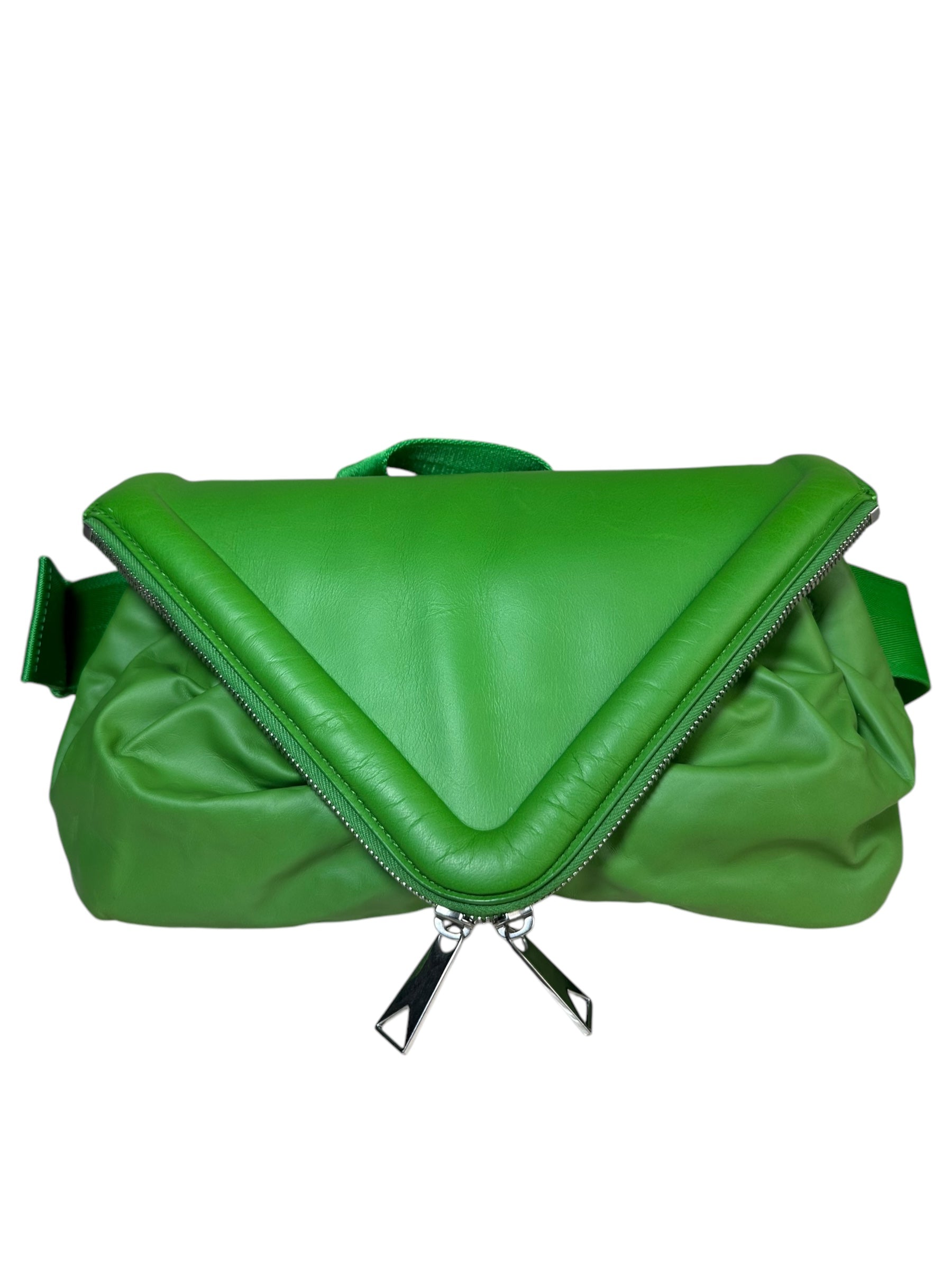 Bottega Veneta marsupio unisex in pelle verde con cinghie in nylon, fibbia in metallo argentato. Patta con doppia zip e chiusura con bottone magnetico. Lieve segno di usura poco visibile su un angolo. Viene spedita con dust bag.