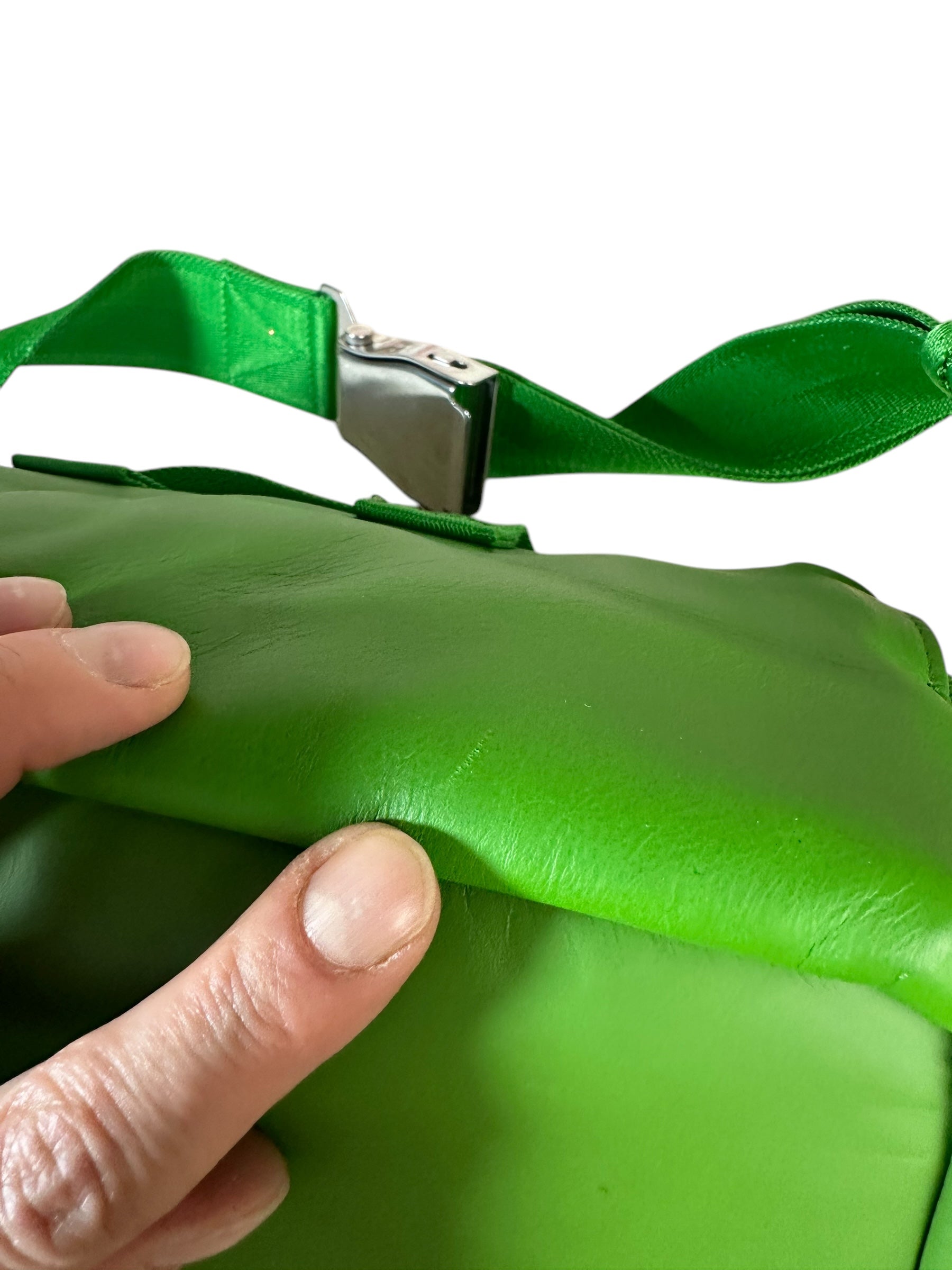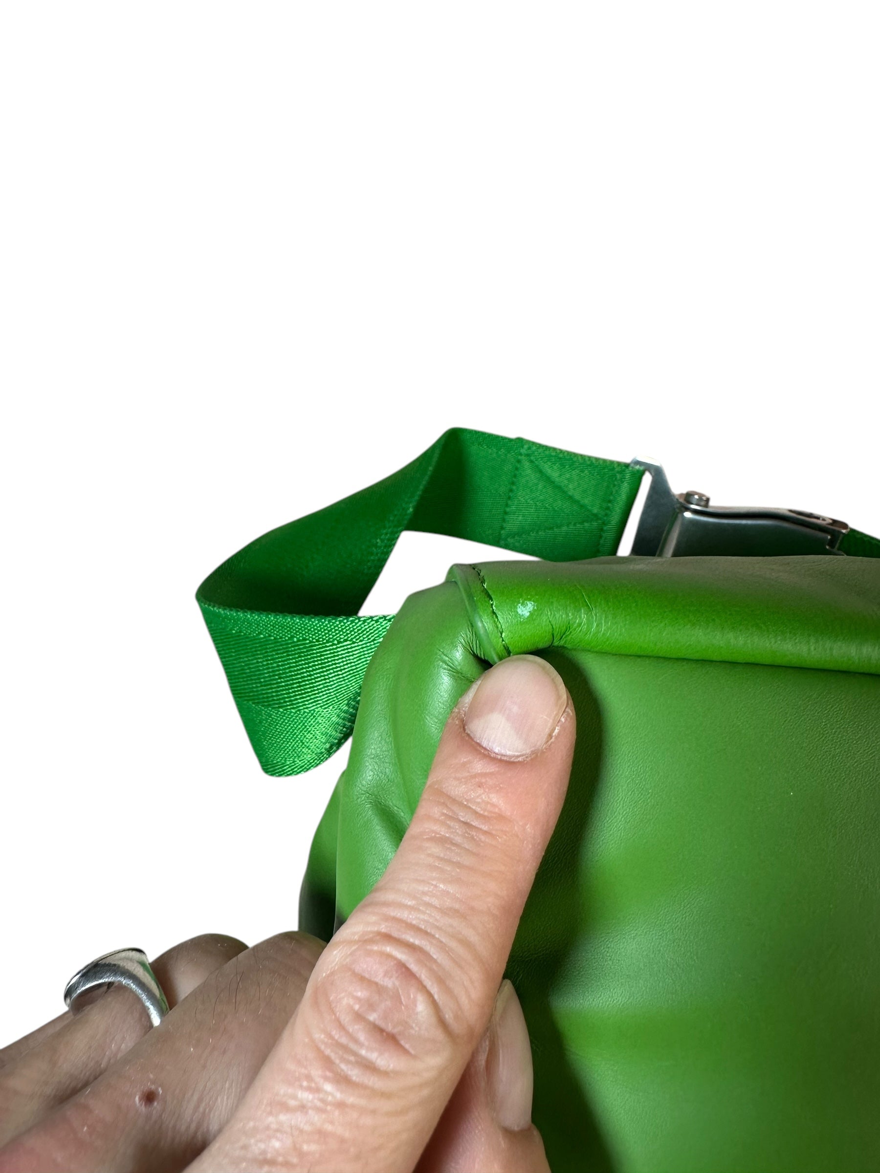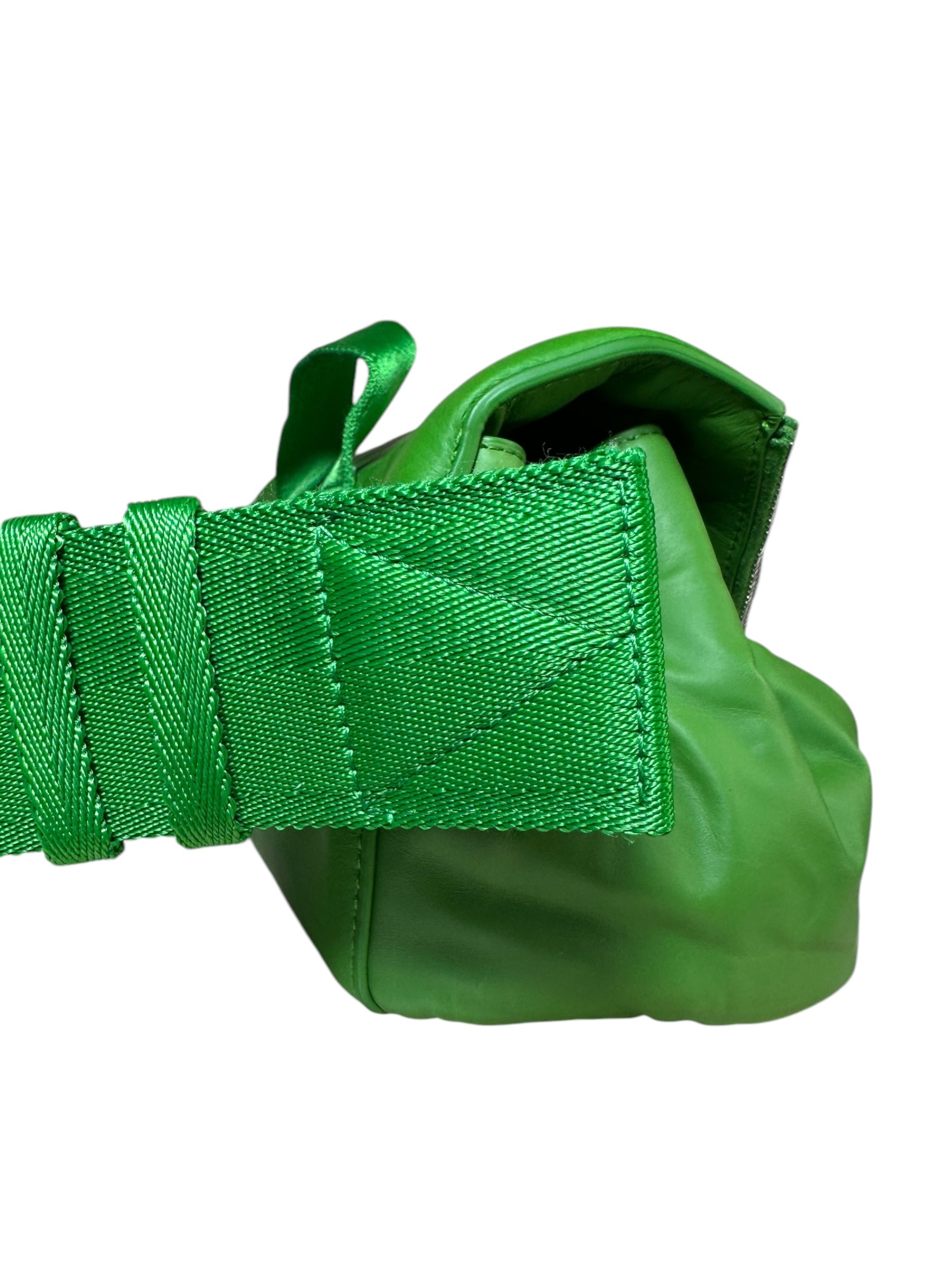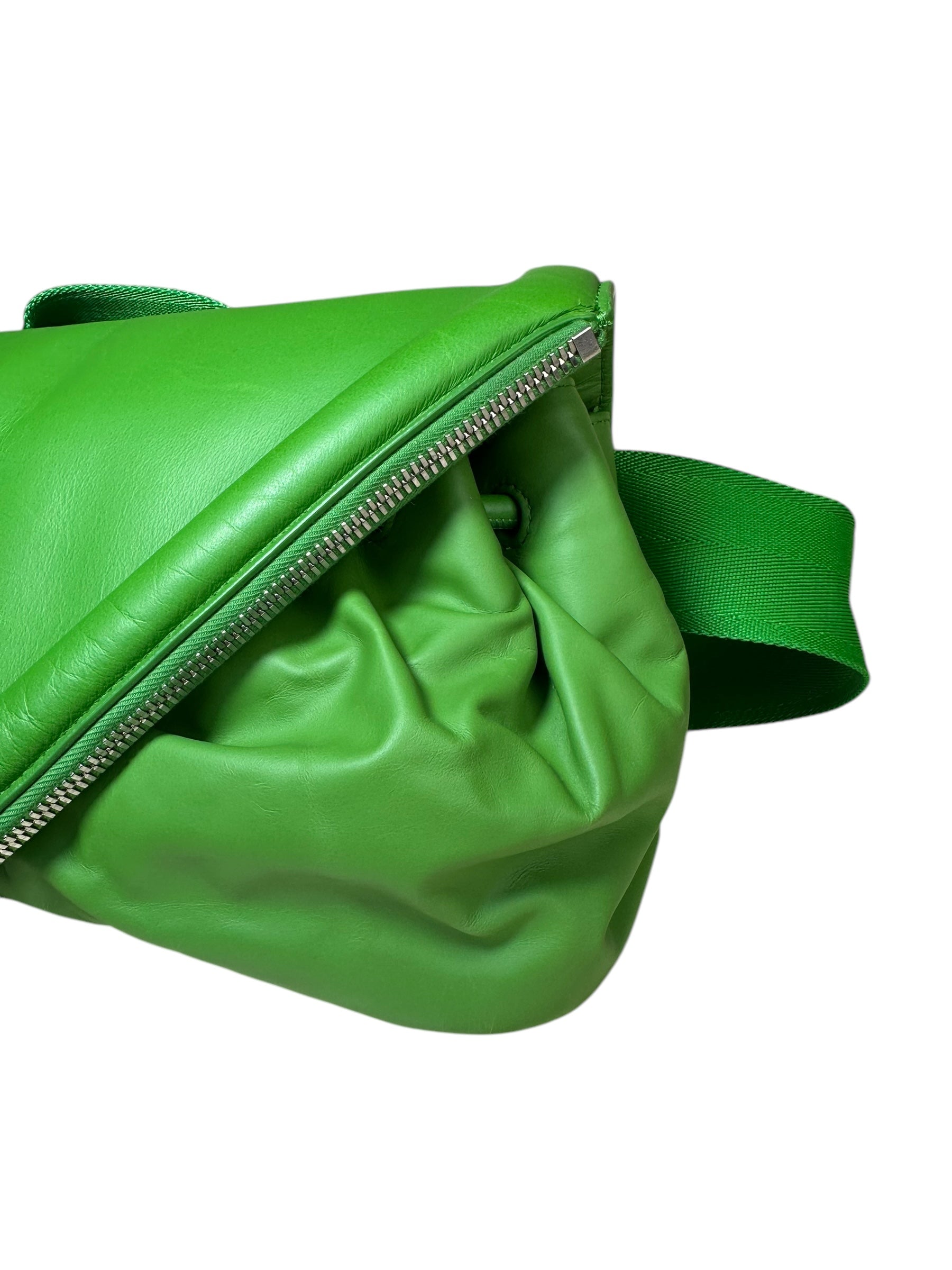 Bottega Veneta marsupio unisex in pelle verde con cinghie in nylon, fibbia in metallo argentato. Patta con doppia zip e chiusura con bottone magnetico. Lieve segno di usura poco visibile su un angolo. Viene spedita con dust bag.