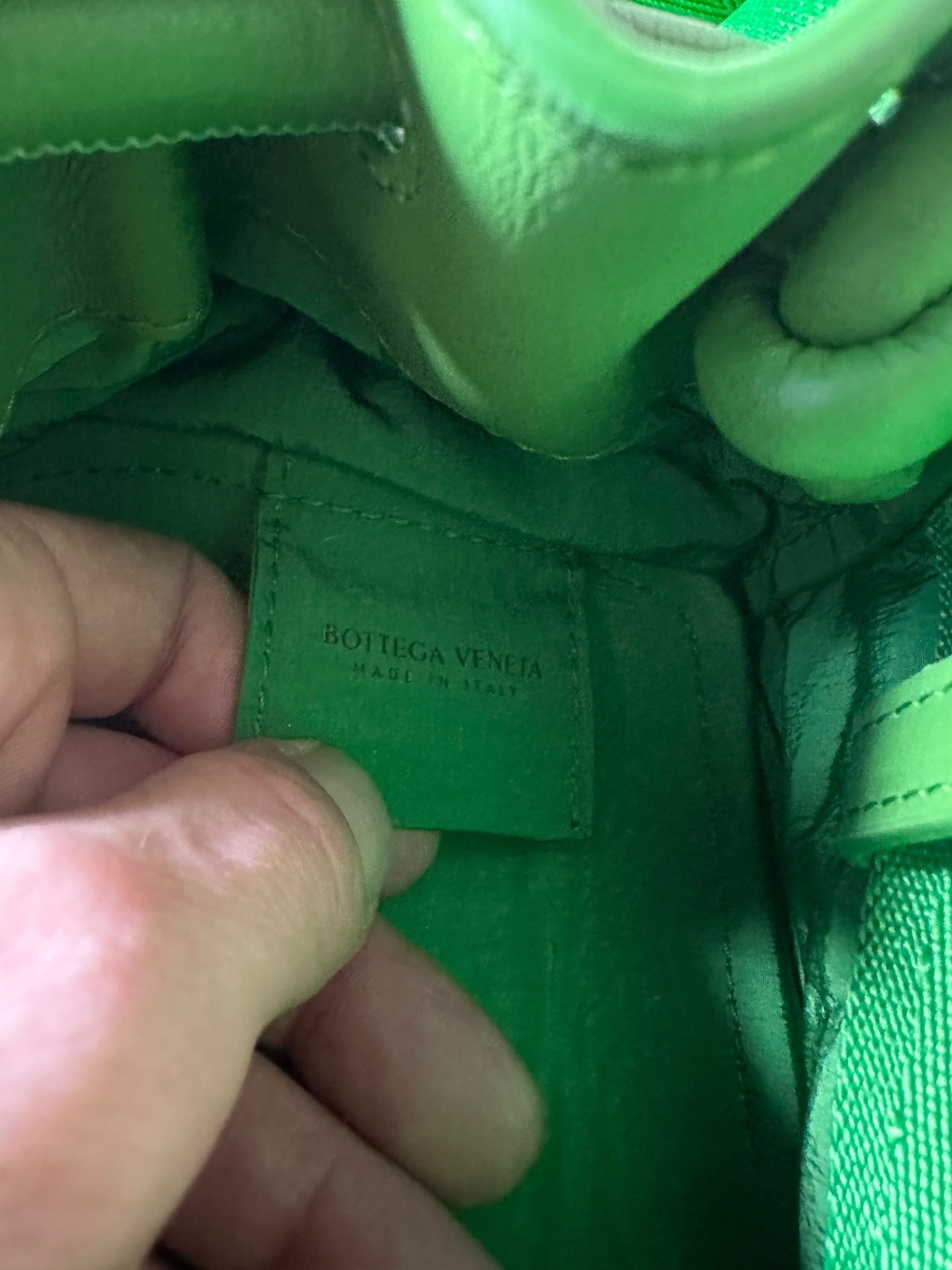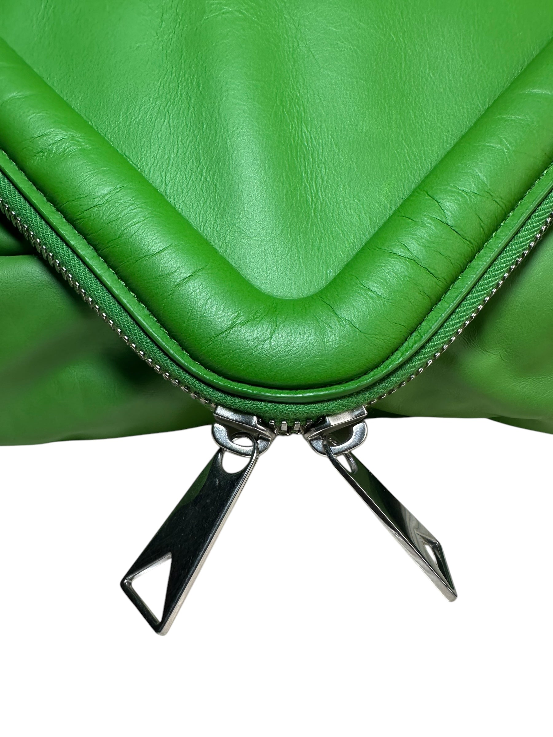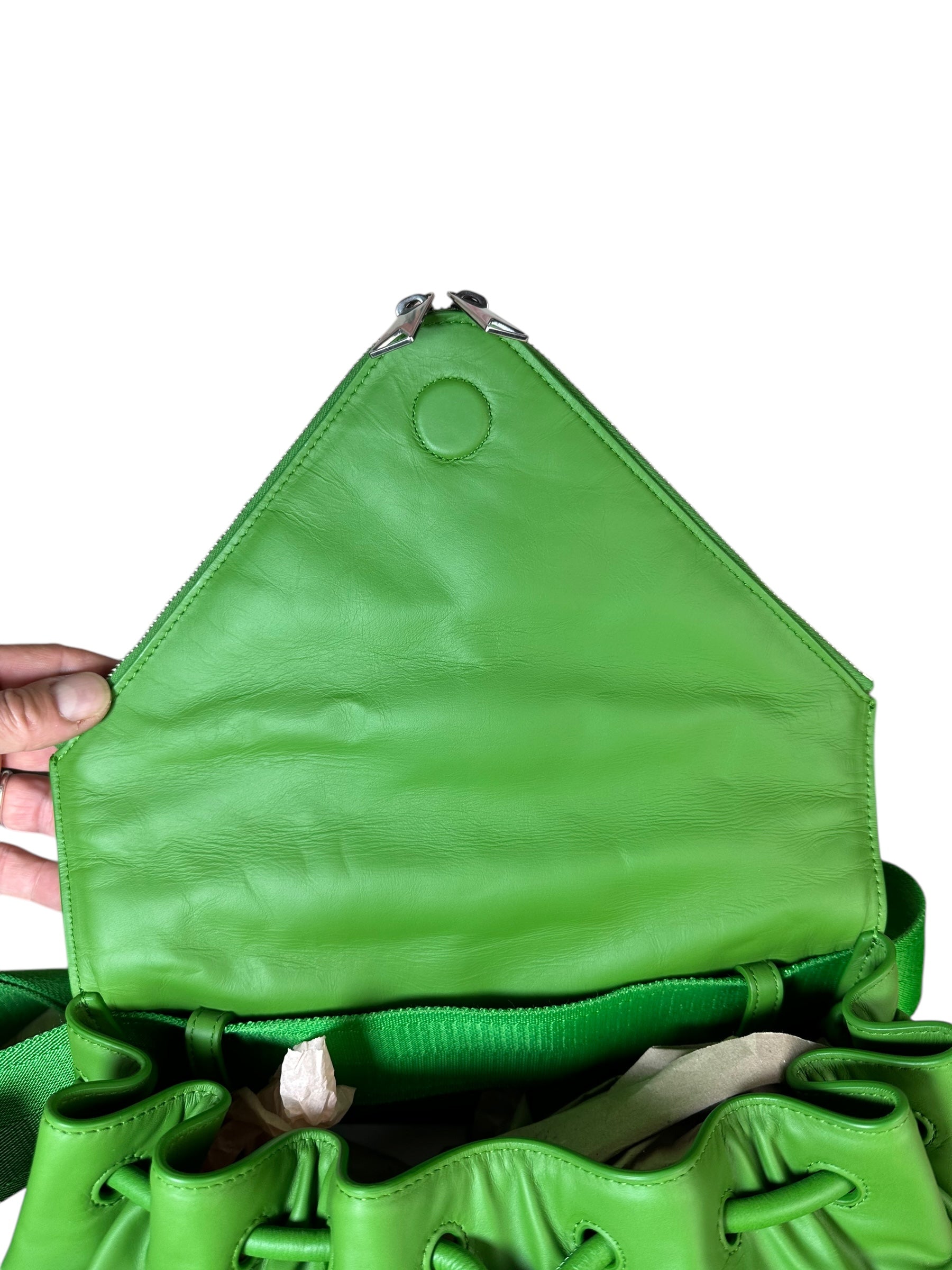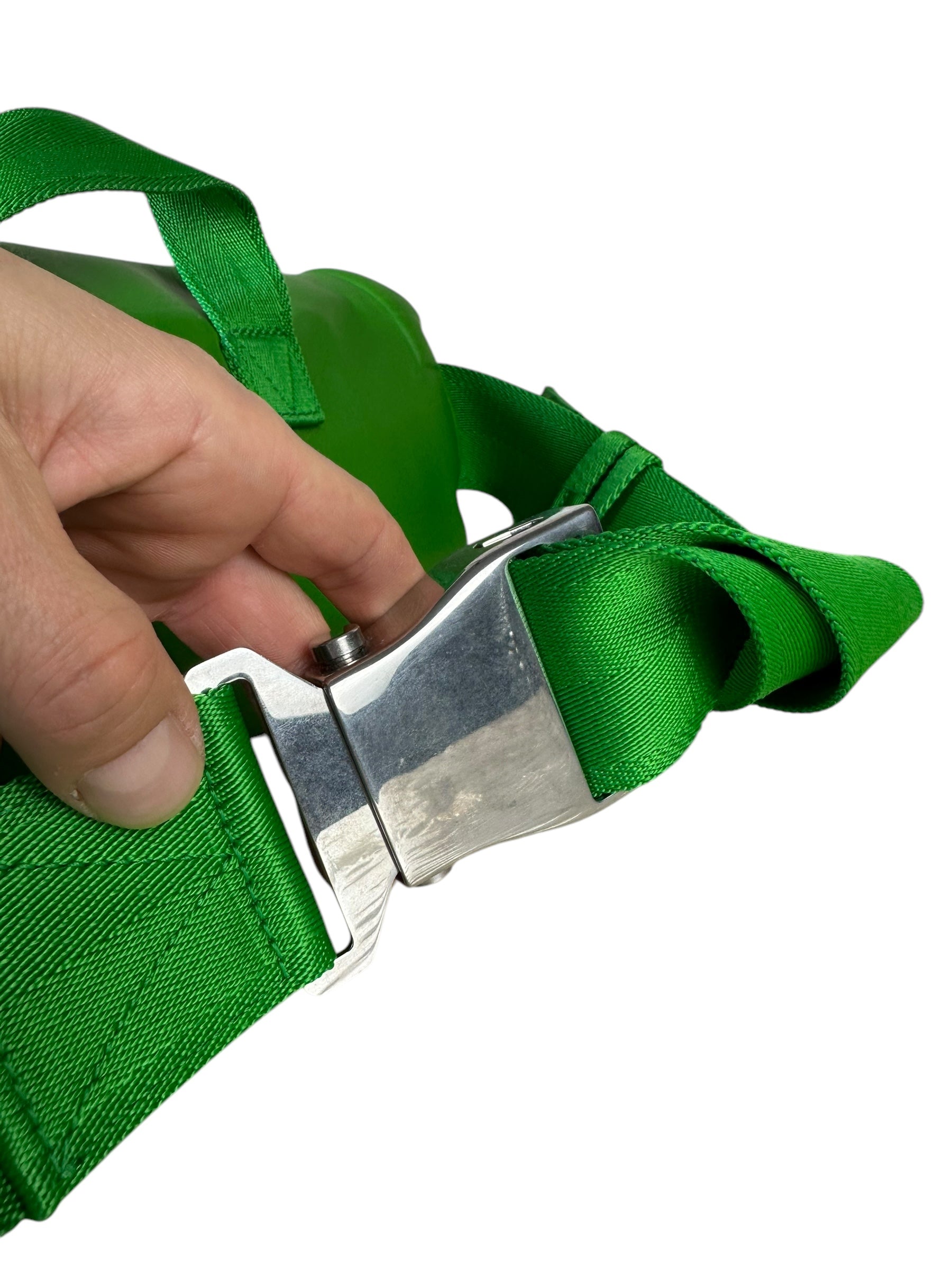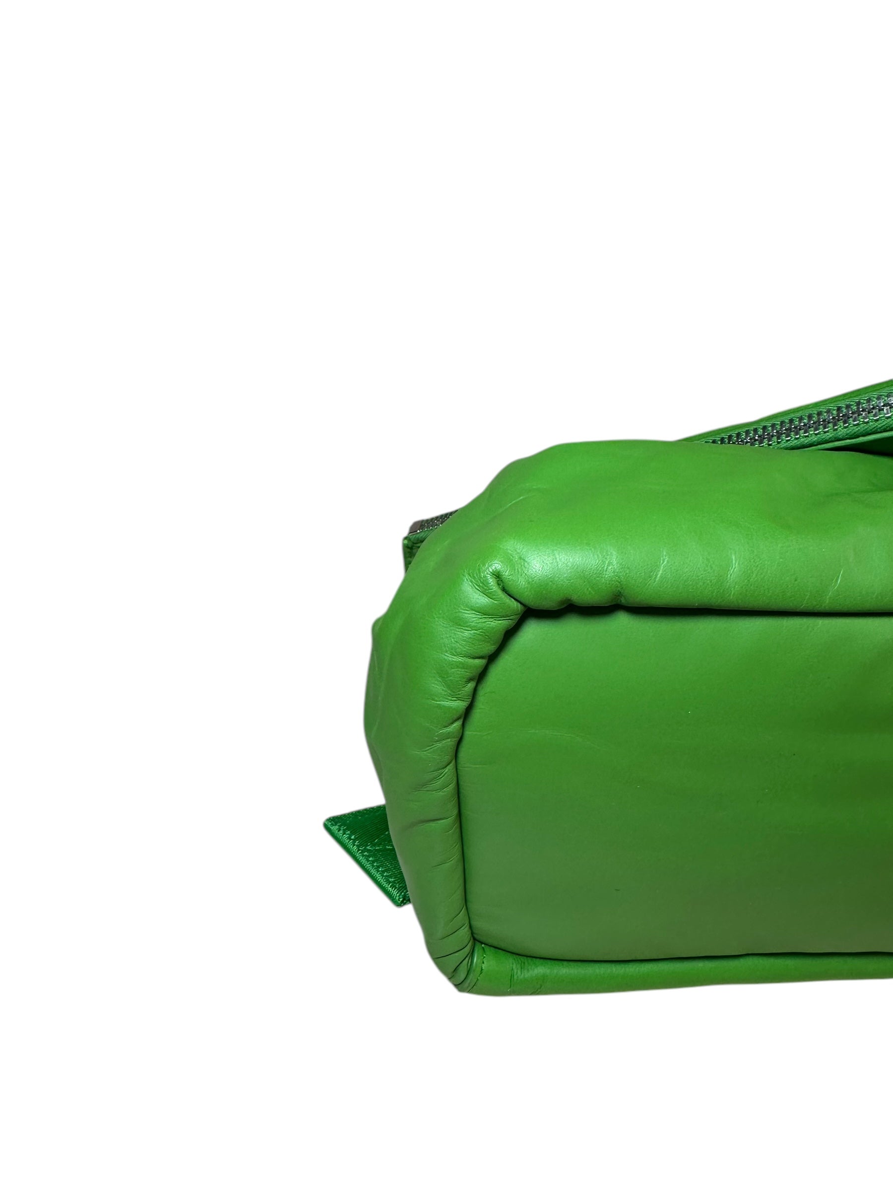 Bottega Veneta marsupio unisex in pelle verde con cinghie in nylon, fibbia in metallo argentato. Patta con doppia zip e chiusura con bottone magnetico. Lieve segno di usura poco visibile su un angolo. Viene spedita con dust bag.