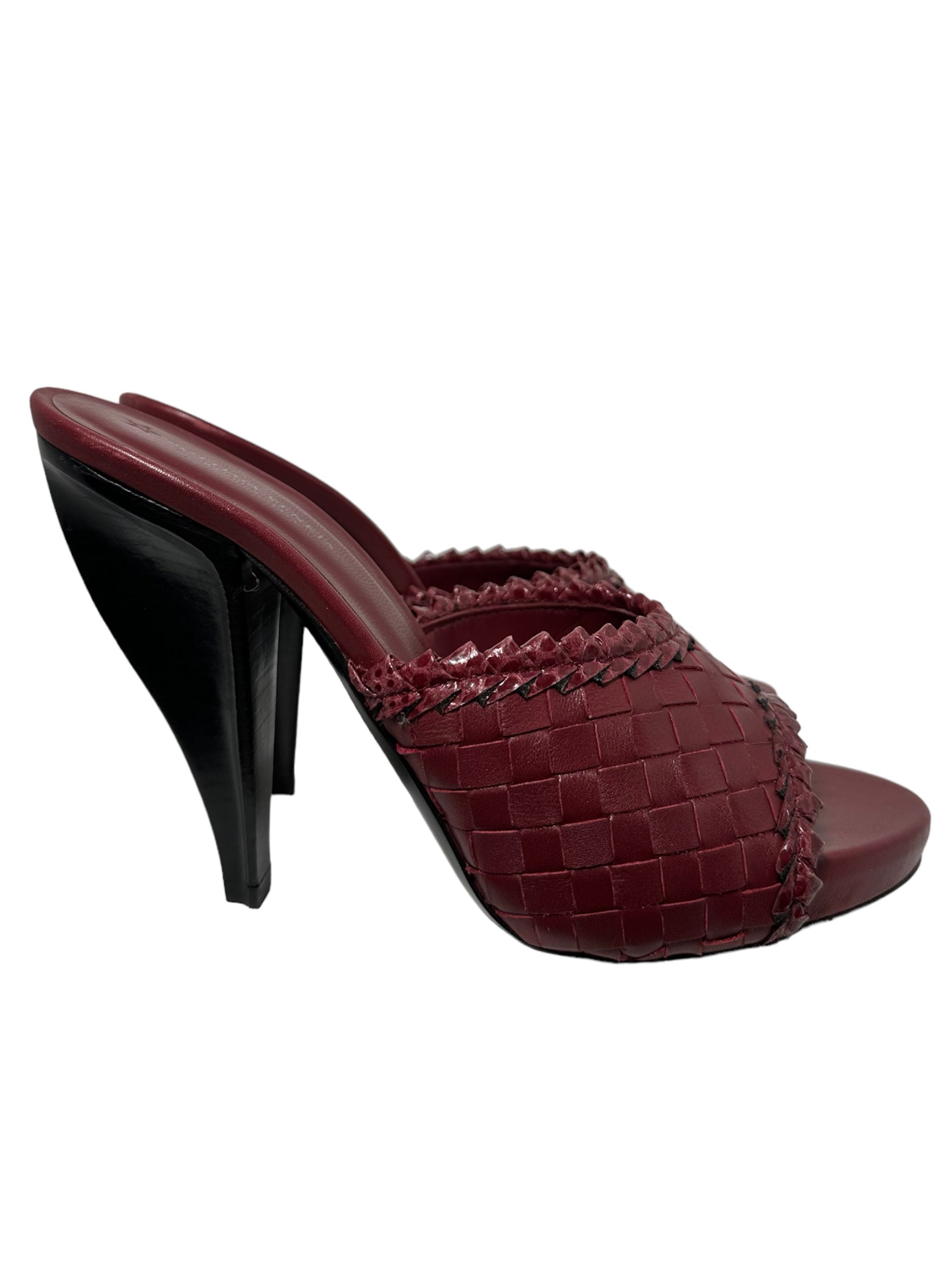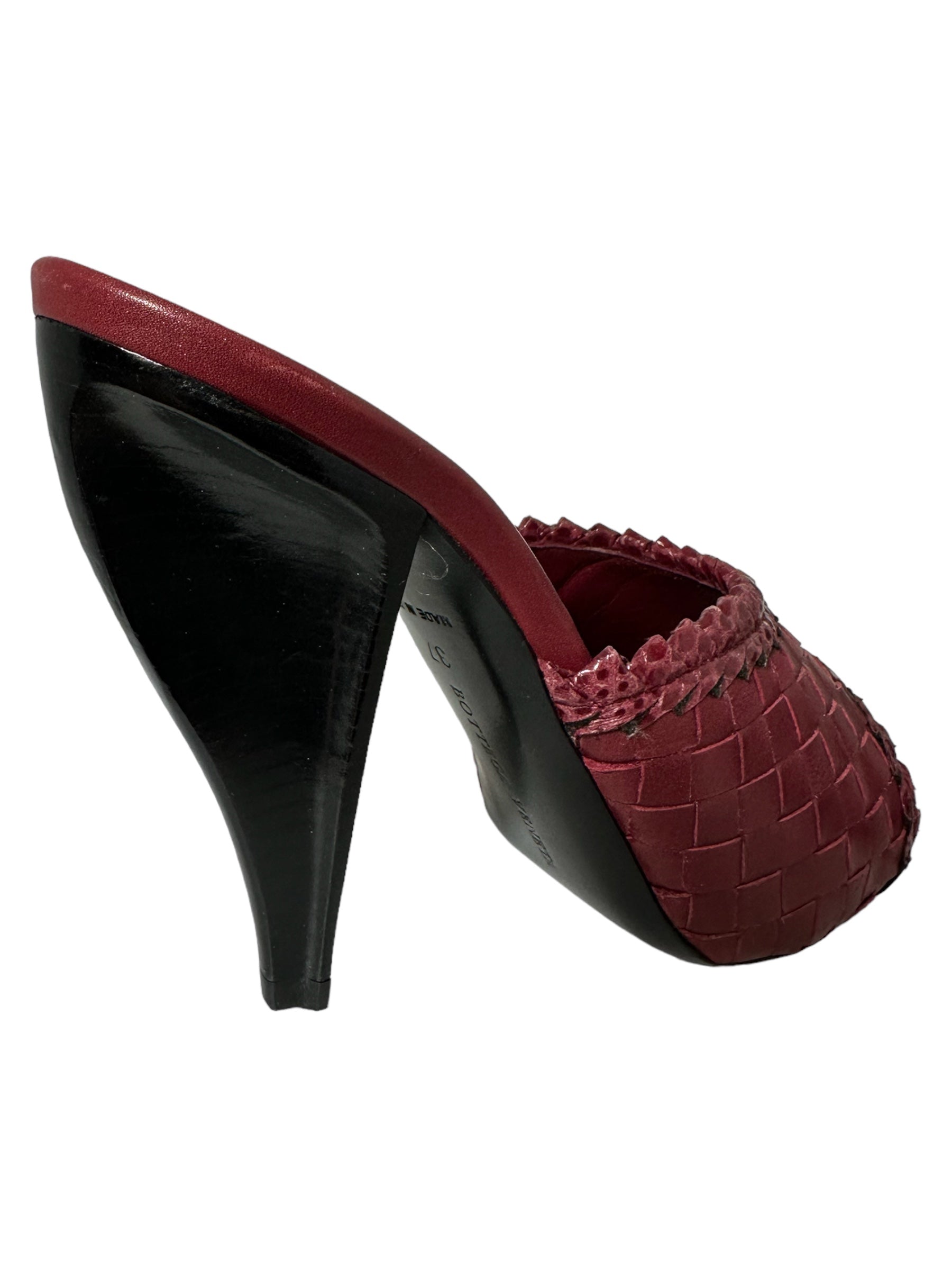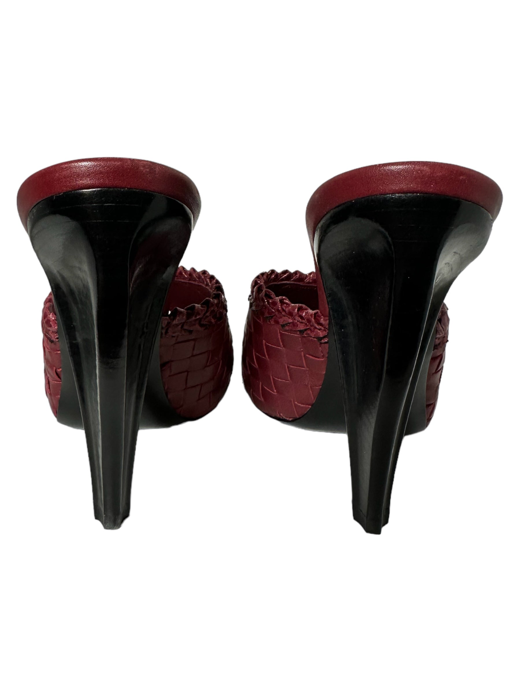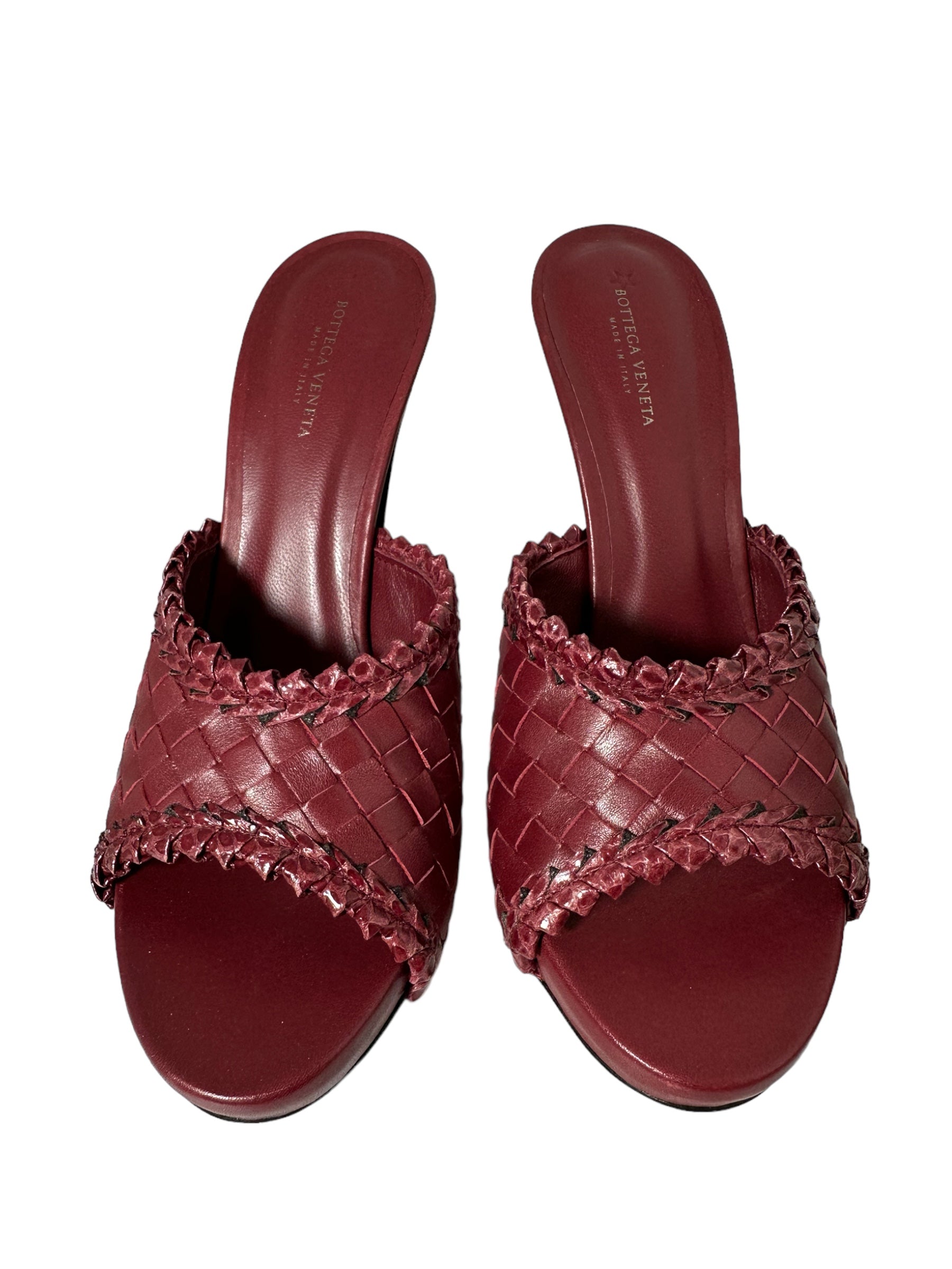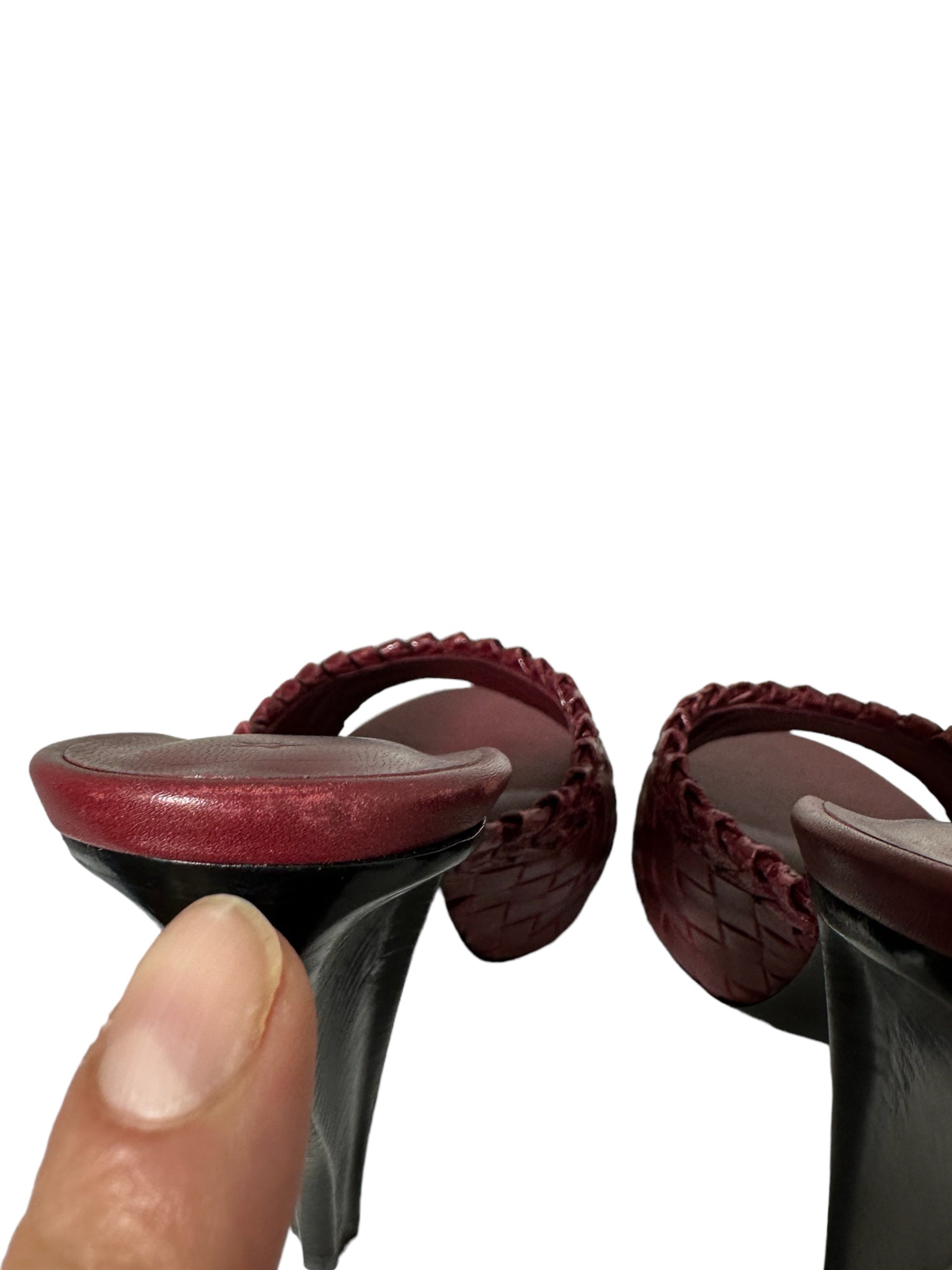 Bottega Veneta sandalo in pelle intrecciata bordeaux con tacco in legno a semi goccia. Presenta due lievissimi segni di usura visibili in foto. Altezza tacco 10 cm, vengono spediti con scatola.