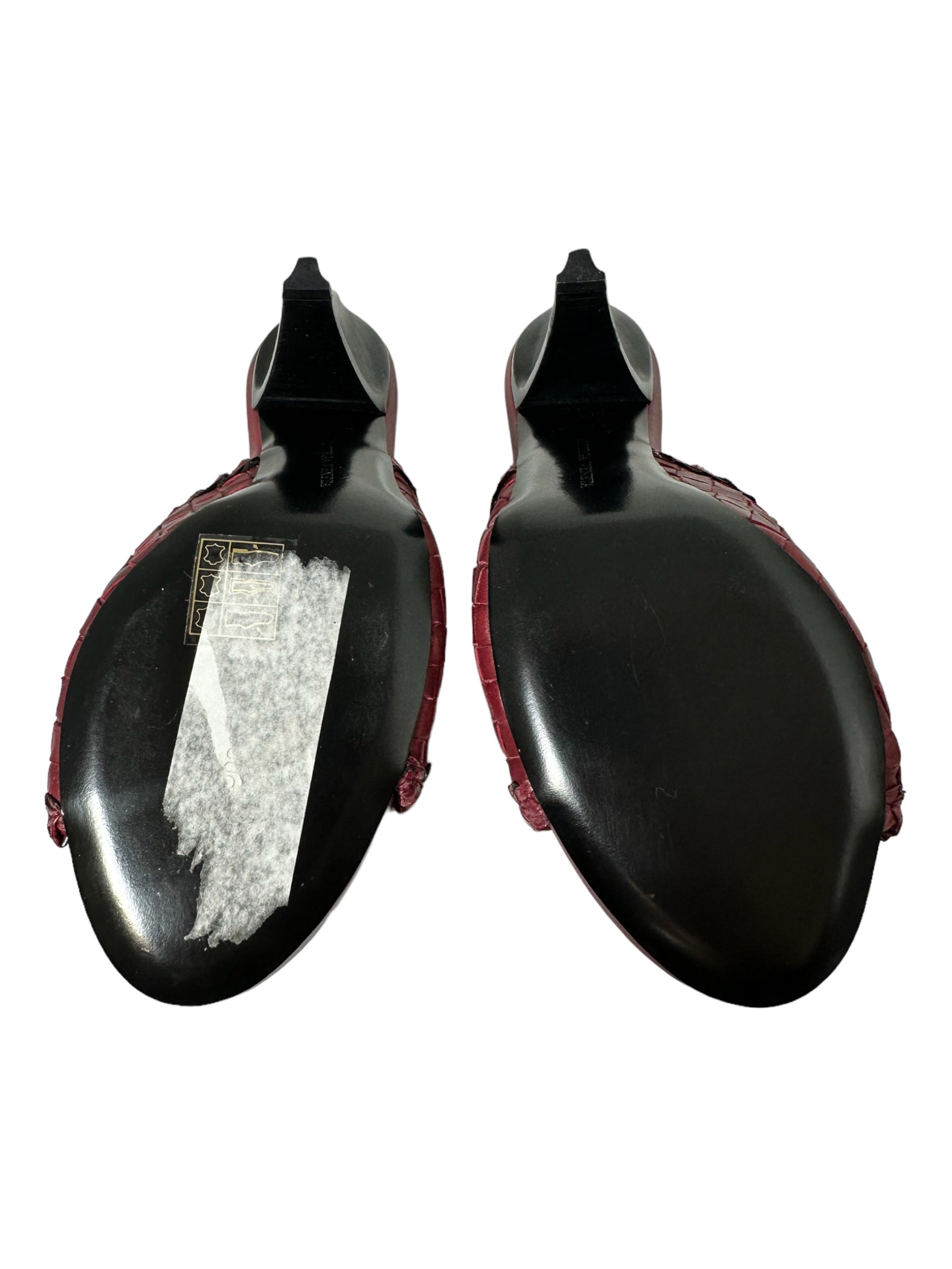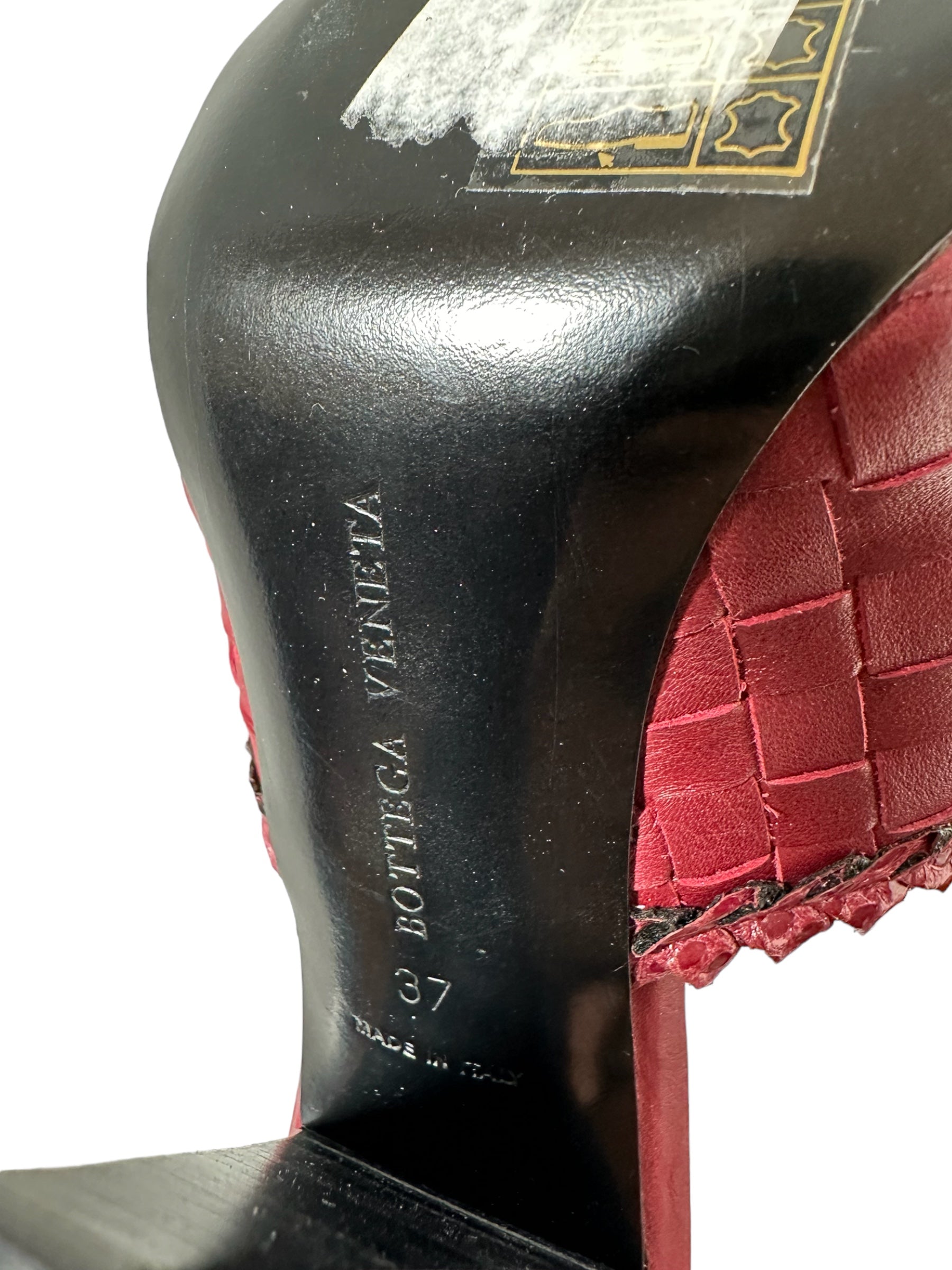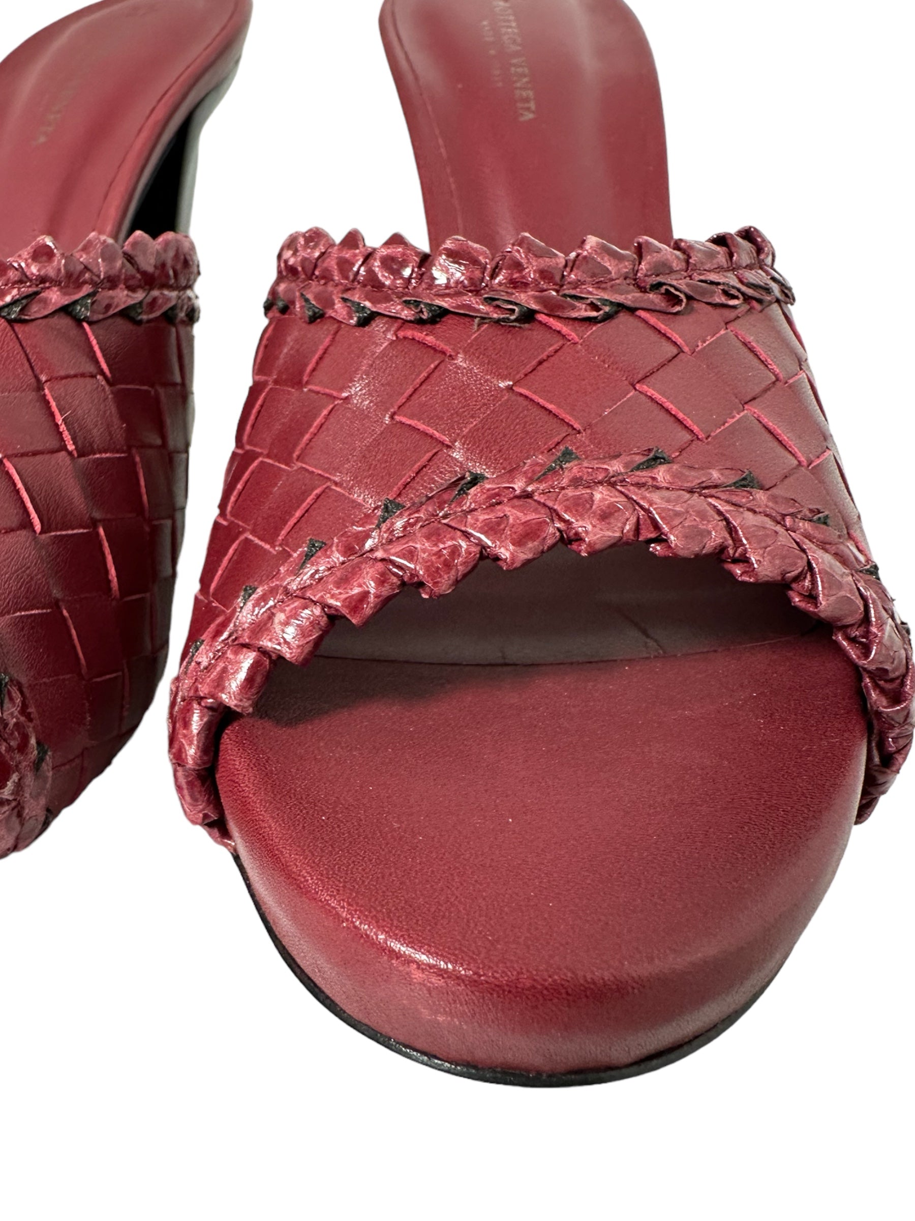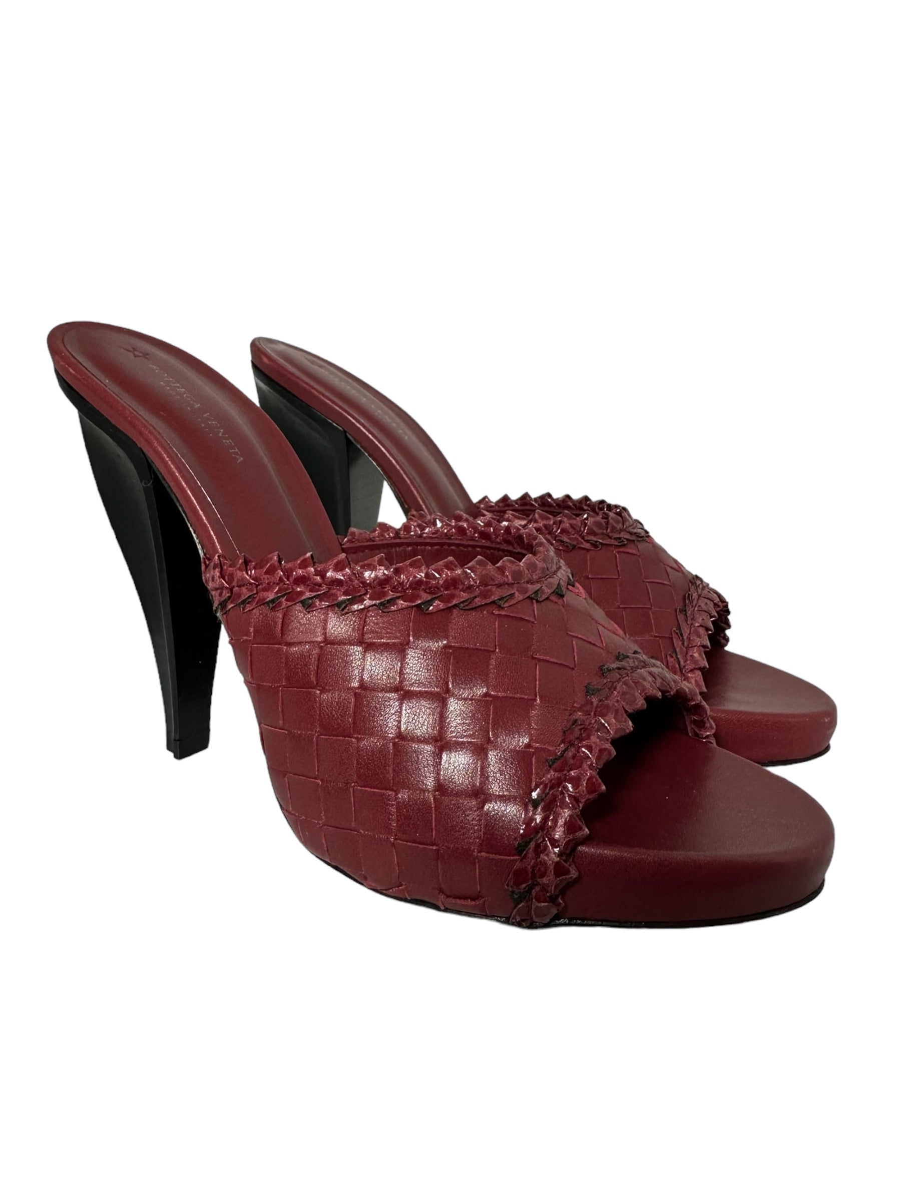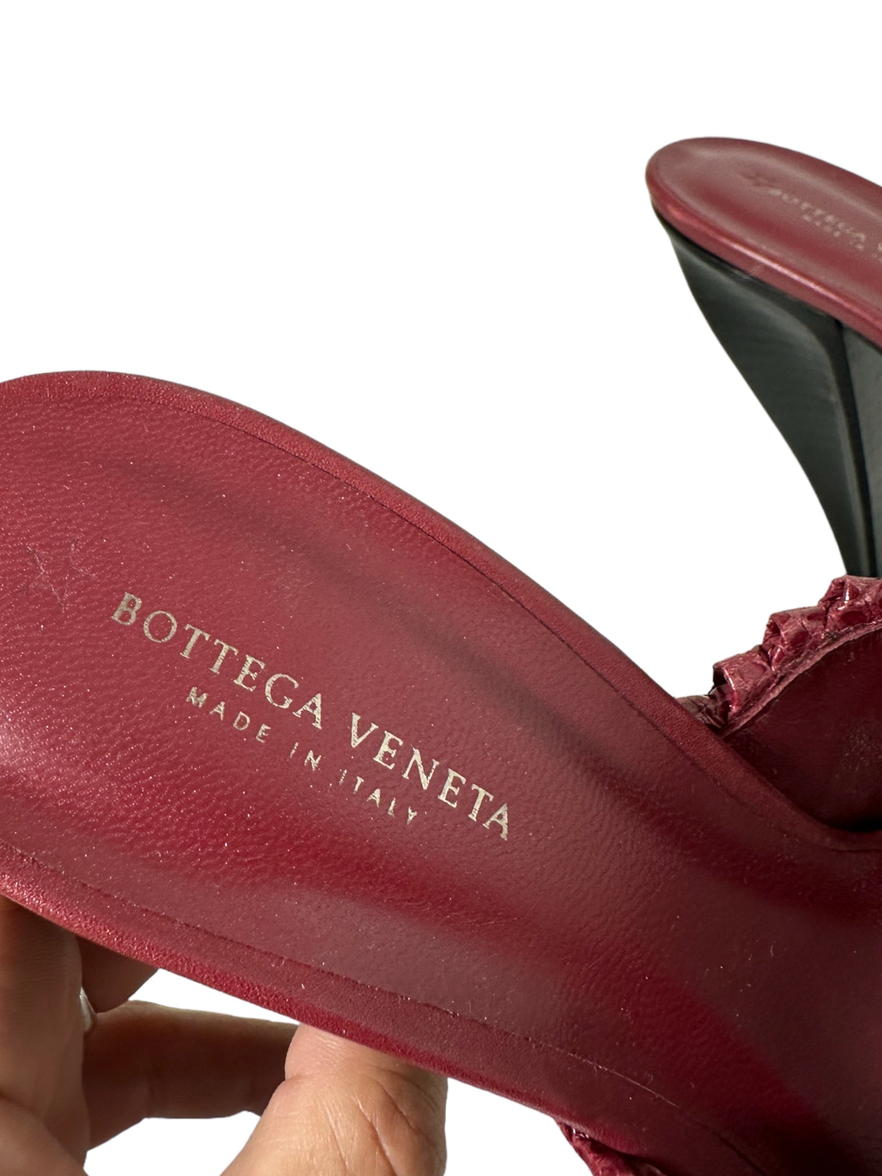 Bottega Veneta sandalo in pelle intrecciata bordeaux con tacco in legno a semi goccia. Presenta due lievissimi segni di usura visibili in foto. Altezza tacco 10 cm, vengono spediti con scatola.