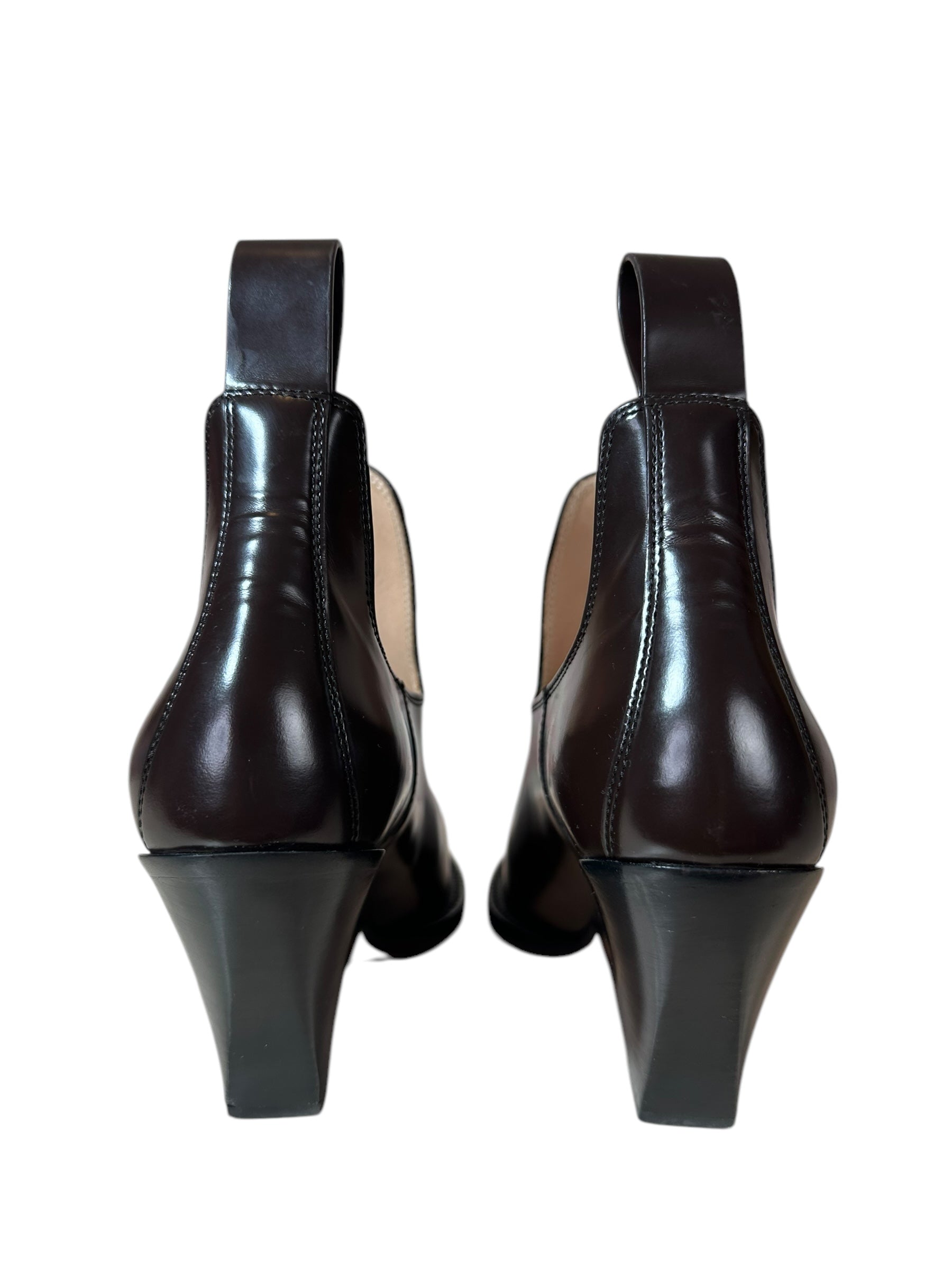 • Tomaia: Pelle di vitello liscia e lucida di alta qualità, in una raffinata tonalità marrone scuro. La finitura leggermente specchiata esalta la profondità del colore e conferisce un aspetto elegante e lussuoso.