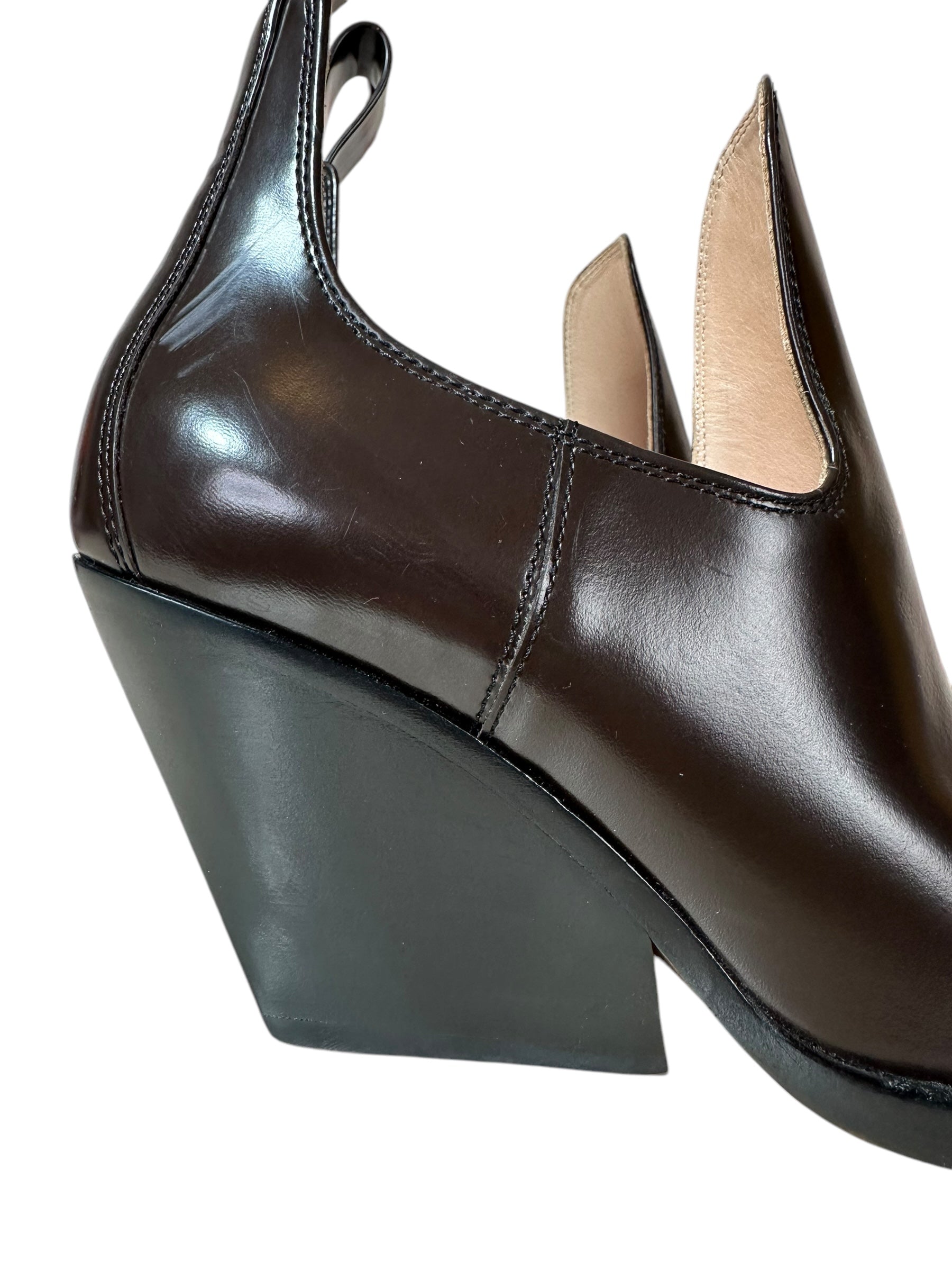 • Tacco a zeppa scultoreo: La zeppa nera, inclinata e scolpita con una linea decisa, dona stabilità e carattere alla calzatura, creando un contrasto raffinato con la tomaia liscia.