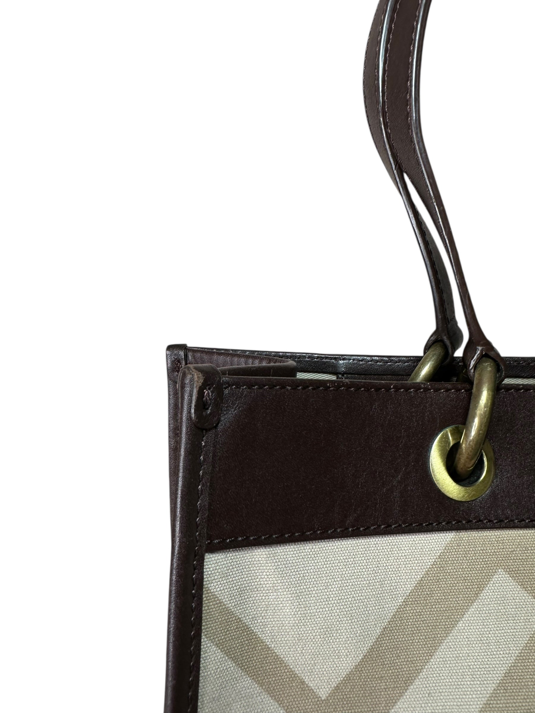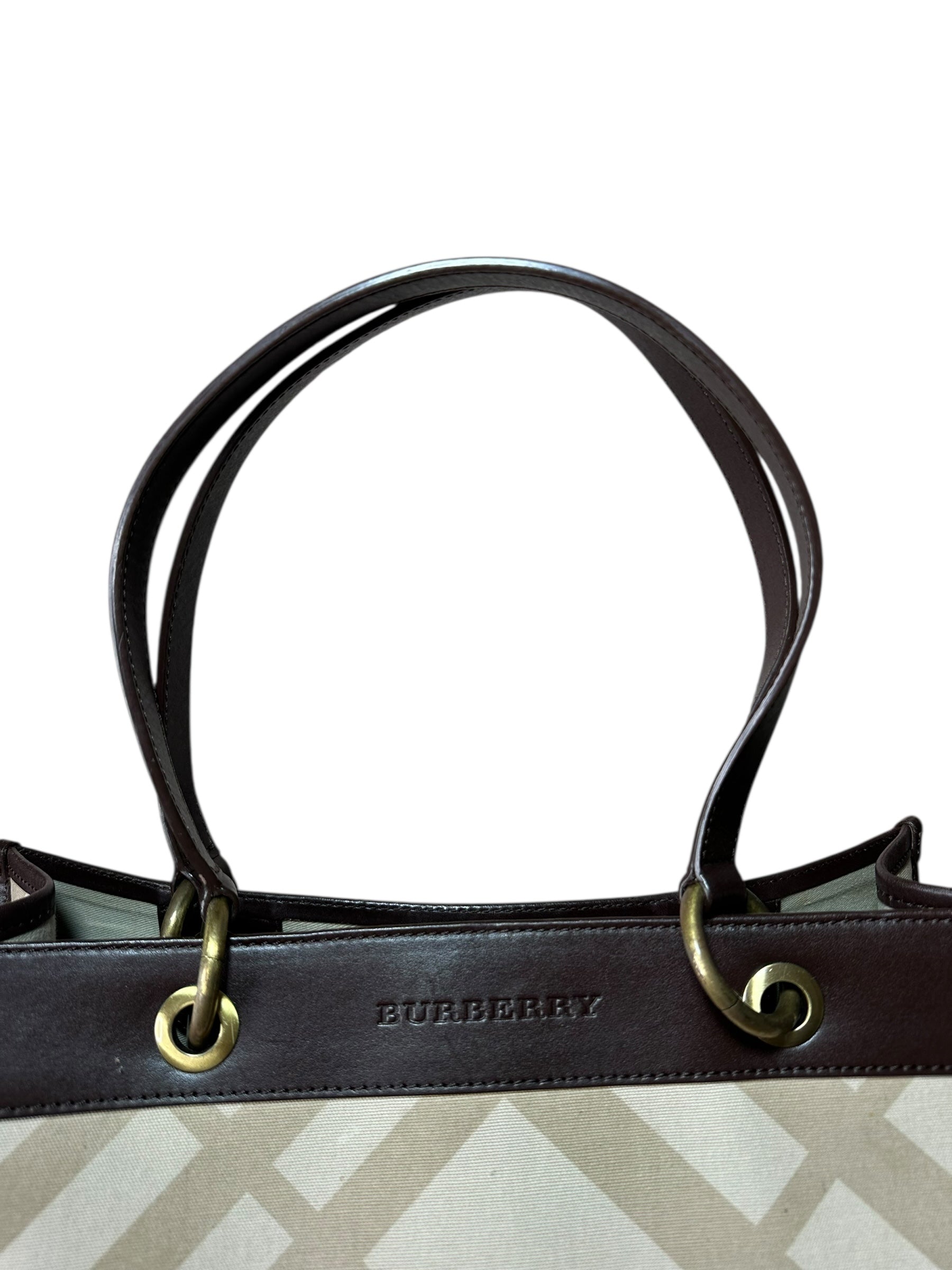 Shopper Burberry vintage realizzata in tela resistente con iconico pattern geometrico nei toni del beige, rifinita con profili e doppi manici in pelle color testa di moro. Gli inserti metallici color ottone anticato donano un carattere elegante e senza tempo.