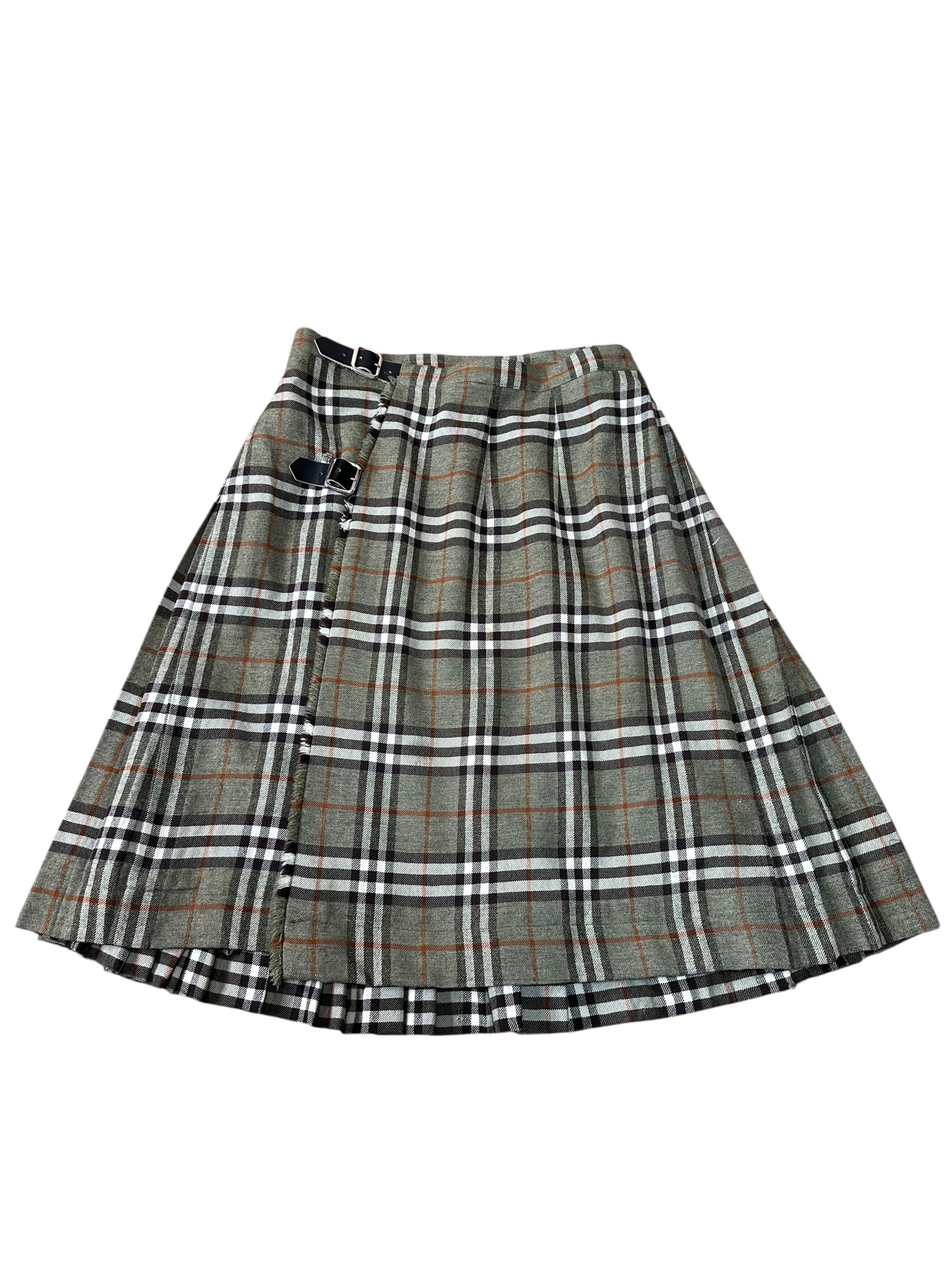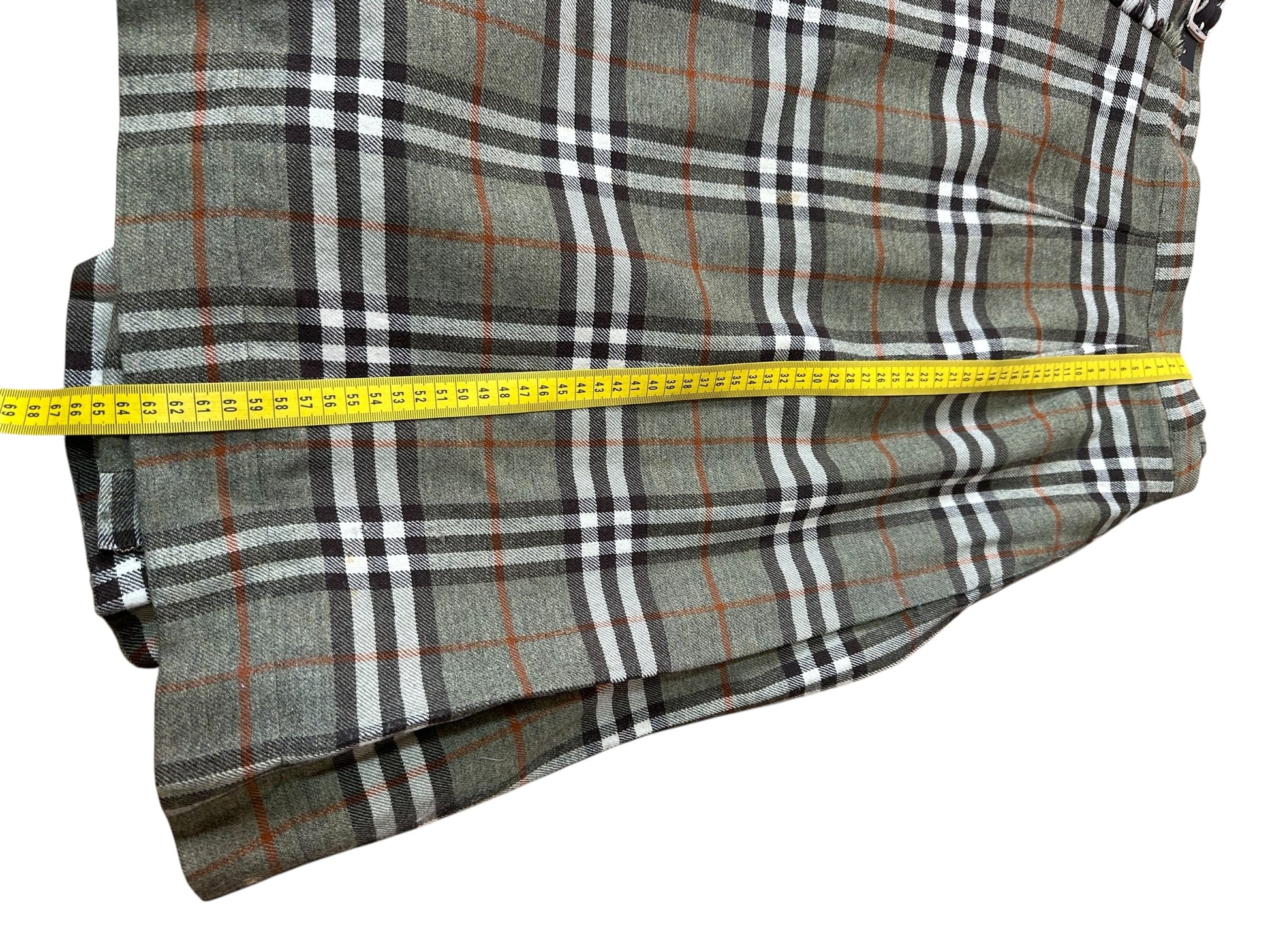 Elegante kilt vintage firmato Burberrys, realizzato in Inghilterra in pura lana vergine (100%). Il modello presenta il classico motivo check scozzese nei toni del verde, marrone, nero e bianco con sottili righe arancioni. La struttura è a pieghe sul retro, mentre la chiusura è regolabile sul lato con due cinturini in pelle nera e fibbie in metallo. L’orlo è rifinito con il tipico taglio a frange.