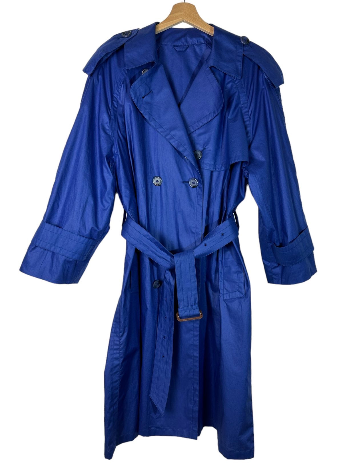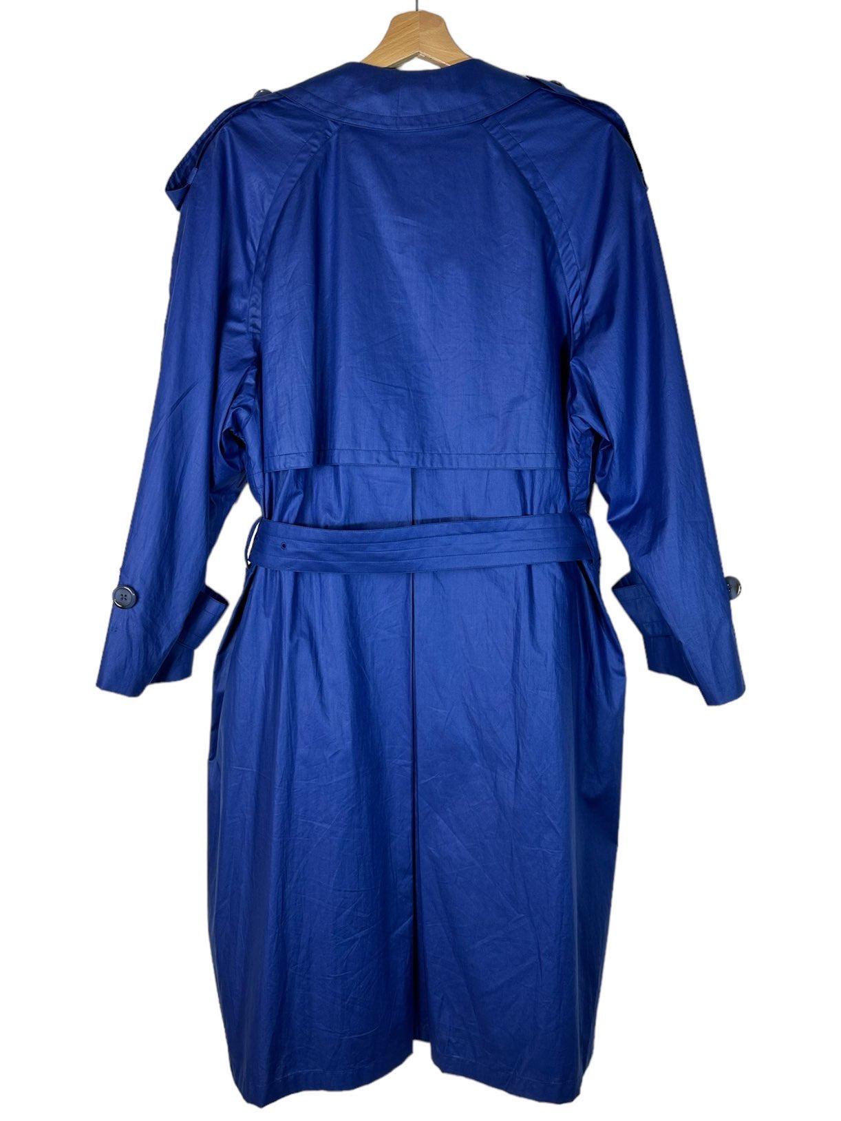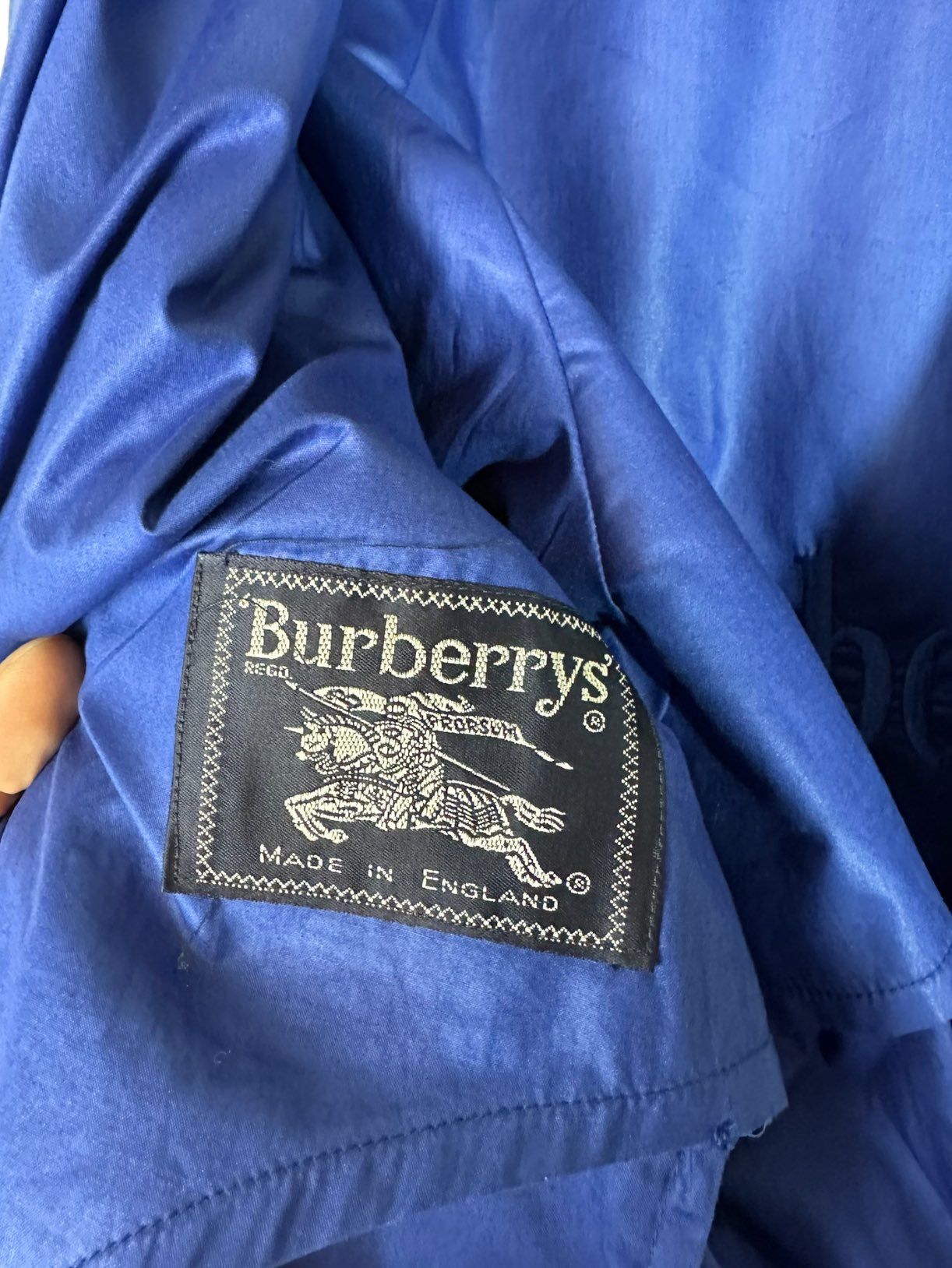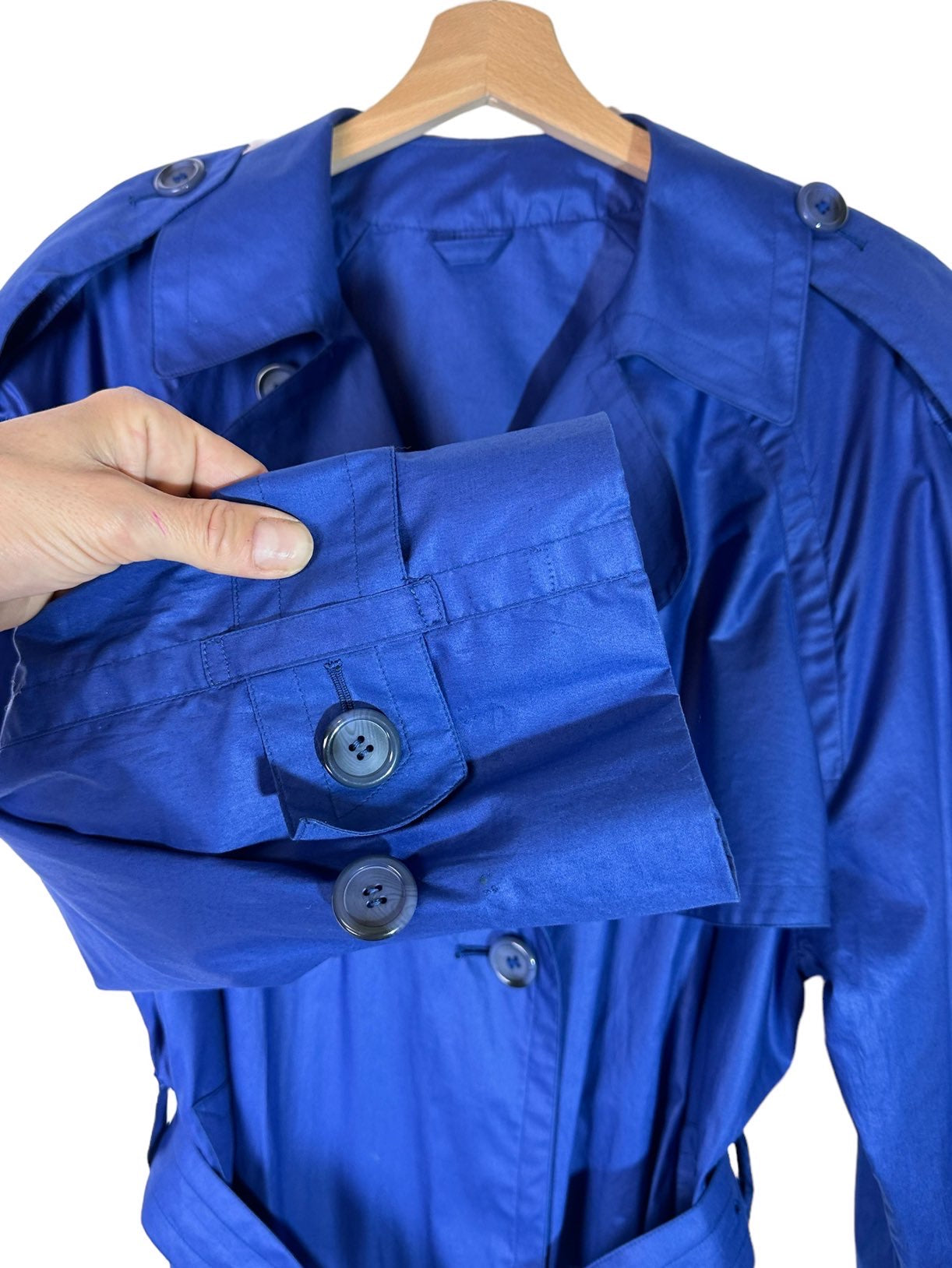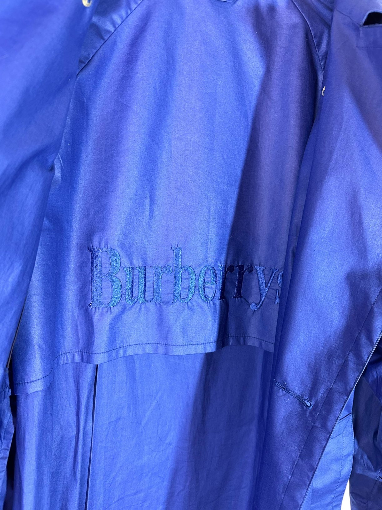 Burberry trench vintage in cotone blu con tasche laterali e cintura in vita, logo ricamato all’interno. Vedete una taglia 42 oversize.
