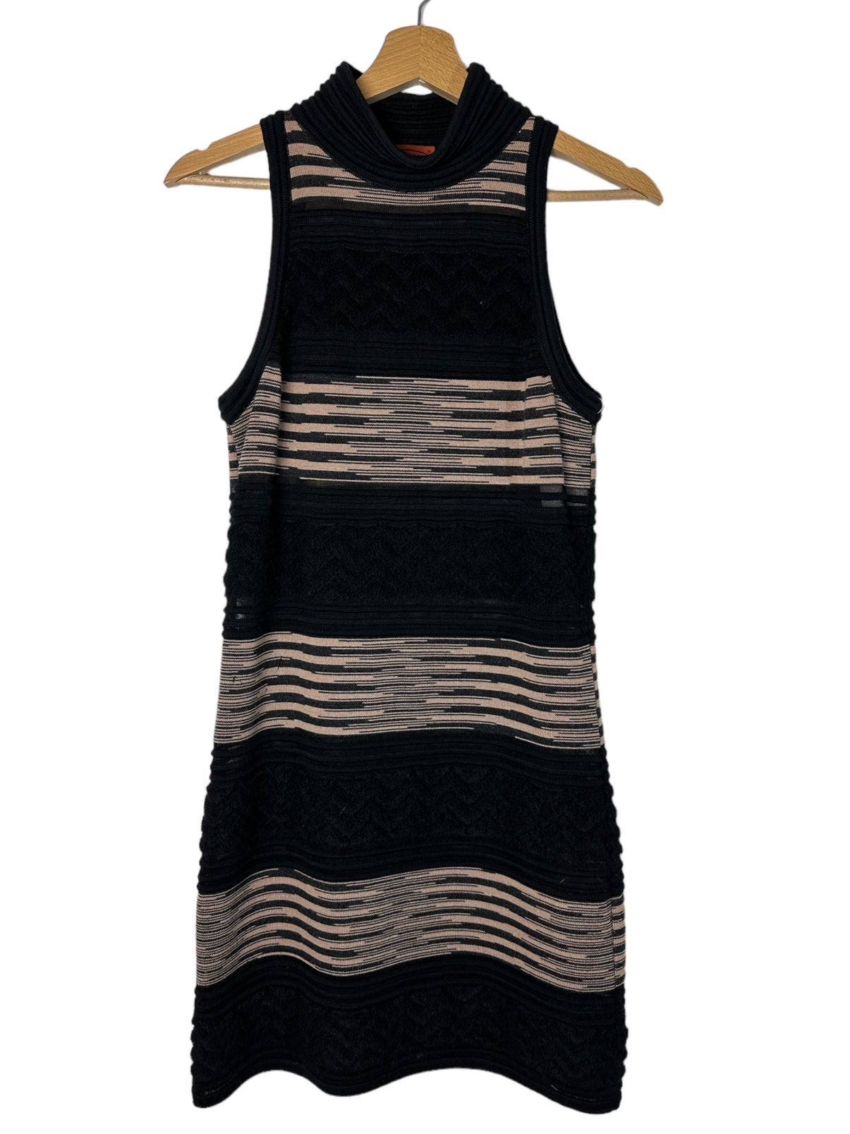 Missoni mini abito a tubino in lana, viscosa e mohair smanicato con inserti trasparenti e righe orizzontali. Non riporta etichetta con taglia. Tg. M