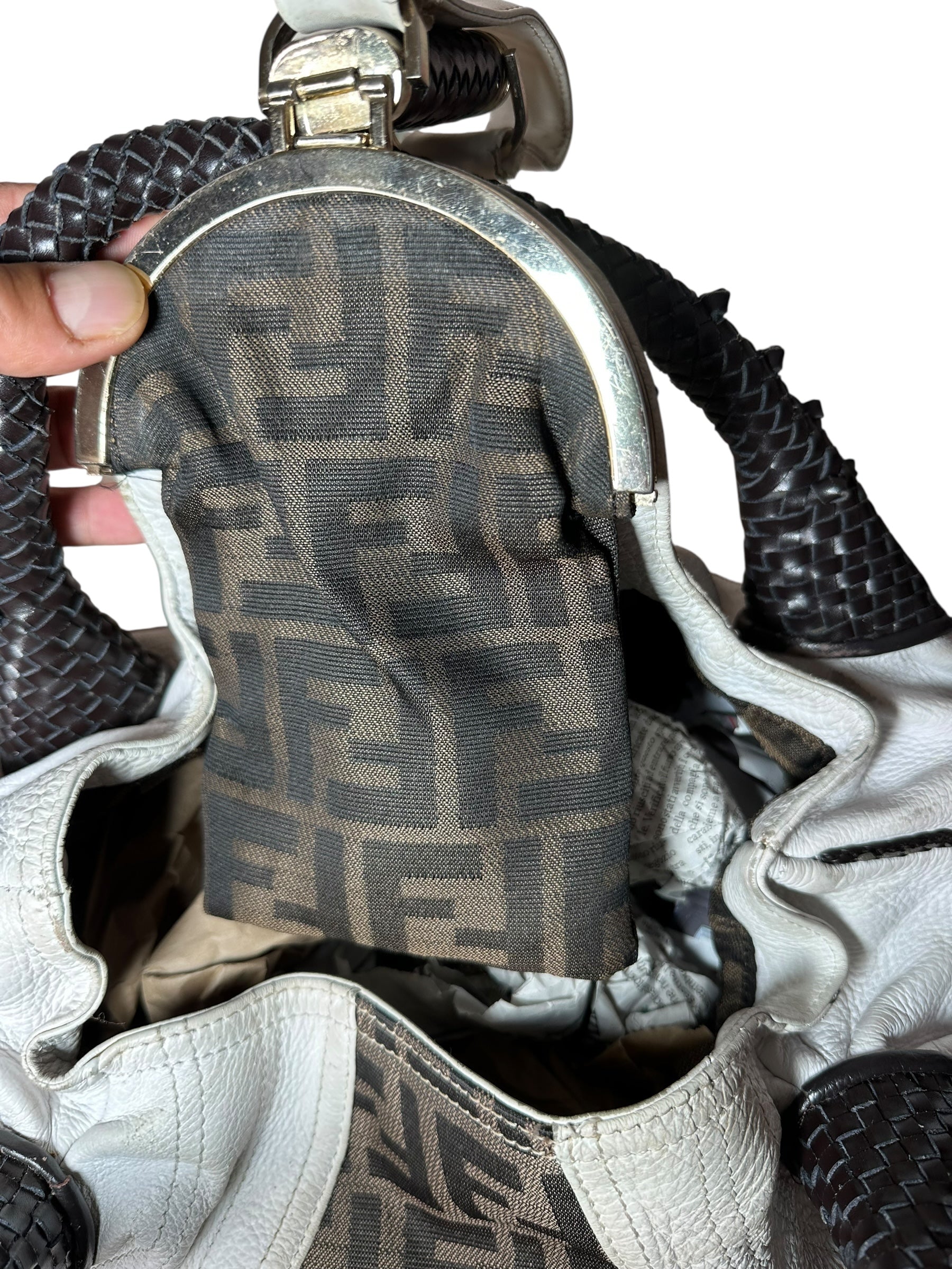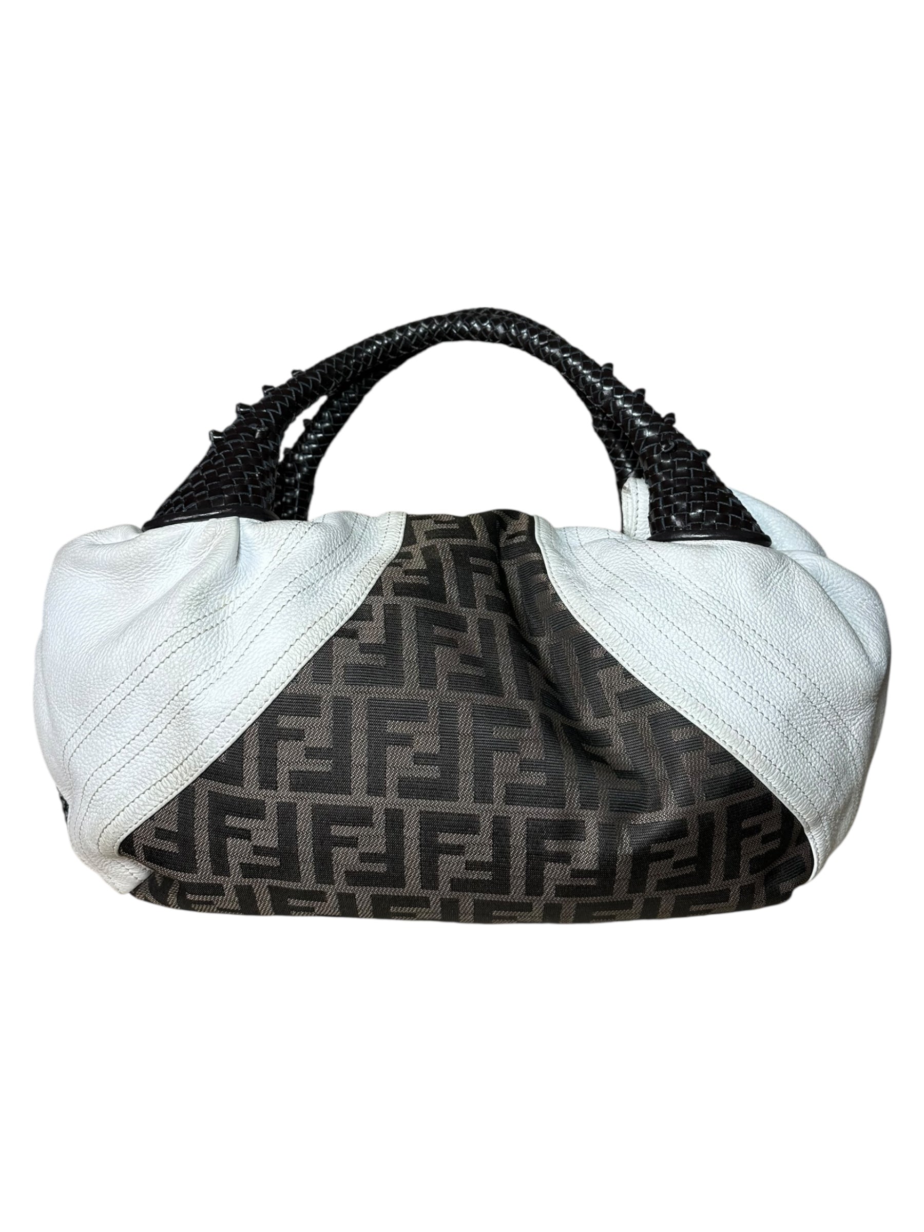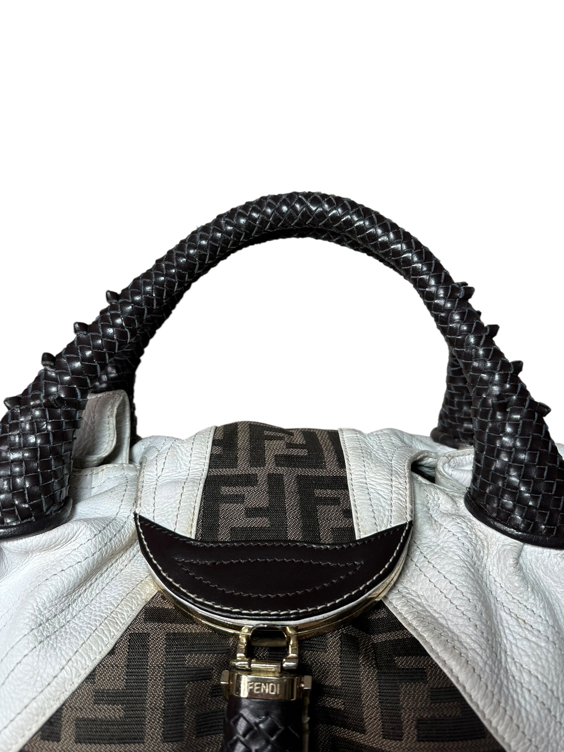 Borsa Fendi Spy vintage realizzata in tela monogram marrone con inserti in pelle martellata bianca. Iconico modello Spy con doppi manici intrecciati e caratteristico inserto frontale con vano nascosto, simboli distintivi della linea.