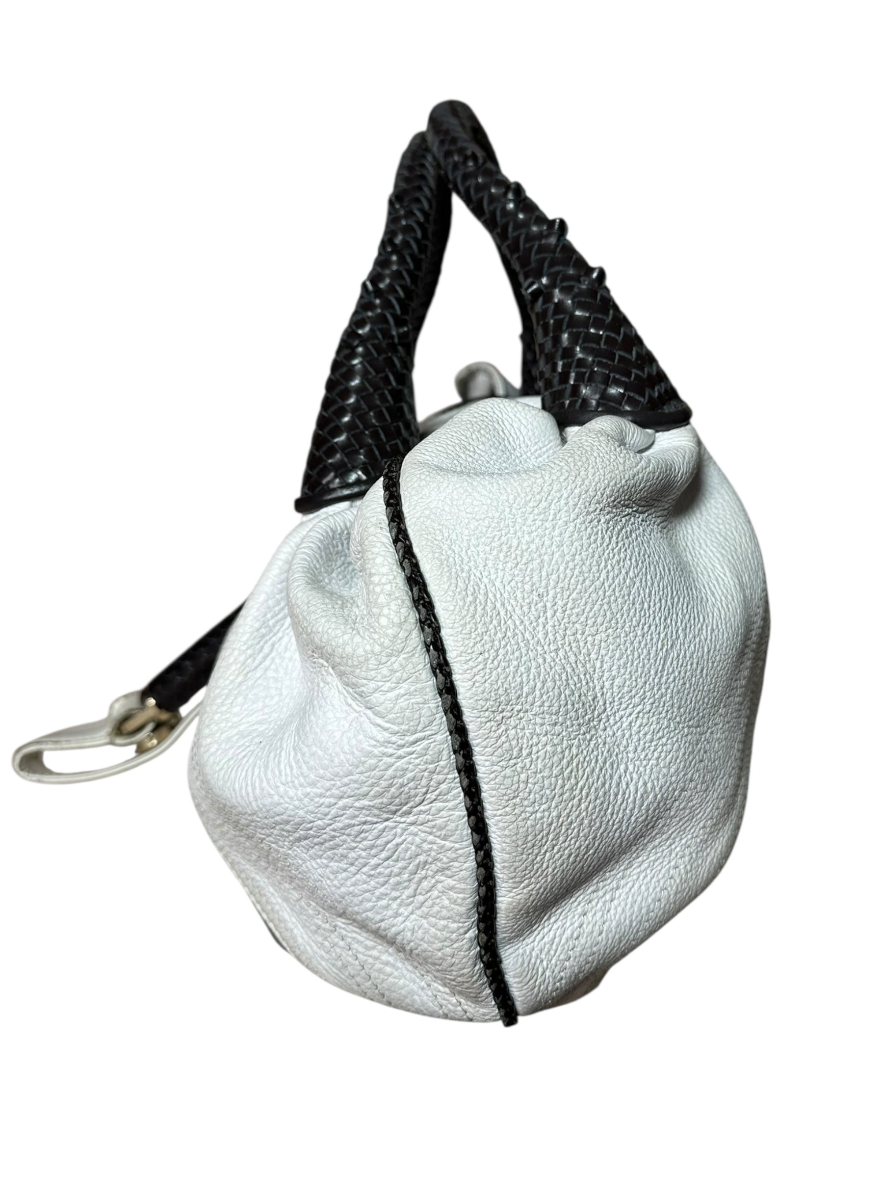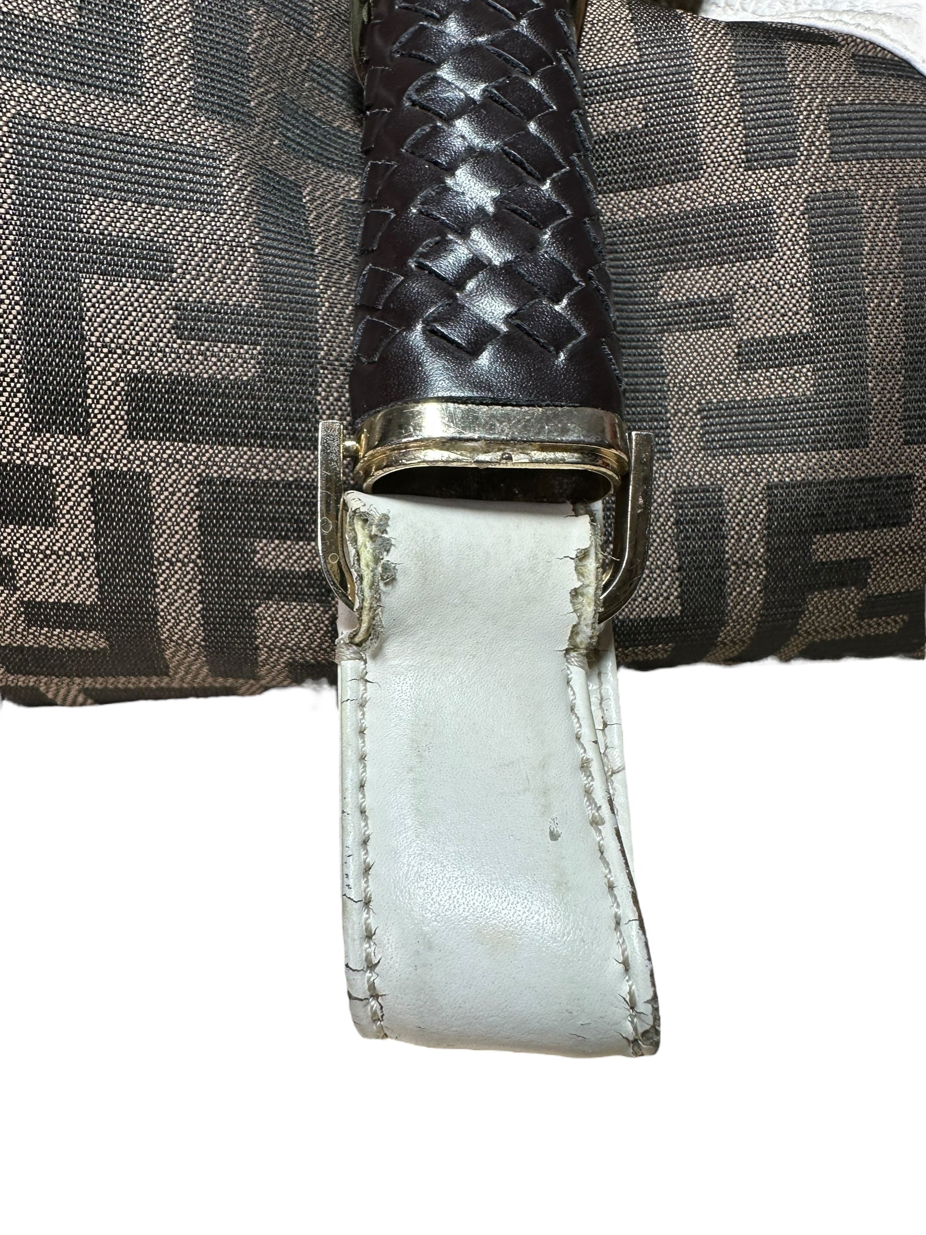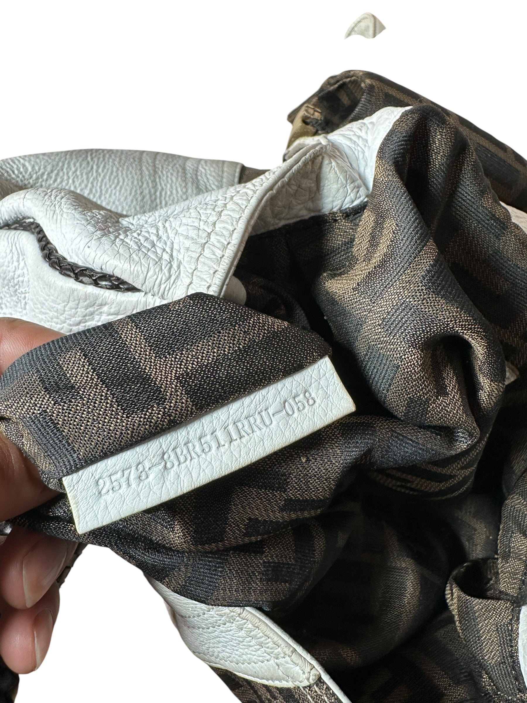 Borsa Fendi Spy vintage realizzata in tela monogram marrone con inserti in pelle martellata bianca. Iconico modello Spy con doppi manici intrecciati e caratteristico inserto frontale con vano nascosto, simboli distintivi della linea.