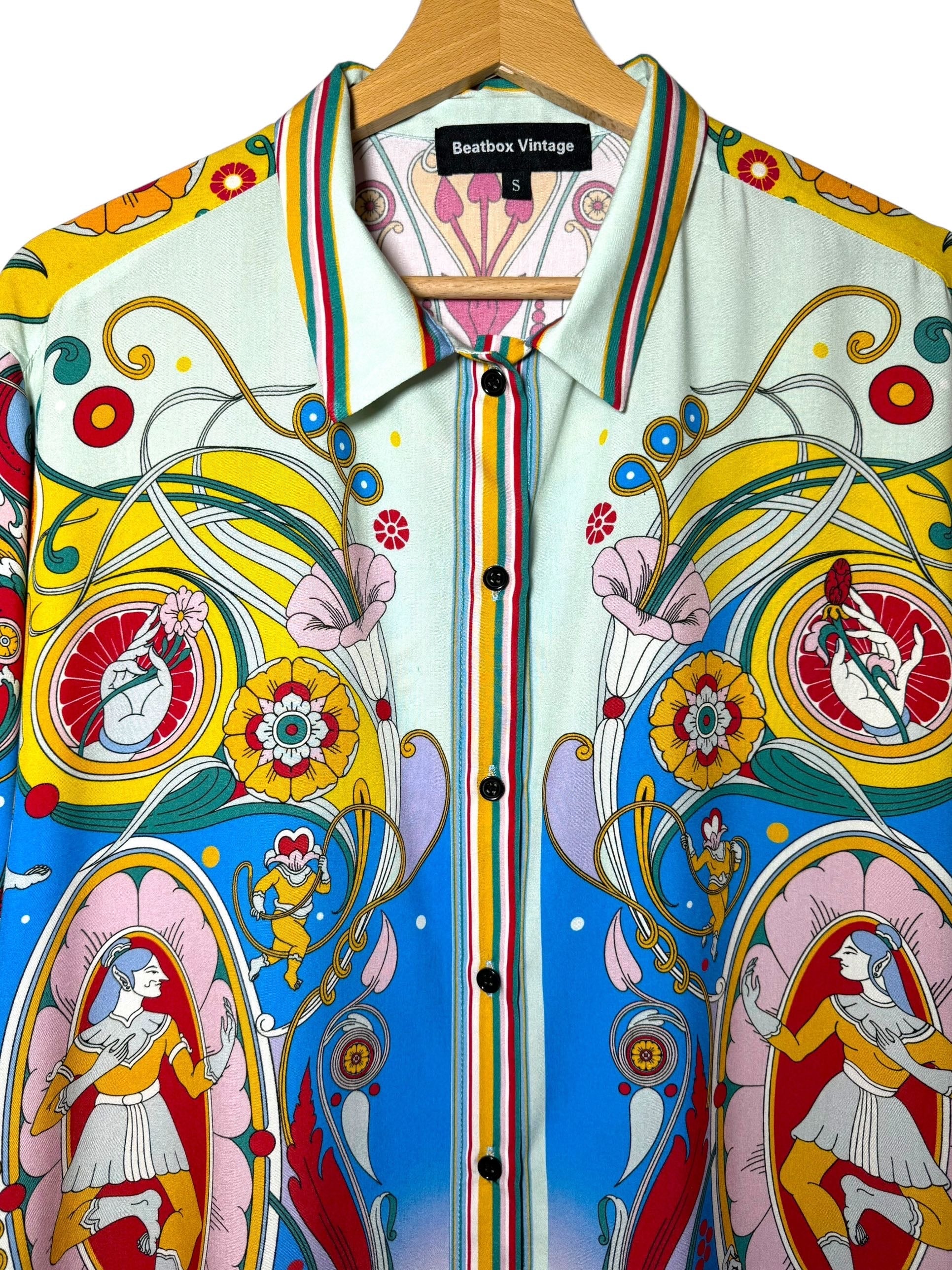 Camicia Corallio beatbox vintage a maniche corte con bellissima stampa disegnata da un artista indonesiano per noi.