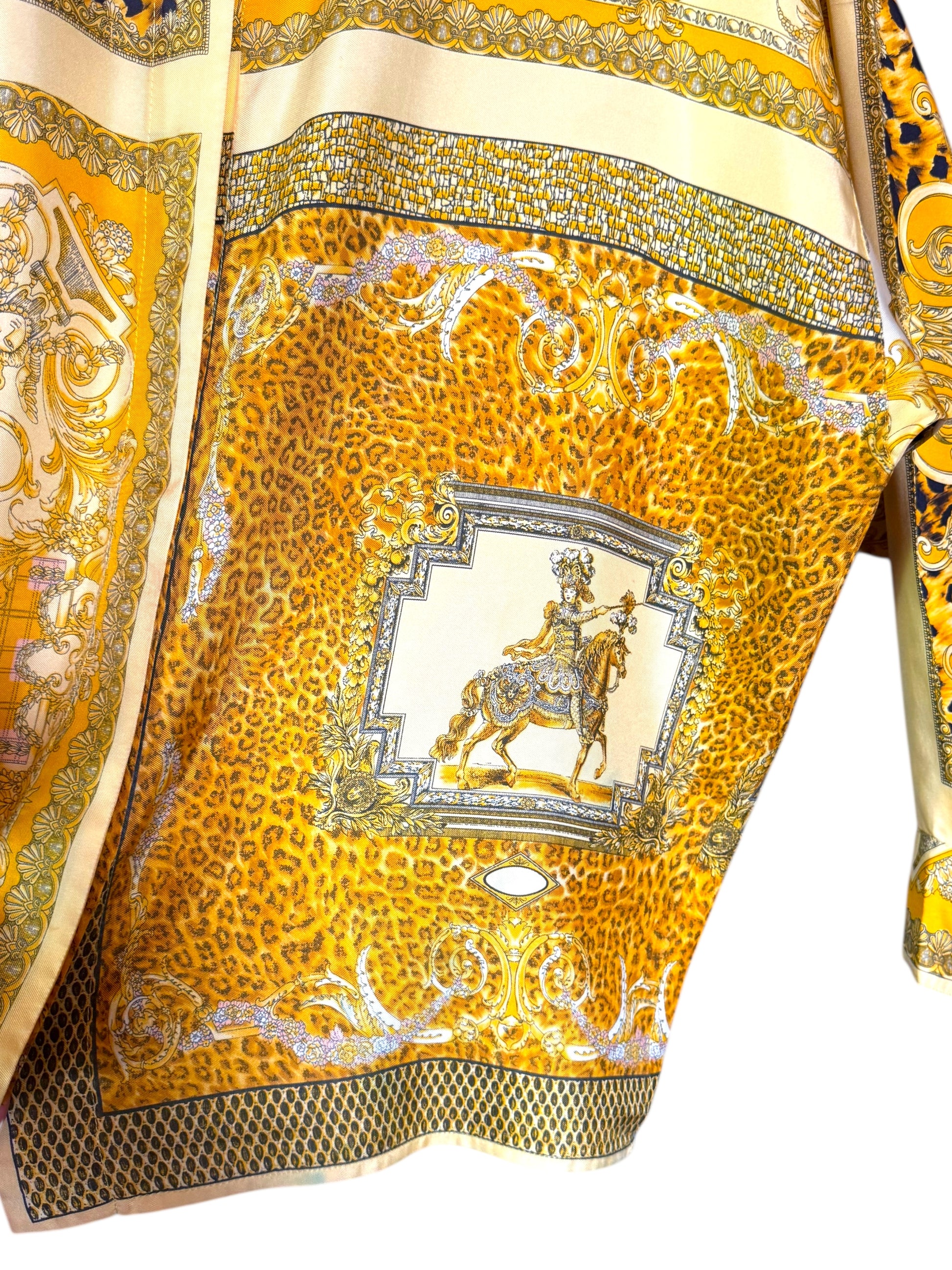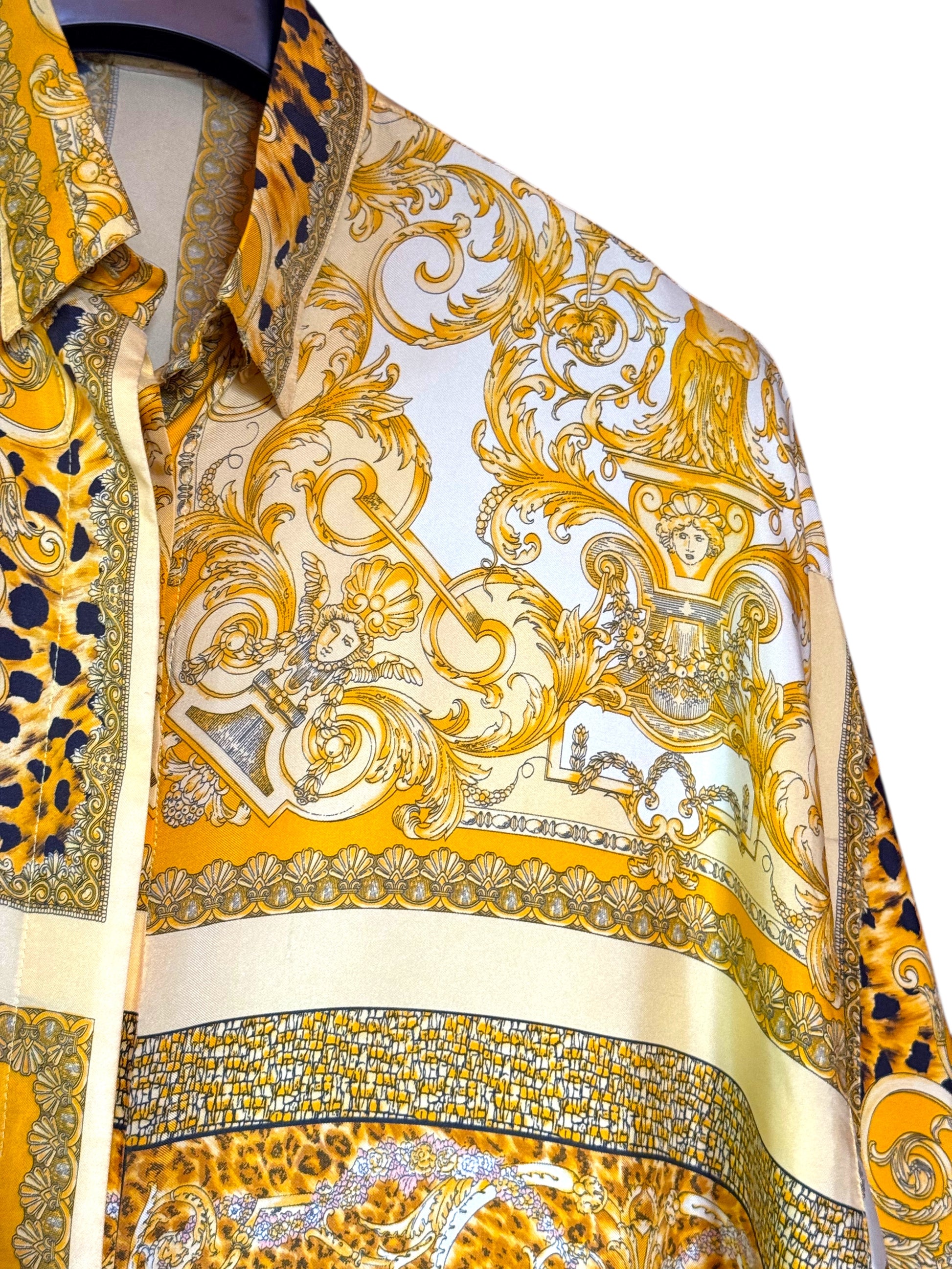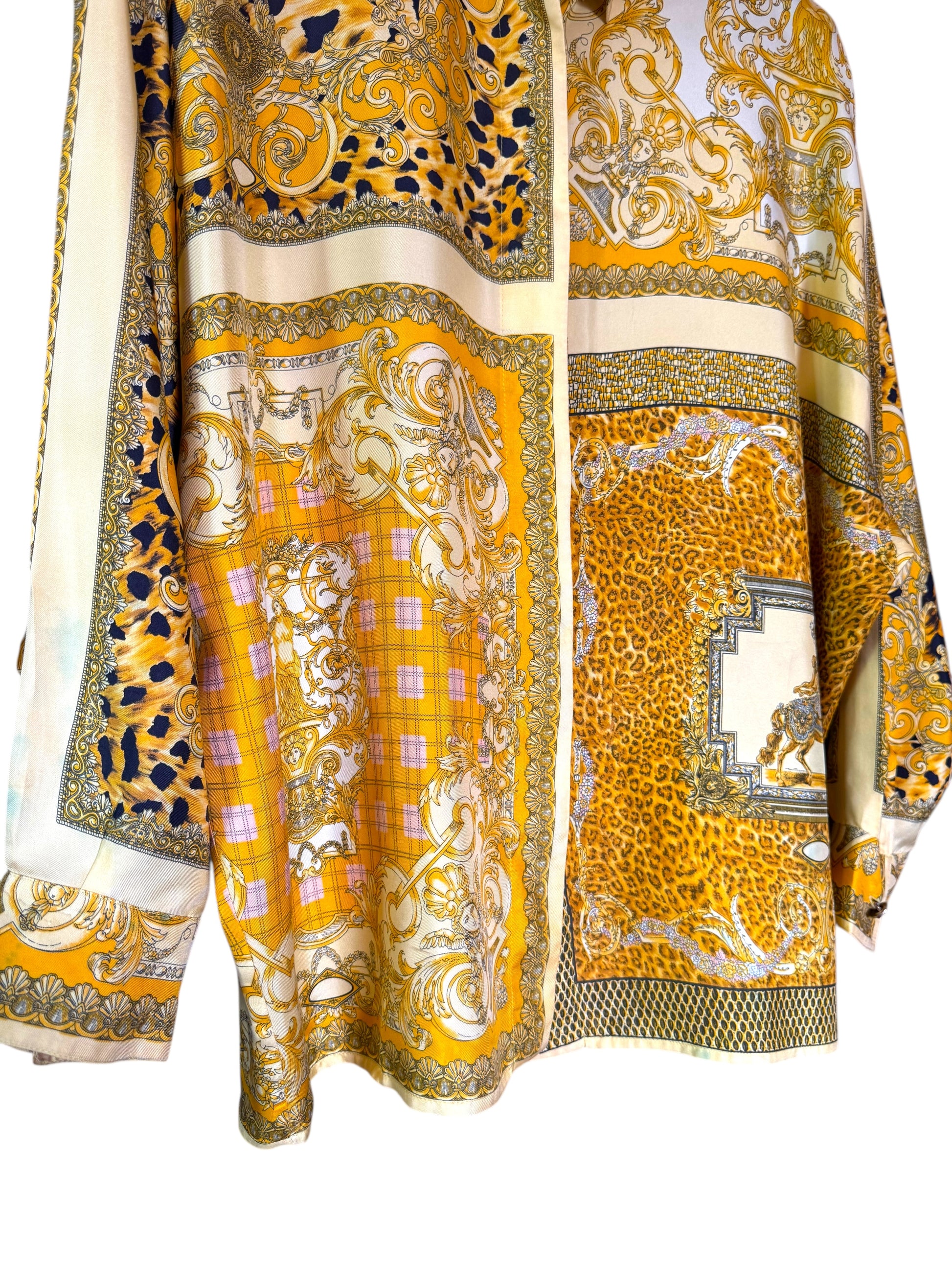 Camicia vintage originale Gianni Versace – linea Istante Donna, 100% seta, Made in Italy. Il design è suddiviso in quattro sezioni, ognuna con una stampa iconica e riconoscibile dell’archivio Versace: motivi barocchi, animalier, dettagli rinascimentali e geometrici si intrecciano in un mix visivo tipico dello stile opulento e inconfondibile della maison.
