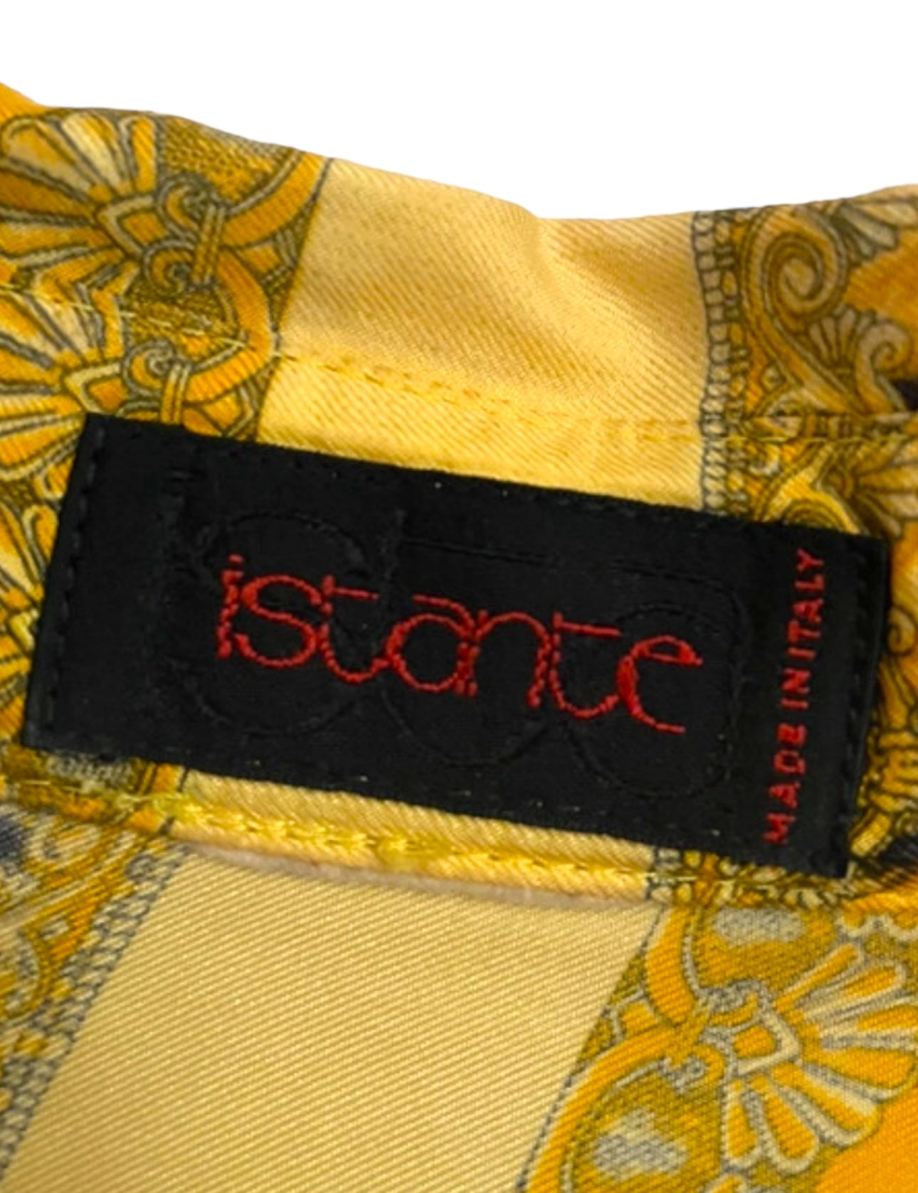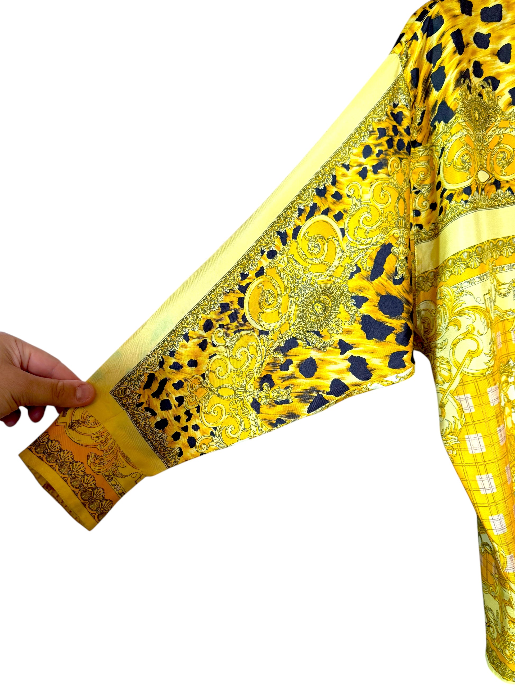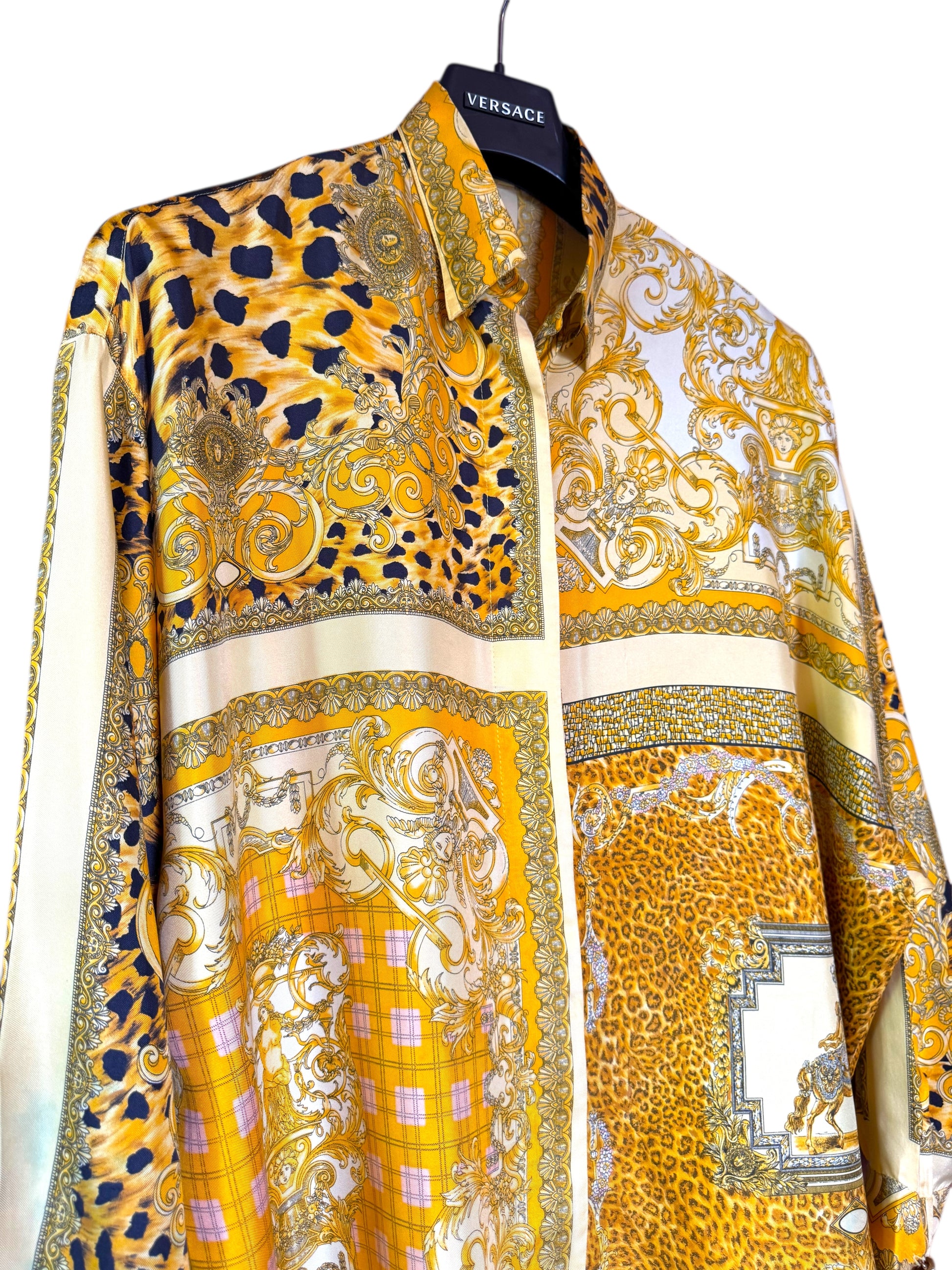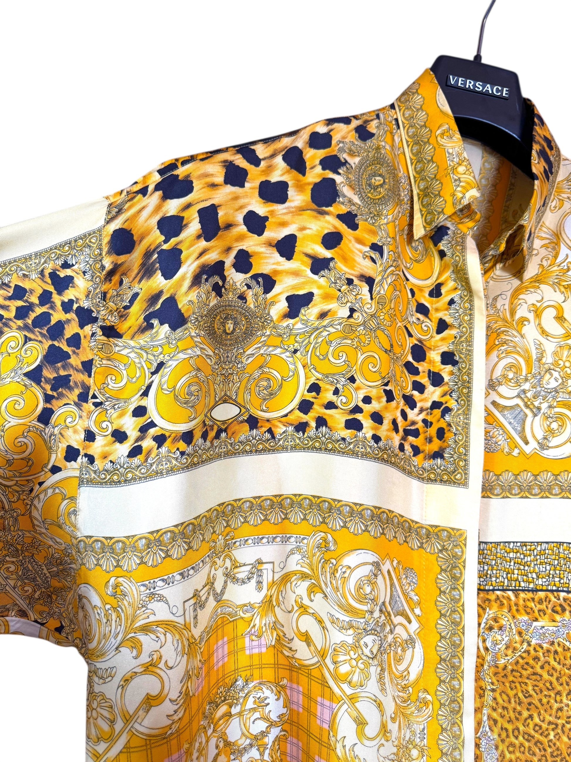 Camicia vintage originale Gianni Versace – linea Istante Donna, 100% seta, Made in Italy. Il design è suddiviso in quattro sezioni, ognuna con una stampa iconica e riconoscibile dell’archivio Versace: motivi barocchi, animalier, dettagli rinascimentali e geometrici si intrecciano in un mix visivo tipico dello stile opulento e inconfondibile della maison.