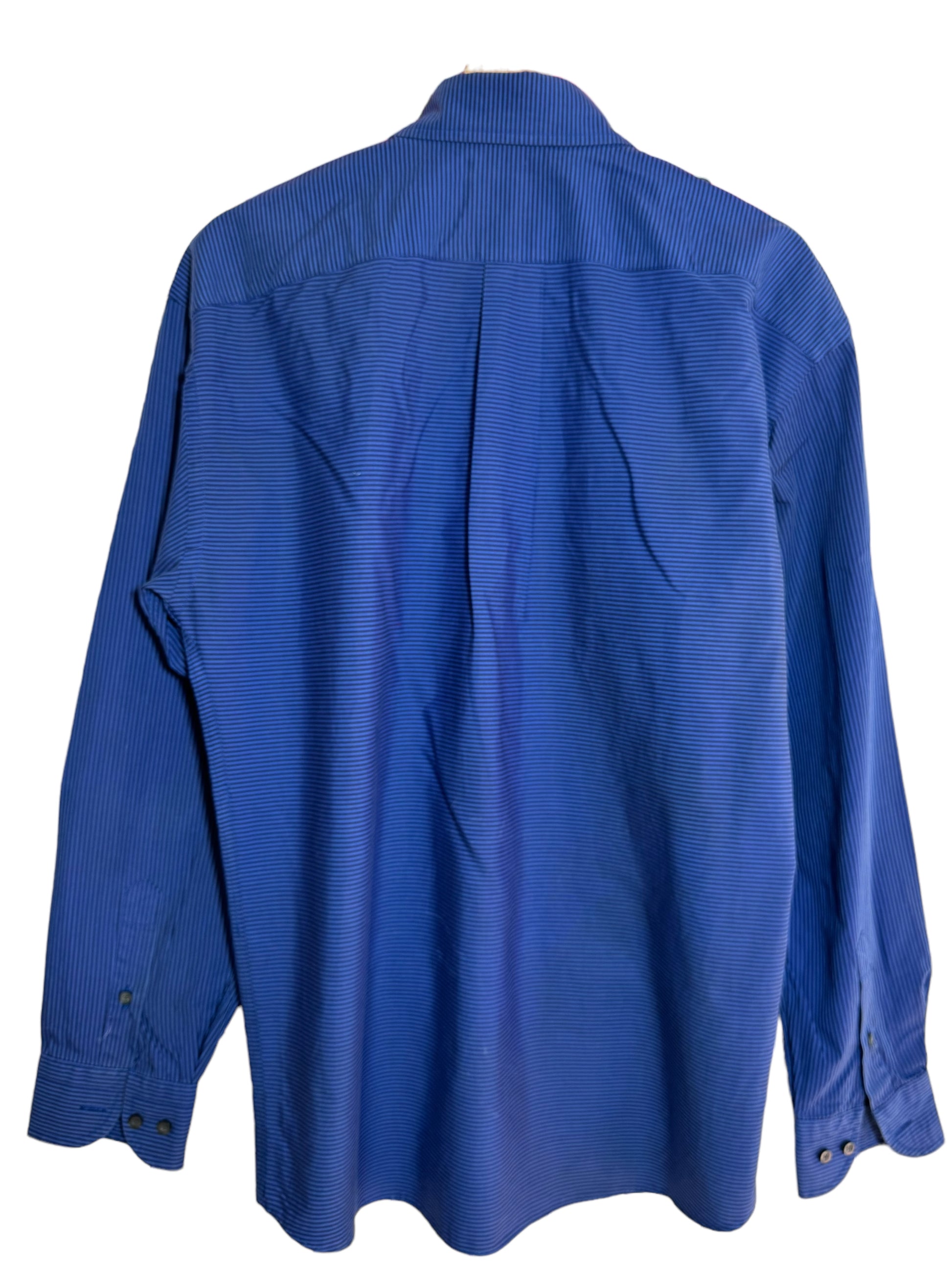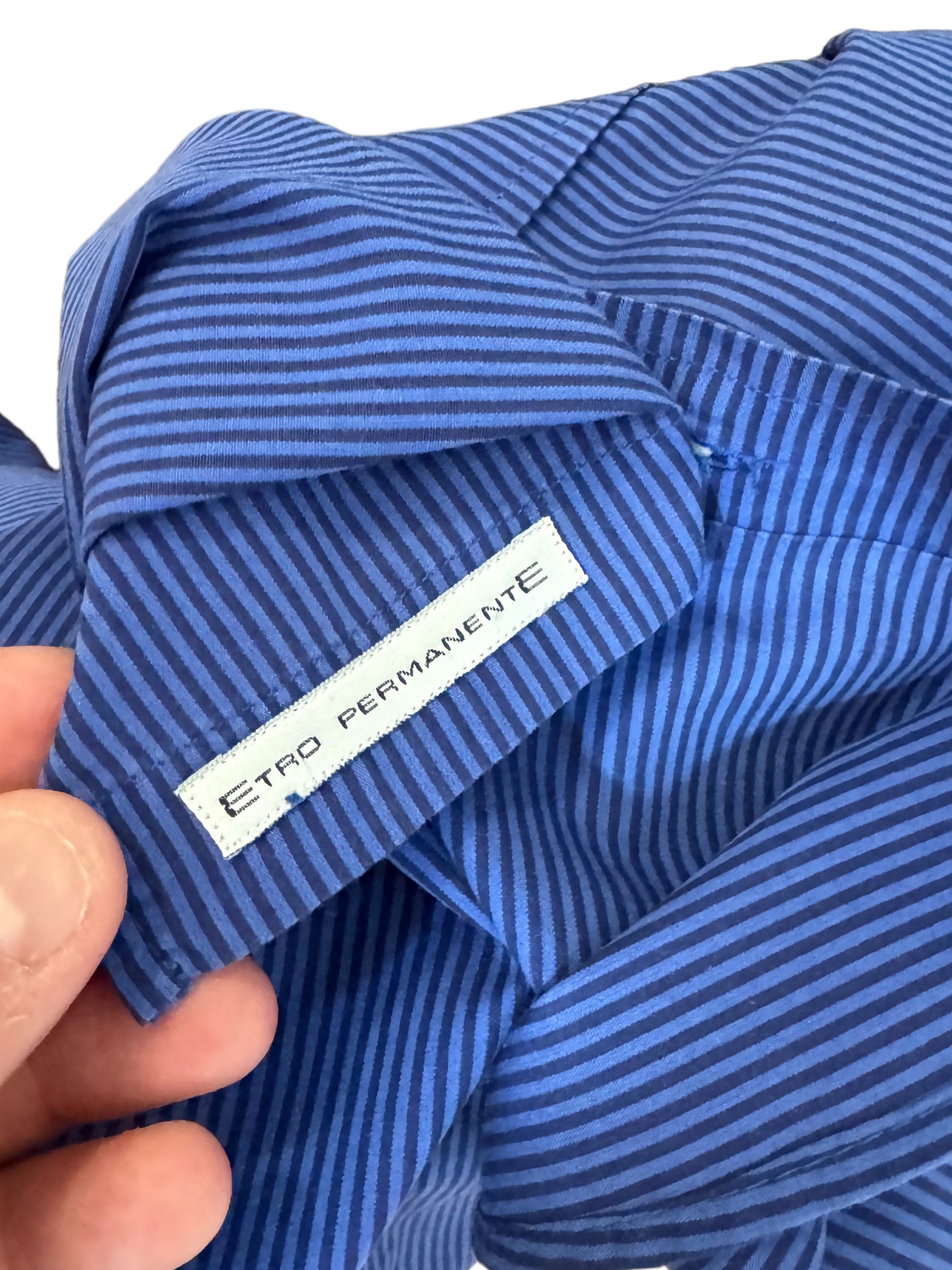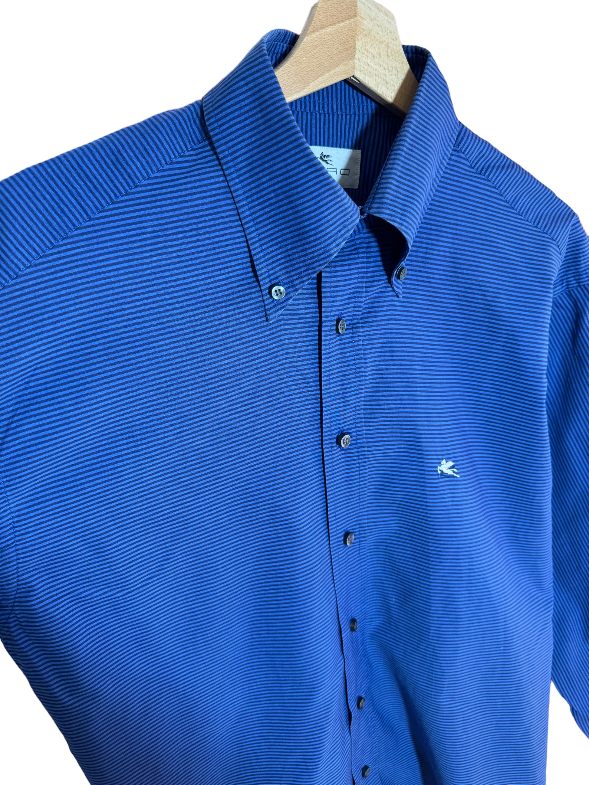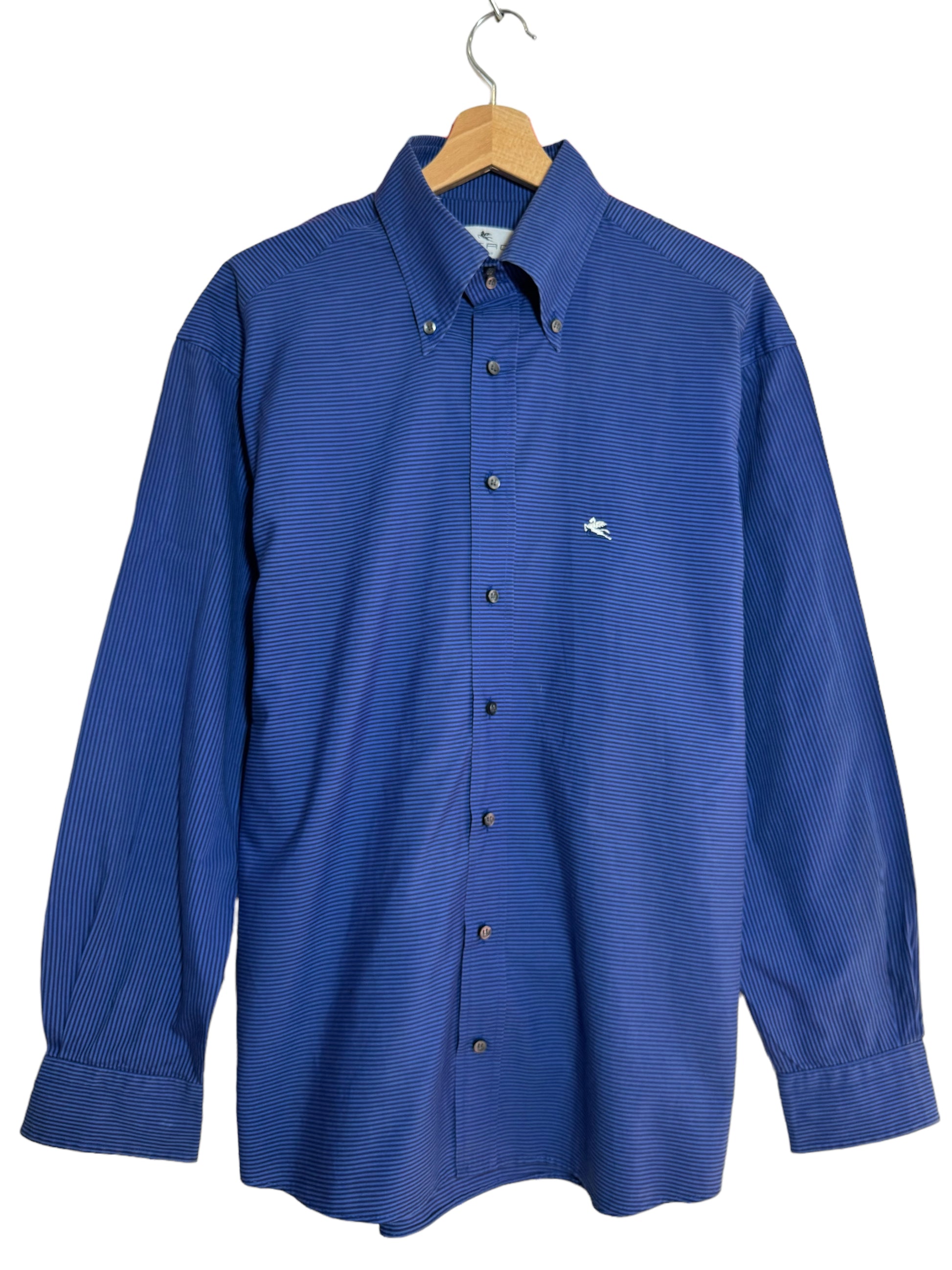 Camicia Etro in cotone con stampa a righe orizzontali blu e nere. L’etichetta della taglia è stata tagliata, veste una L. Controllare le misure