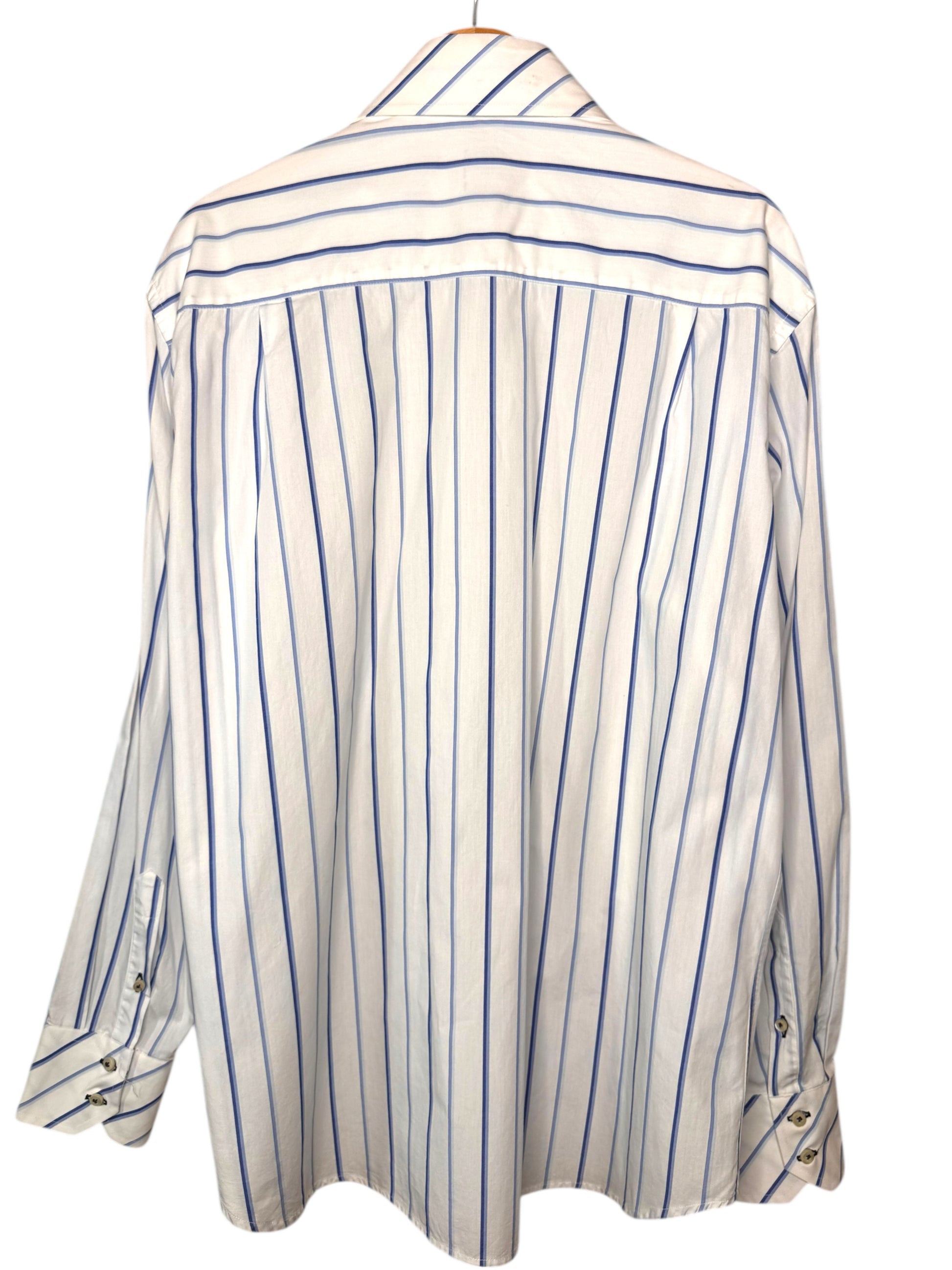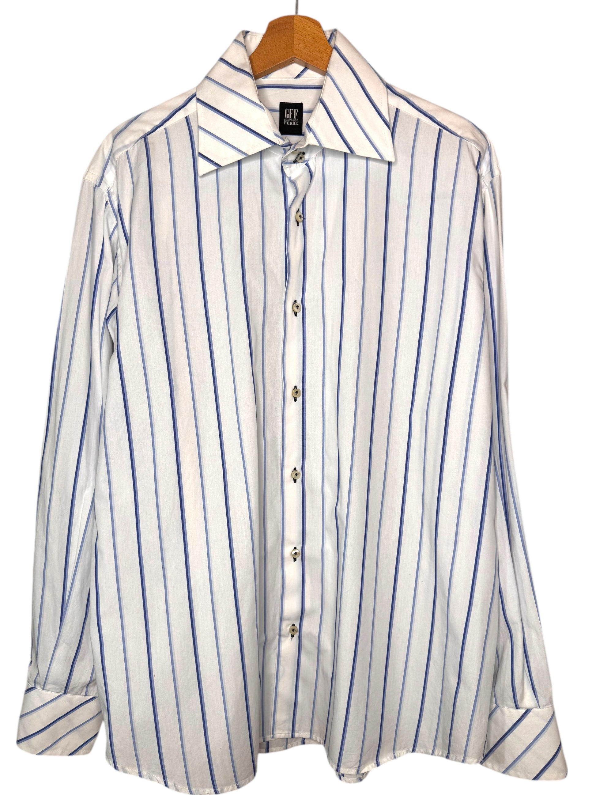 Camicia originale Gianfranco Ferré, linea GFF, caratterizzata da una vestibilità ampia e da un elegante motivo a righe verticali bianche e blu.